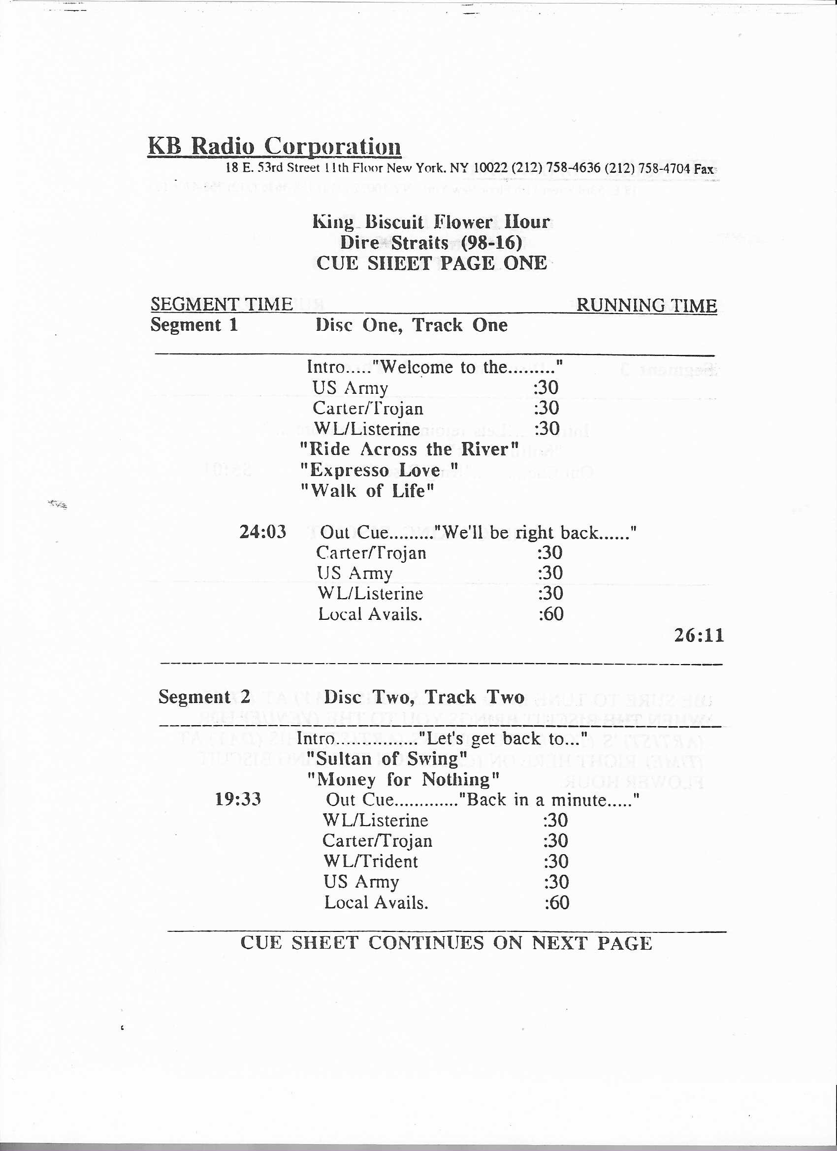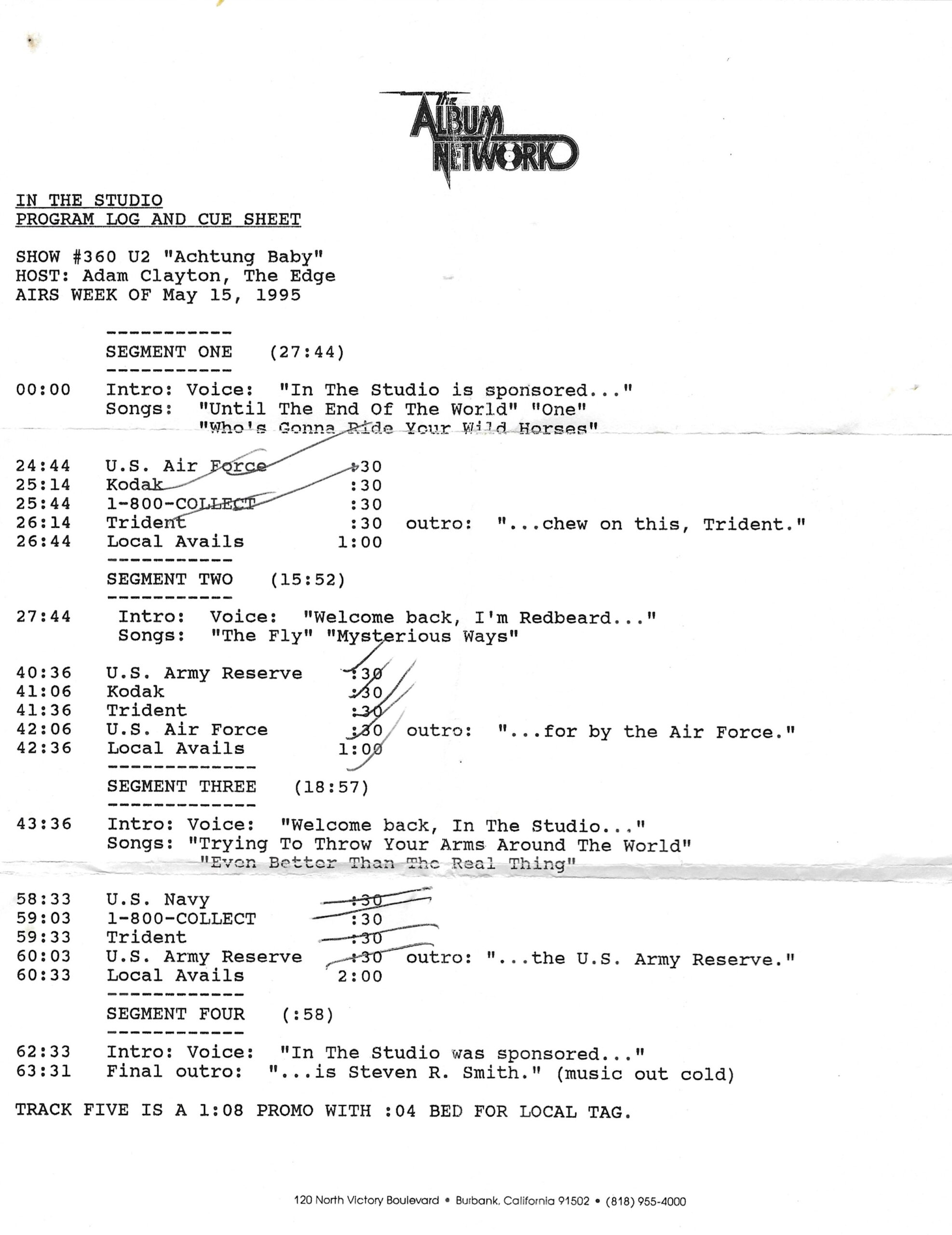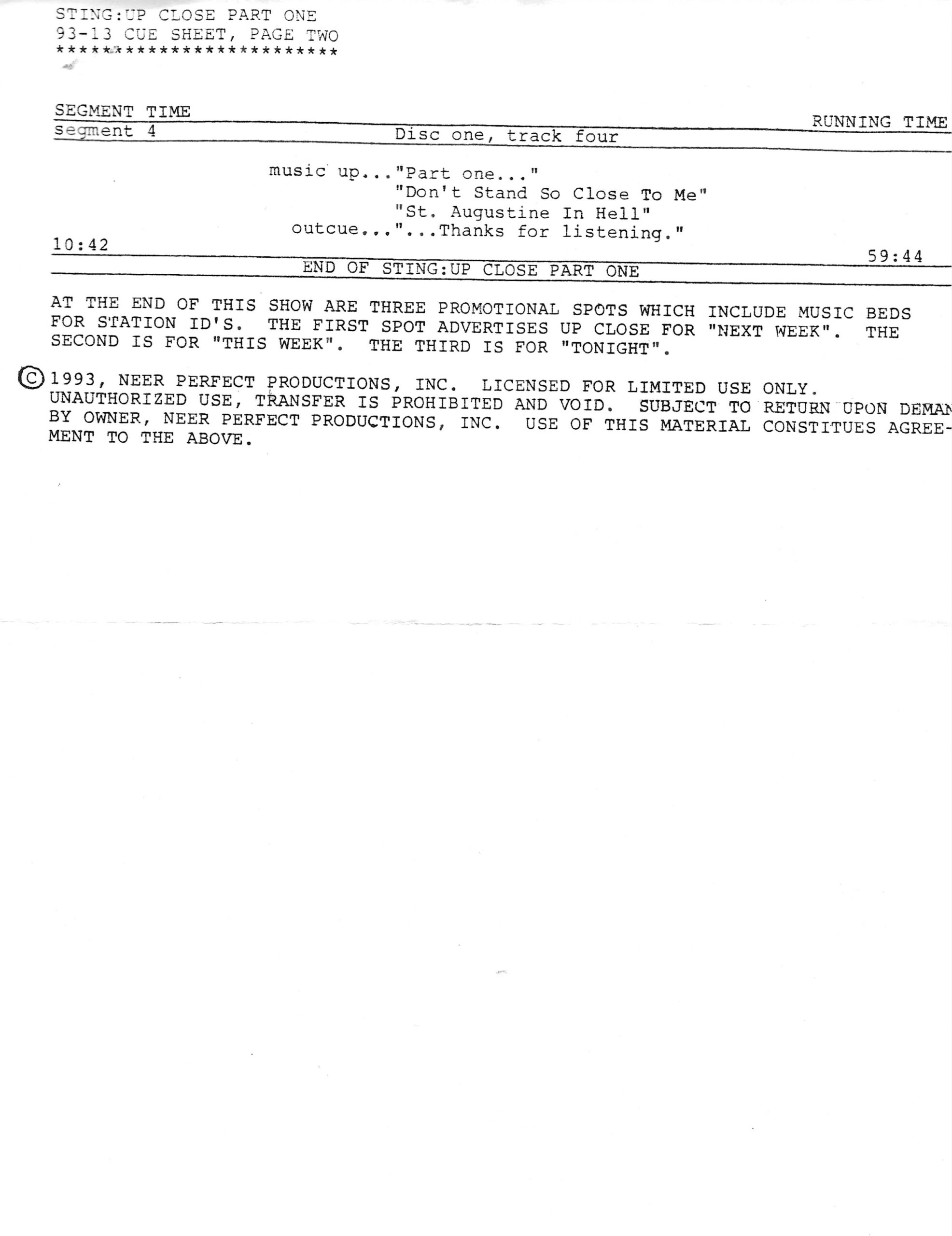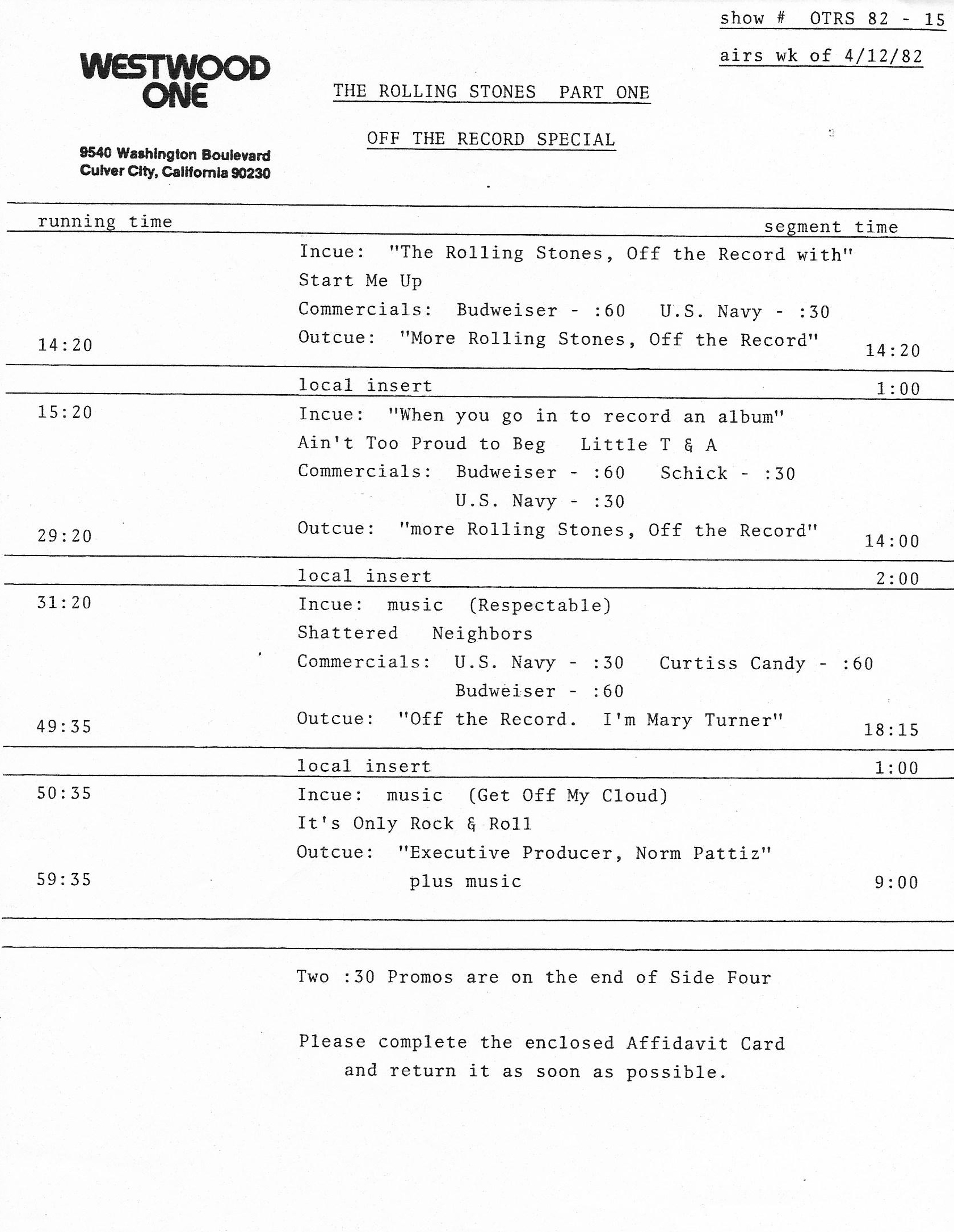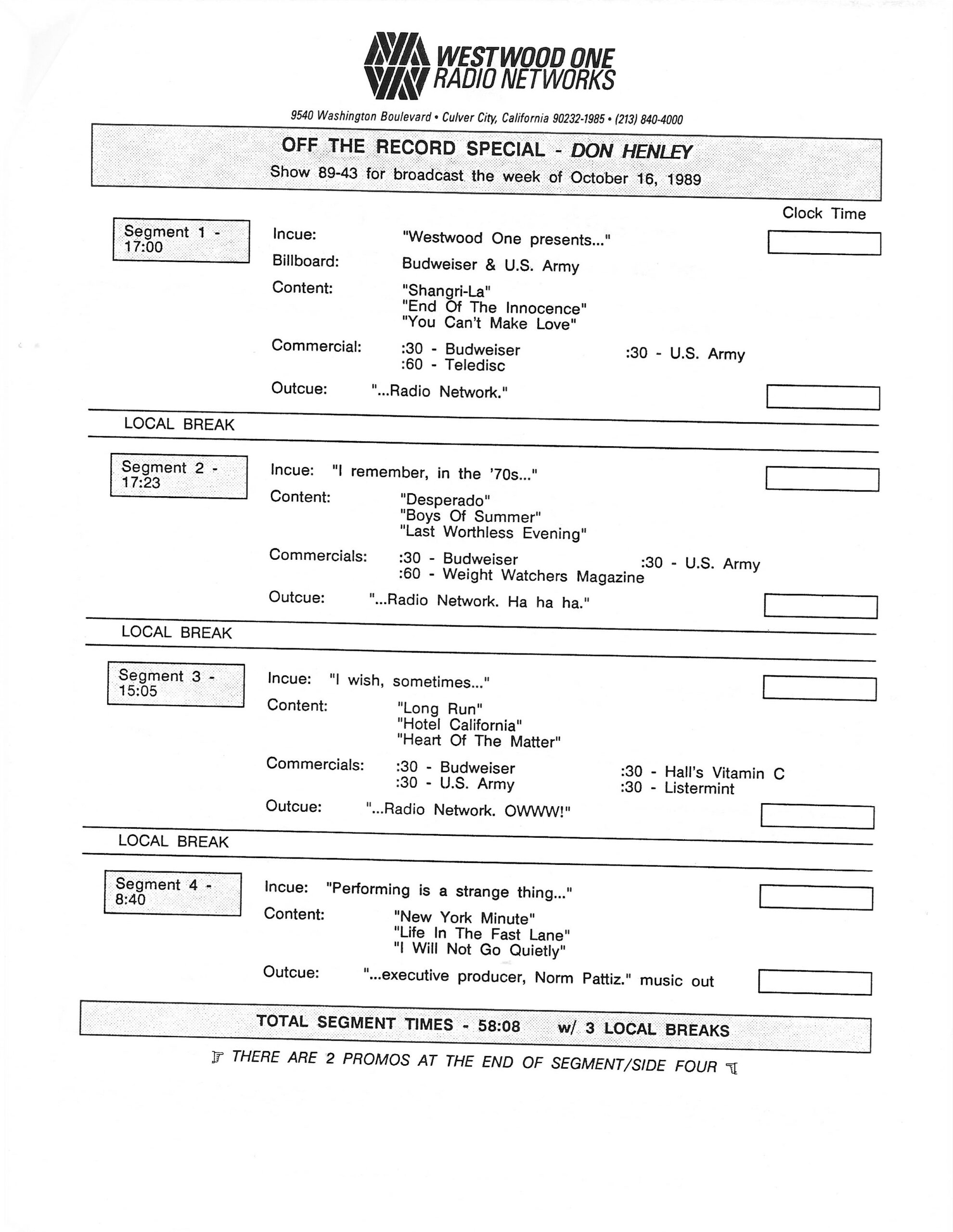 Tracks 1 – 4 are the actual radio show, Tracks 5 – 7 are promo spots, Tracks 8 – 15 are commercial spots, while Tracks 16 – 27 are the actual interview segments and segment intros separated into individual tracks.