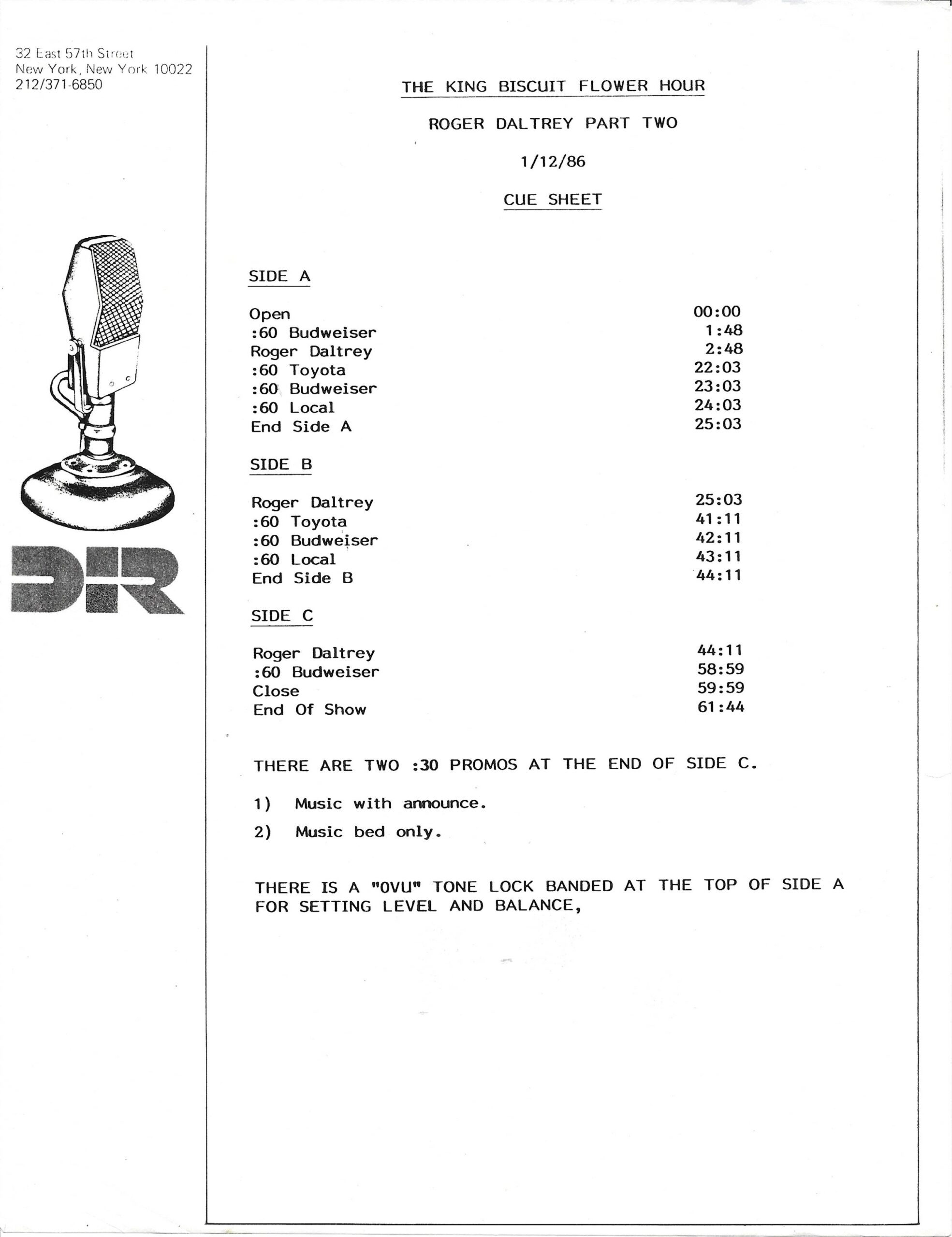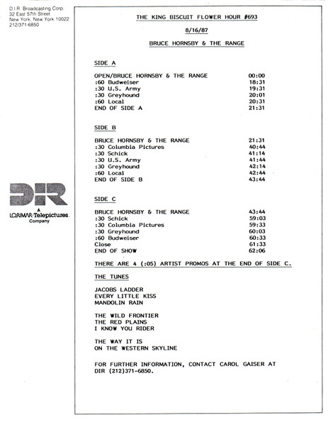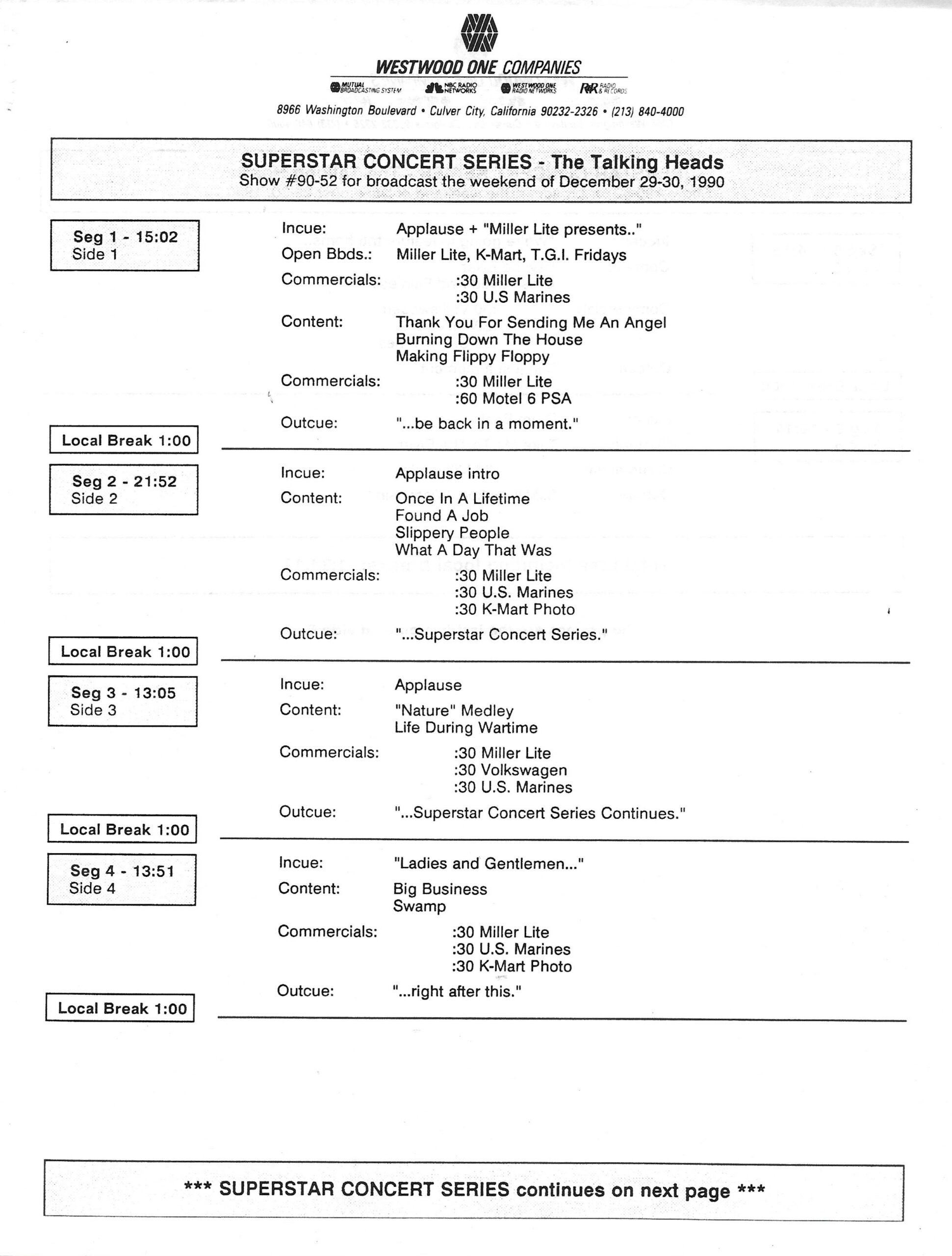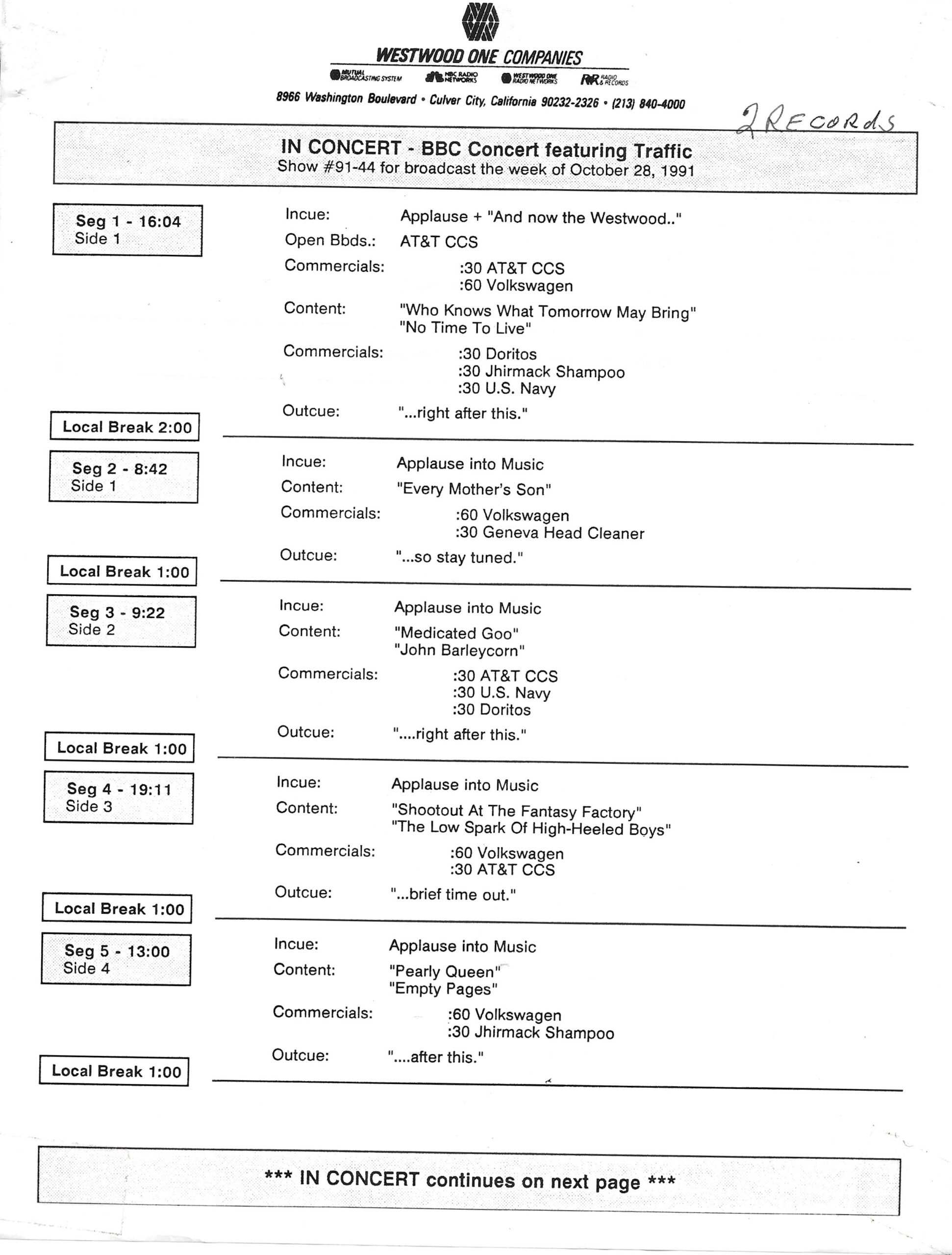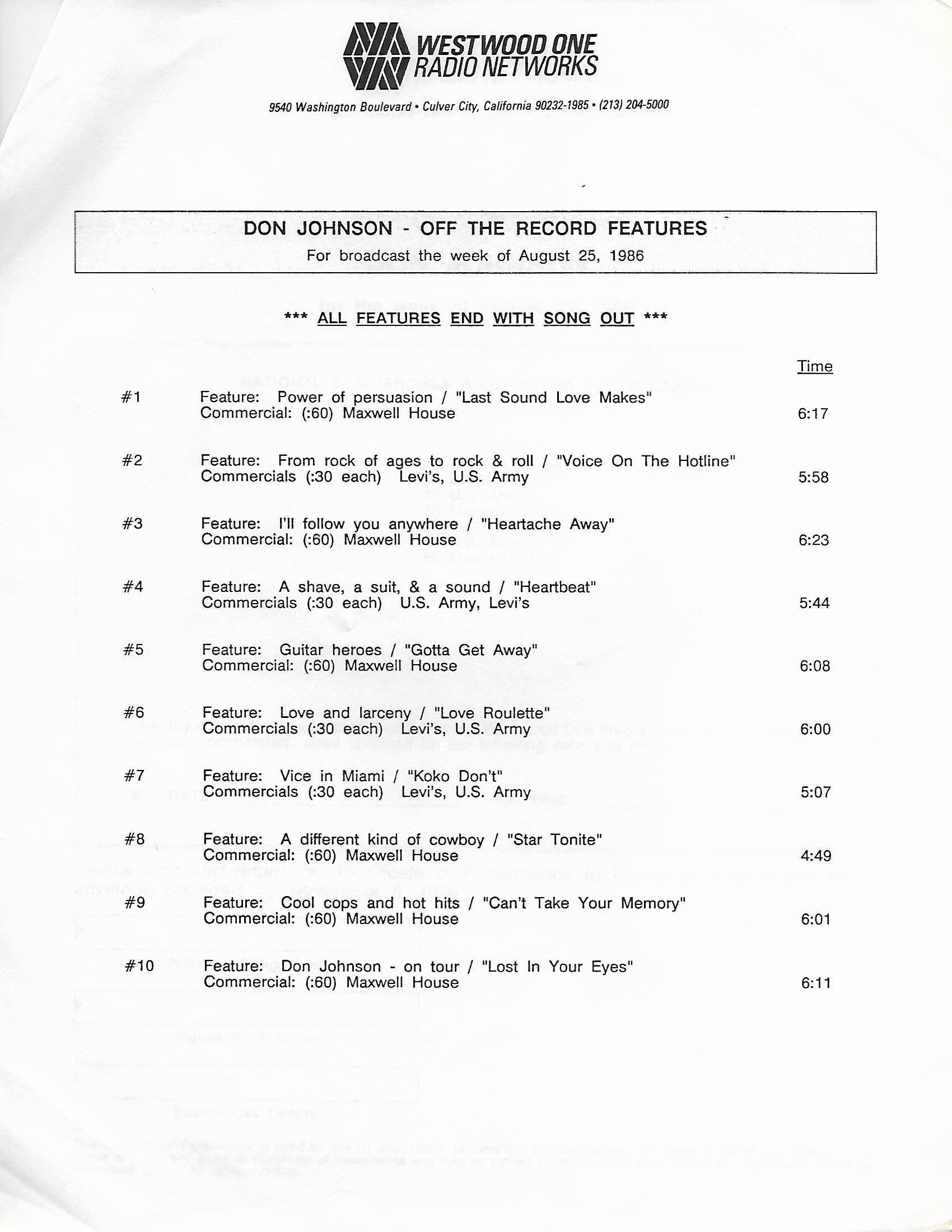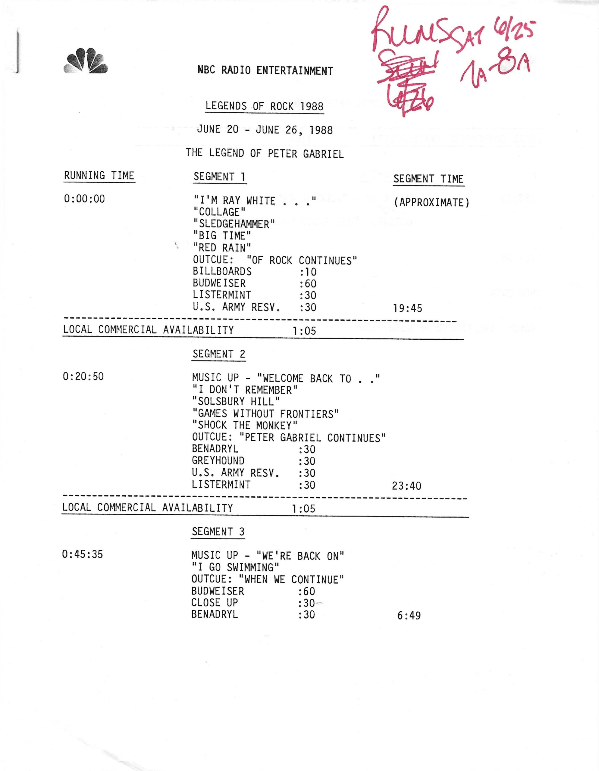 Tracks 1 – 4 are the actual radio show, Tracks 5 – 7 are promo spots, Tracks 8 – 15 are commercial spots, while Tracks 16 – 27 are the actual interview segments and segment intros separated into individual tracks.