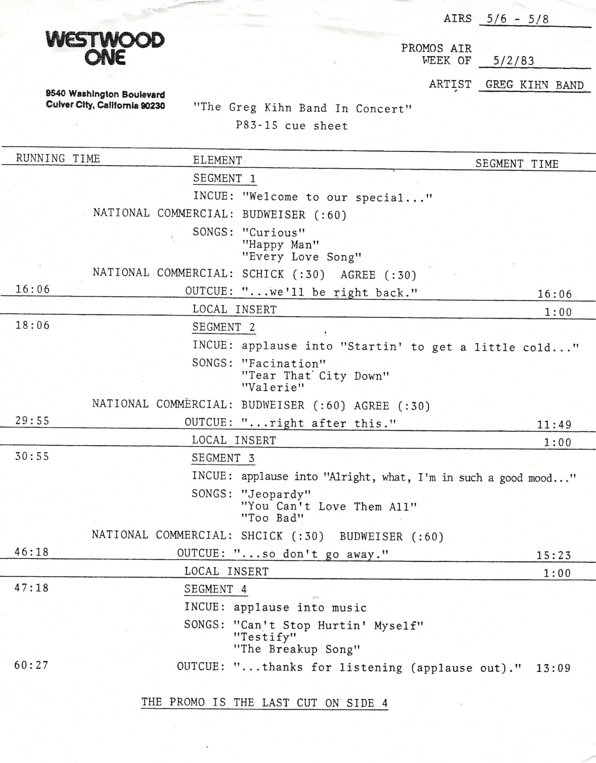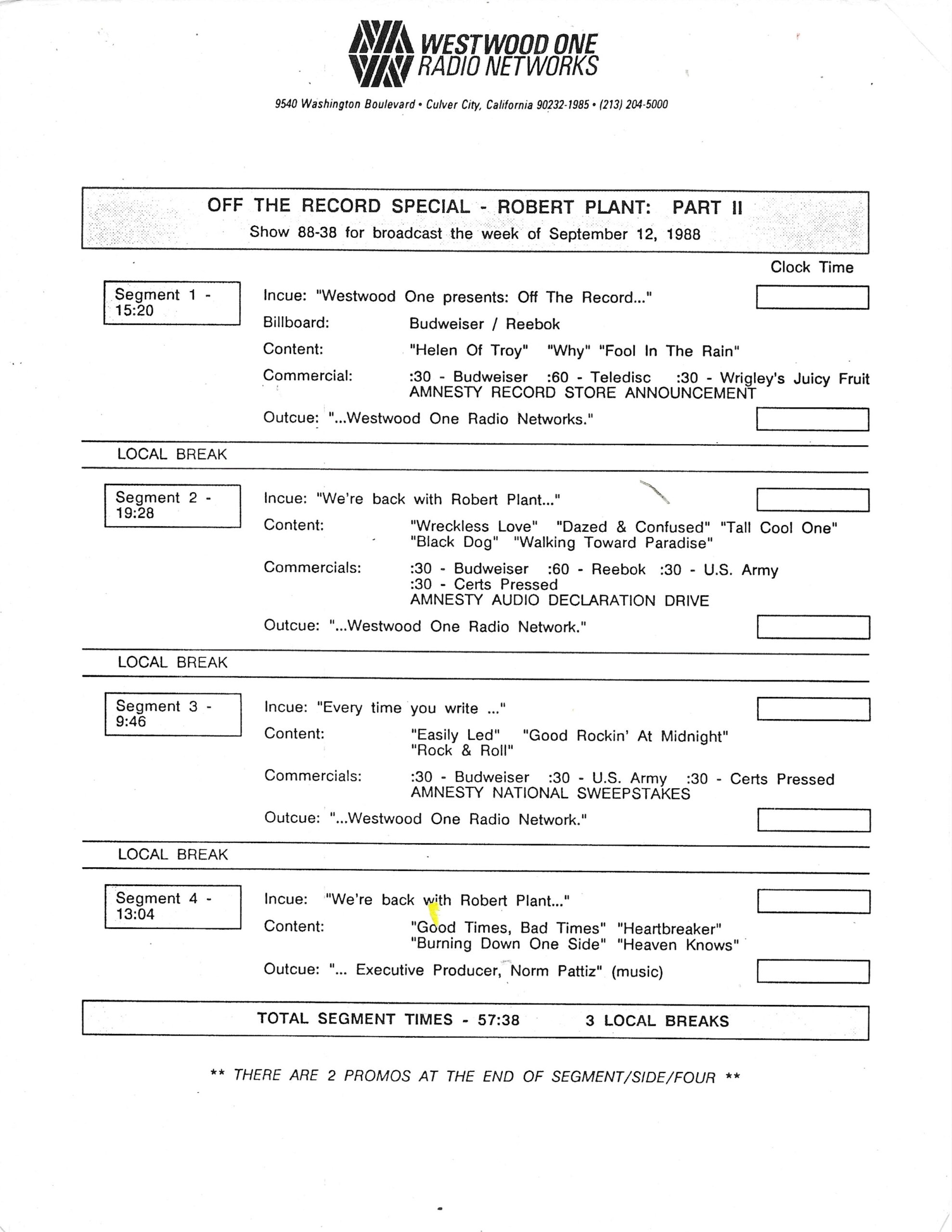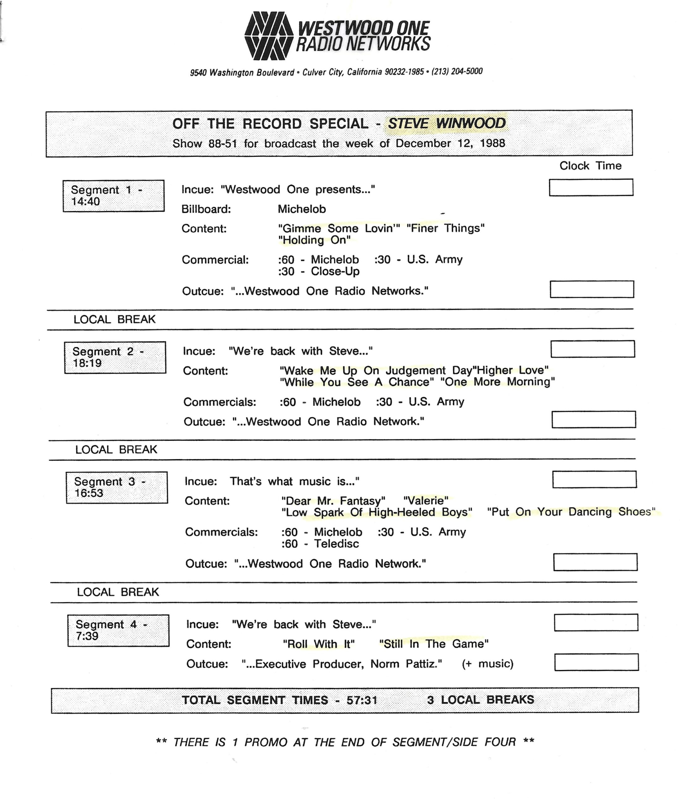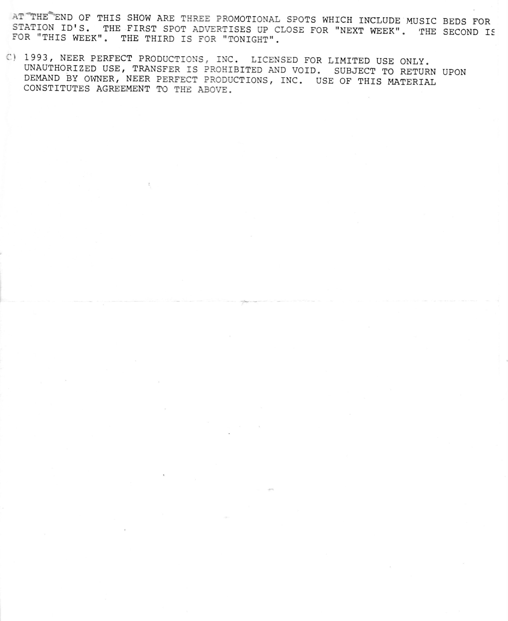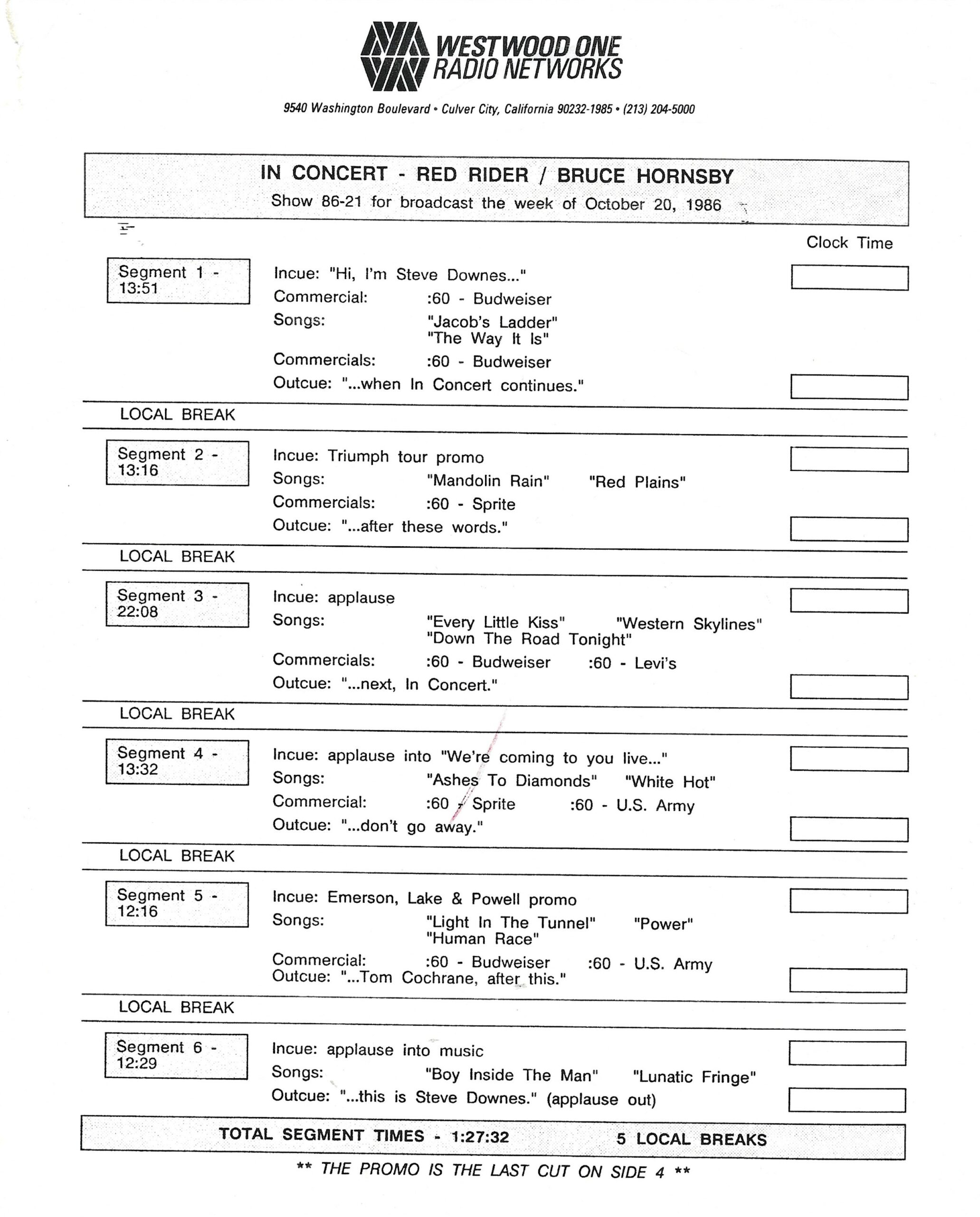Tracks 1 – 4 are the actual radio show, Tracks 5 – 7 are promo spots, Tracks 8 – 15 are commercial spots, while Tracks 16 – 27 are the actual interview segments and segment intros separated into individual tracks.