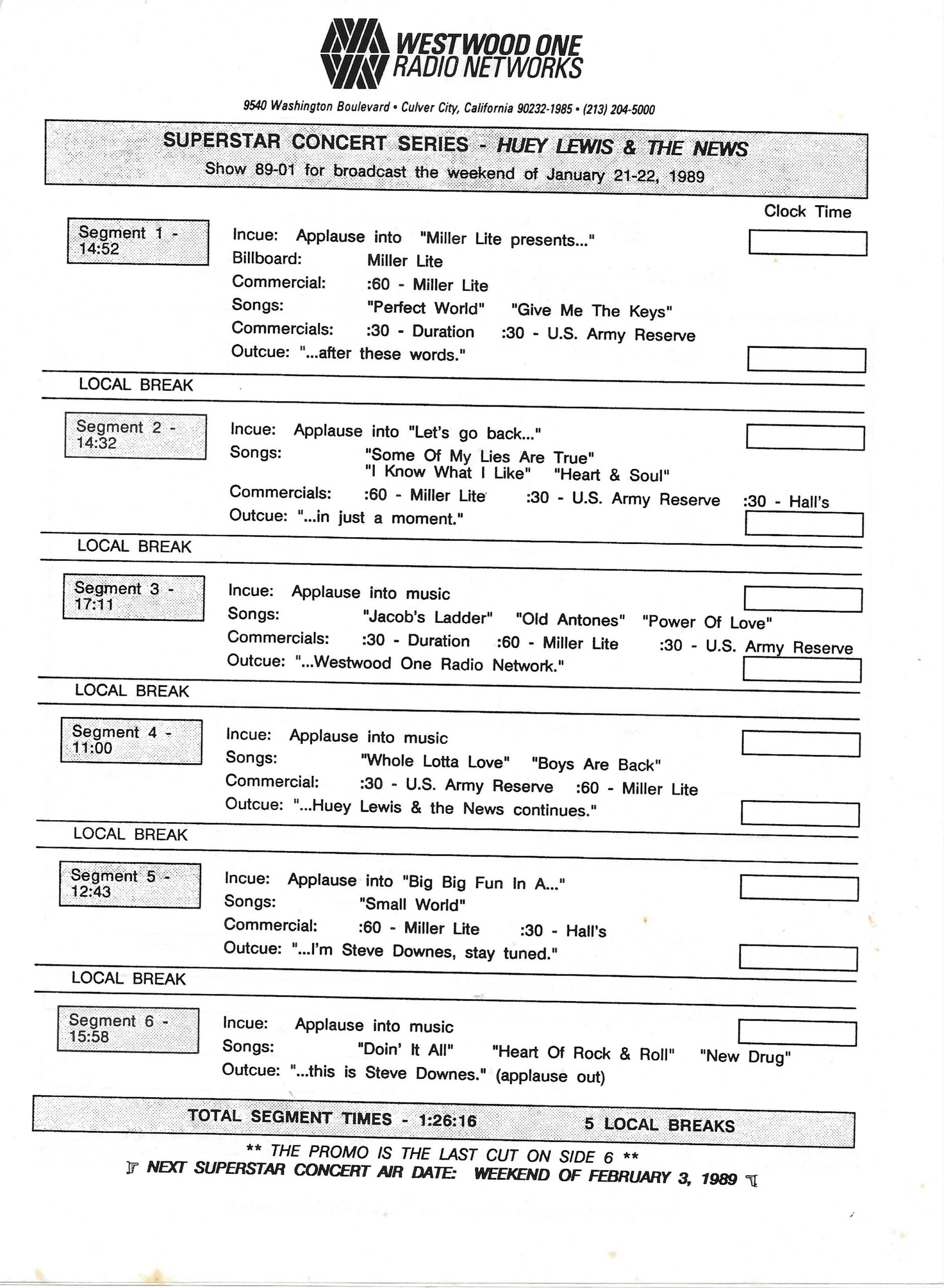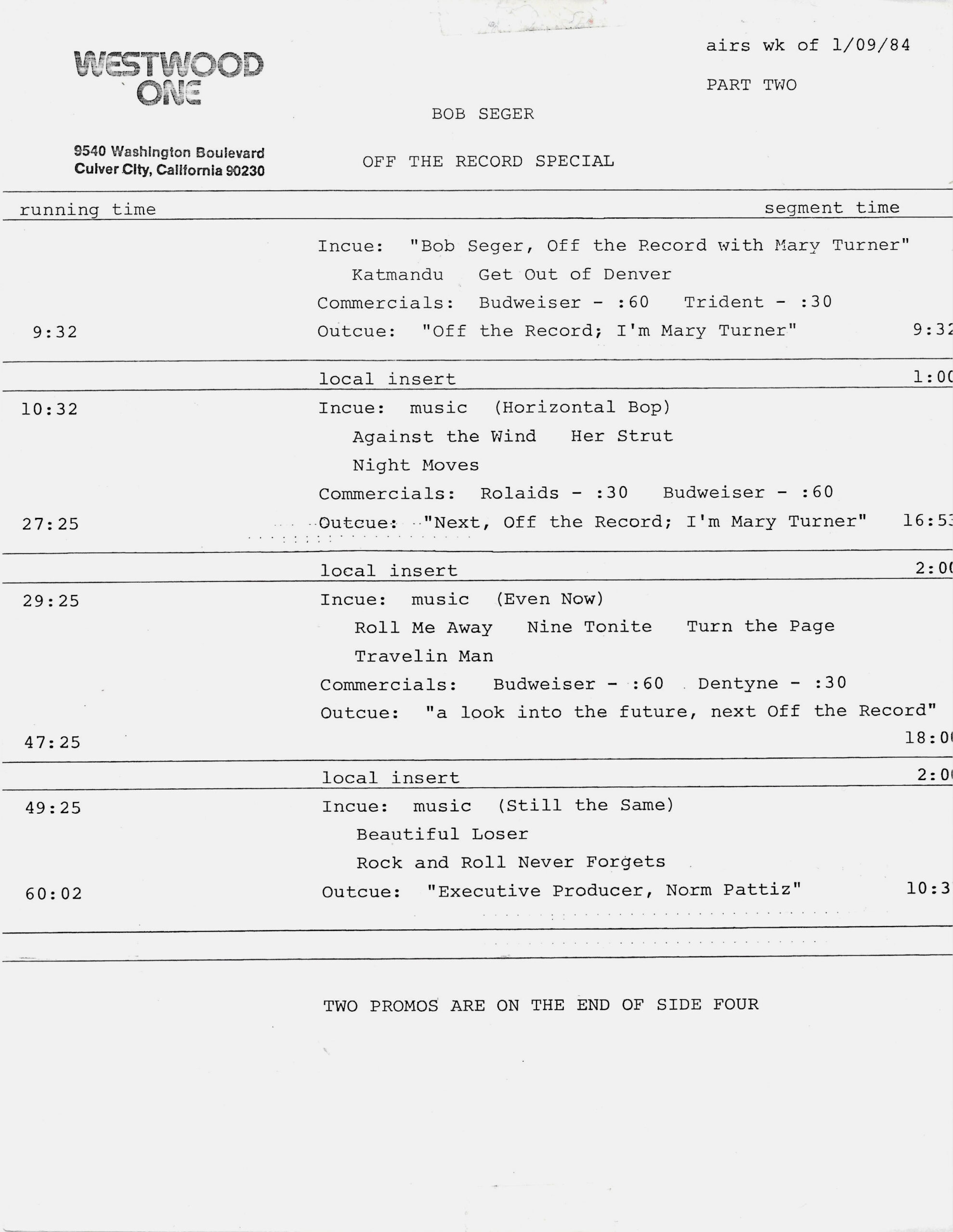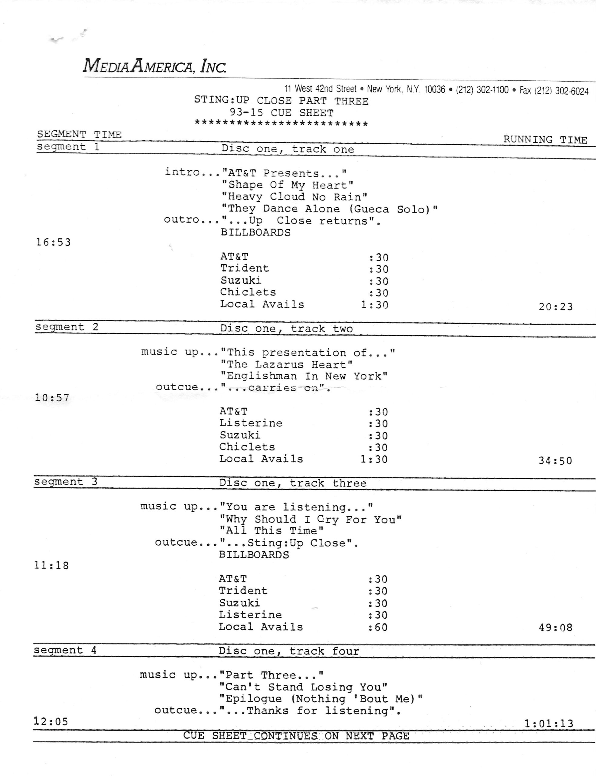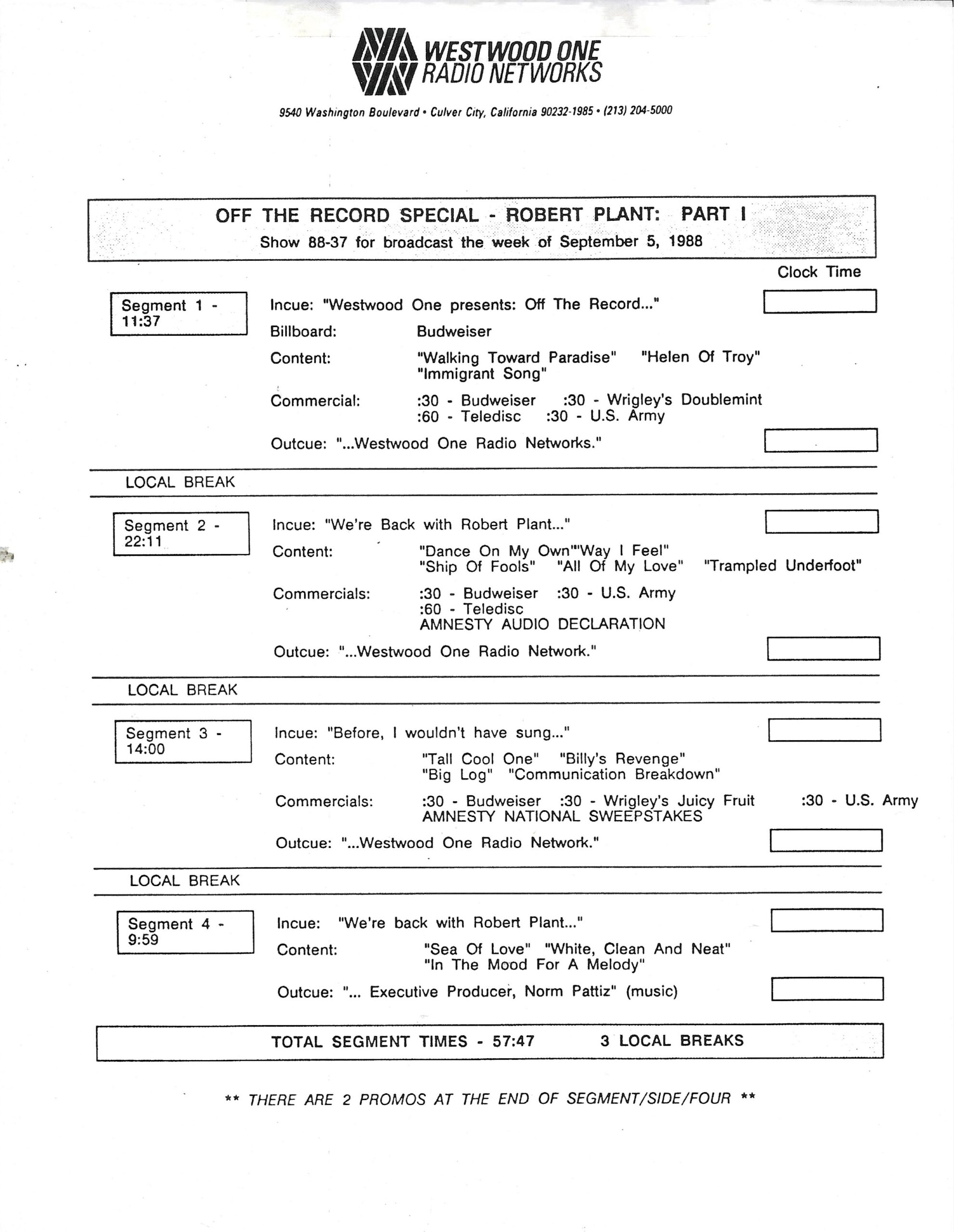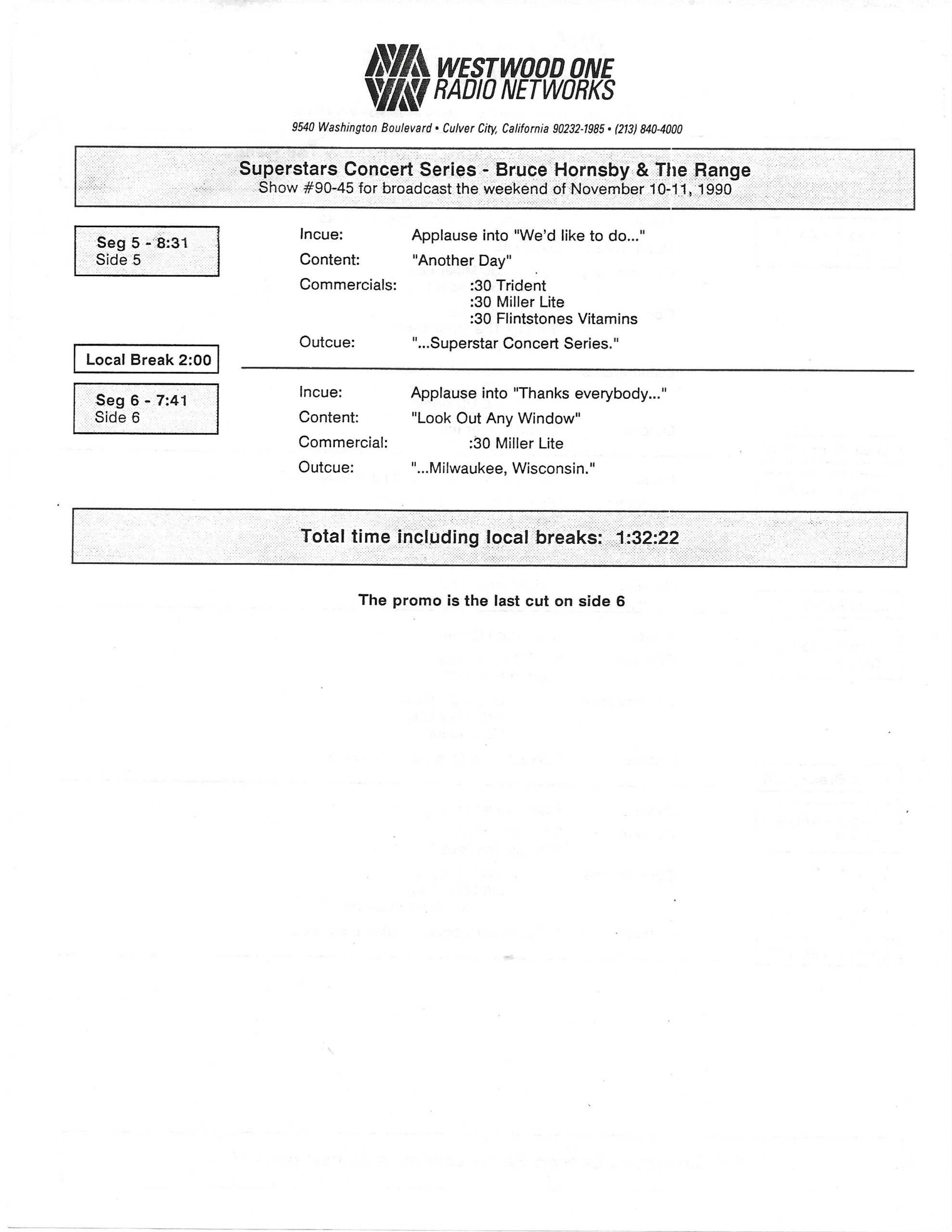 Tracks 1 – 4 are the actual radio show, Tracks 5 – 7 are promo spots, Tracks 8 – 15 are commercial spots, while Tracks 16 – 27 are the actual interview segments and segment intros separated into individual tracks.