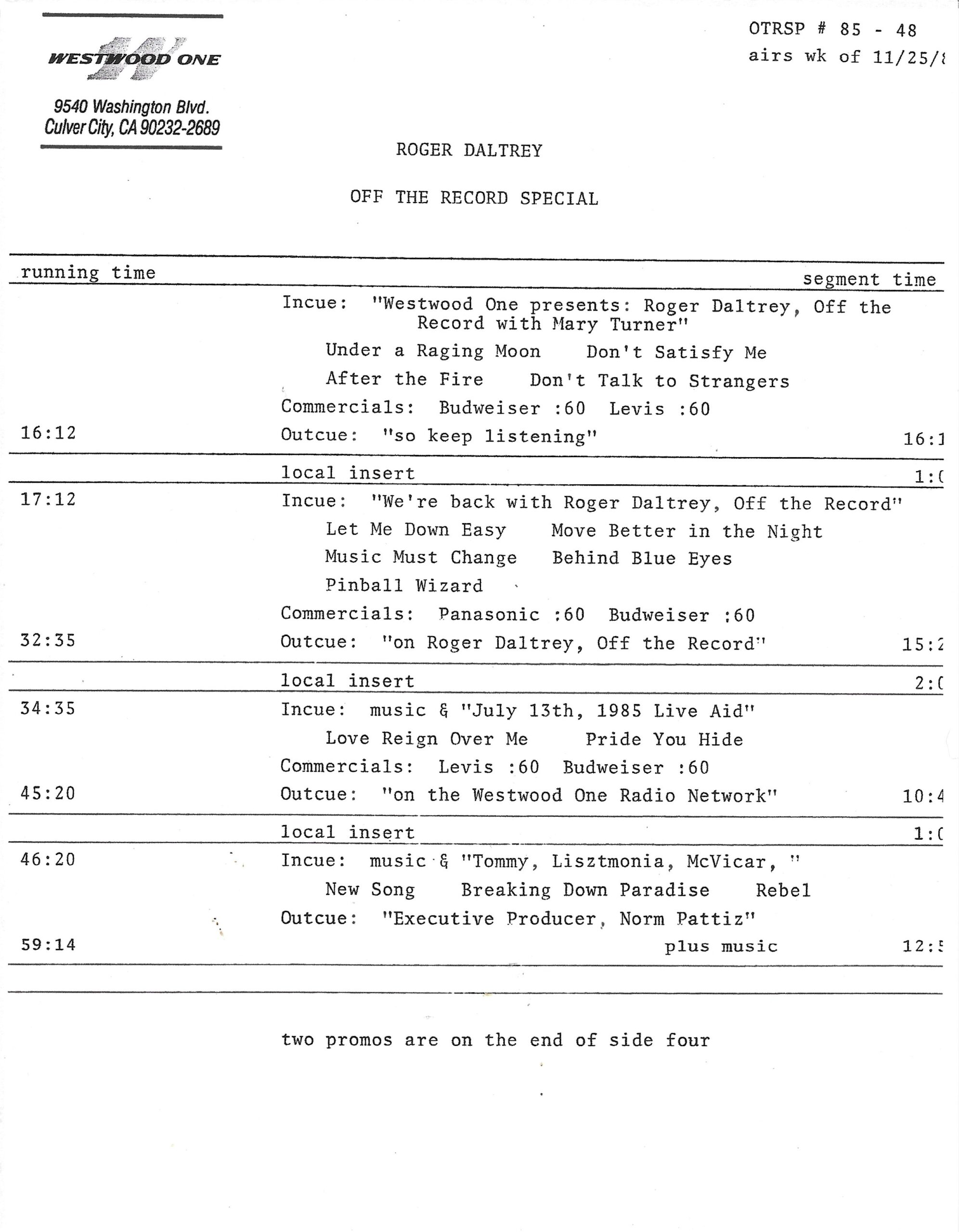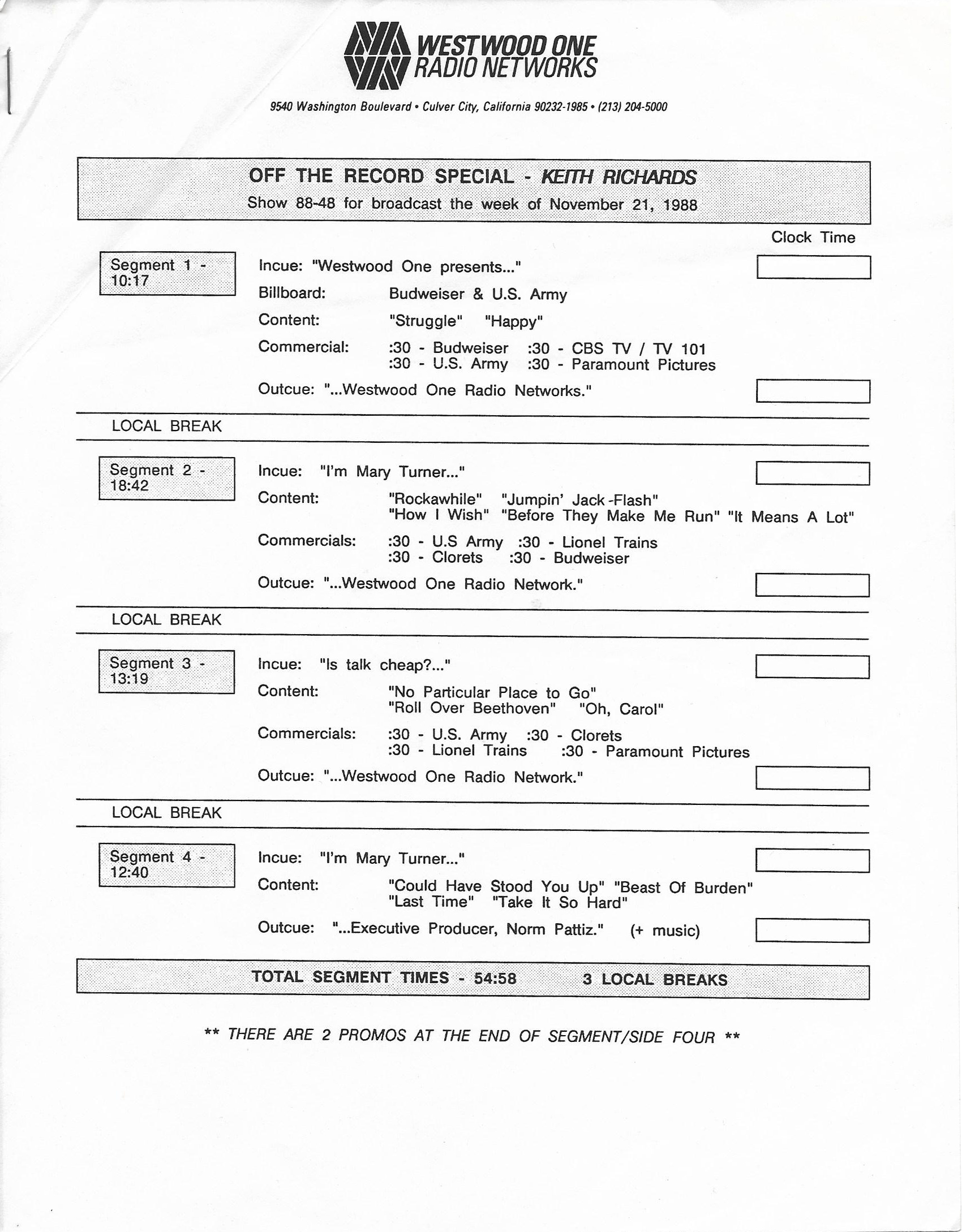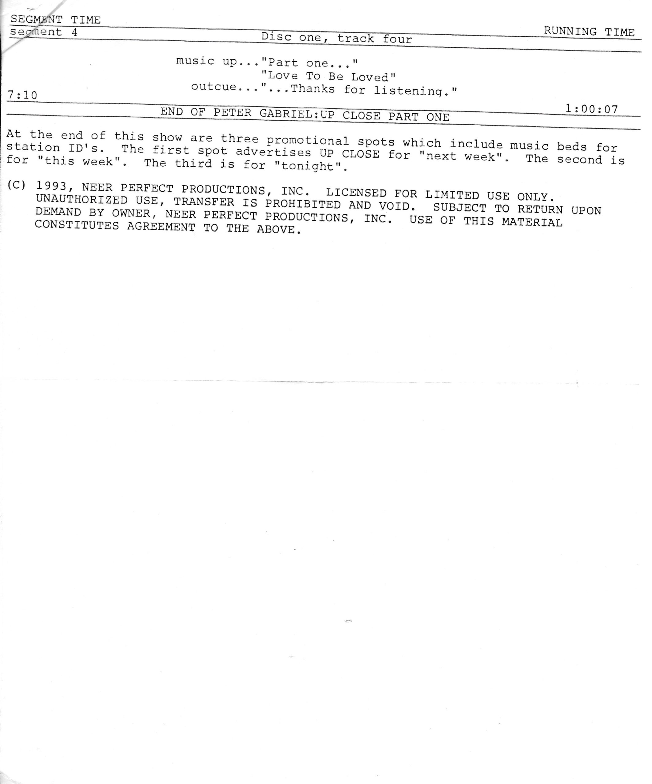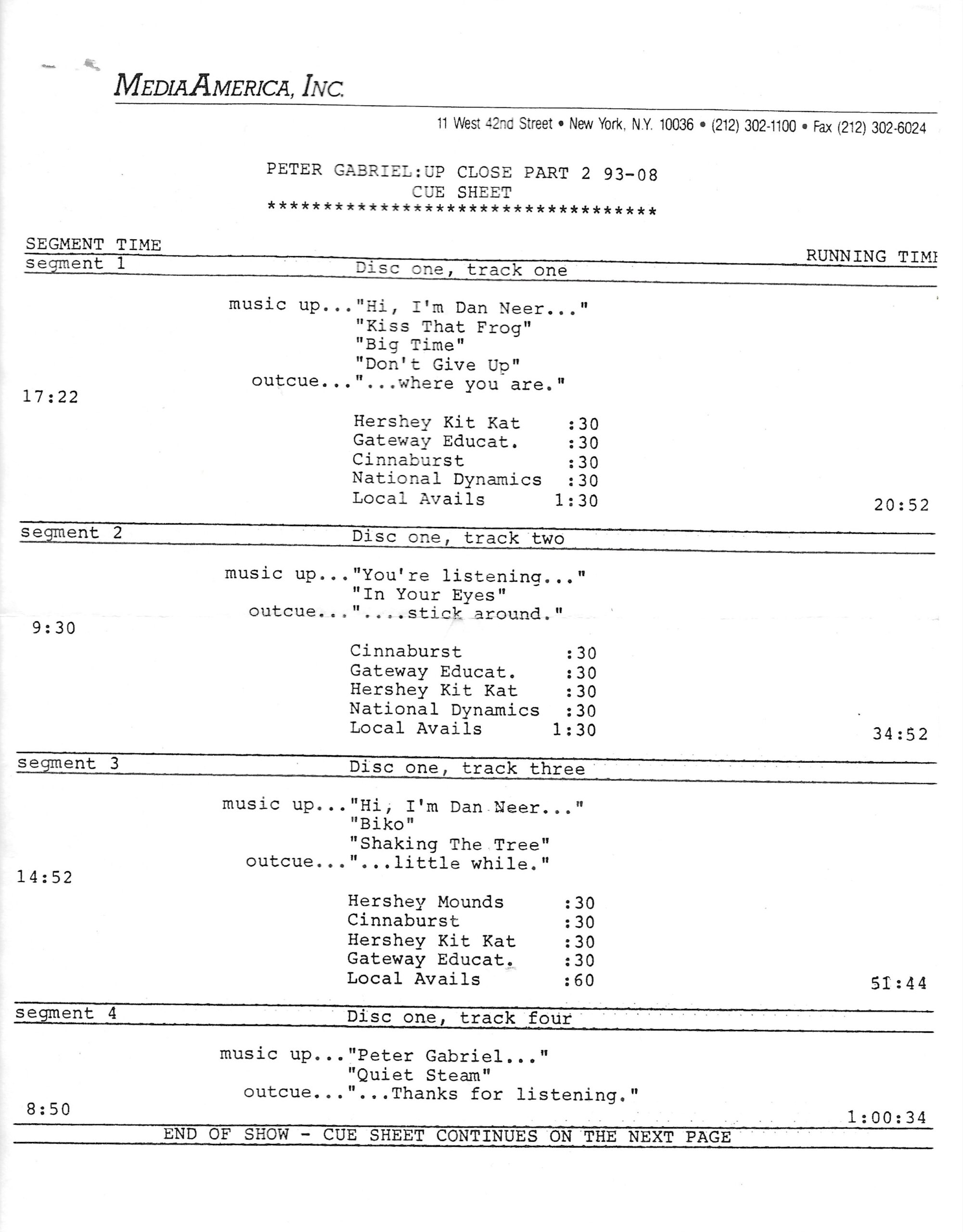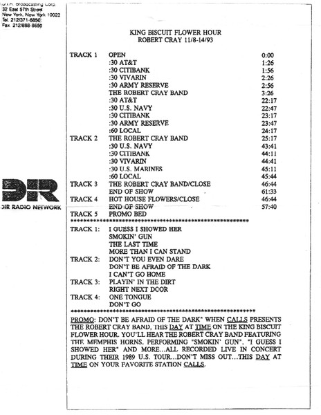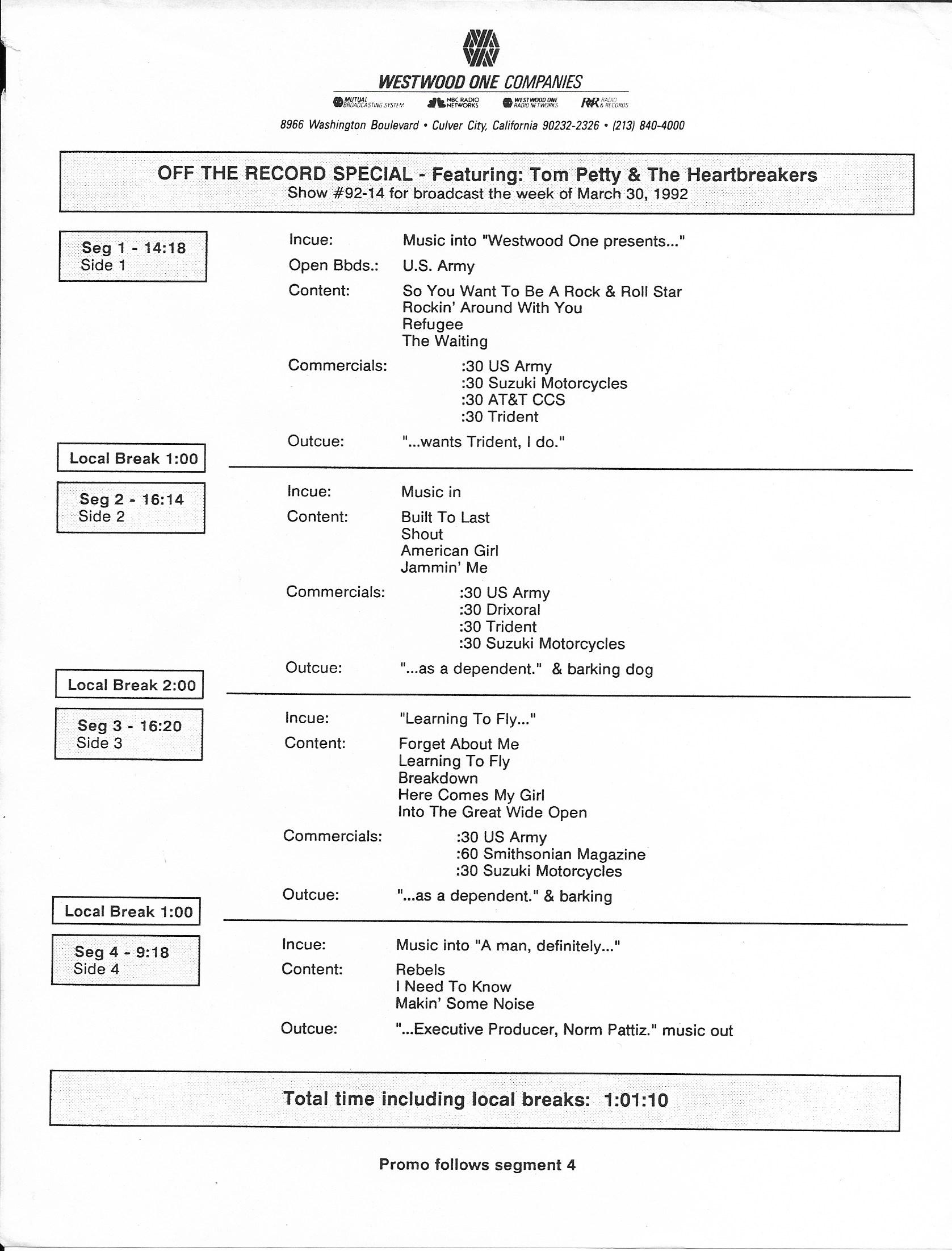 Tracks 1 – 4 are the actual radio show, Tracks 5 – 7 are promo spots, Tracks 8 – 17 are commercial spots, while Tracks 18 – 29 are the actual interview segments separated into individual tracks.