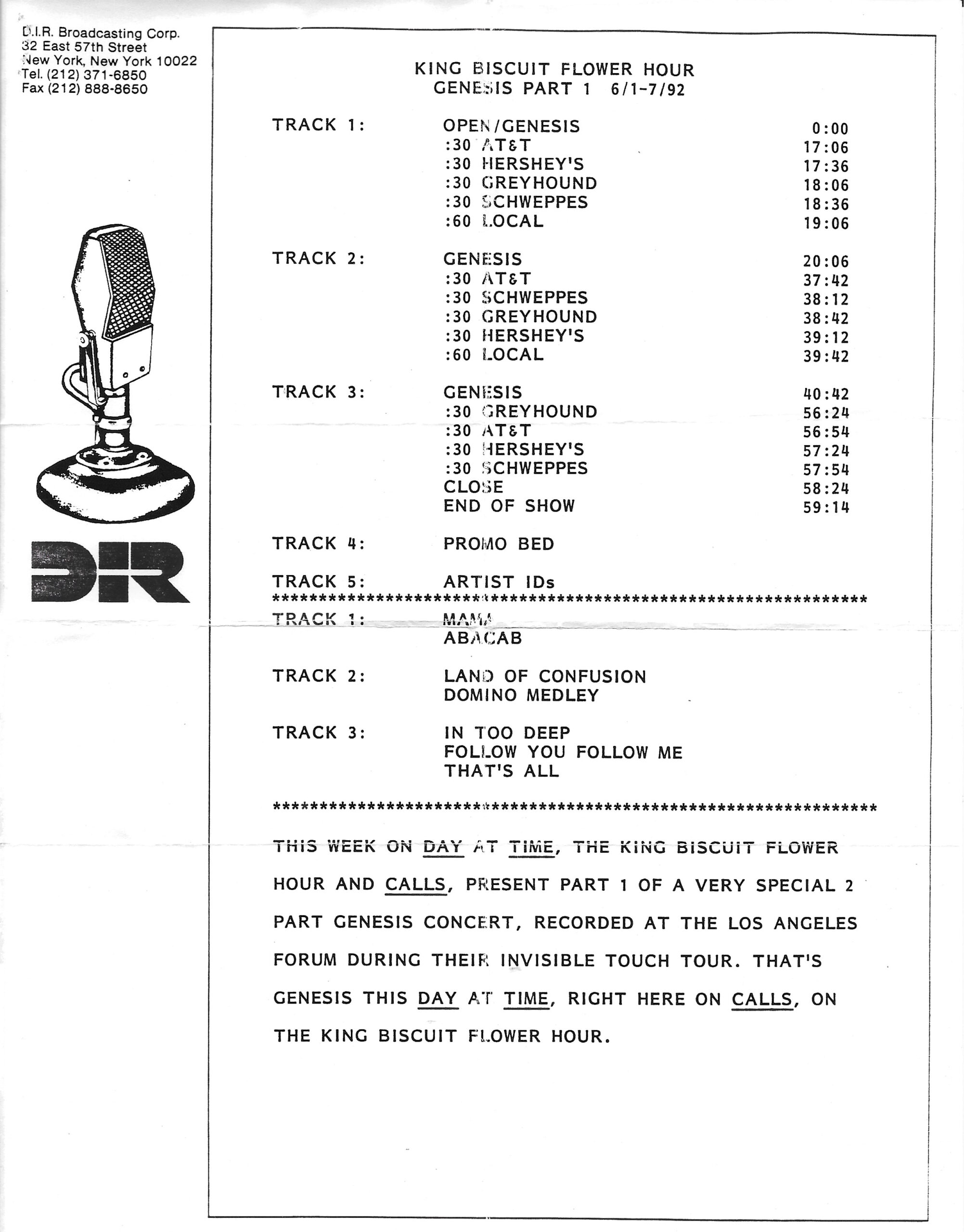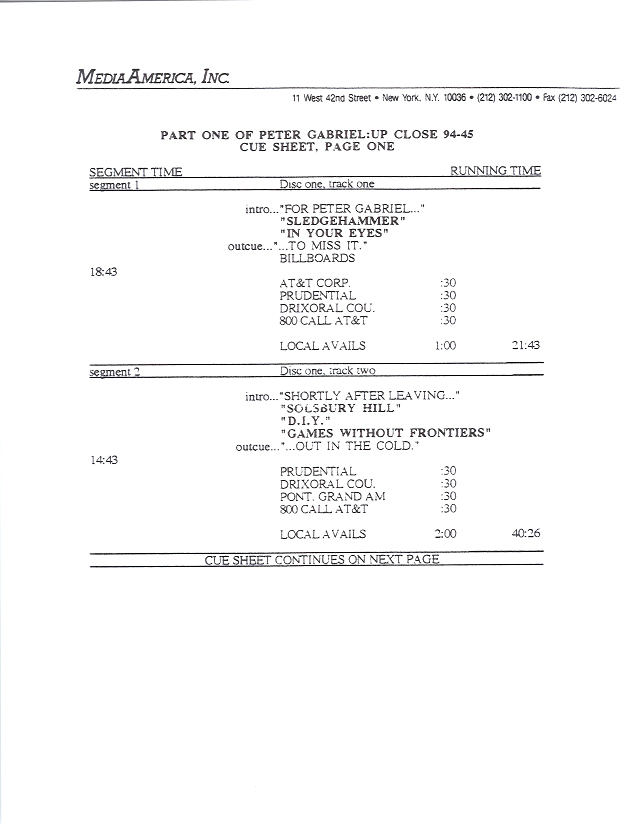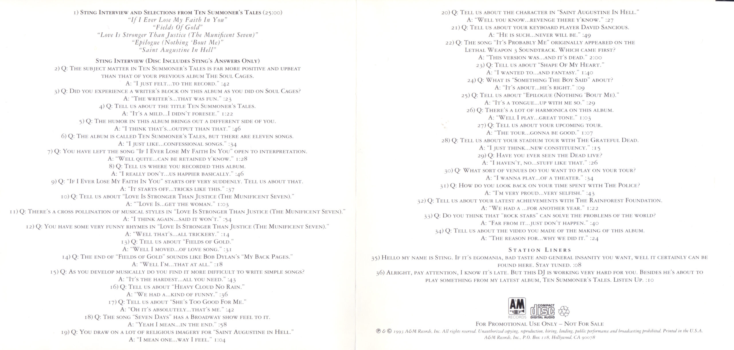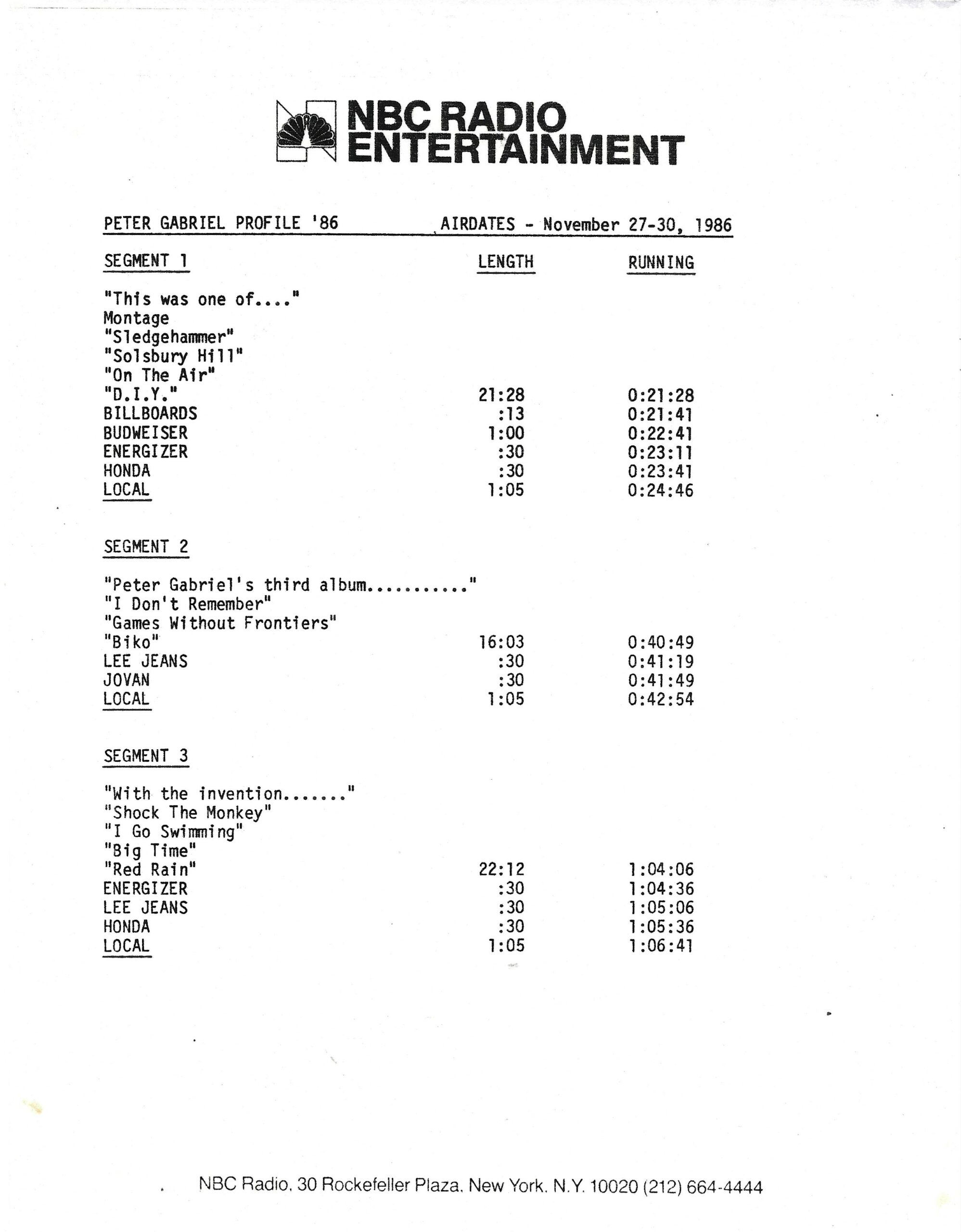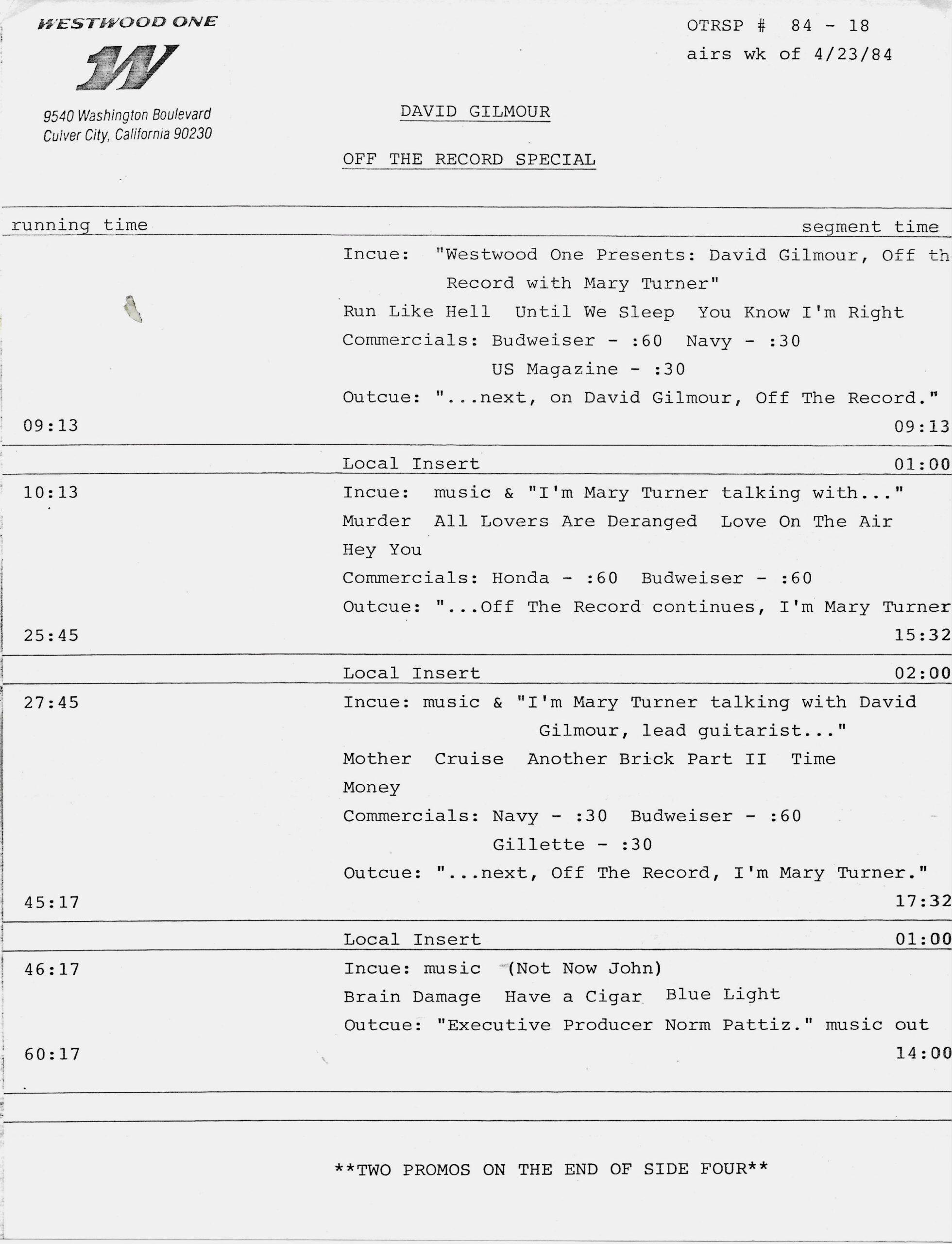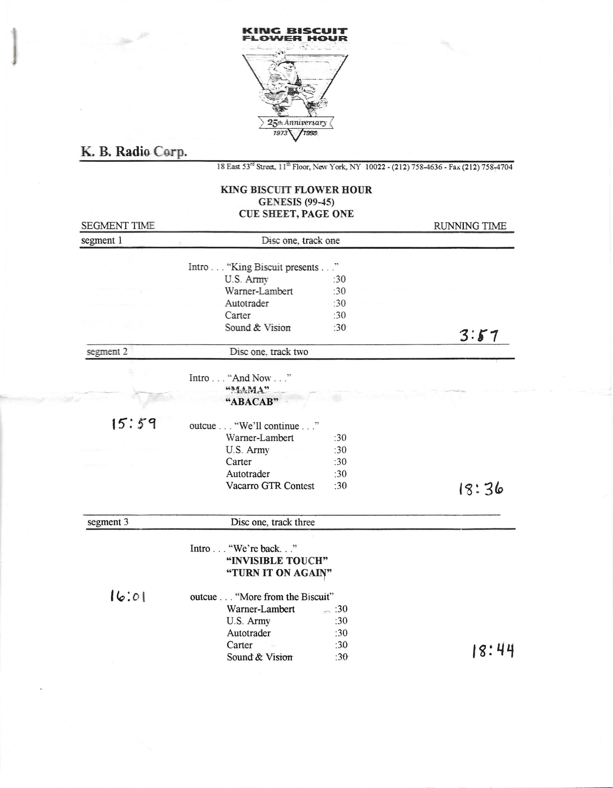 Tracks 1 – 4 are the actual radio show, Tracks 5 – 7 are promo spots, Tracks 8 – 17 are commercial spots, while Tracks 18 – 29 are the actual interview segments separated into individual tracks.