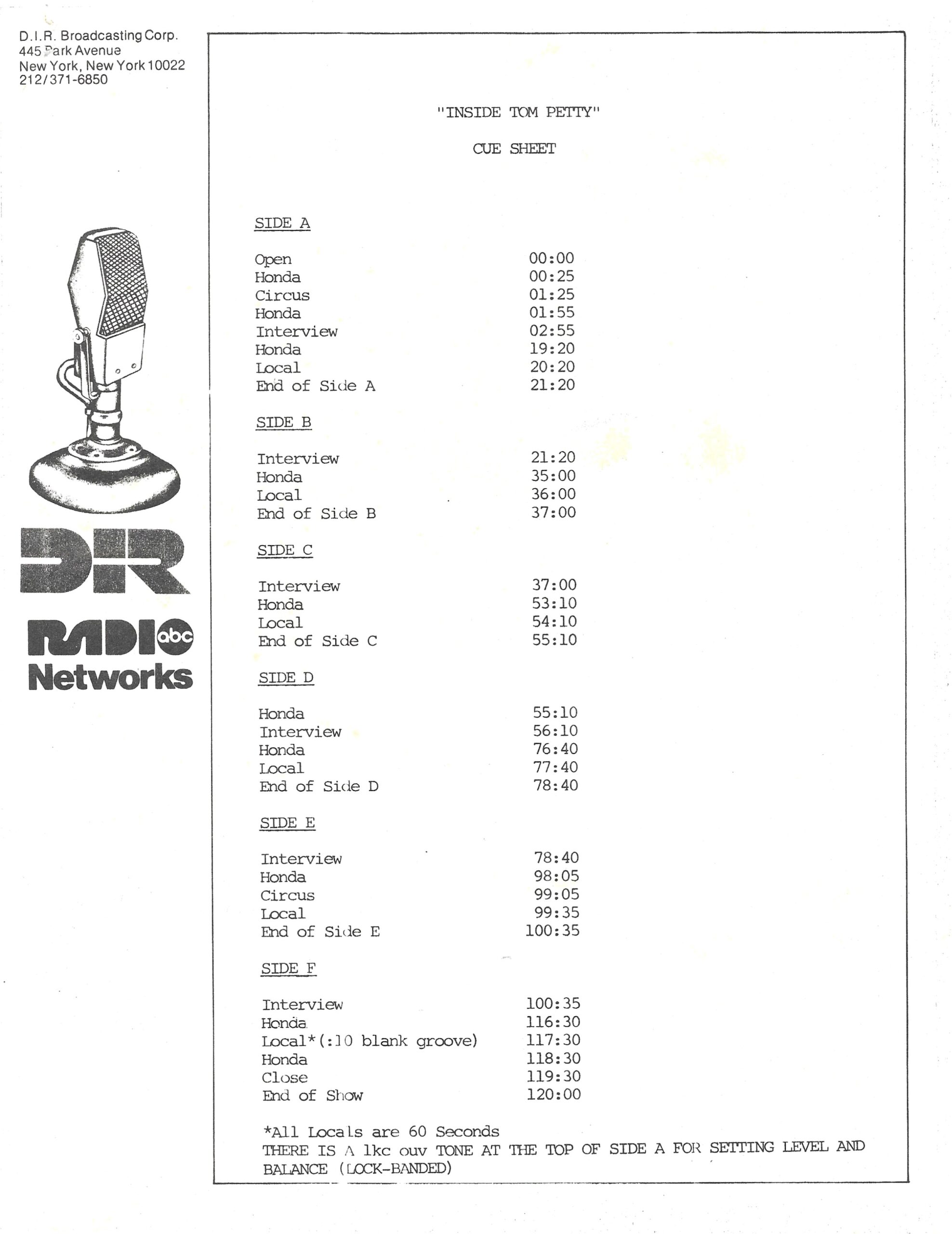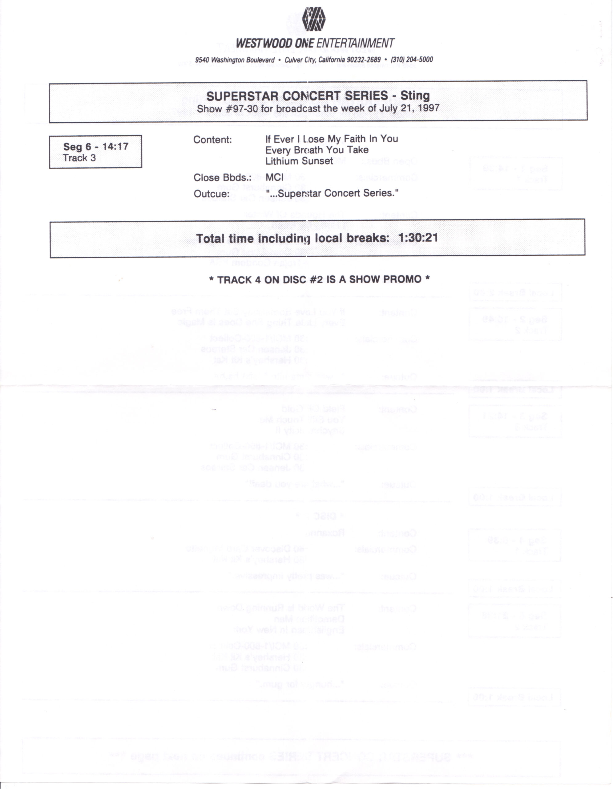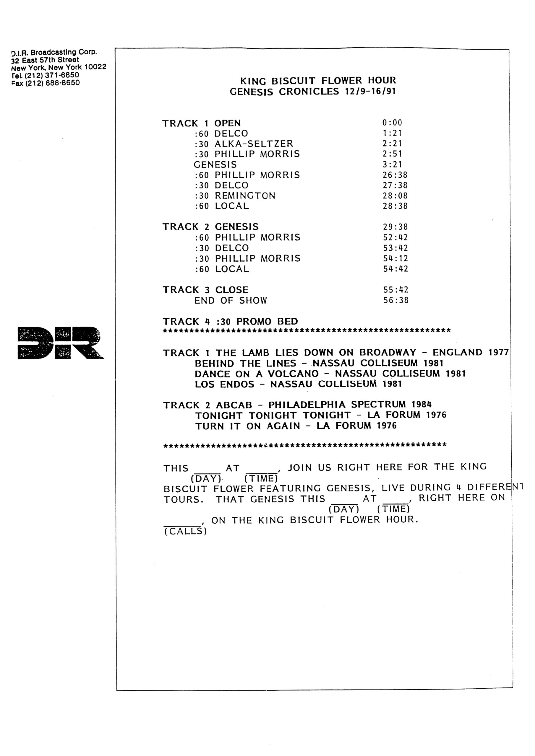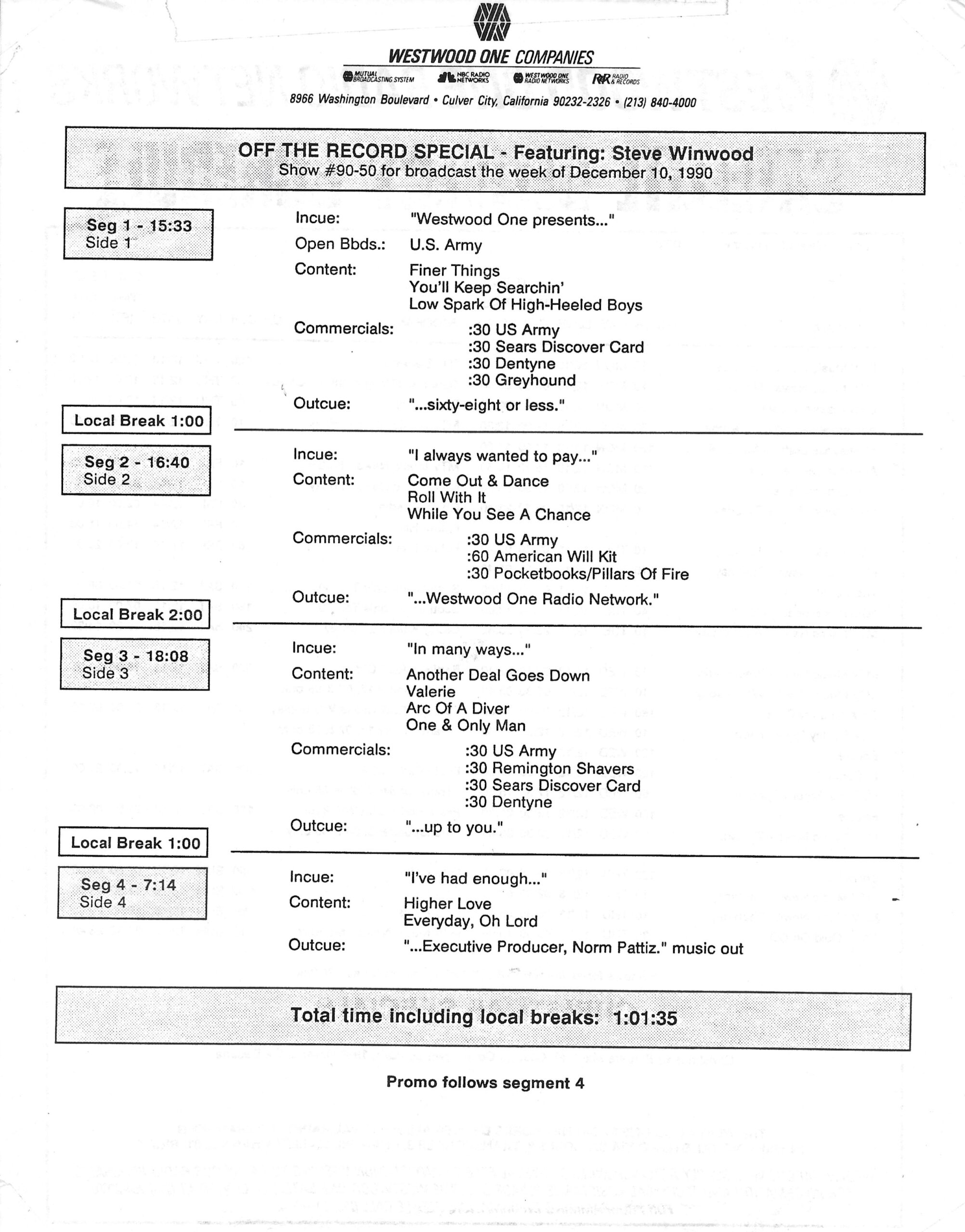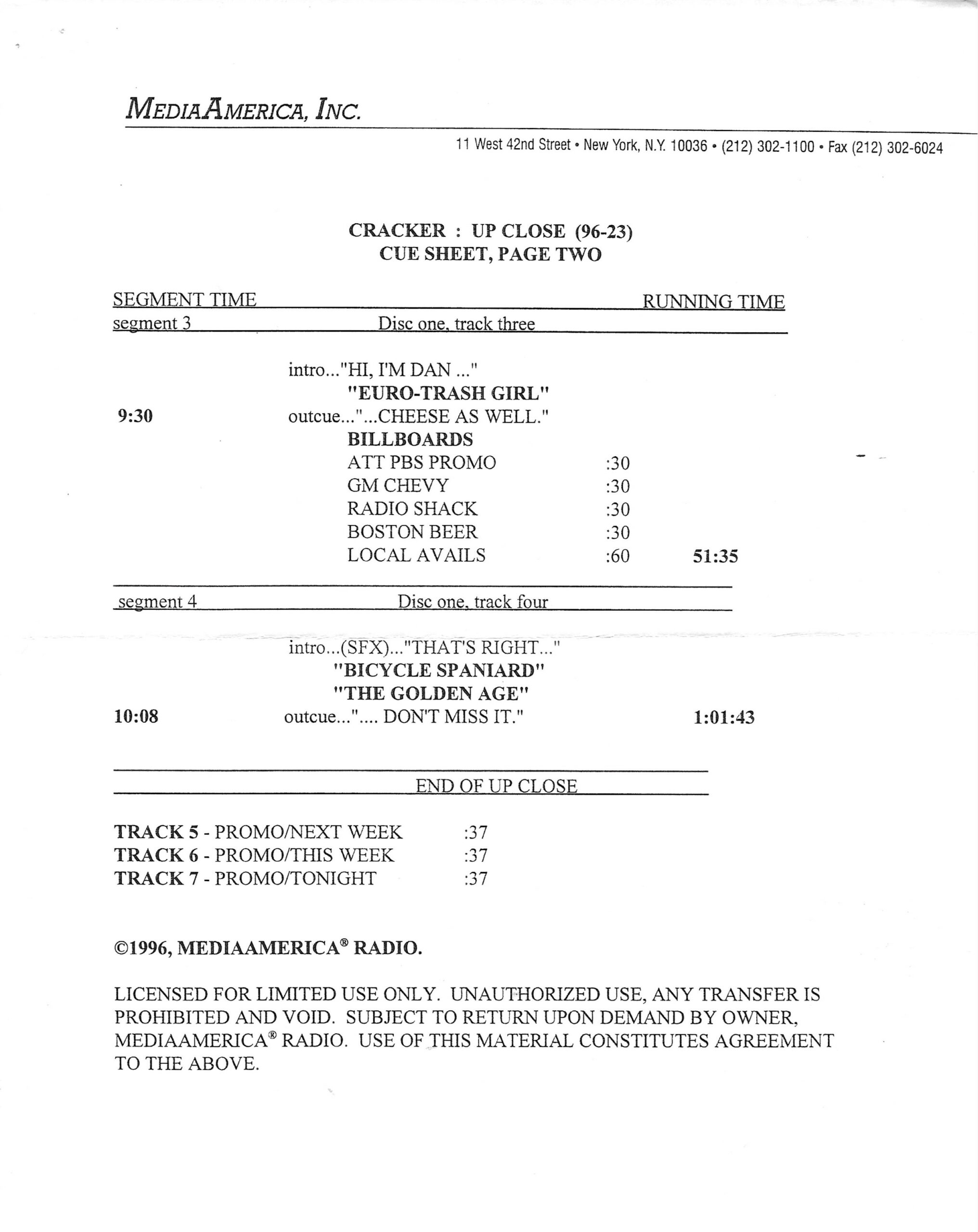 Tracks 1 – 4 are the actual radio show, Tracks 5 – 7 are promo spots, Tracks 8 – 17 are commercial spots, while Tracks 18 – 29 are the actual interview segments separated into individual tracks.