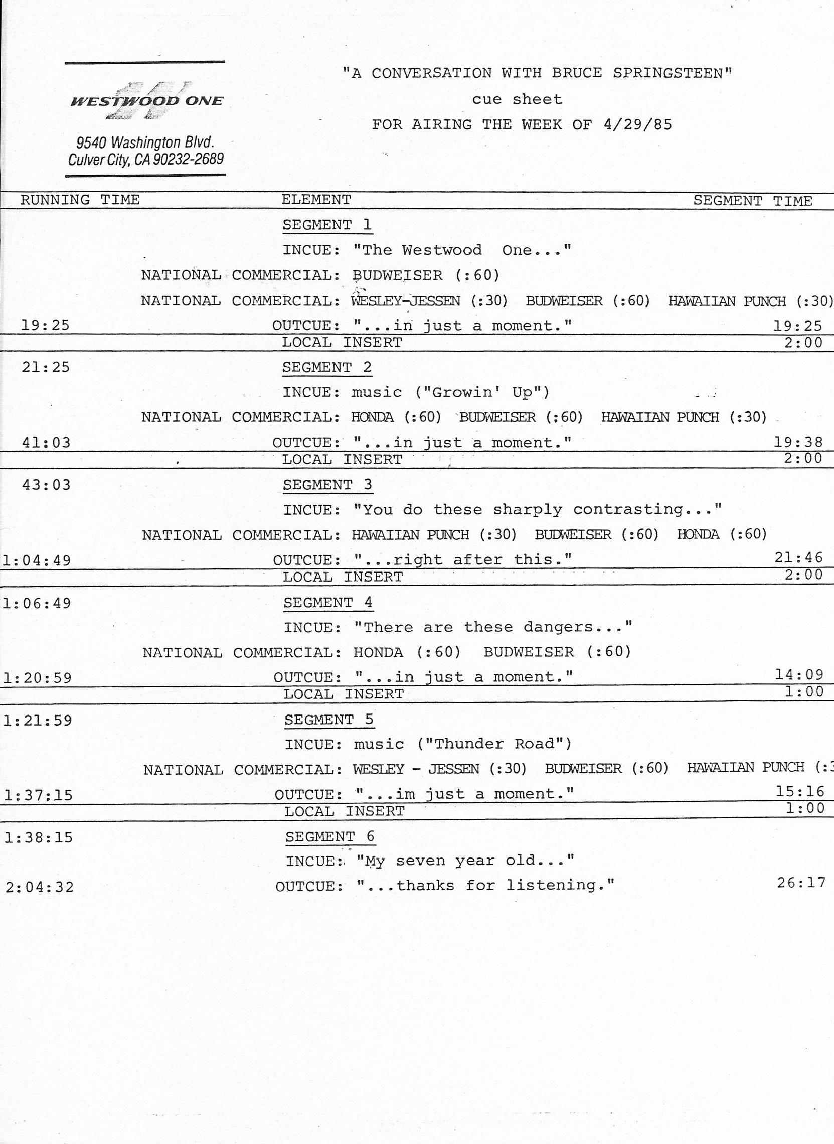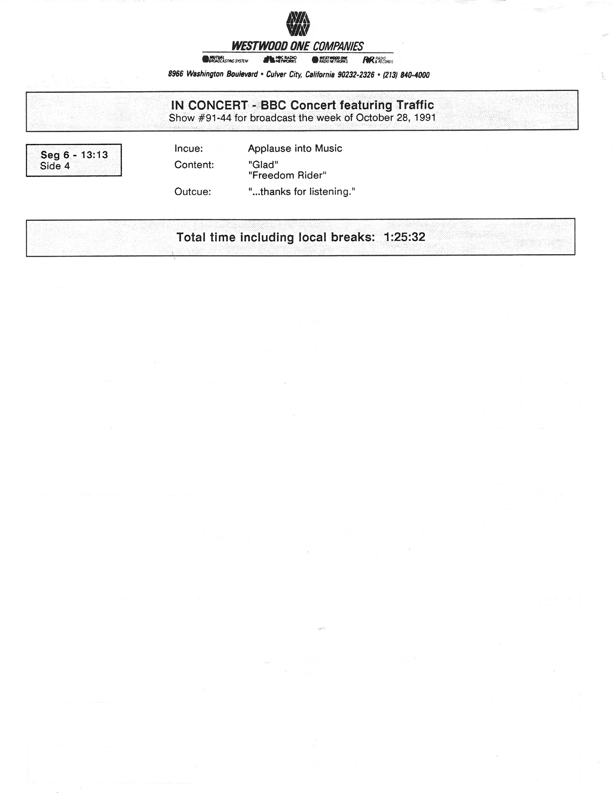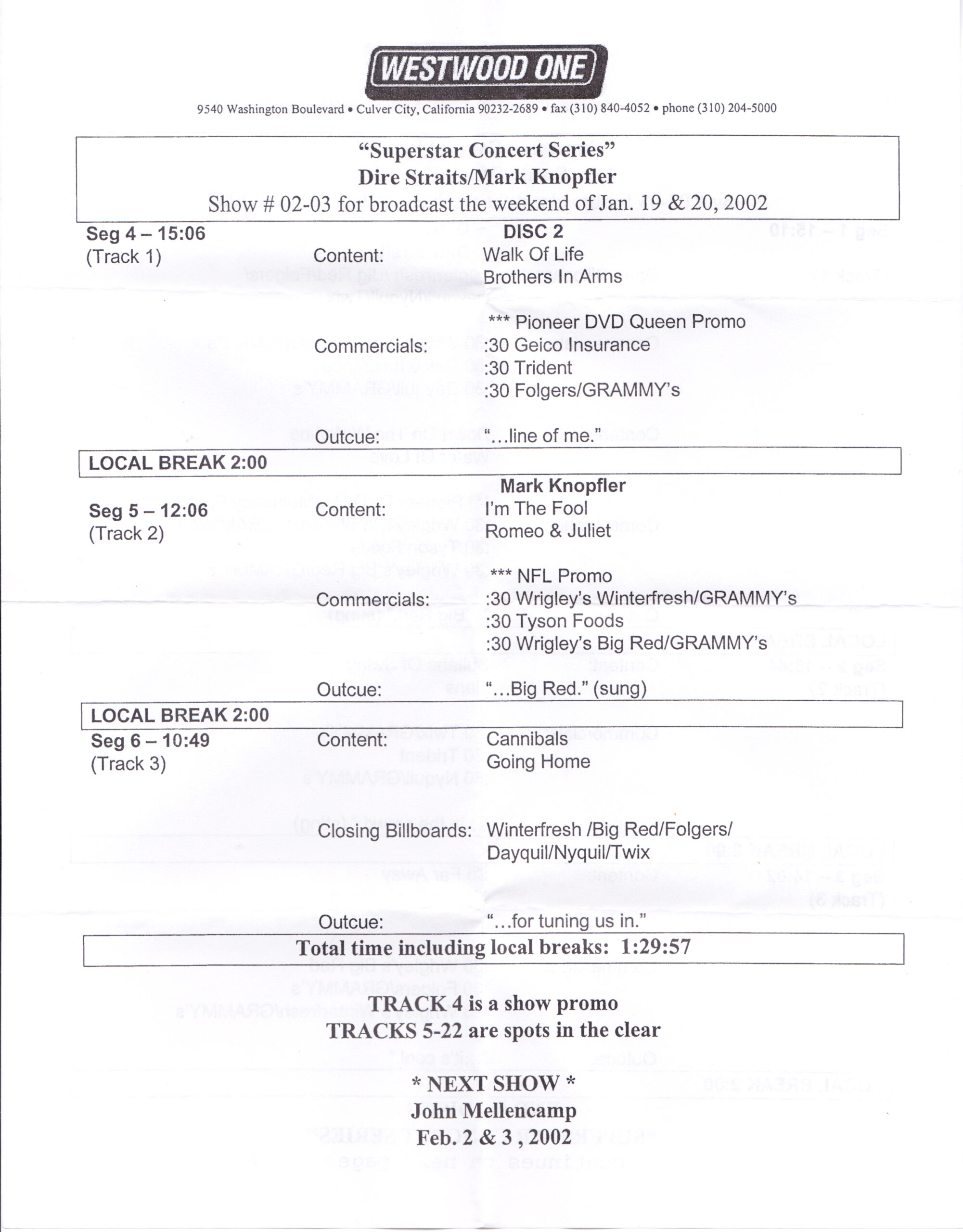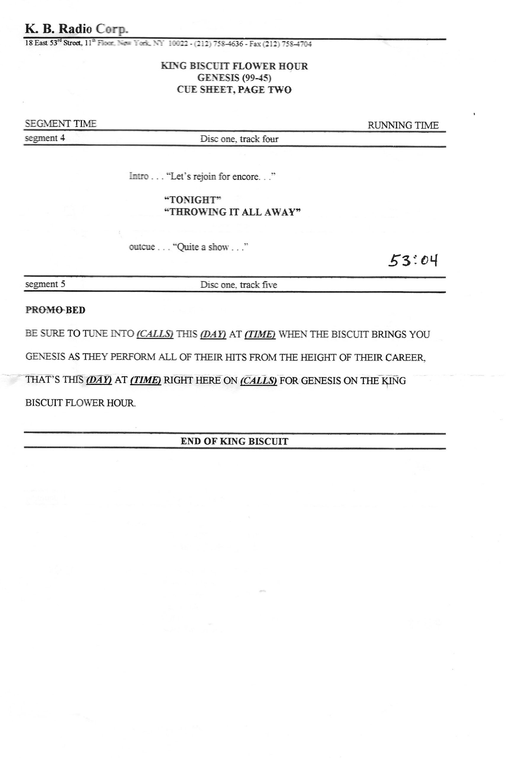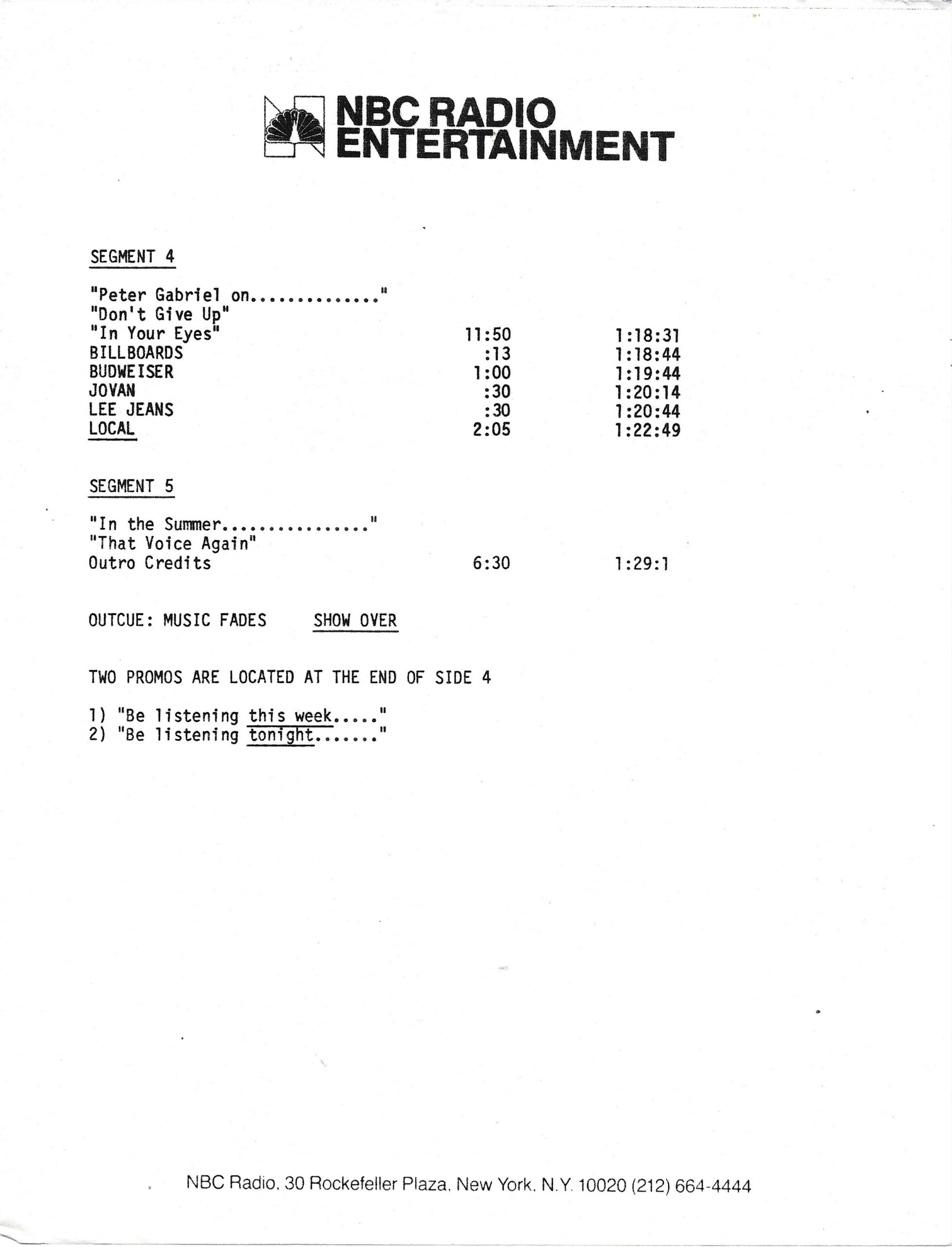 Tracks 1 – 4 are the actual radio show, Tracks 5 – 7 are promo spots, Tracks 8 – 17 are commercial spots, while Tracks 18 – 29 are the actual interview segments separated into individual tracks.