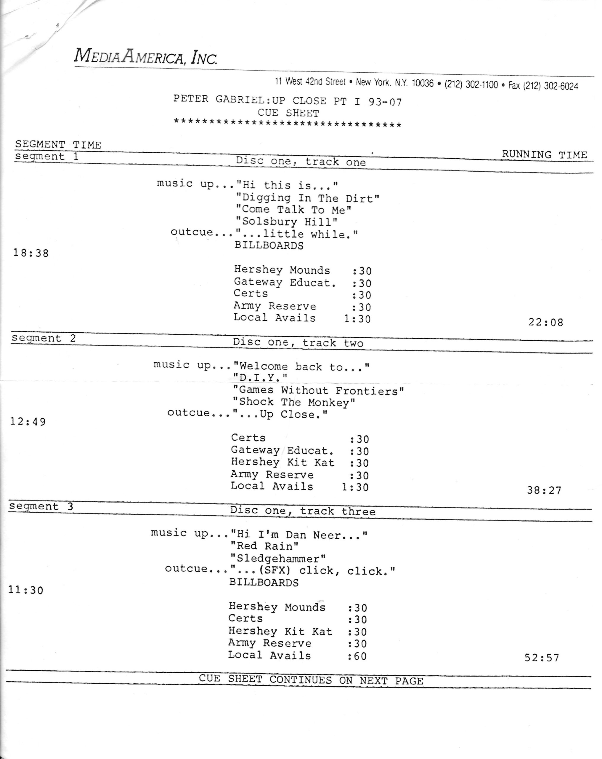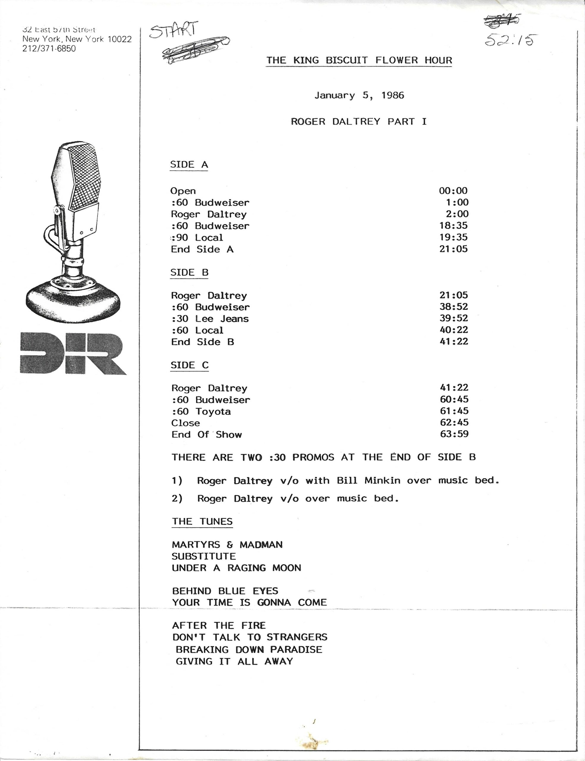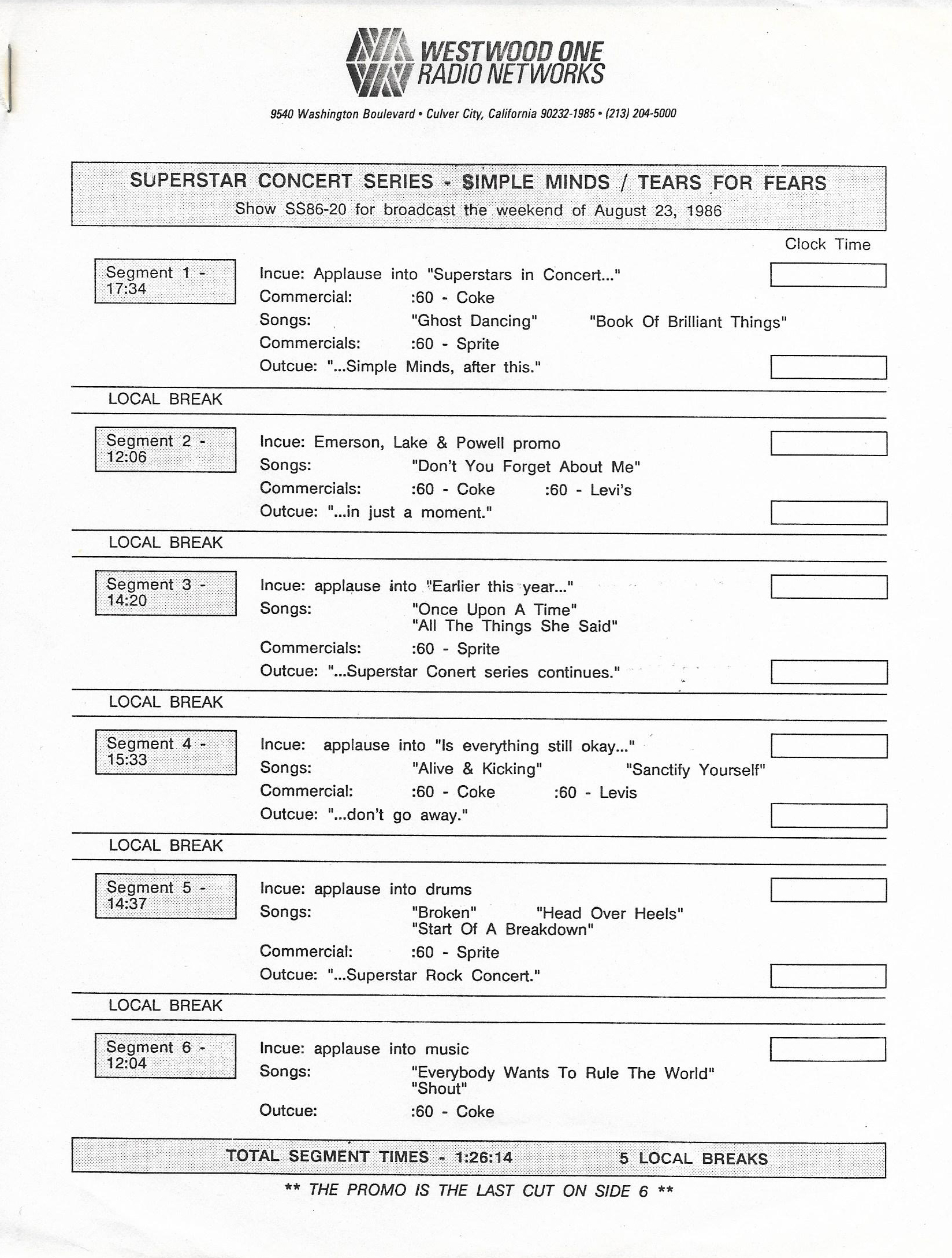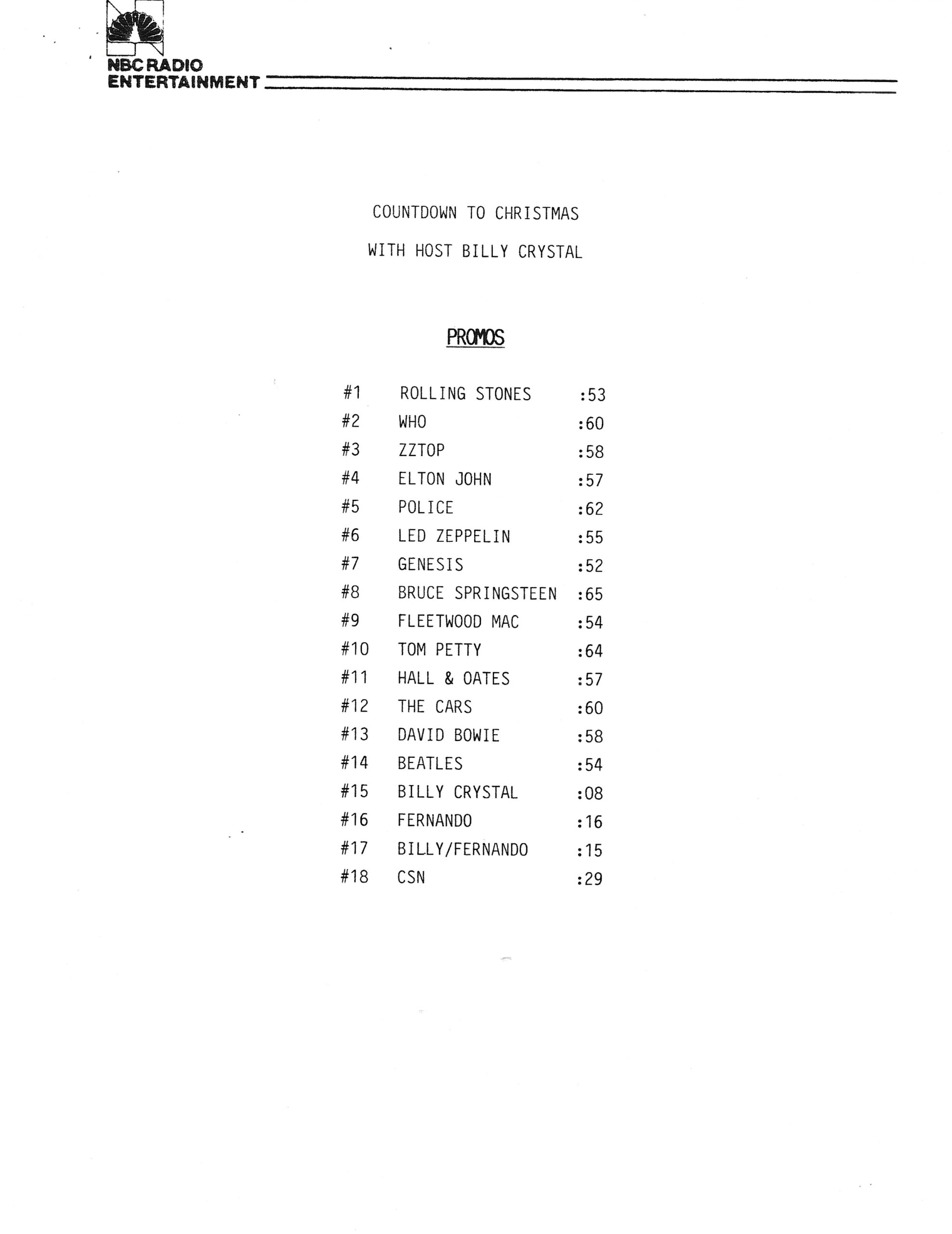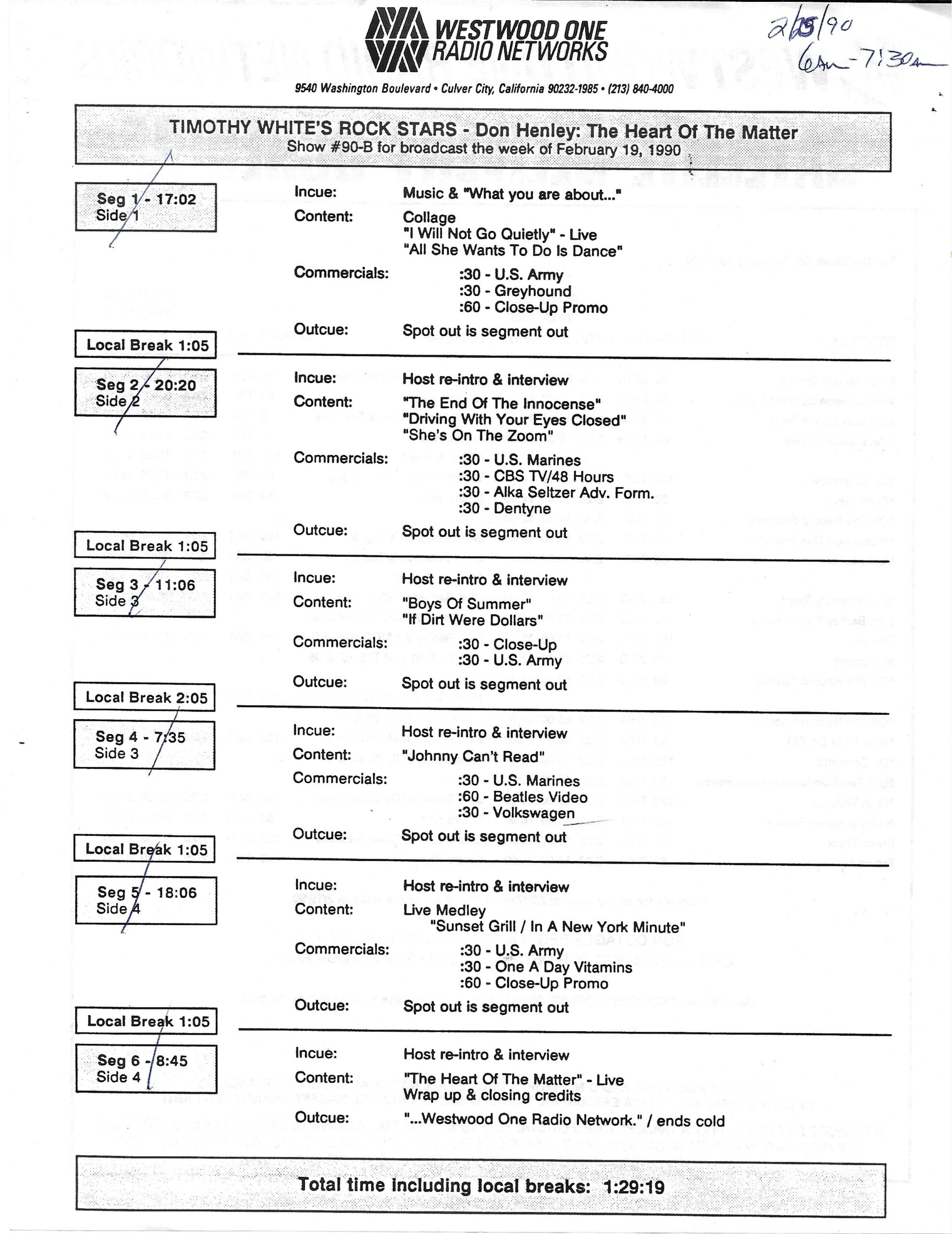 Tracks 1 – 4 are the actual radio show, Tracks 5 – 7 are promo spots, Tracks 8 – 17 are commercial spots, while Tracks 18 – 29 are the actual interview segments separated into individual tracks.
