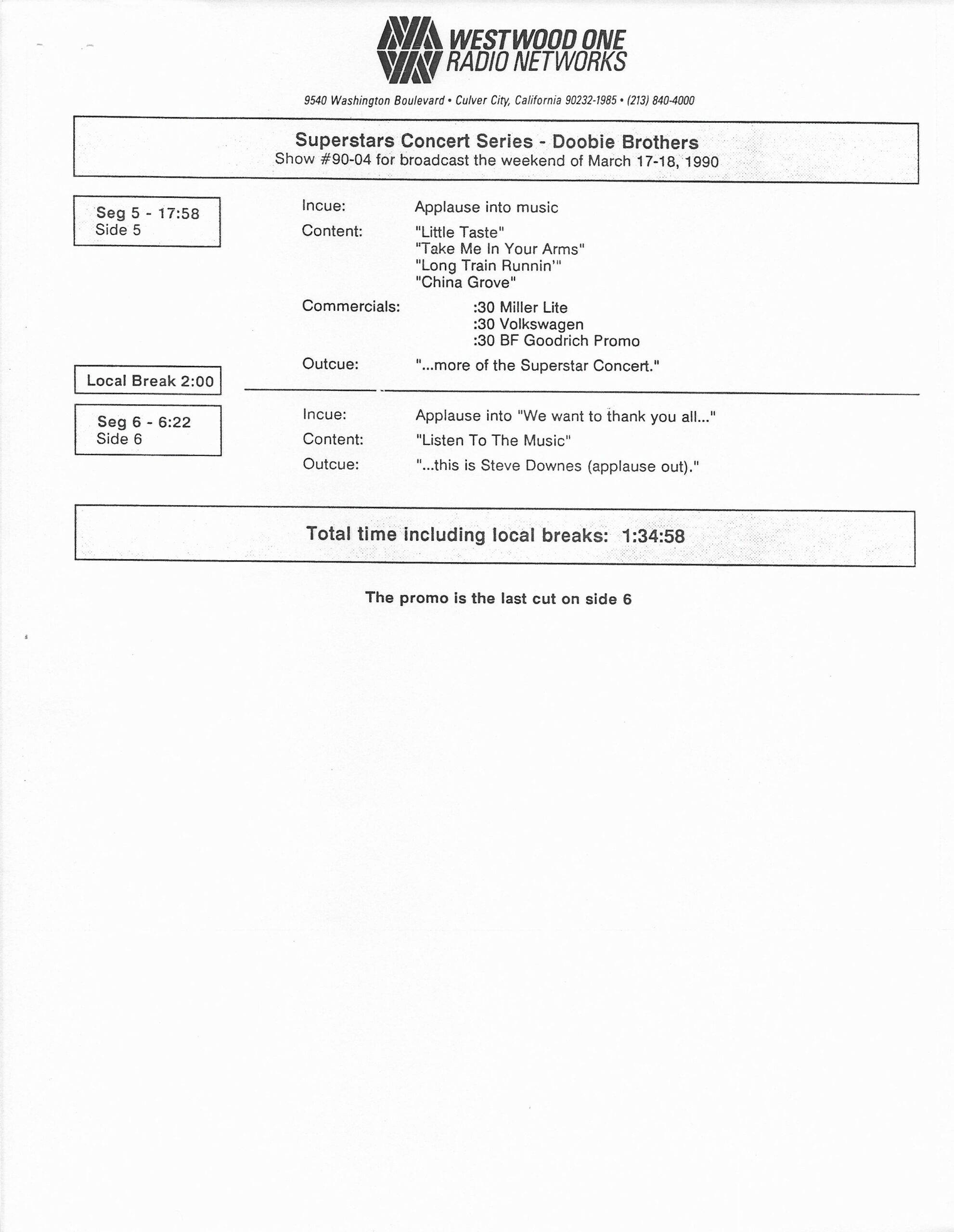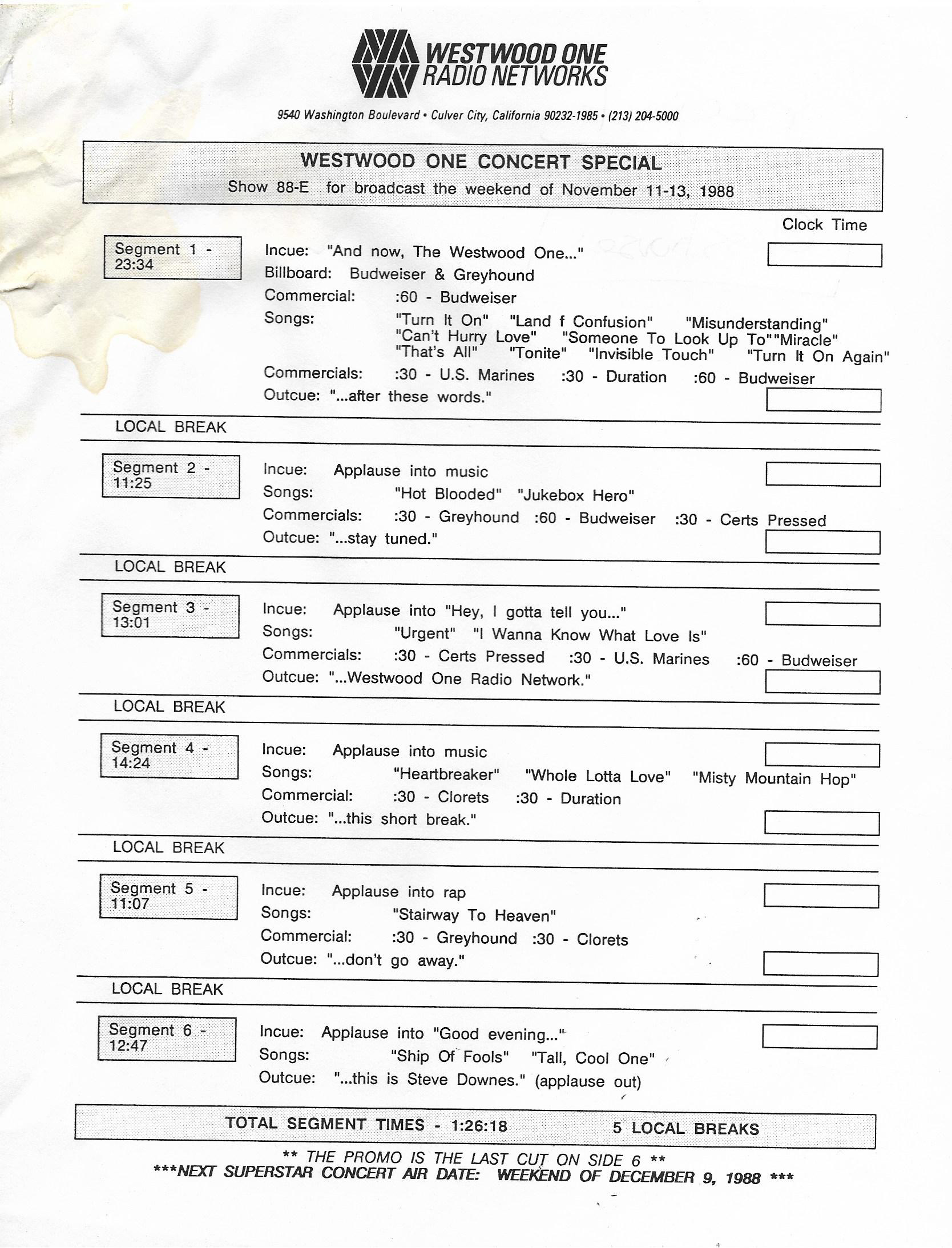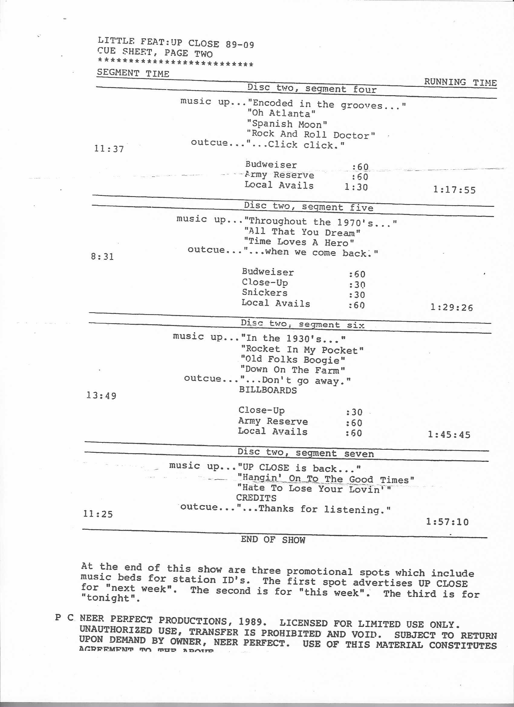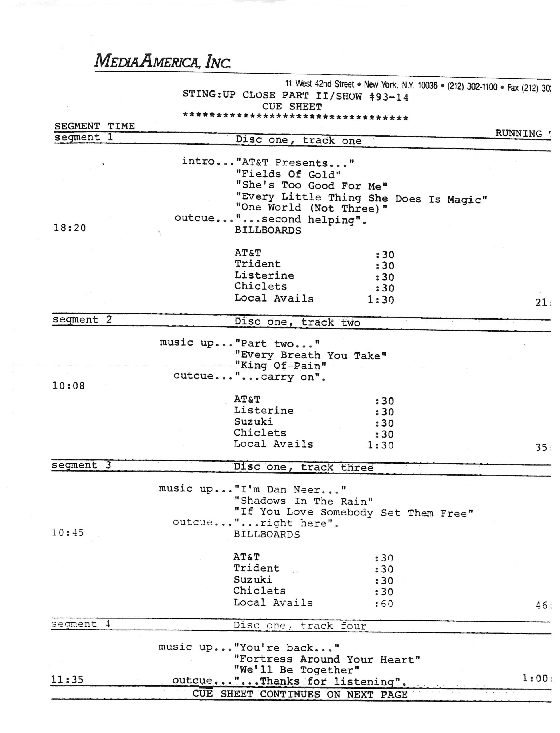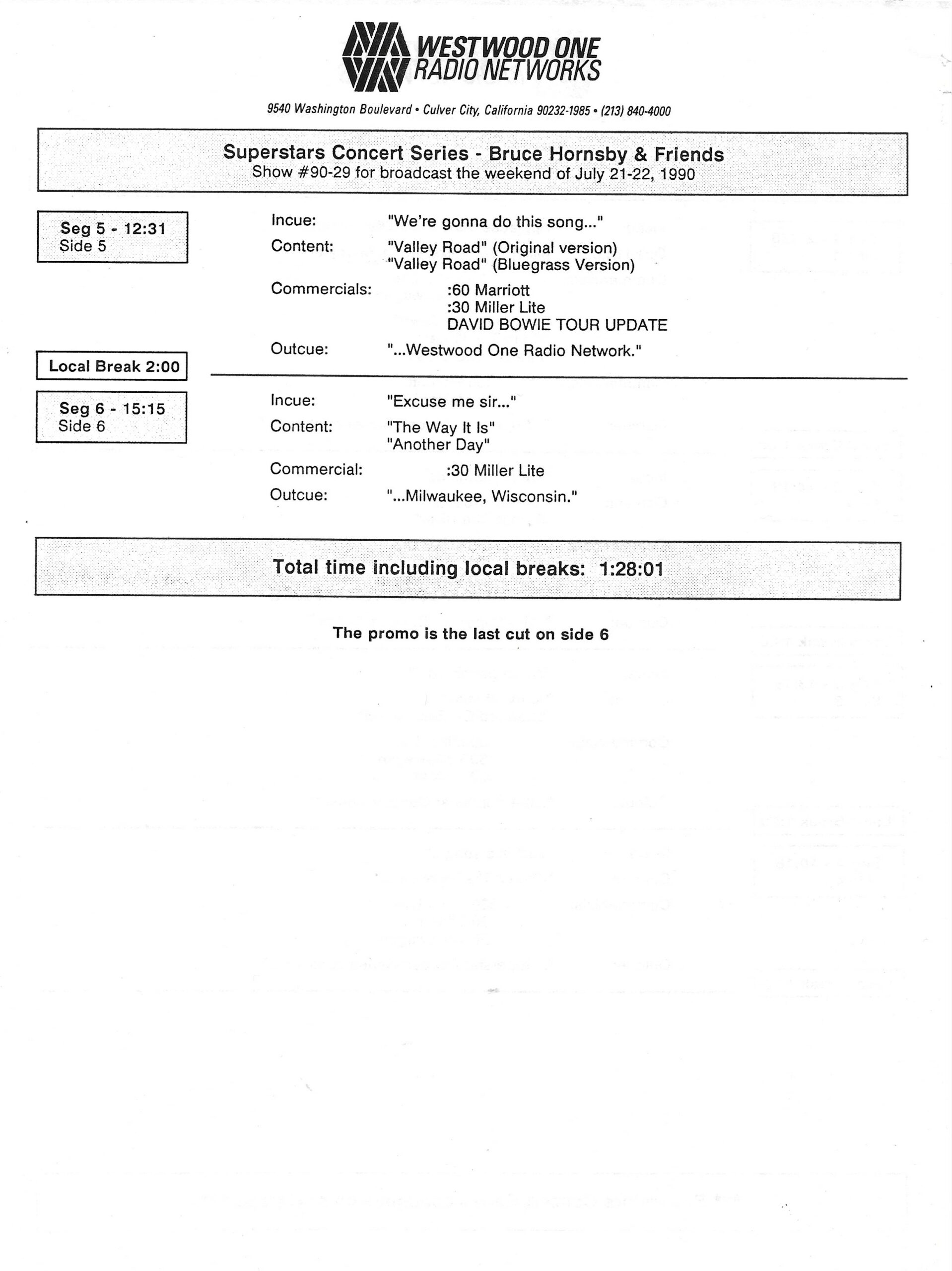 Tracks 1 – 4 are the actual radio show, Tracks 5 – 7 are promo spots, Tracks 8 – 17 are commercial spots, while Tracks 18 – 29 are the actual interview segments separated into individual tracks.