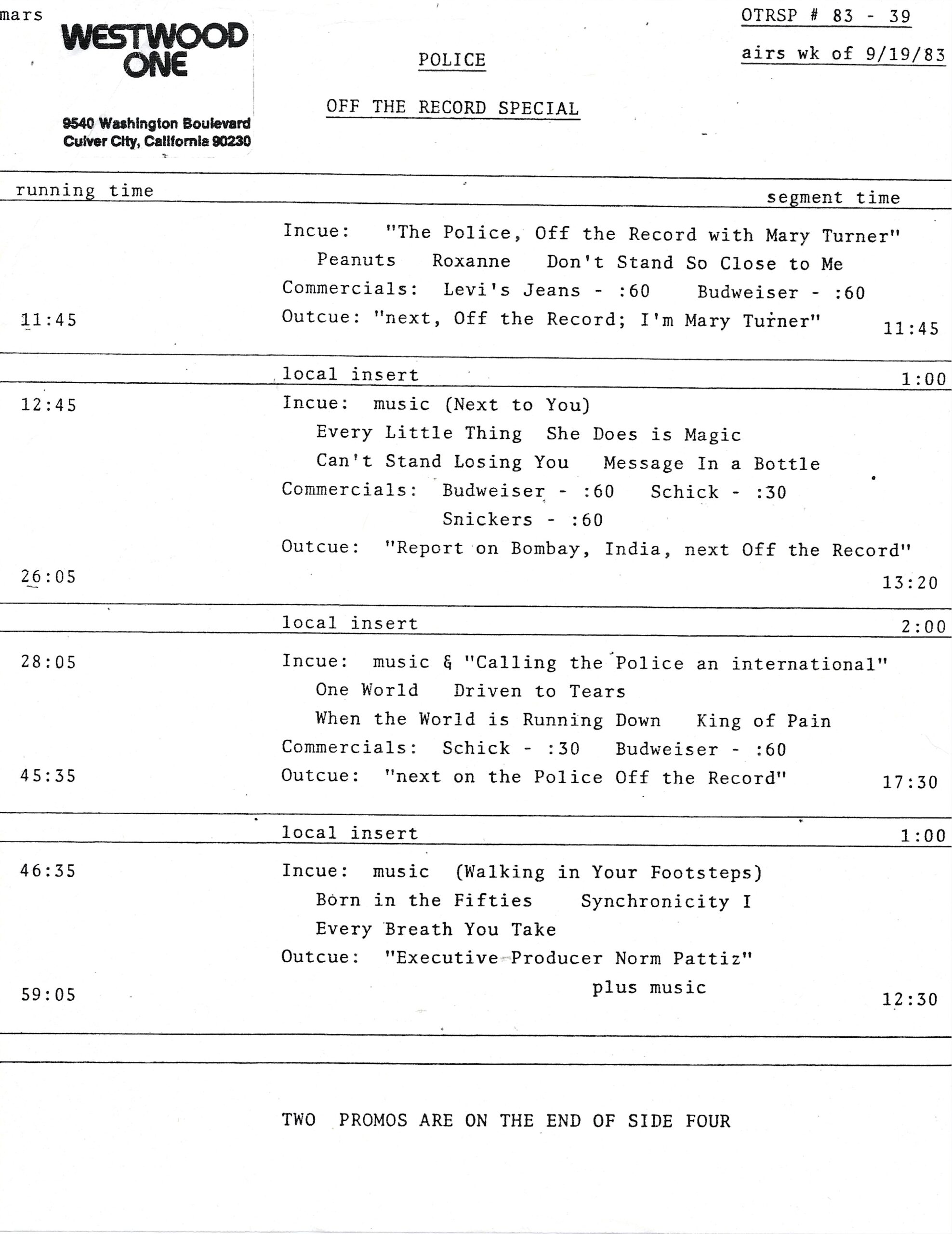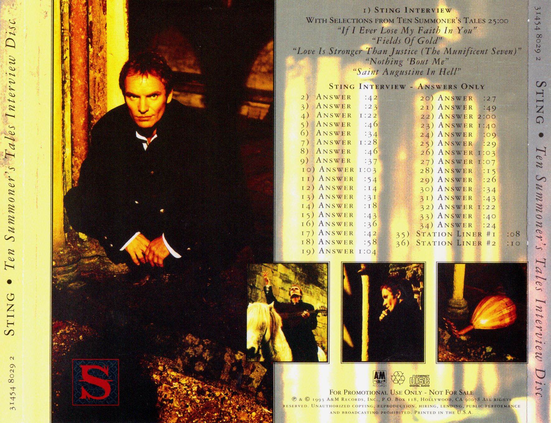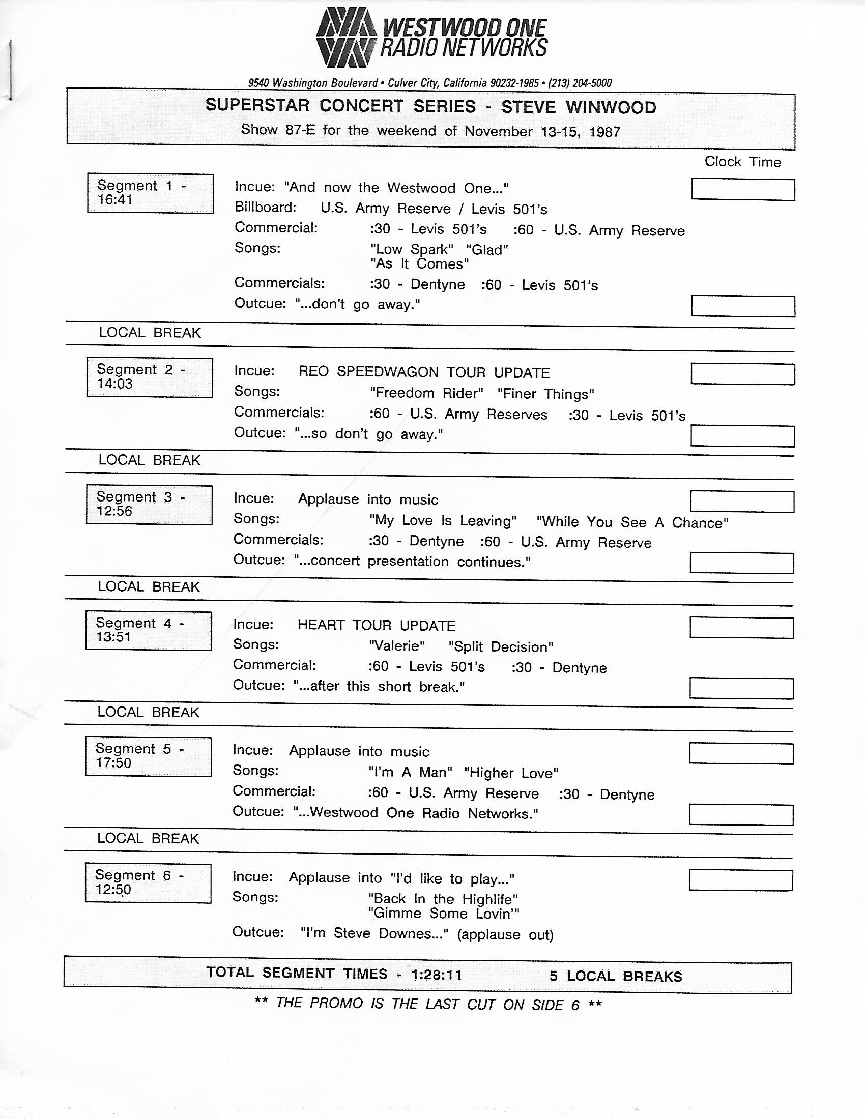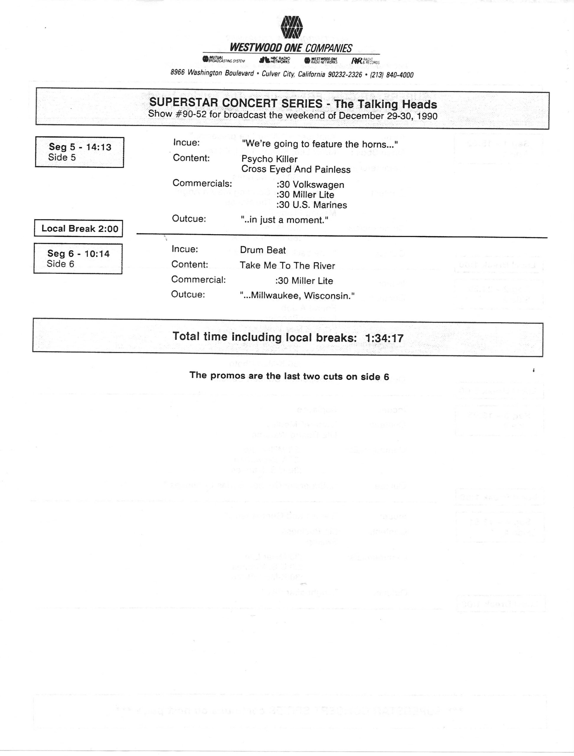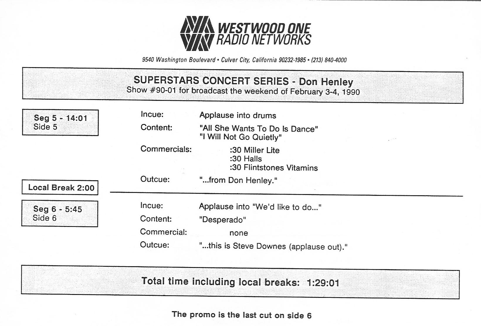 Tracks 1 – 4 are the actual radio show, Tracks 5 – 7 are promo spots, Tracks 8 – 17 are commercial spots, while Tracks 18 – 29 are the actual interview segments separated into individual tracks.