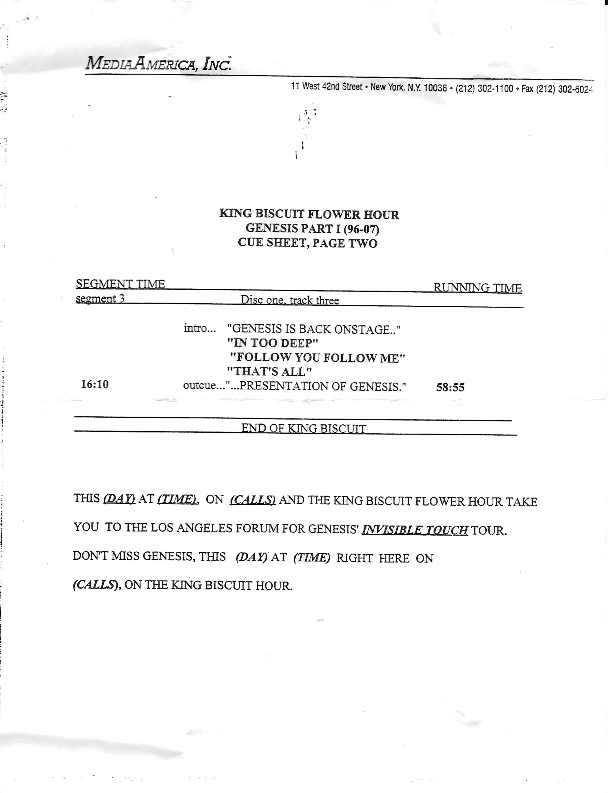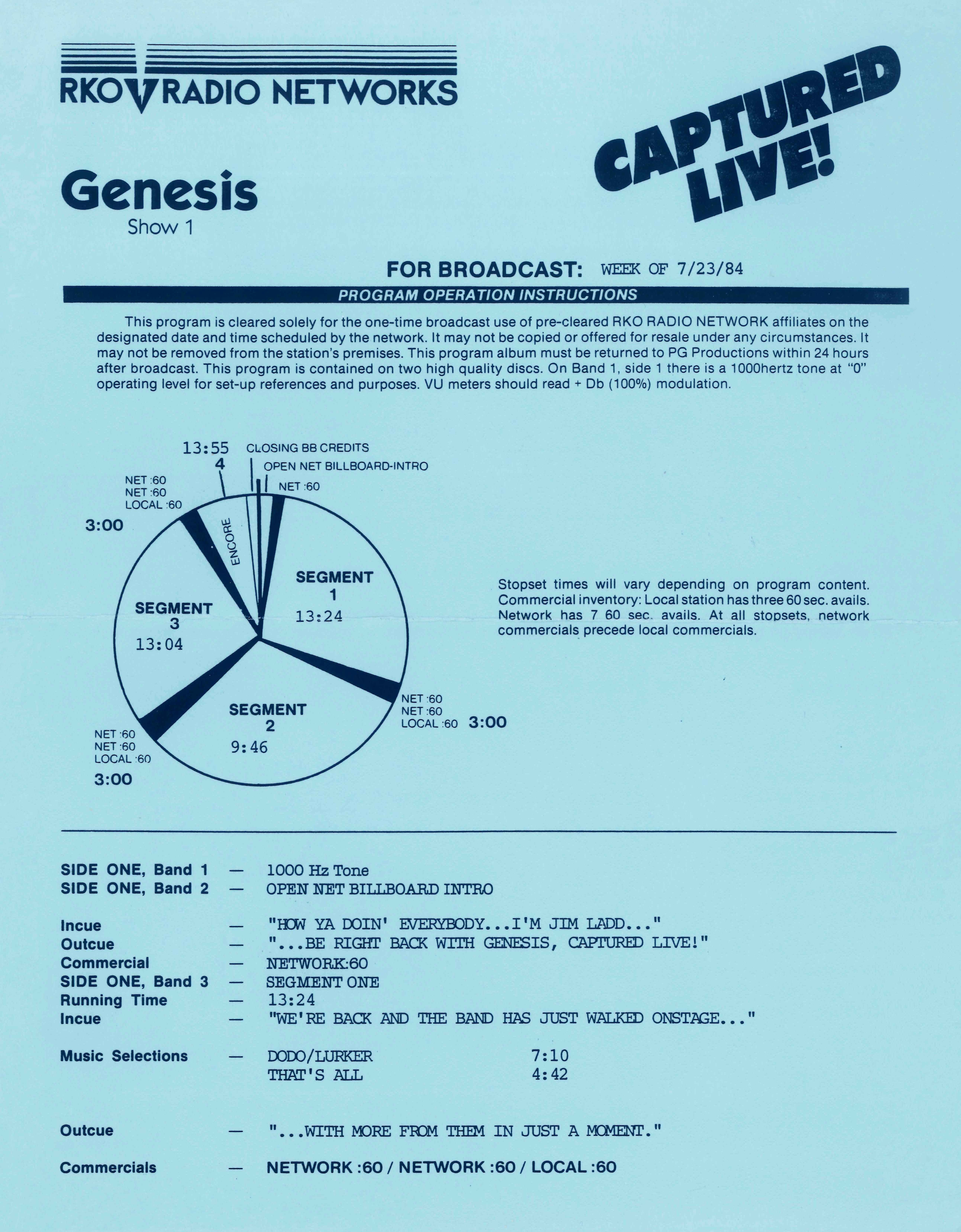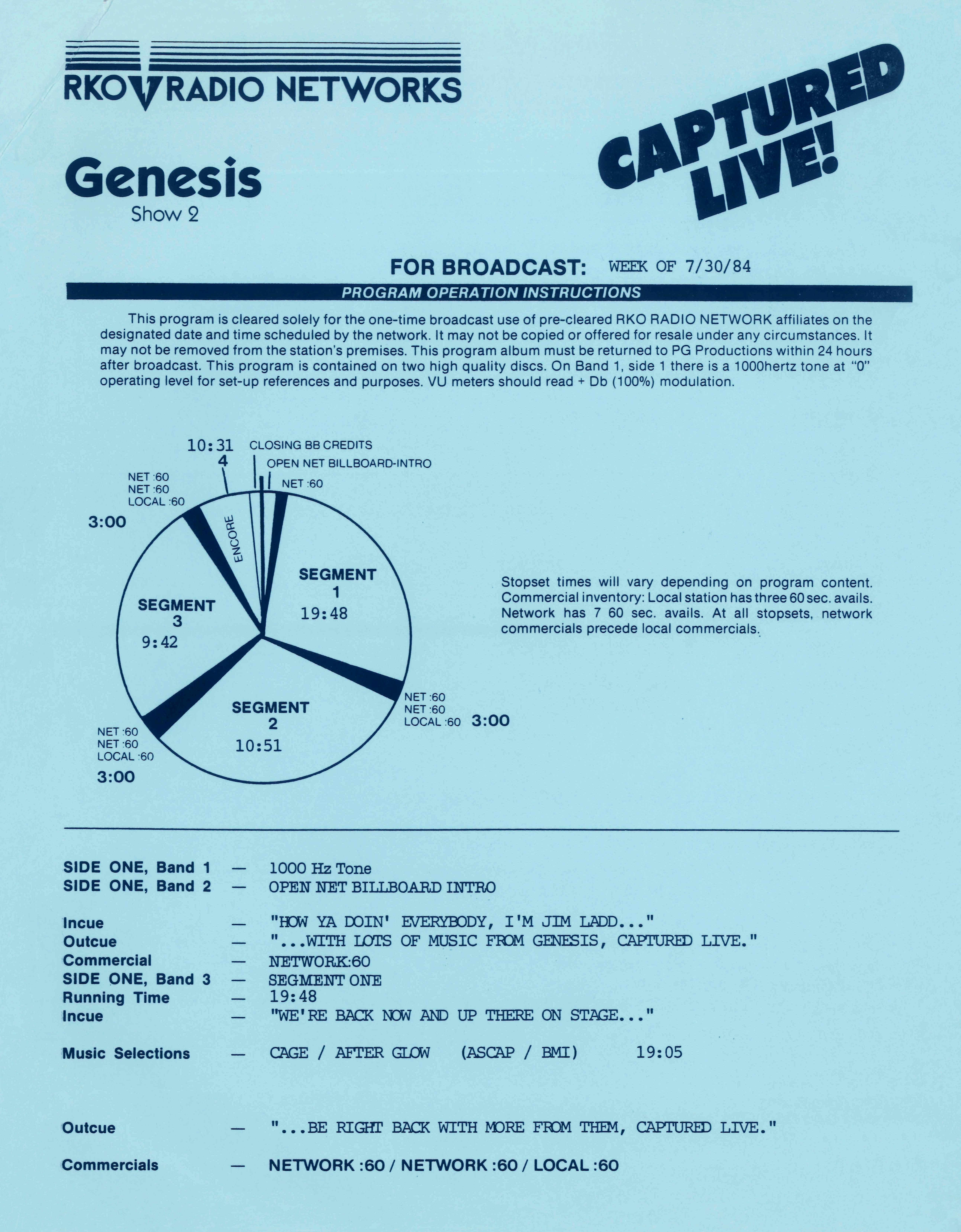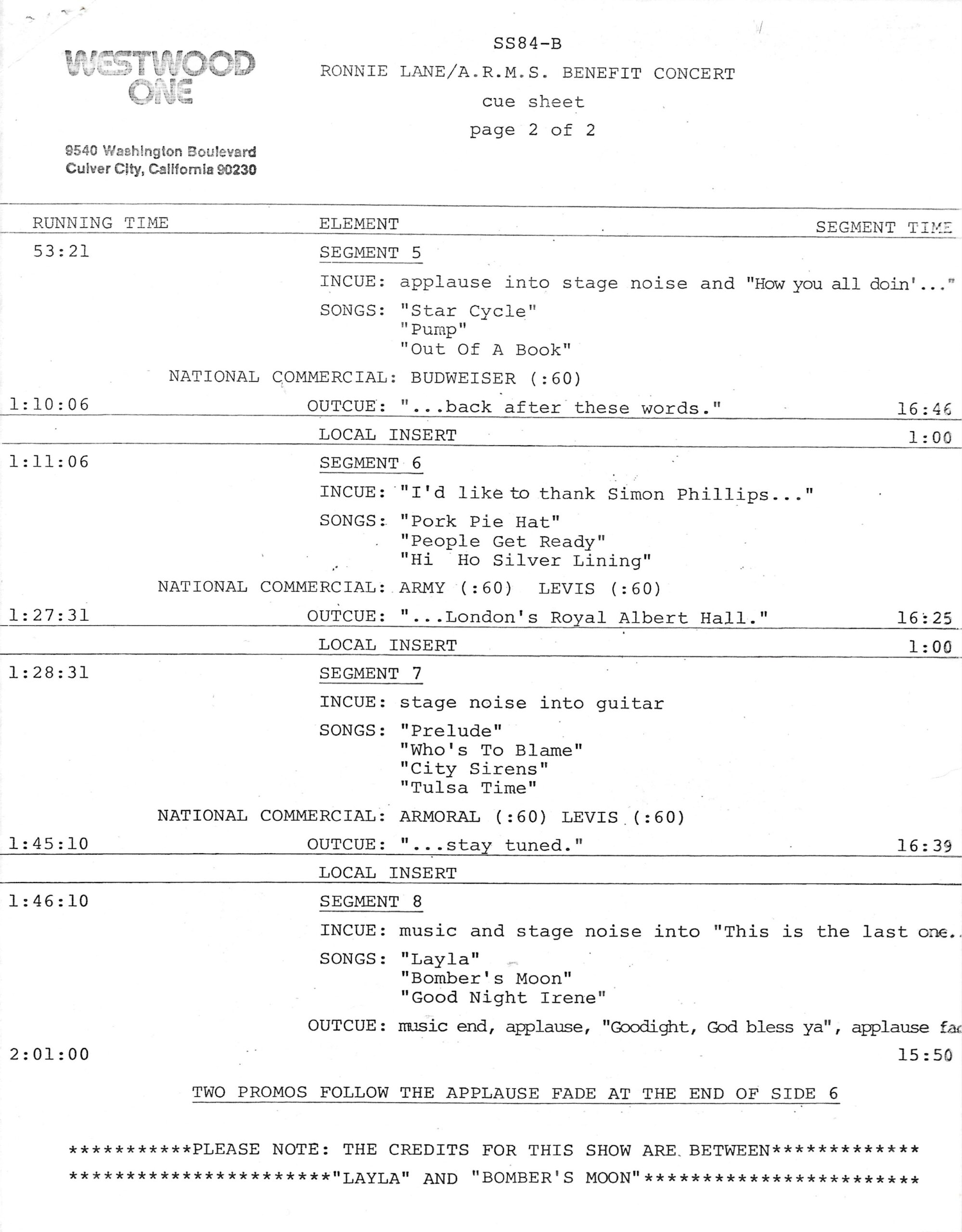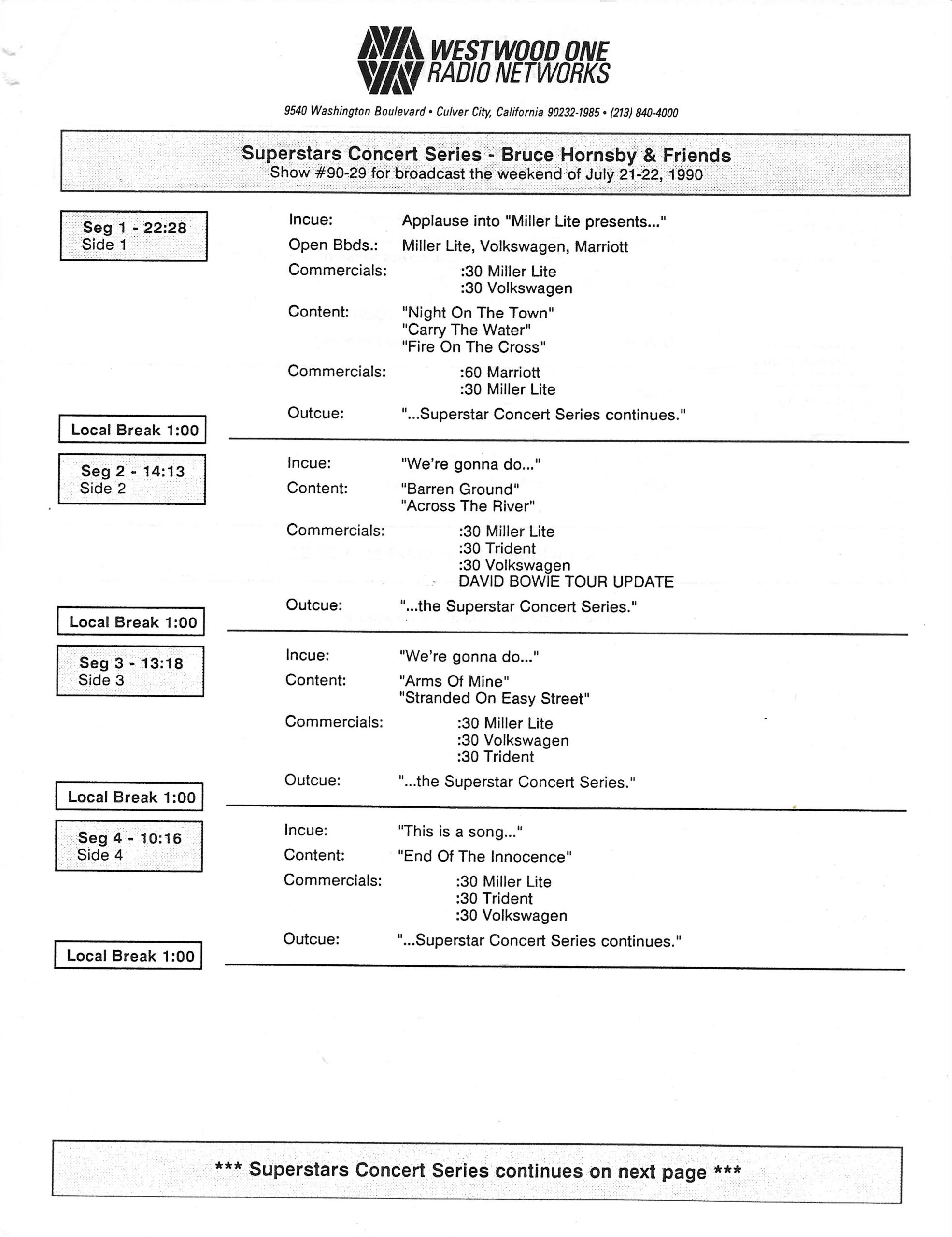 Tracks 1 – 4 are the actual radio show, Tracks 5 – 7 are promo spots, Tracks 8 – 17 are commercial spots, while Tracks 18 – 29 are the actual interview segments separated into individual tracks.