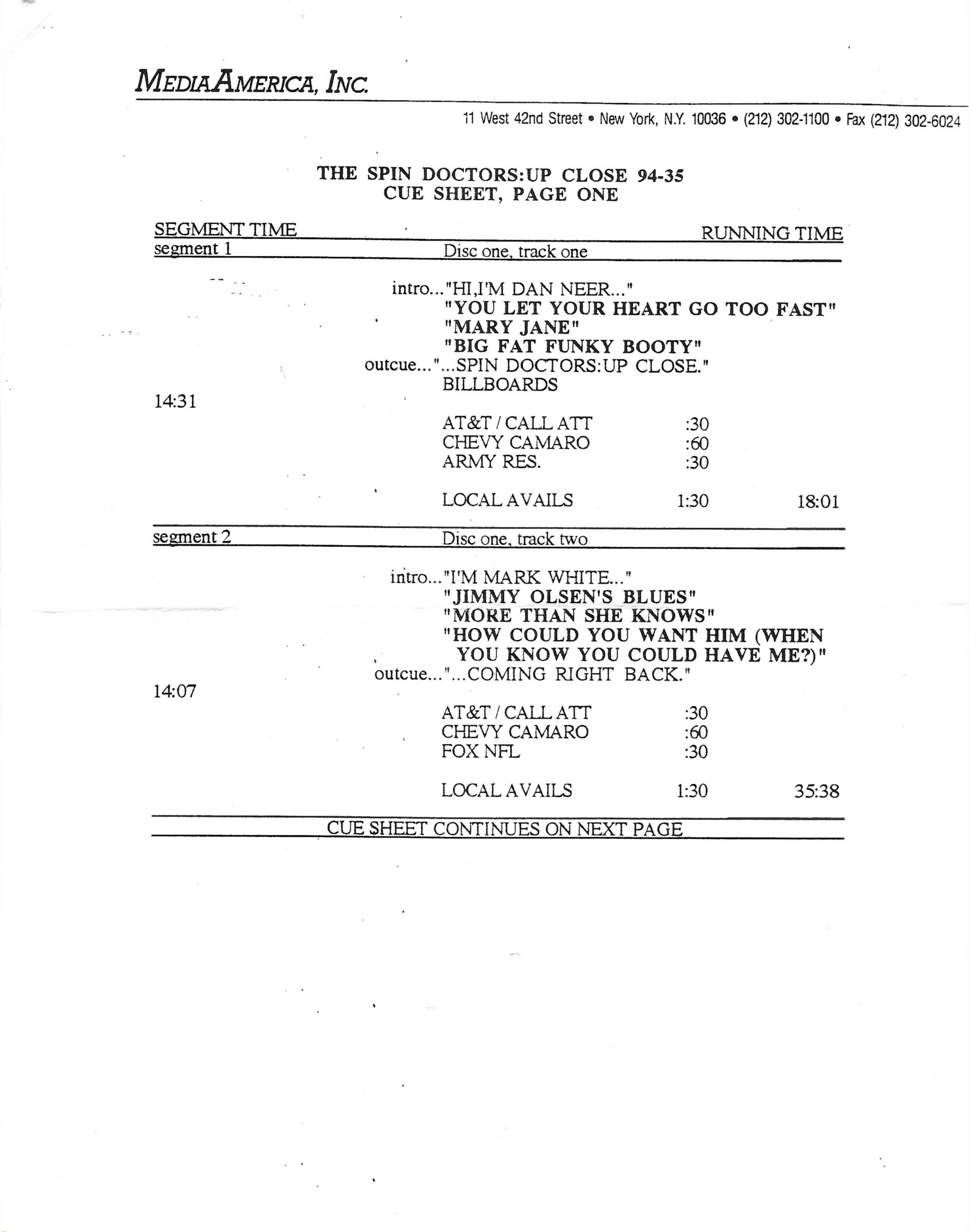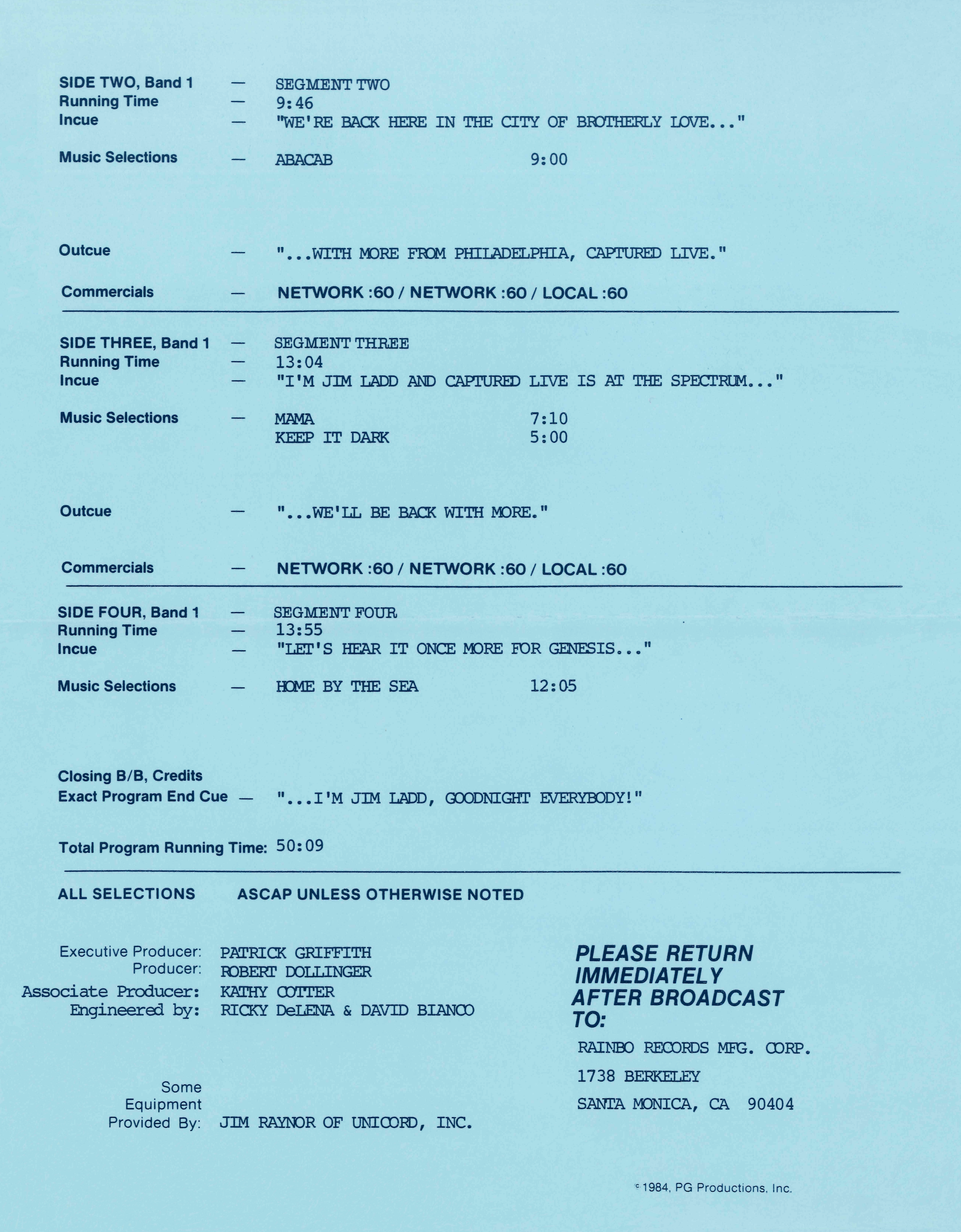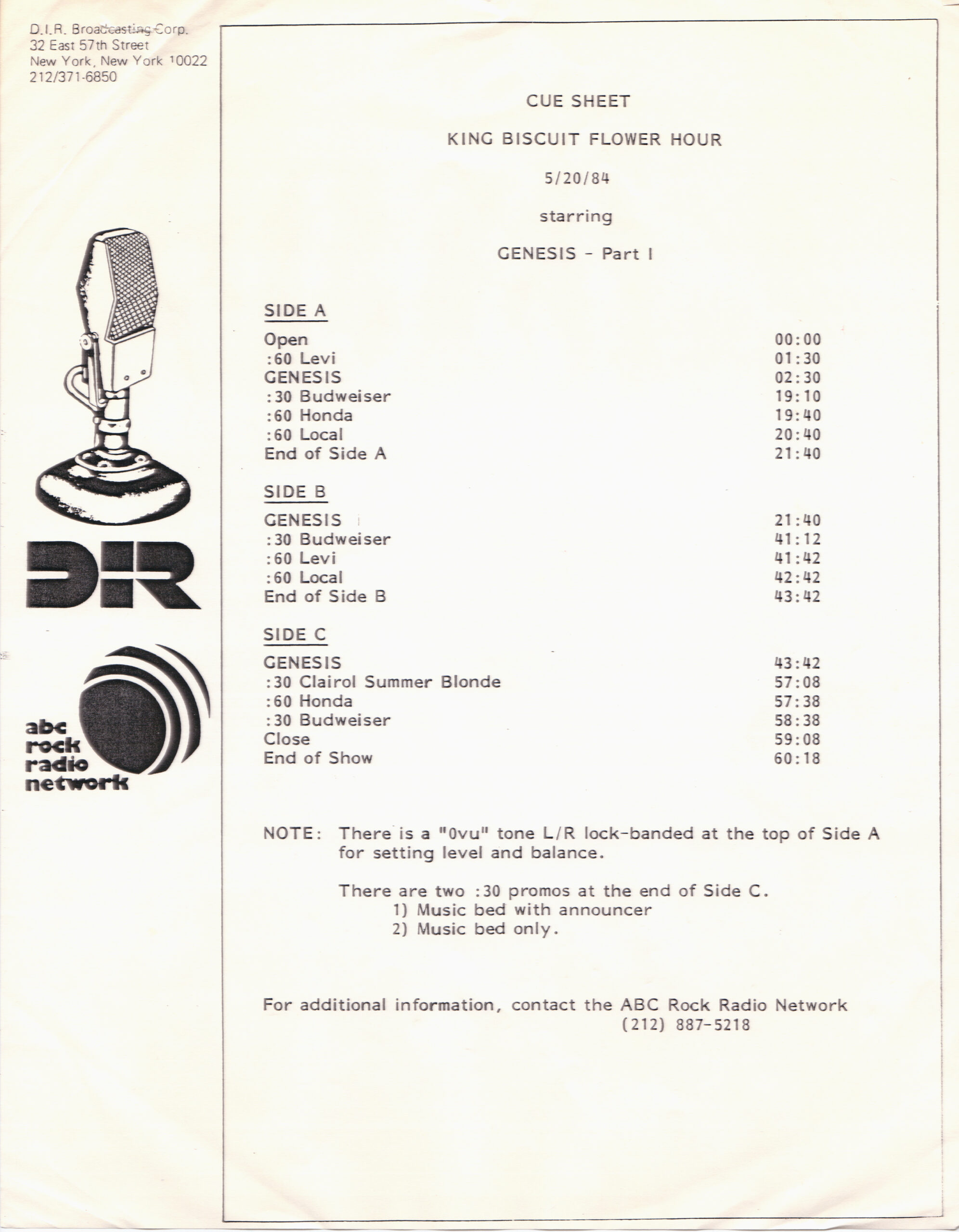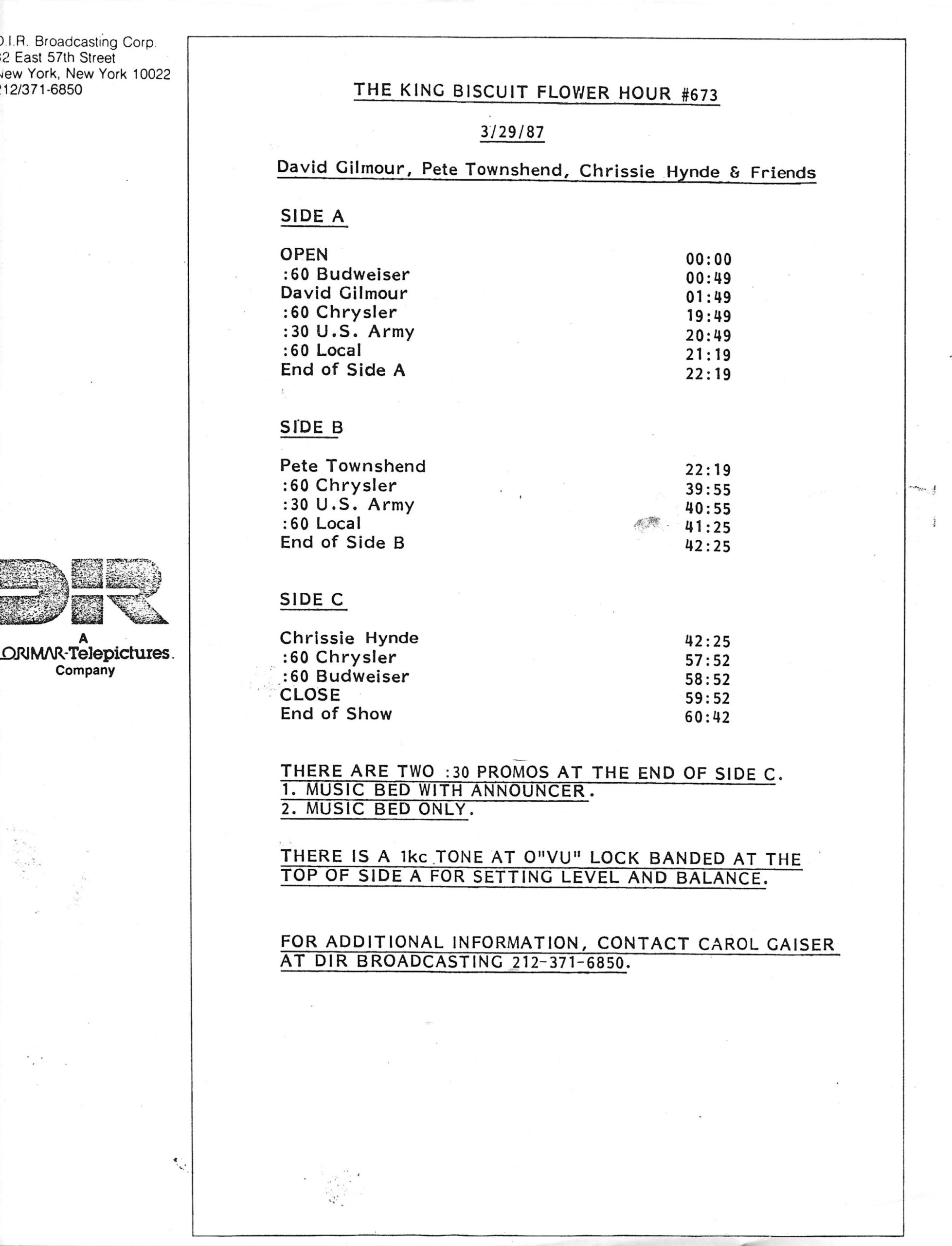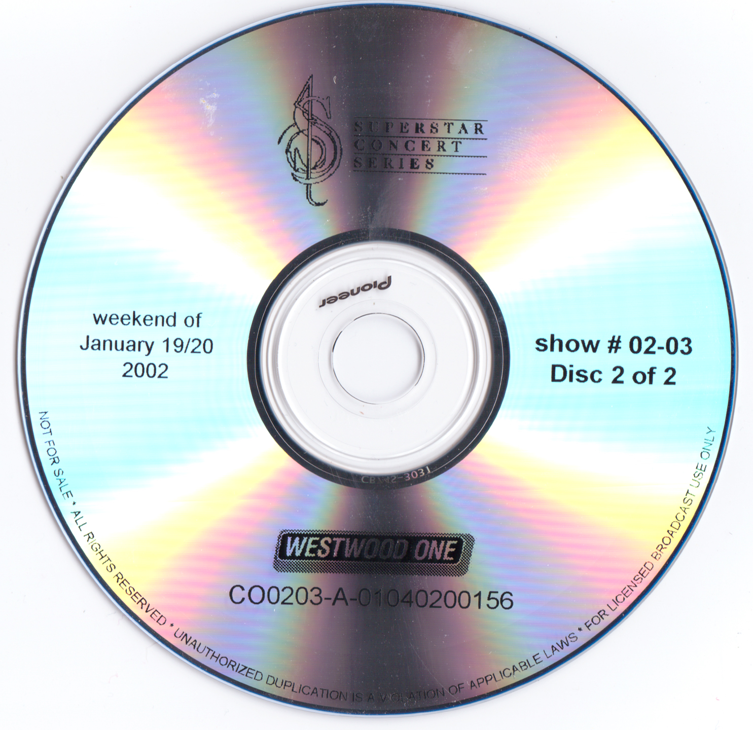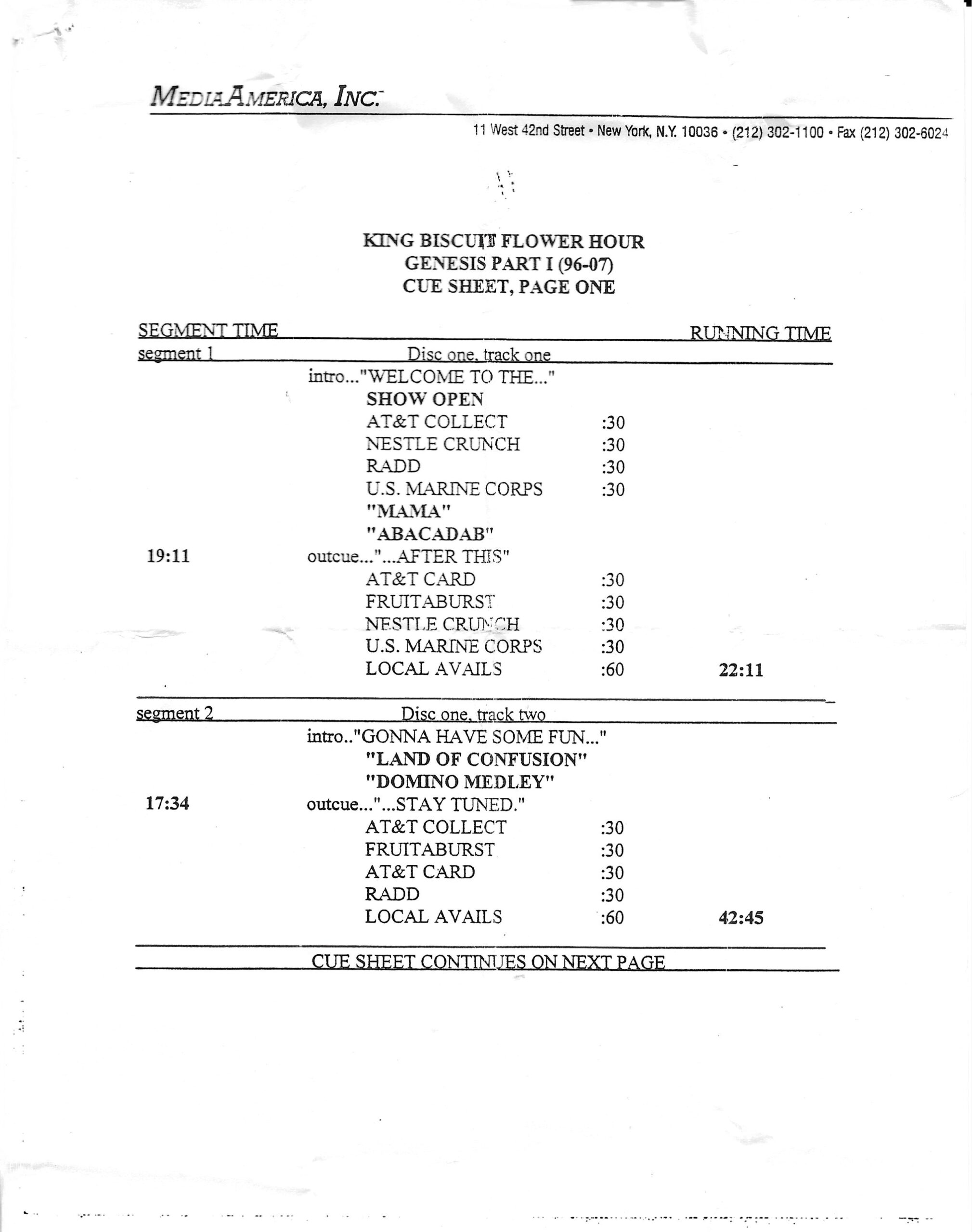 Tracks 1 – 4 are the actual radio show, Tracks 5 – 7 are promo spots, Tracks 8 – 17 are commercial spots, while Tracks 18 – 29 are the actual interview segments separated into individual tracks.