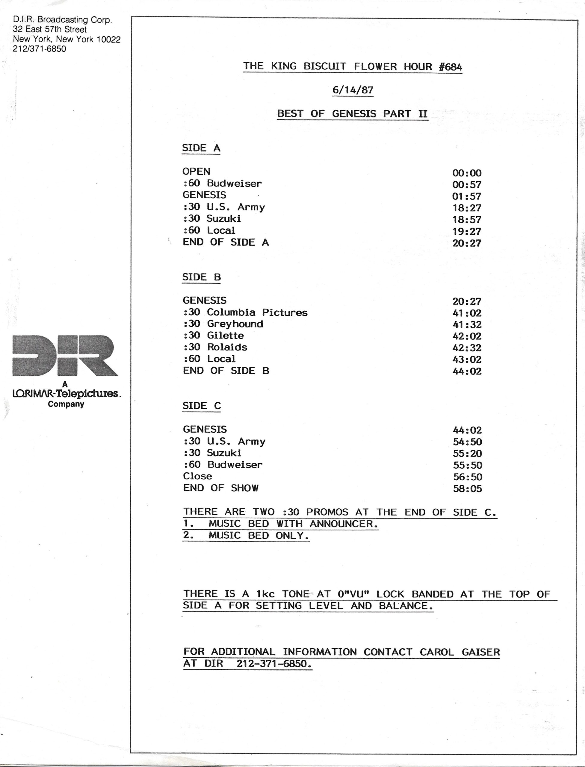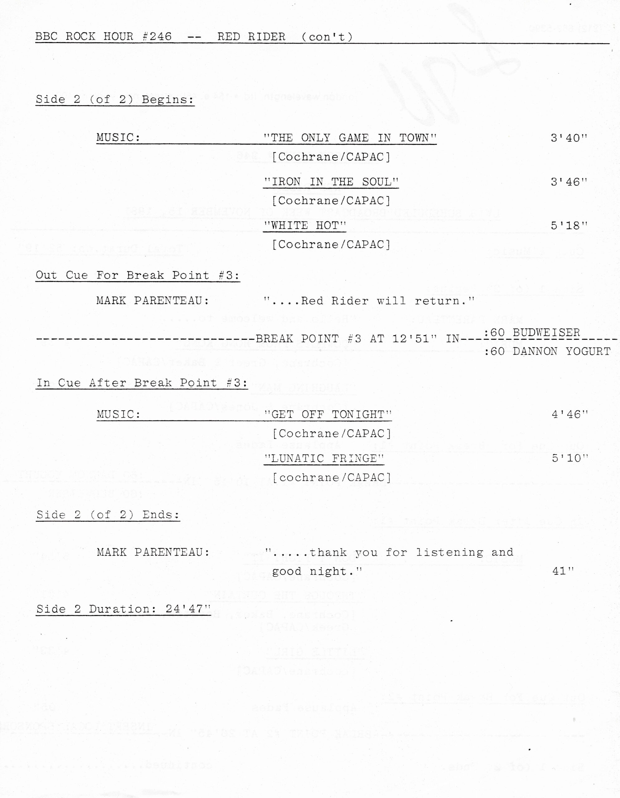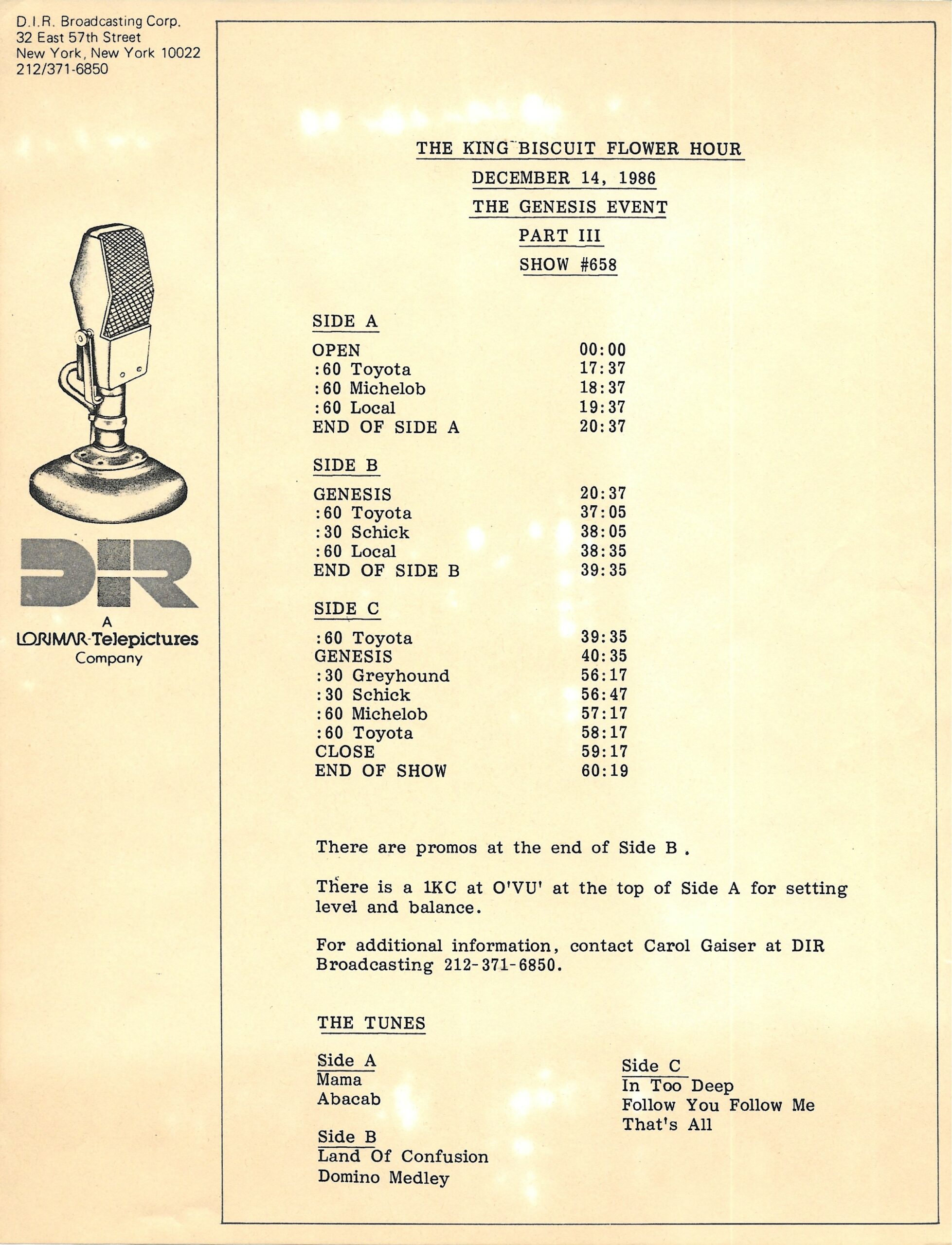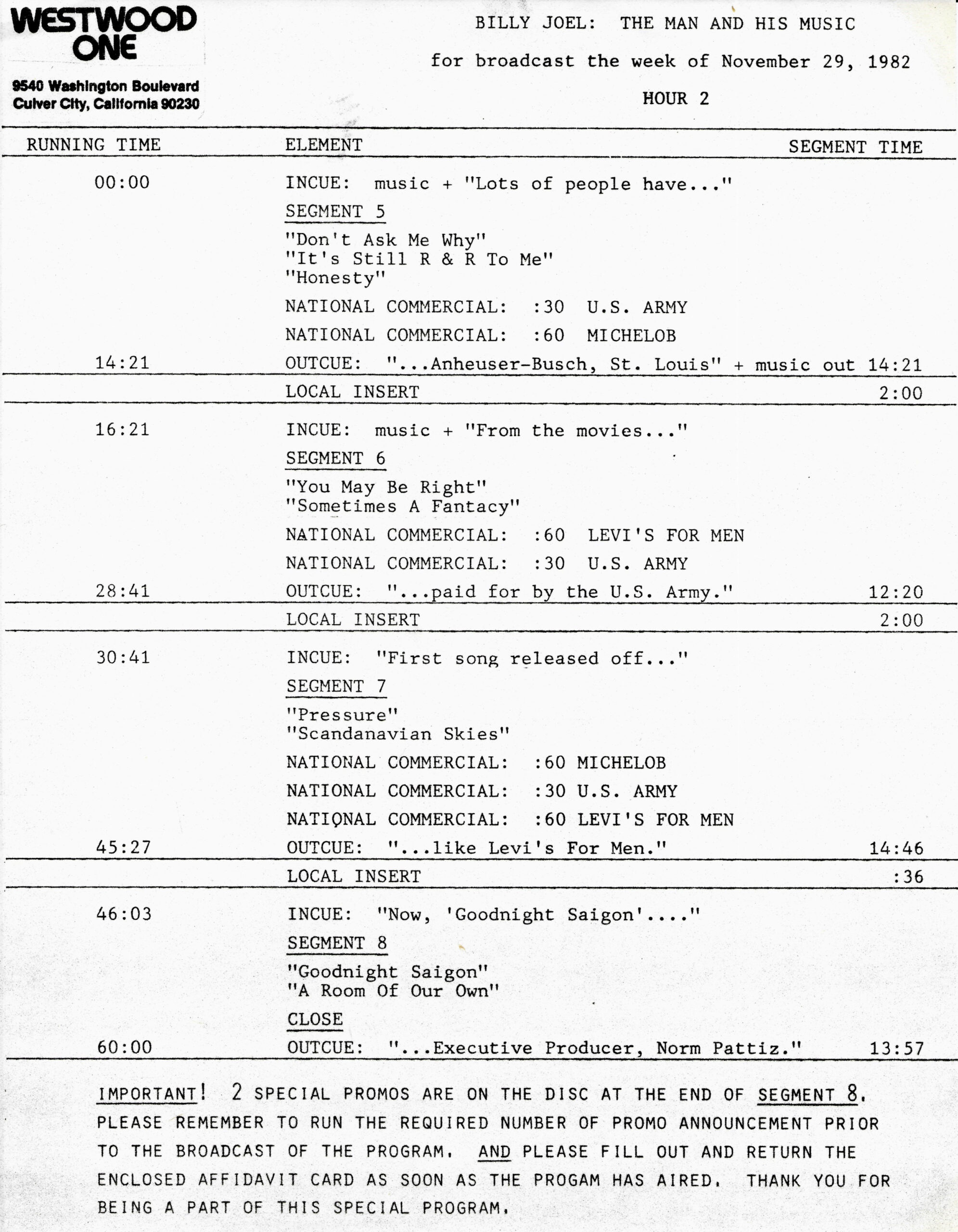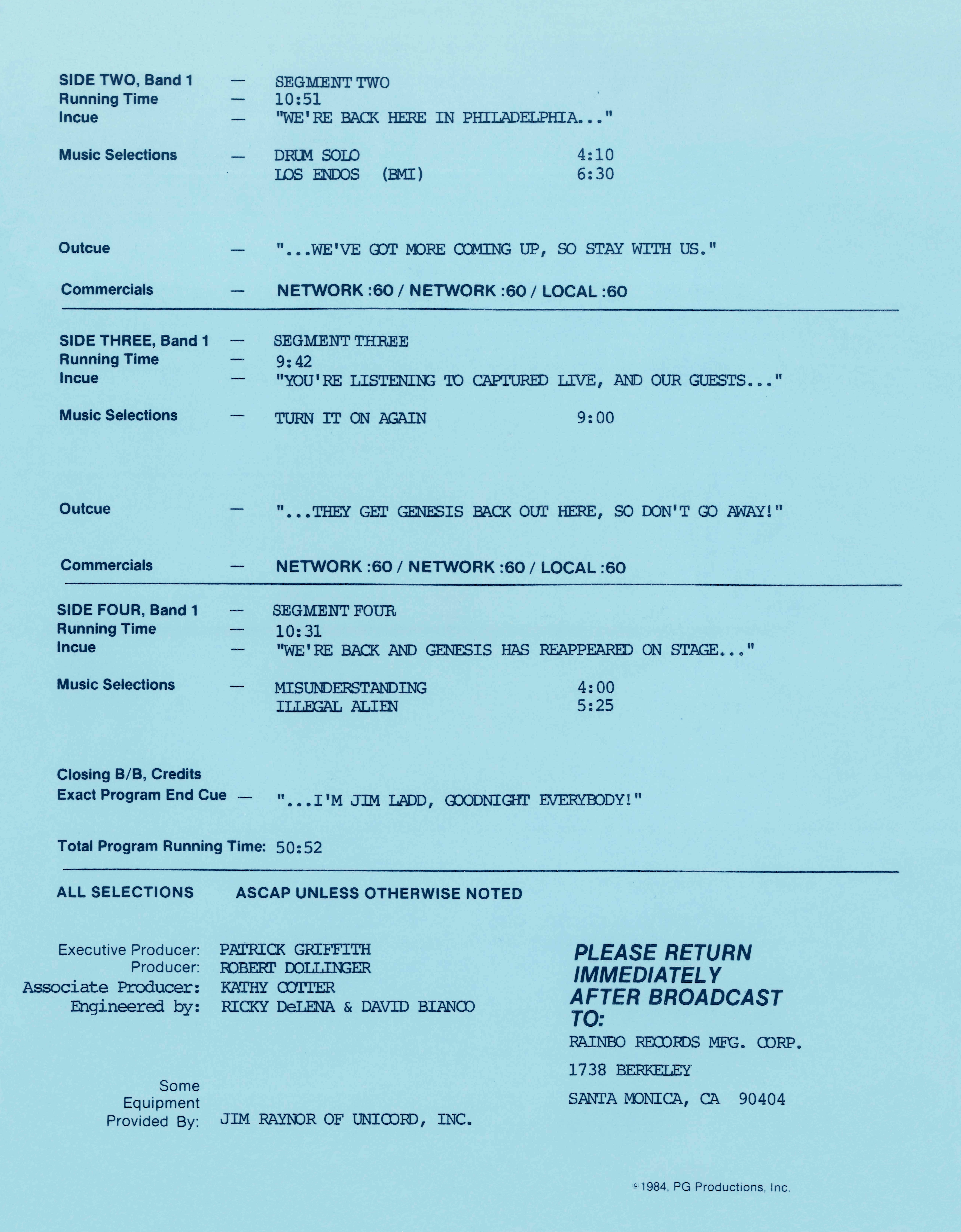 Tracks 1 – 4 are the actual radio show, Tracks 5 – 7 are promo spots, Tracks 8 – 17 are commercial spots, while Tracks 18 – 29 are the actual interview segments separated into individual tracks.