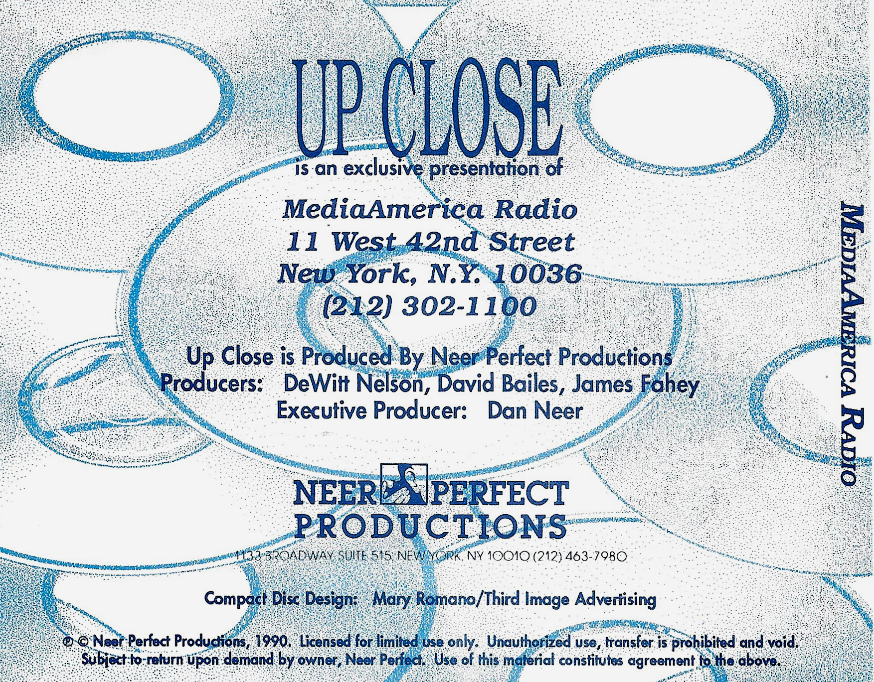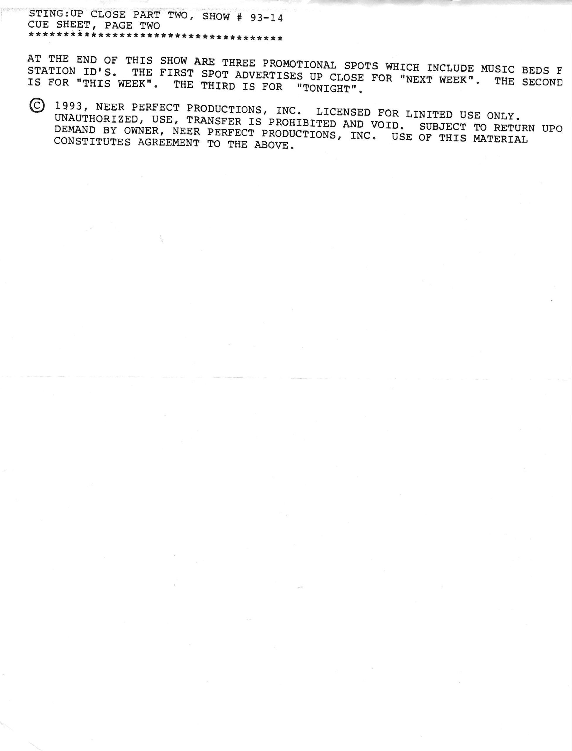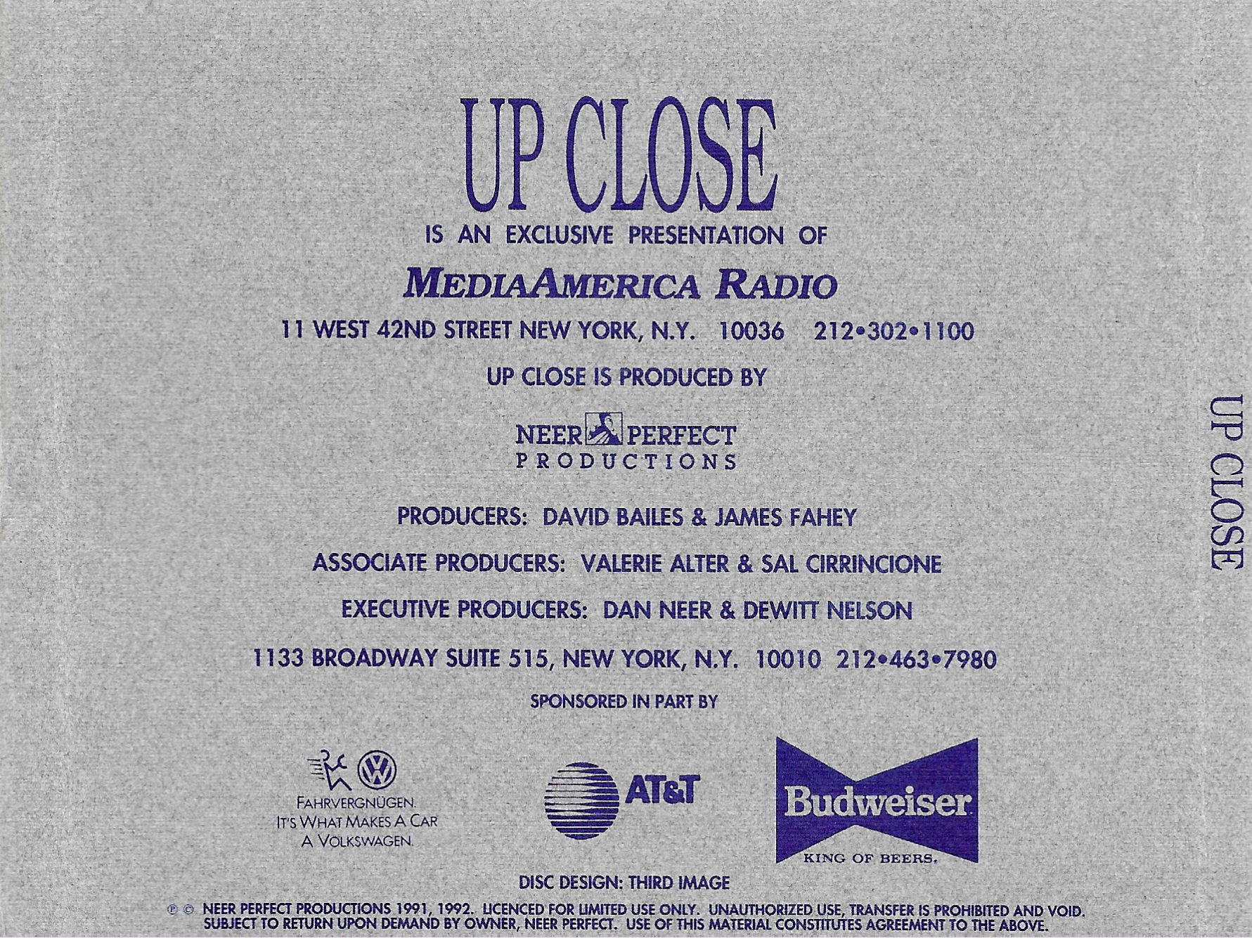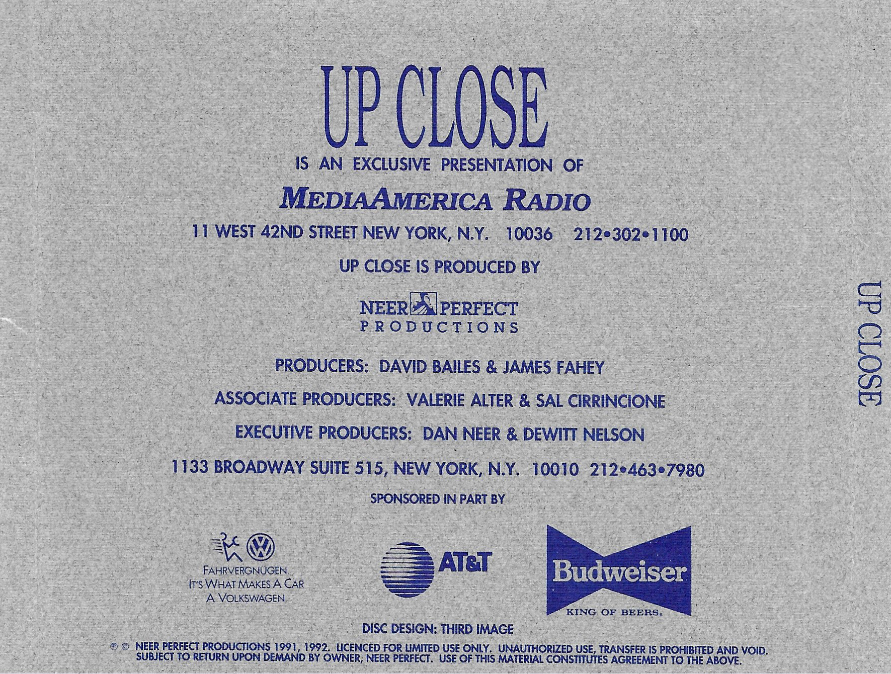 Exact same L.A. Forum show as the show on compact discs from June 1992 and February 1995, but repackaged onto compact disc for airplay in February of 1996. Unlike the February ’95 version, this show does not contain any tracks from Rusted Root, nor does Bill Minkin make an appearance. Contains original commercial blocks and DJ intros by Up Close host Dan Neer.