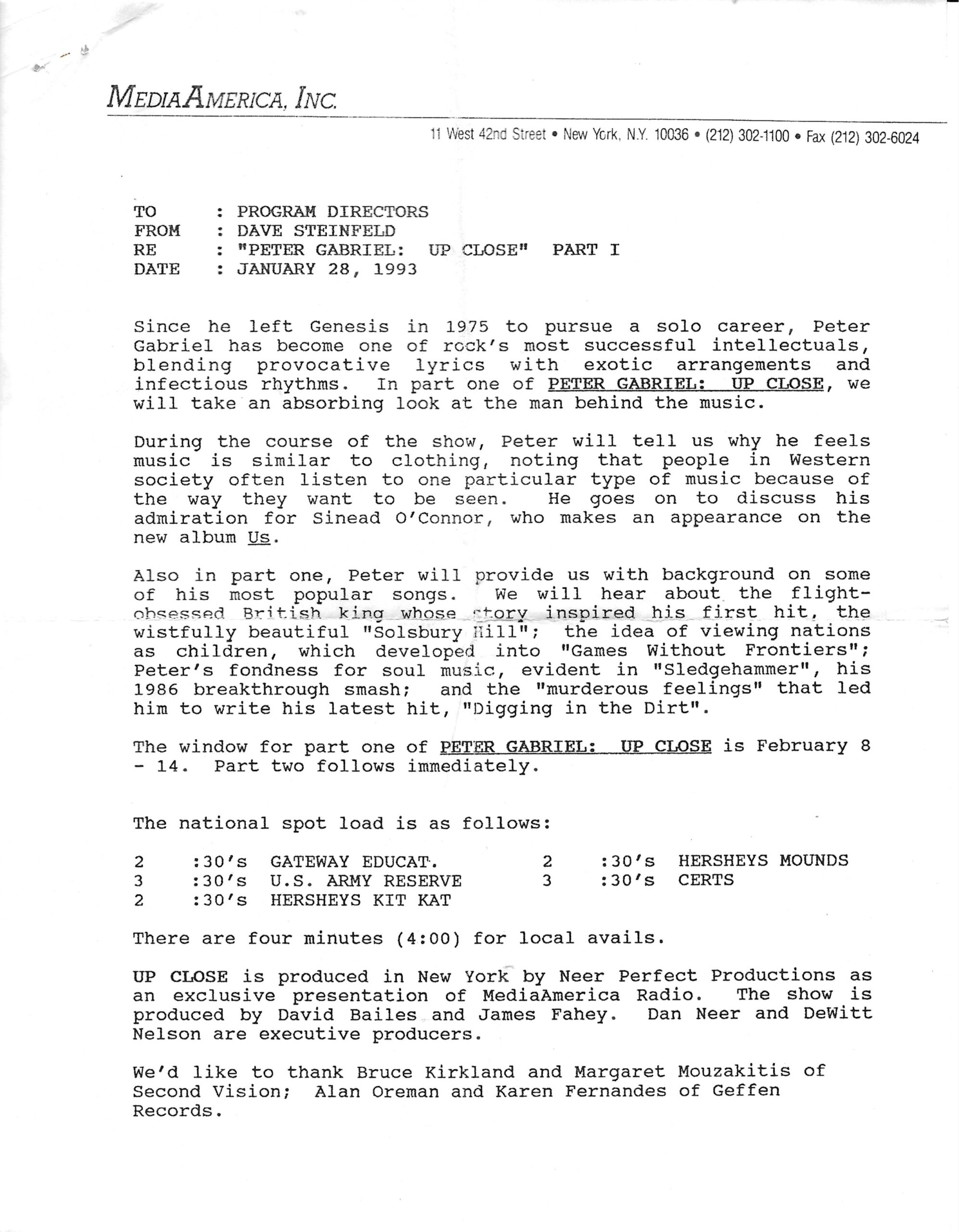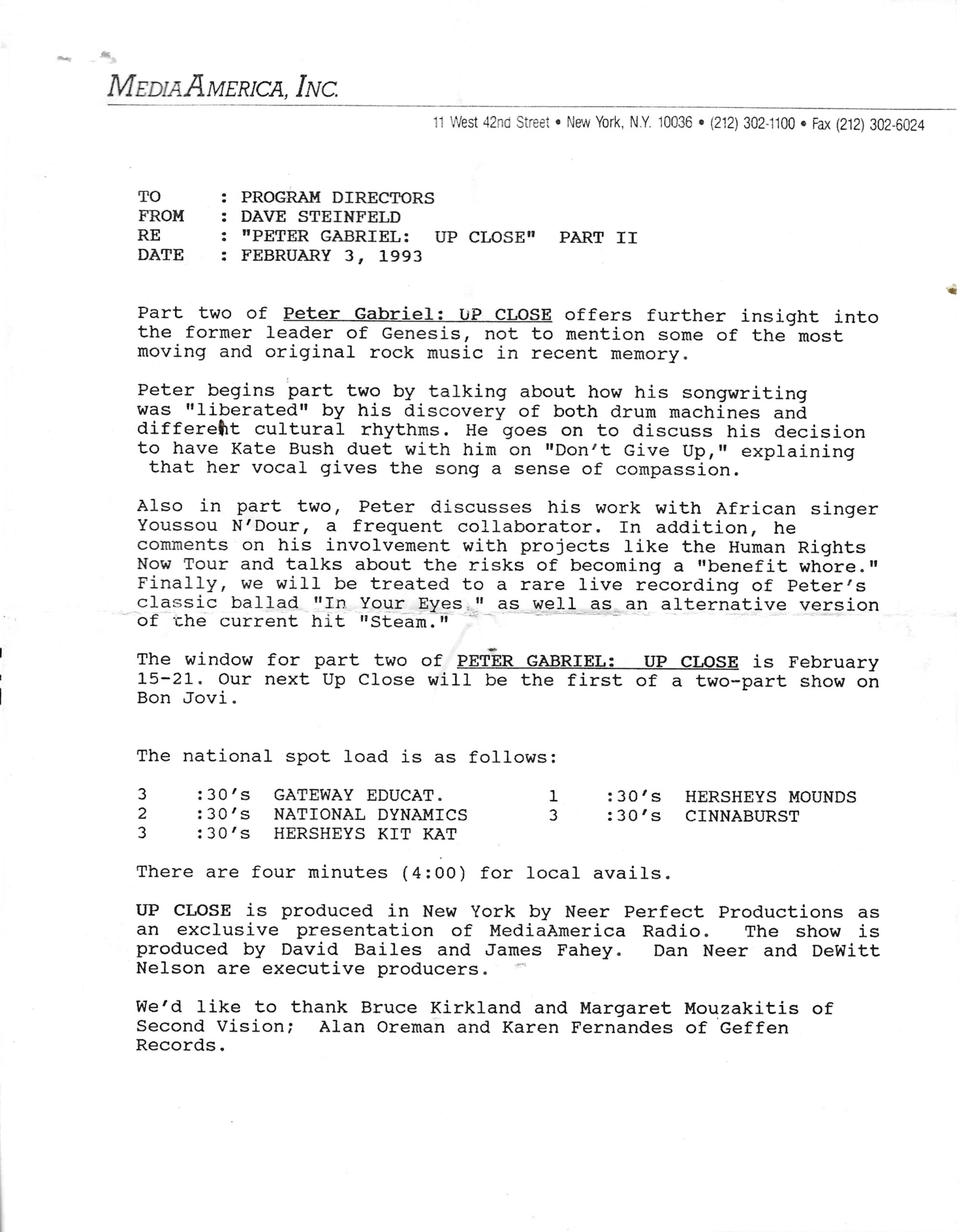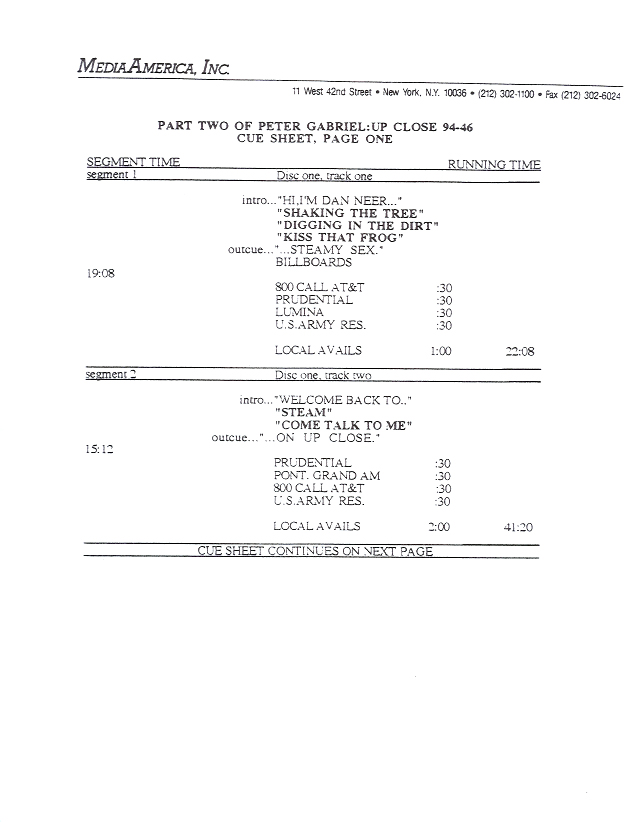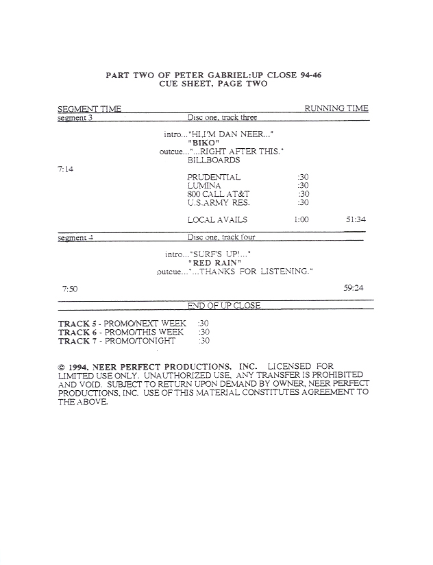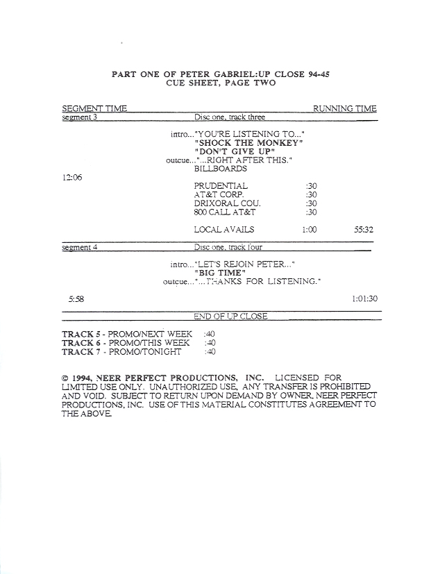 Another in the Dan Neer series of Up Close shows, this one detailing Peter Gabriel’s career up to his latest release (at that time) US. Commercial blocks and studio tracks are mixed with conversations between Gabriel and Neer, who do not appear in the studio together.