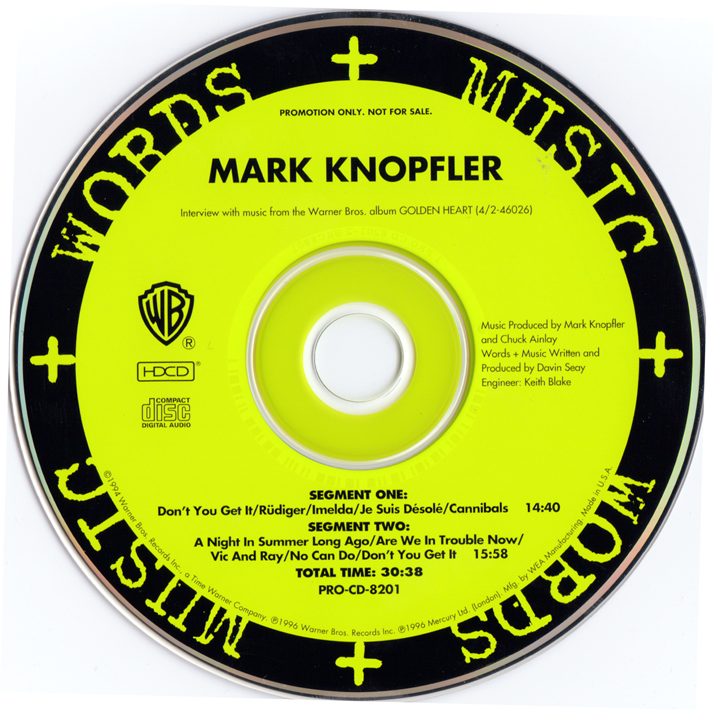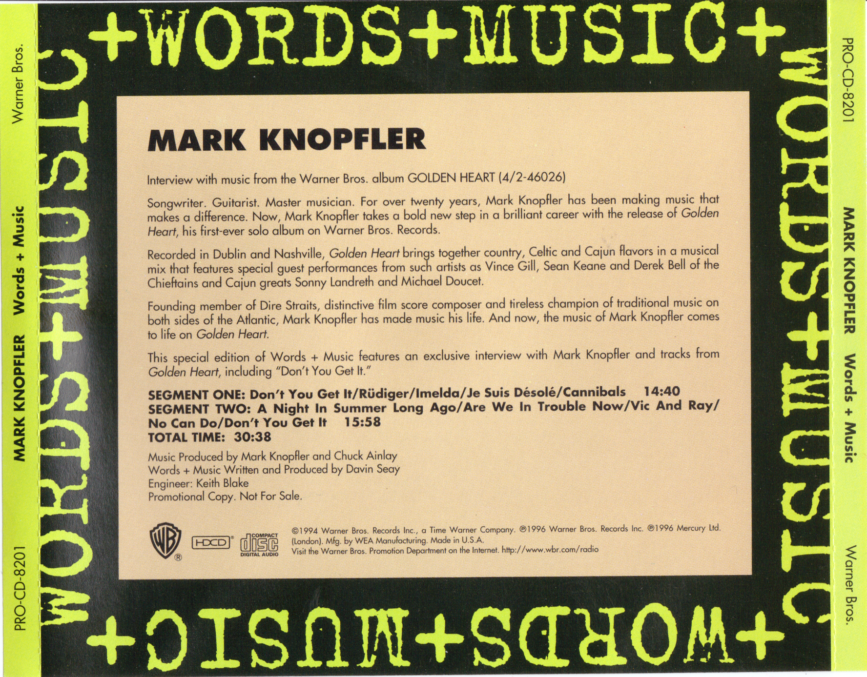 This is another official promotional disc, this time produced by Warner Brothers Records. Mark discusses his very first solo effort, GOLDEN HEART. There are no commercial blocks on this disc. Interestingly, this disc was produced without a front cover; the jewel case only containing the disc and a back cover. (If a front cover, exists, I have never seen it accompanying this item.)