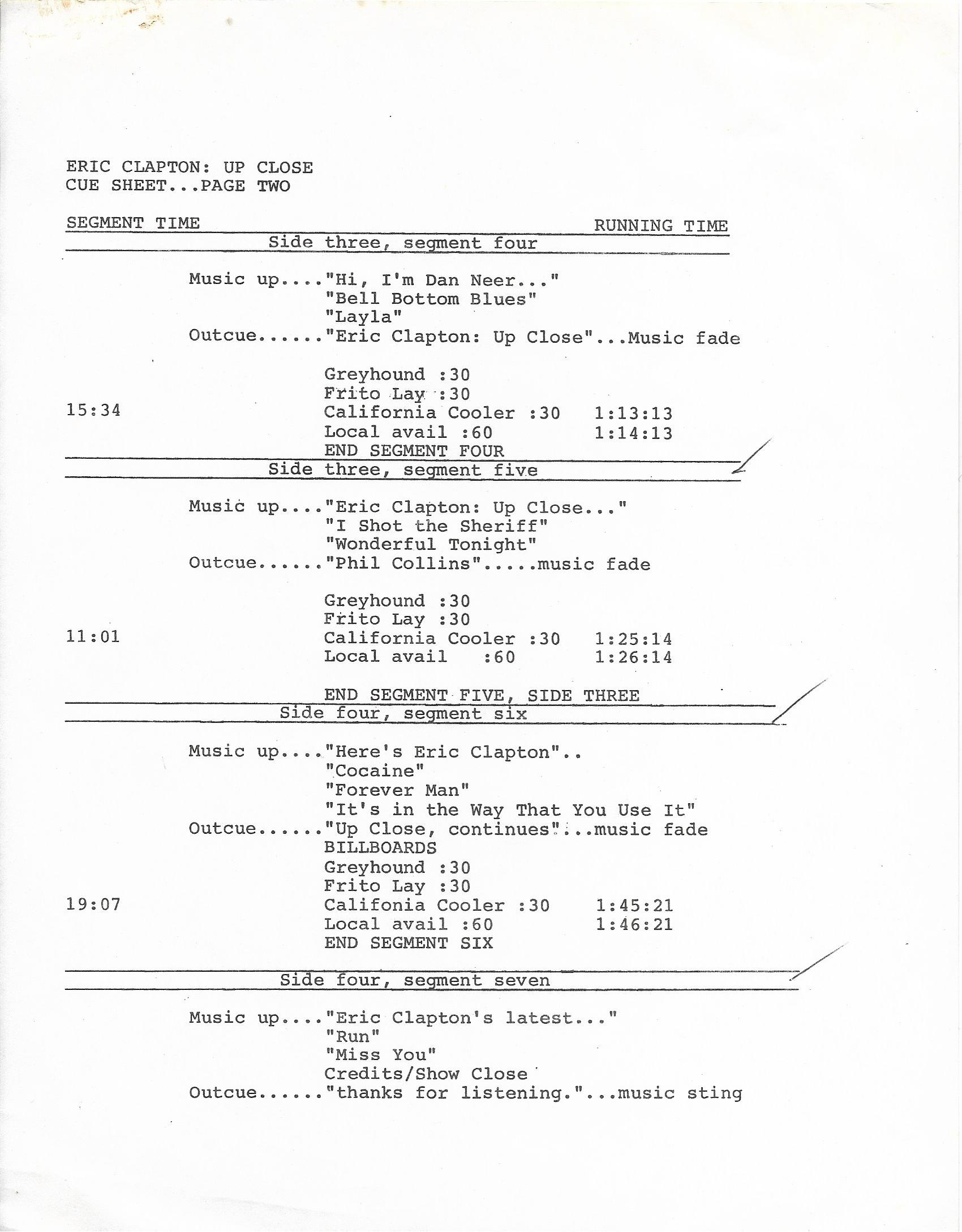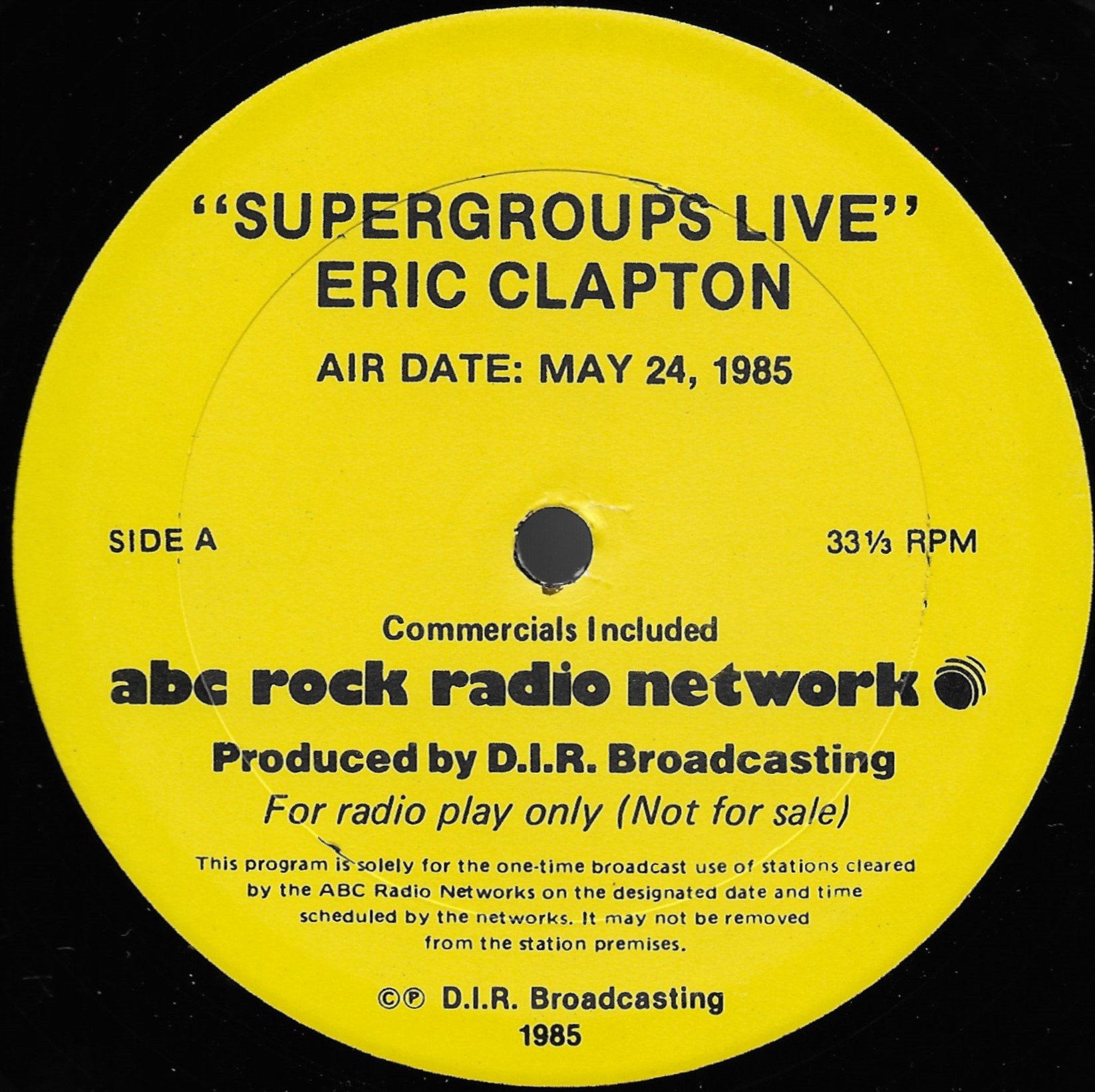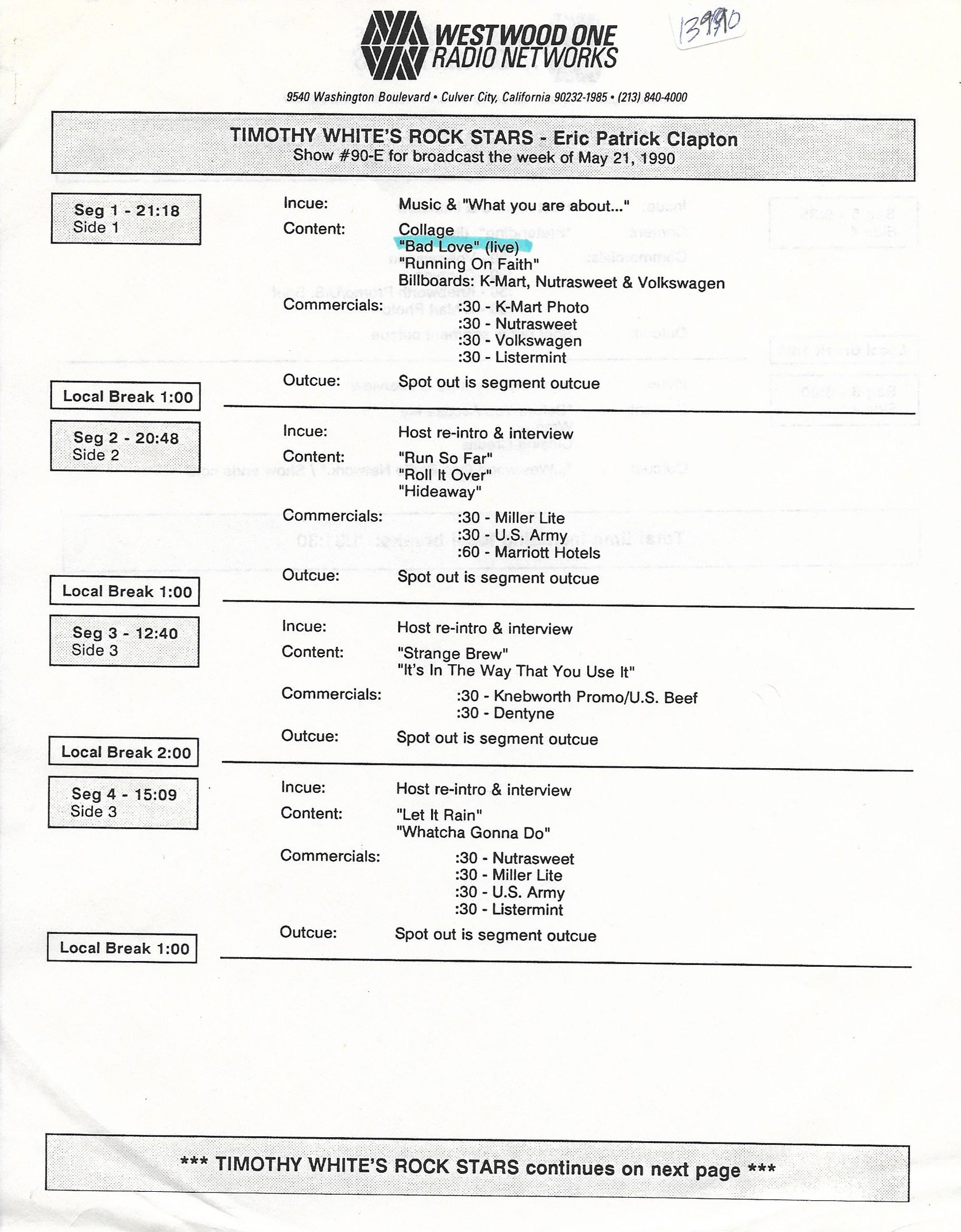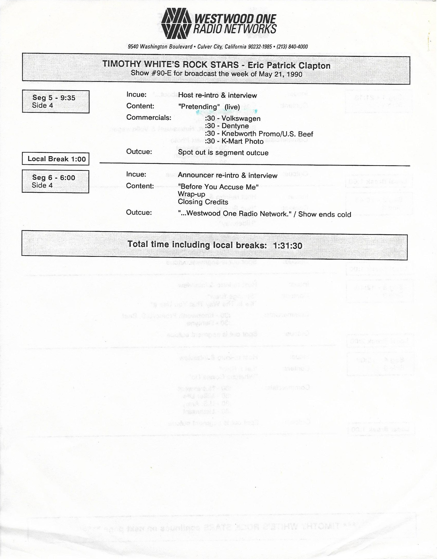 Host Richard Skinner presents an interview with Eric Clapton regarding his live album JUST ONE NIGHT. Tommy Vance conducts the interview and plays live cuts from that album, along with other Clapton-related tracks. All of the live tracks are taken from the aforementioned live release. Contains original commercial blocks and DJ introductions. This is Version AA per the Matrix / Runouts.