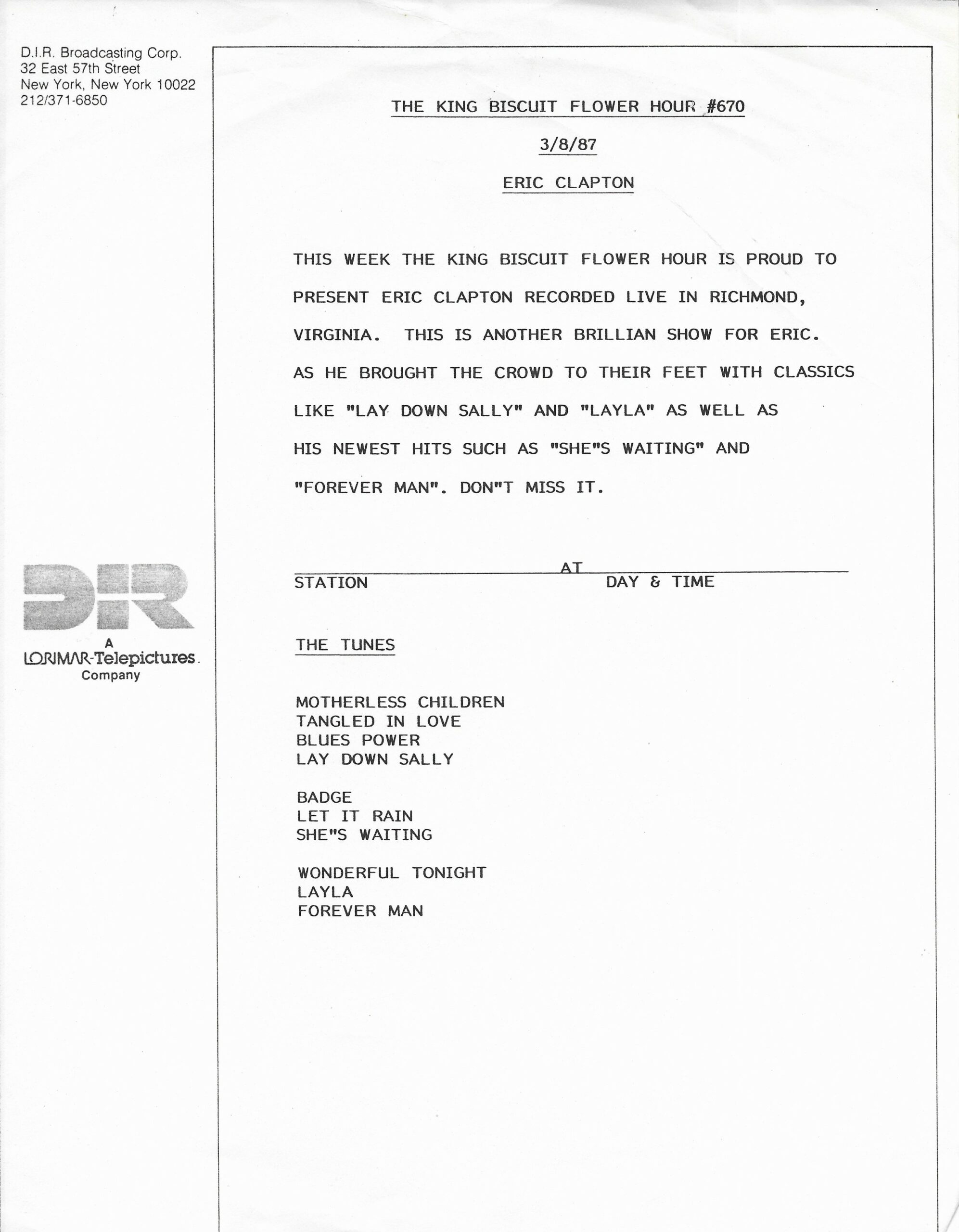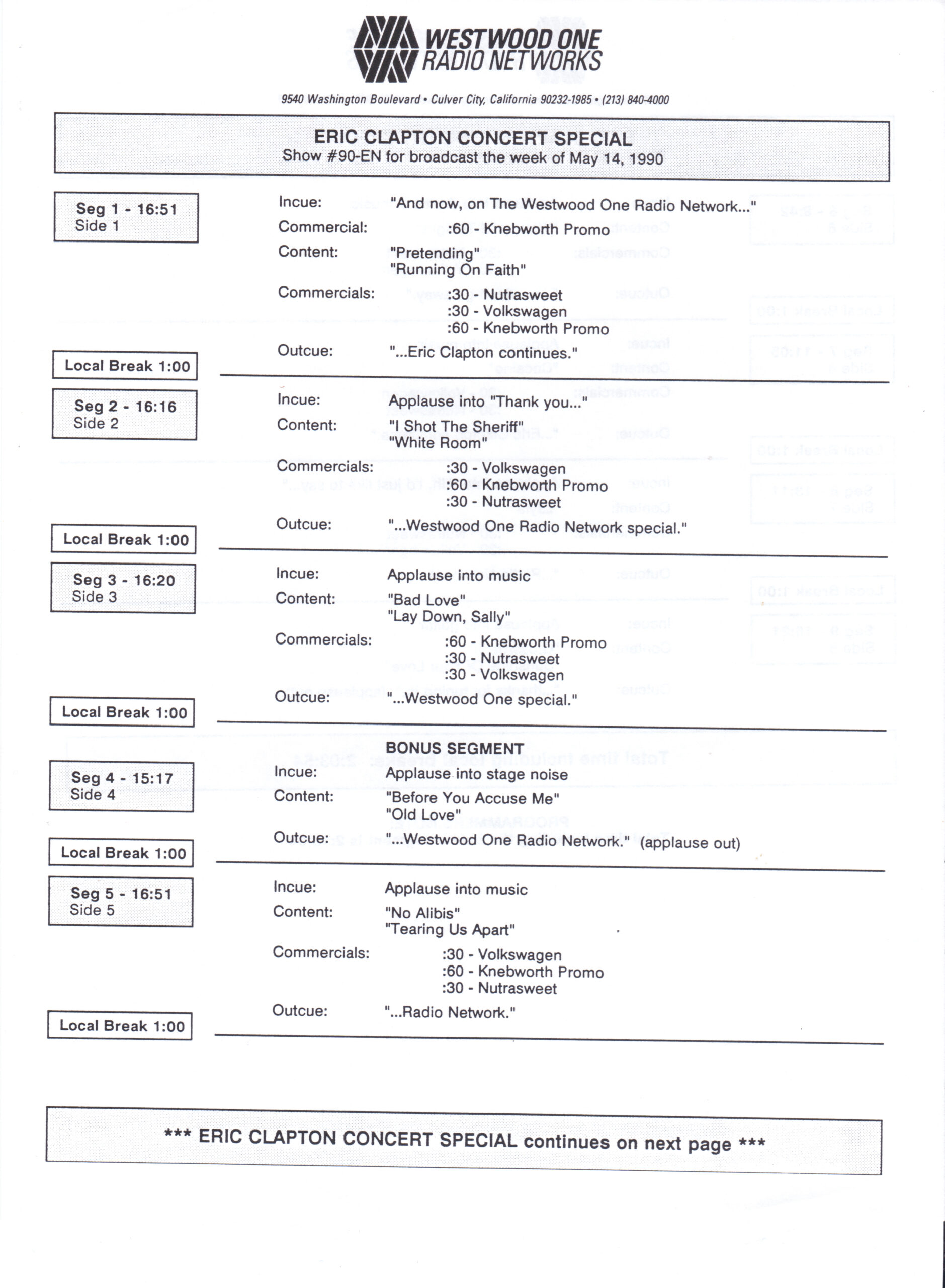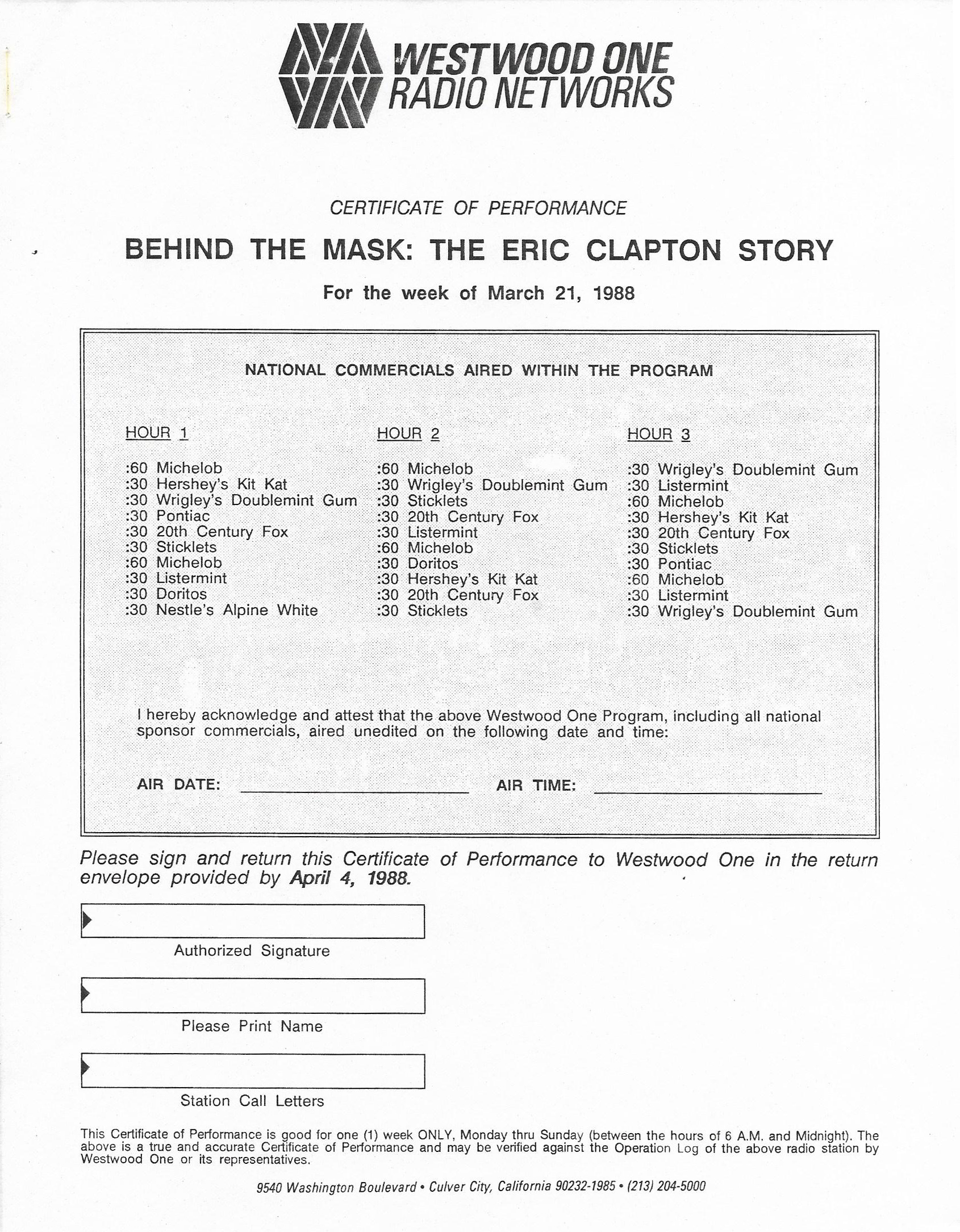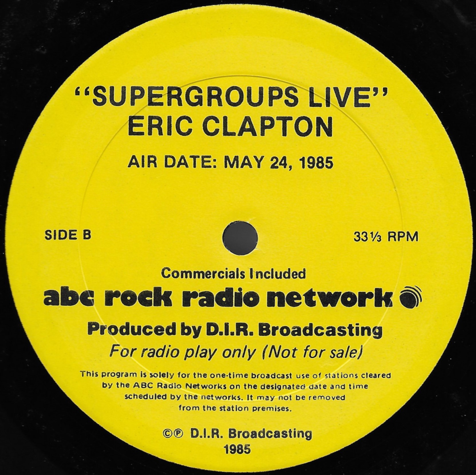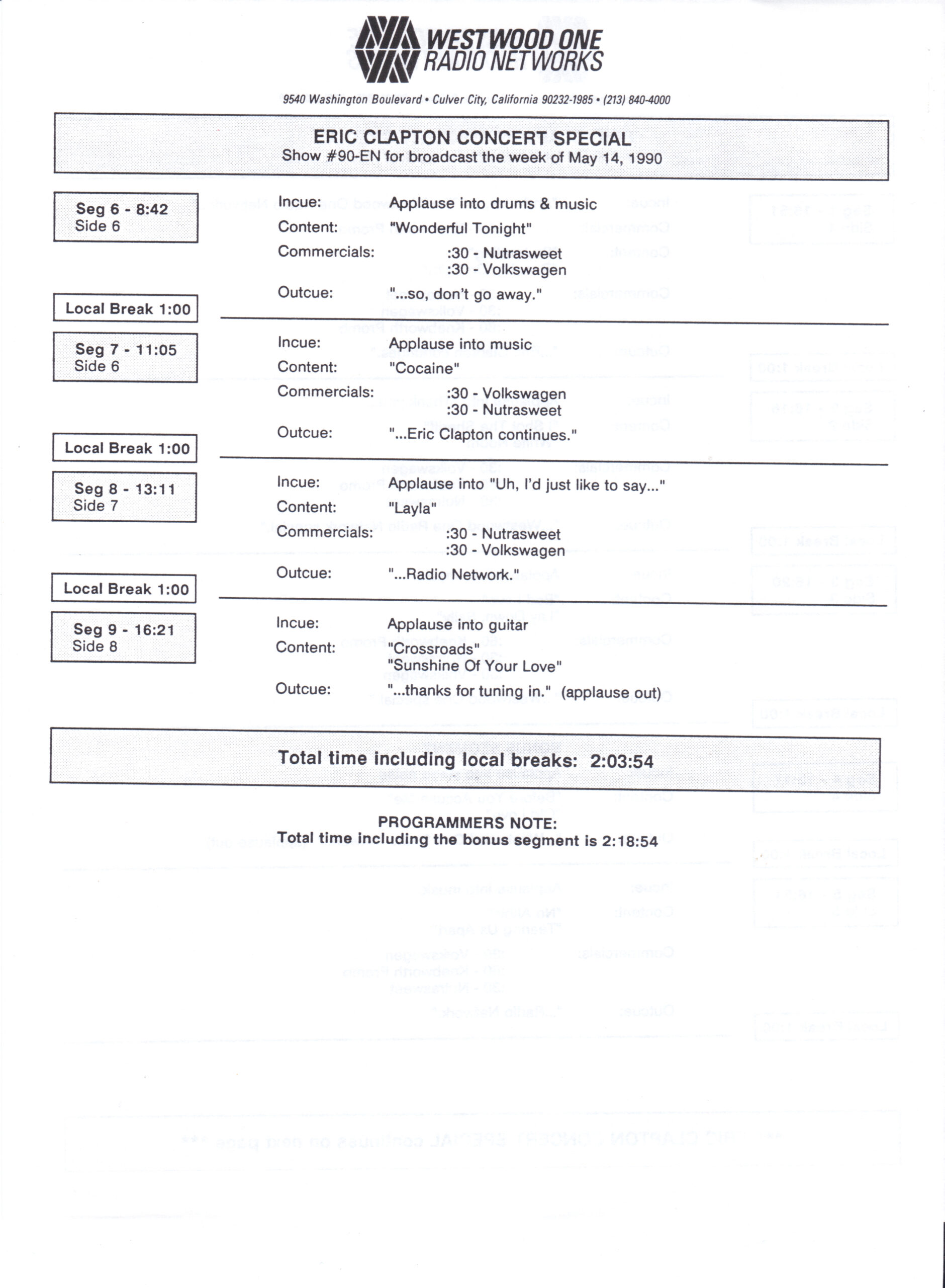 Host Richard Skinner presents an interview with Eric Clapton regarding his live album JUST ONE NIGHT. Tommy Vance conducts the interview and plays live cuts from that album, along with other Clapton-related tracks. All of the live tracks are taken from the aforementioned live release. Contains original commercial blocks and DJ introductions. This is Version AA per the Matrix / Runouts.