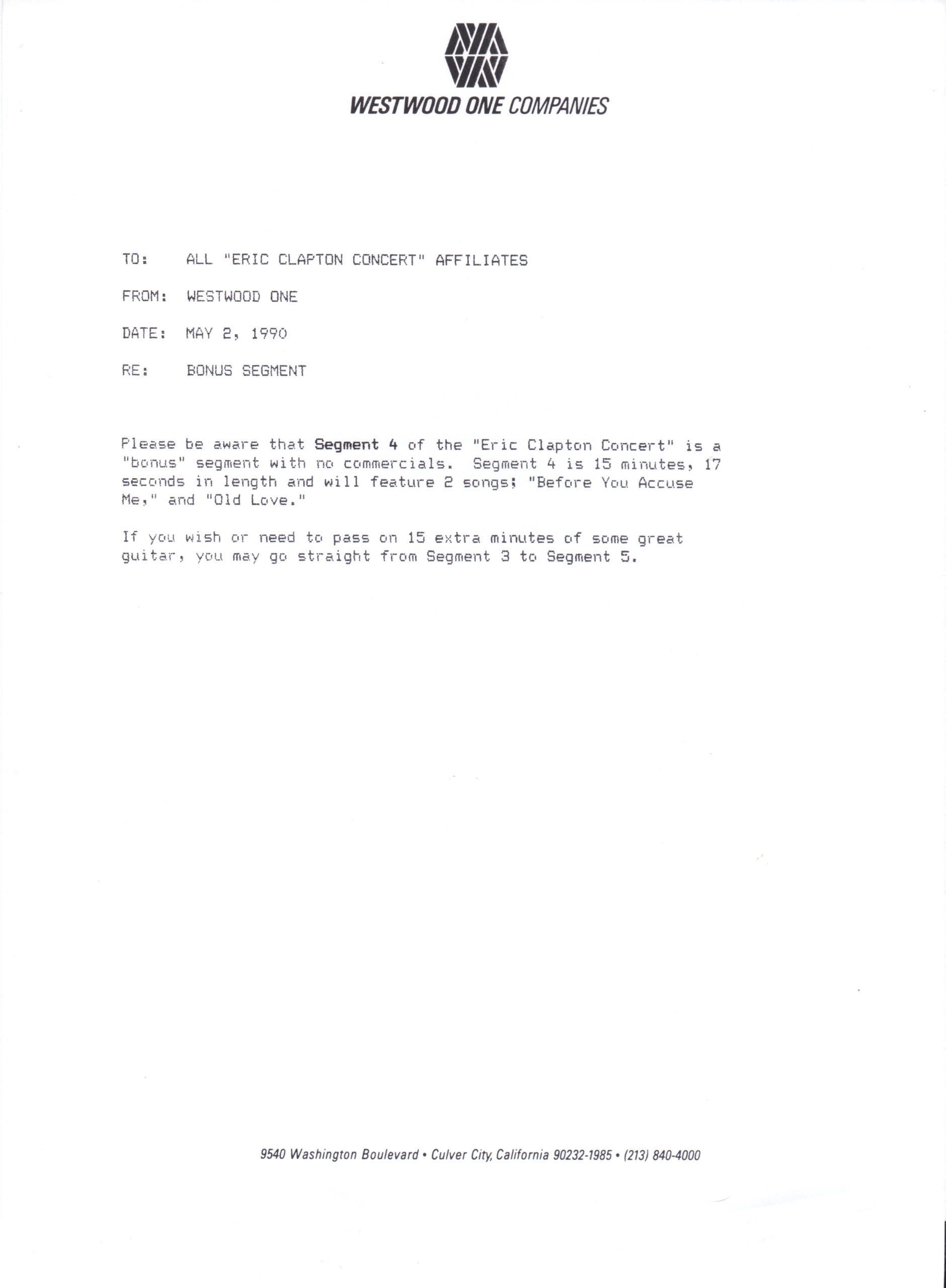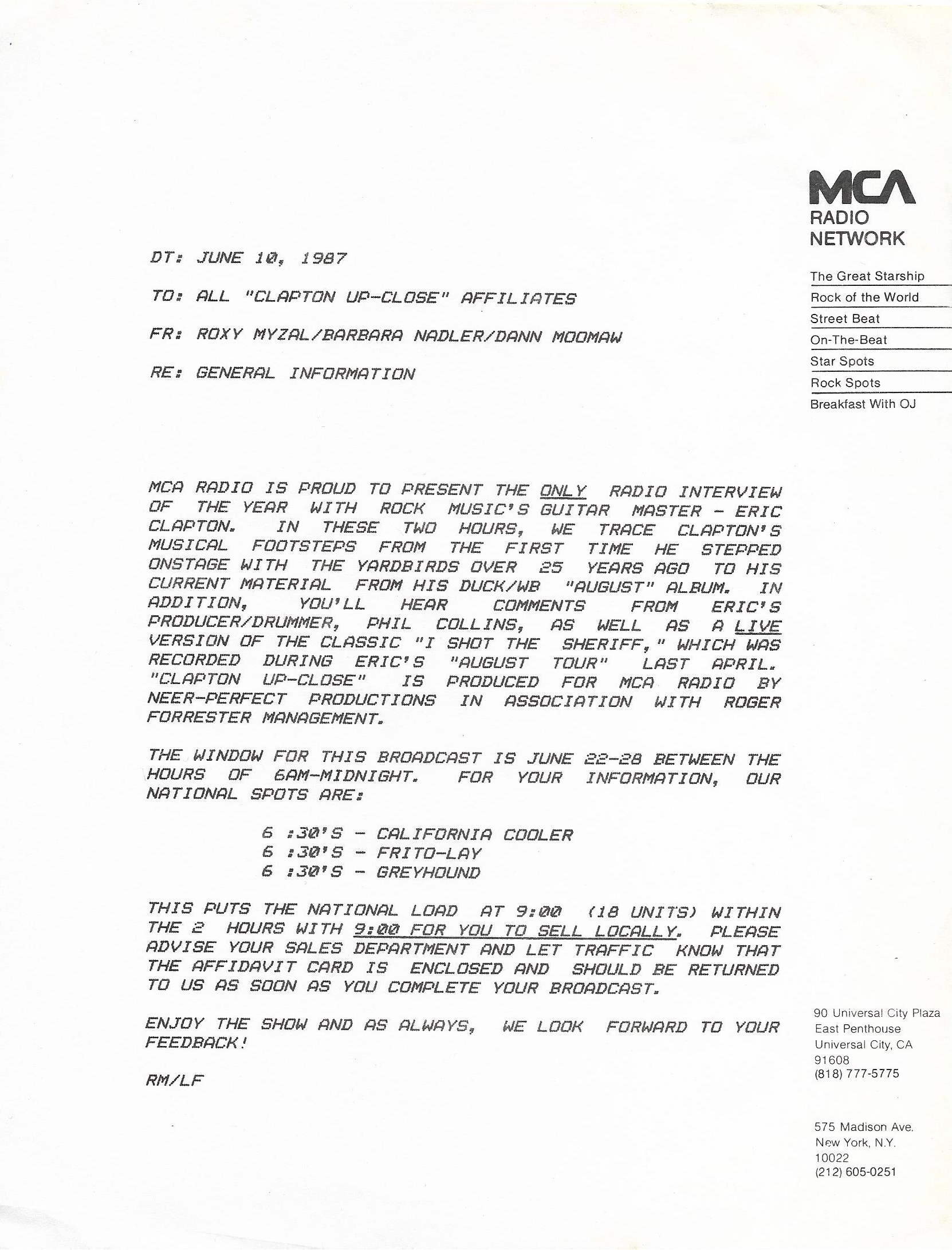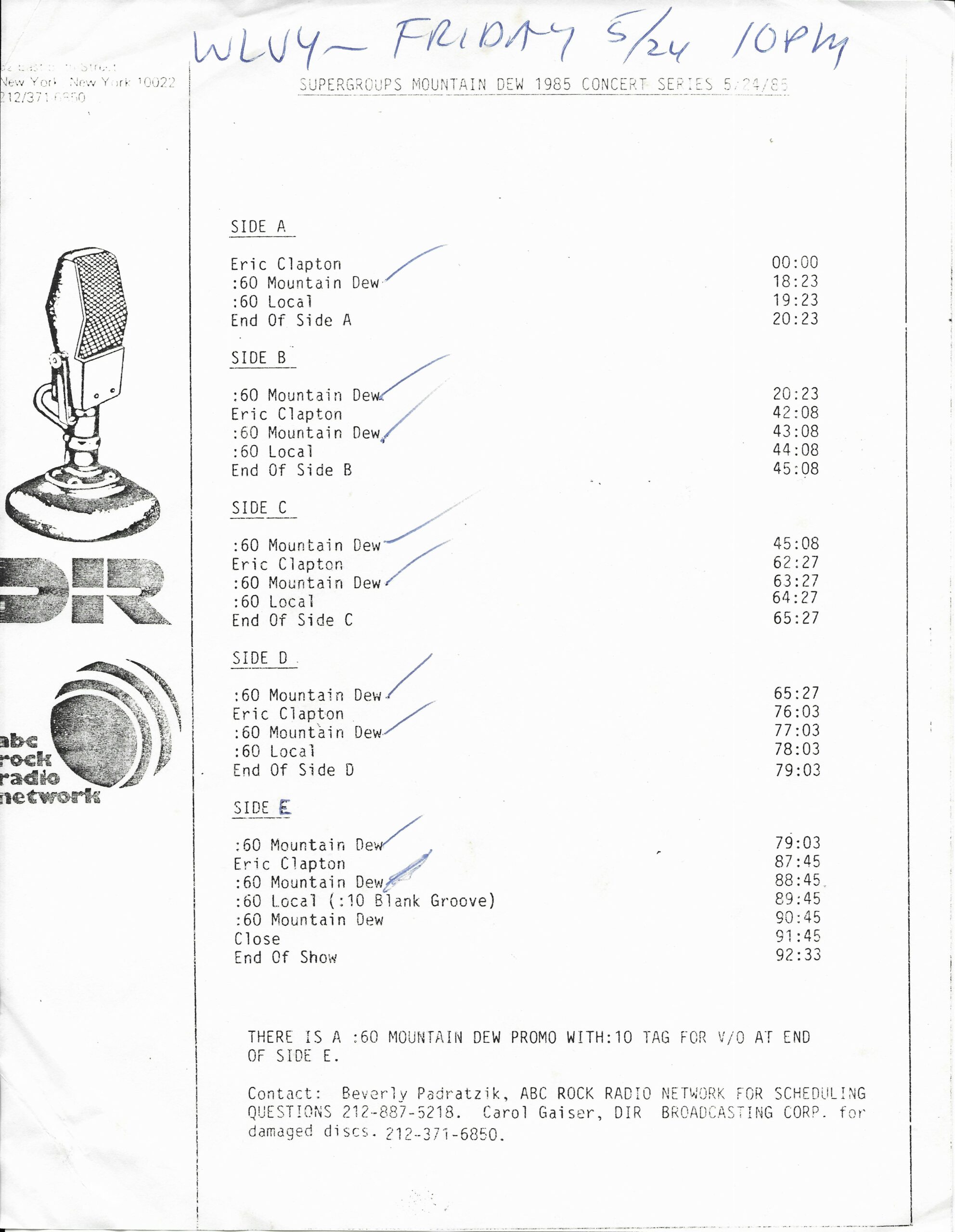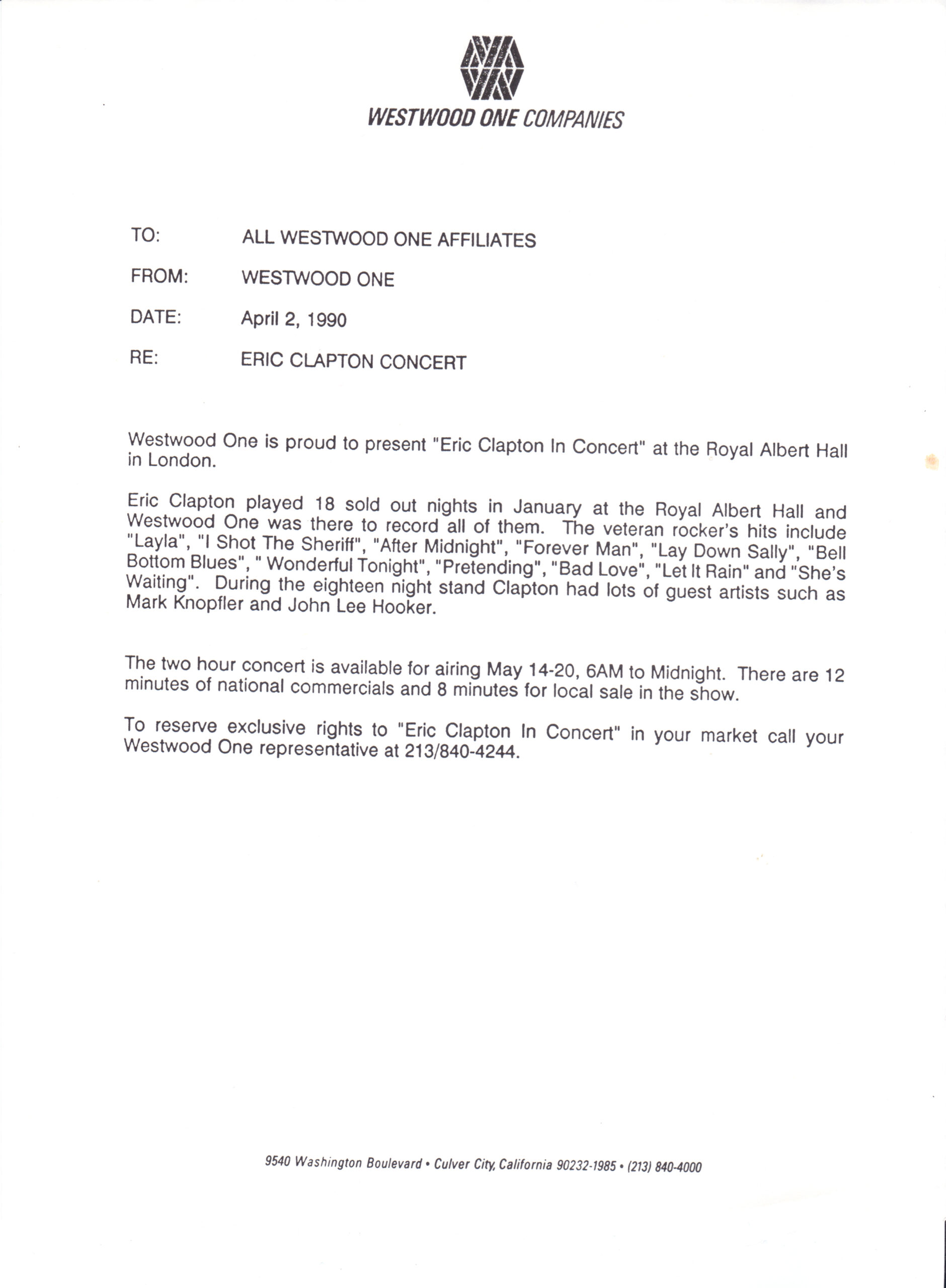 Host Richard Skinner presents an interview with Eric Clapton regarding his live album JUST ONE NIGHT. Tommy Vance conducts the interview and plays live cuts from that album, along with other Clapton-related tracks. All of the live tracks are taken from the aforementioned live release. Contains original commercial blocks and DJ introductions. This is Version AA per the Matrix / Runouts.