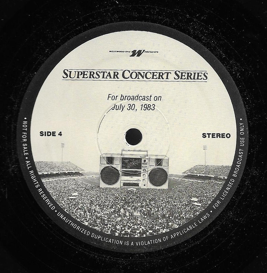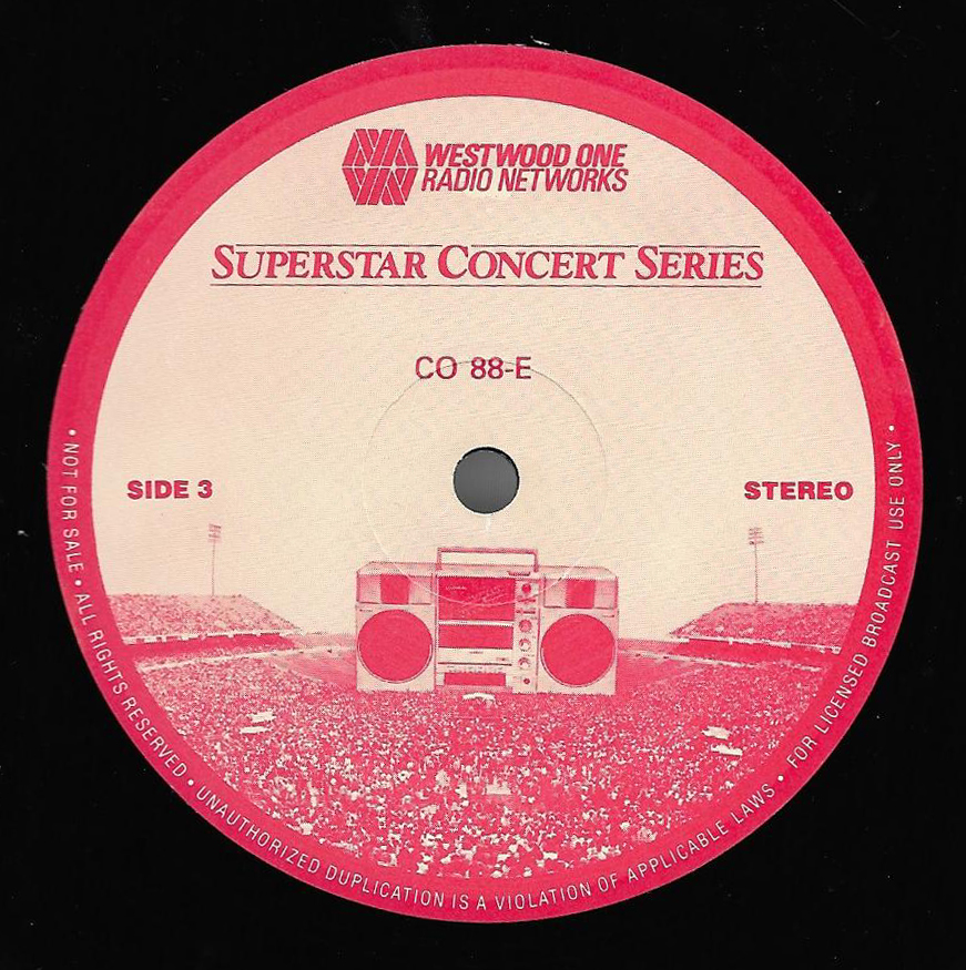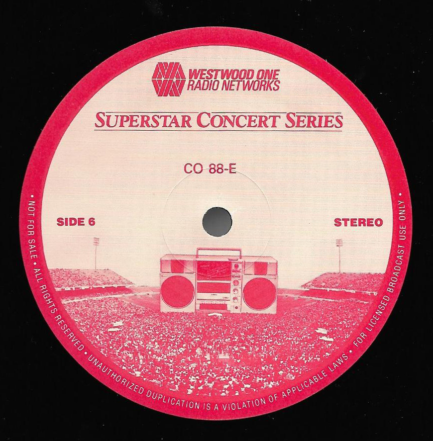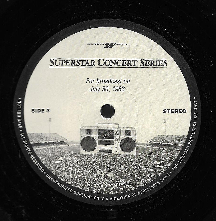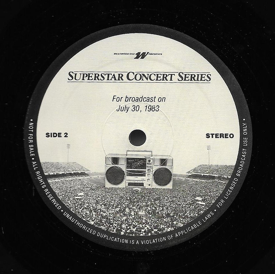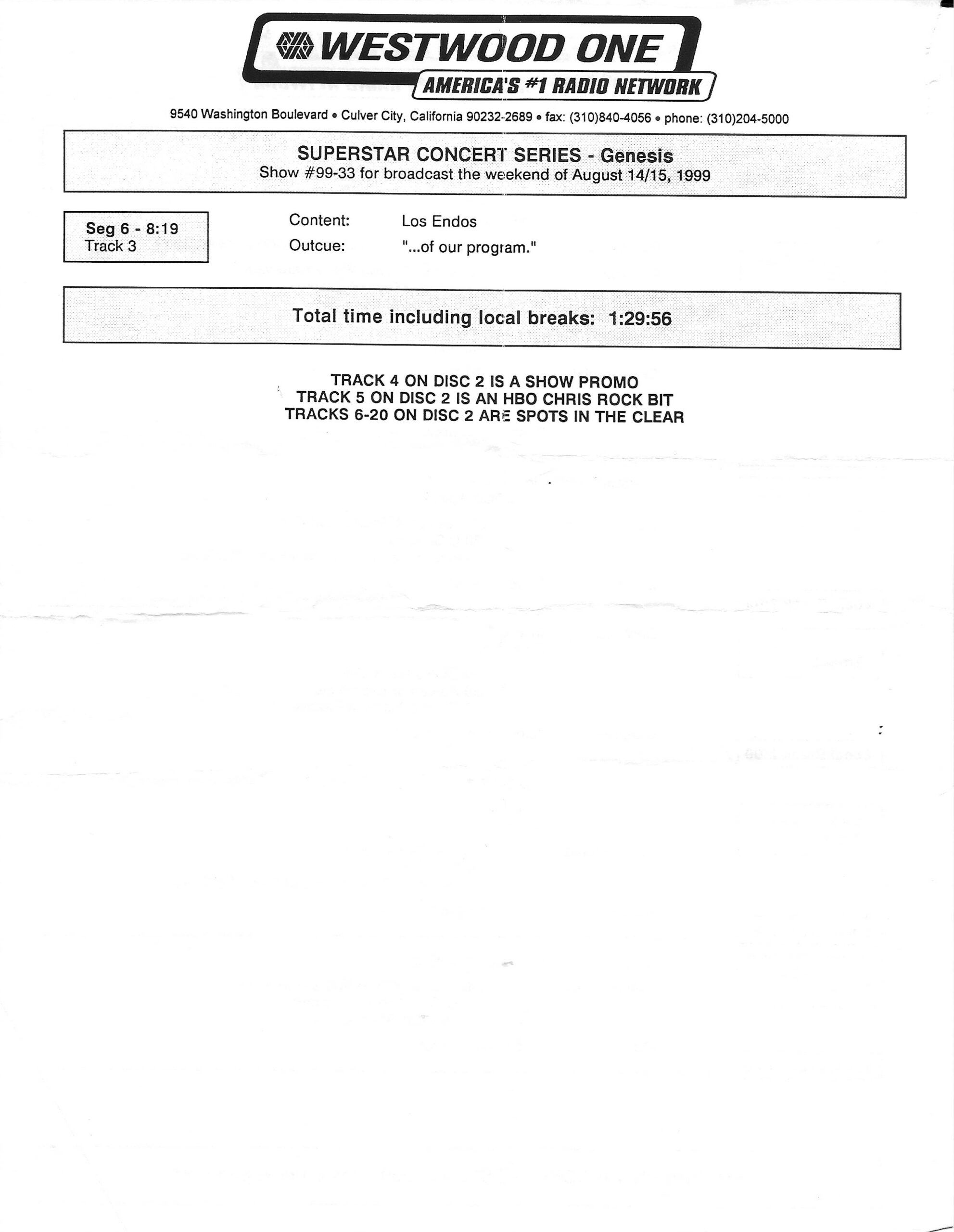 Here is another in the Superstar Concert Series of shows, this time featuring a “greatest hits” style show with Genesis. Although this is a two-disc show, it was not designed to be aired on consecutive nights or weekends. This show was broadcast in one 90 minute window in August 1999. Featuring performances from 1981 and 1984, all tracks presented are previously available on other Westwood One shows listed above. Host J.J. Jackson handles the segments breaks, with original commercial blocks included. This exact show was repackaged for broadcast in August 2000 under show #00-35, but I’ve only ever been able to find Part I for sale online.
