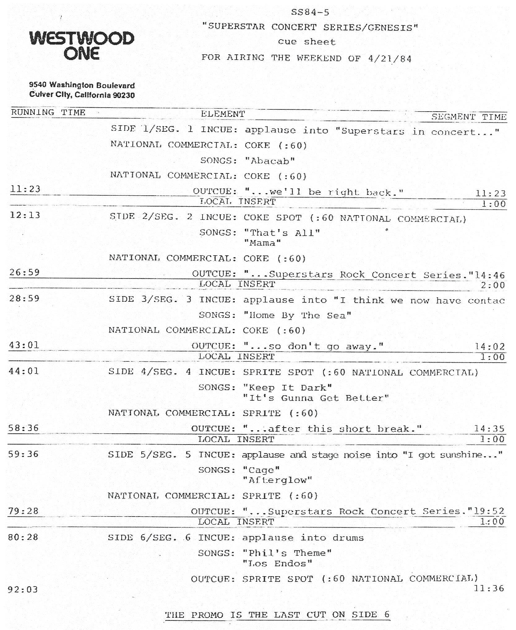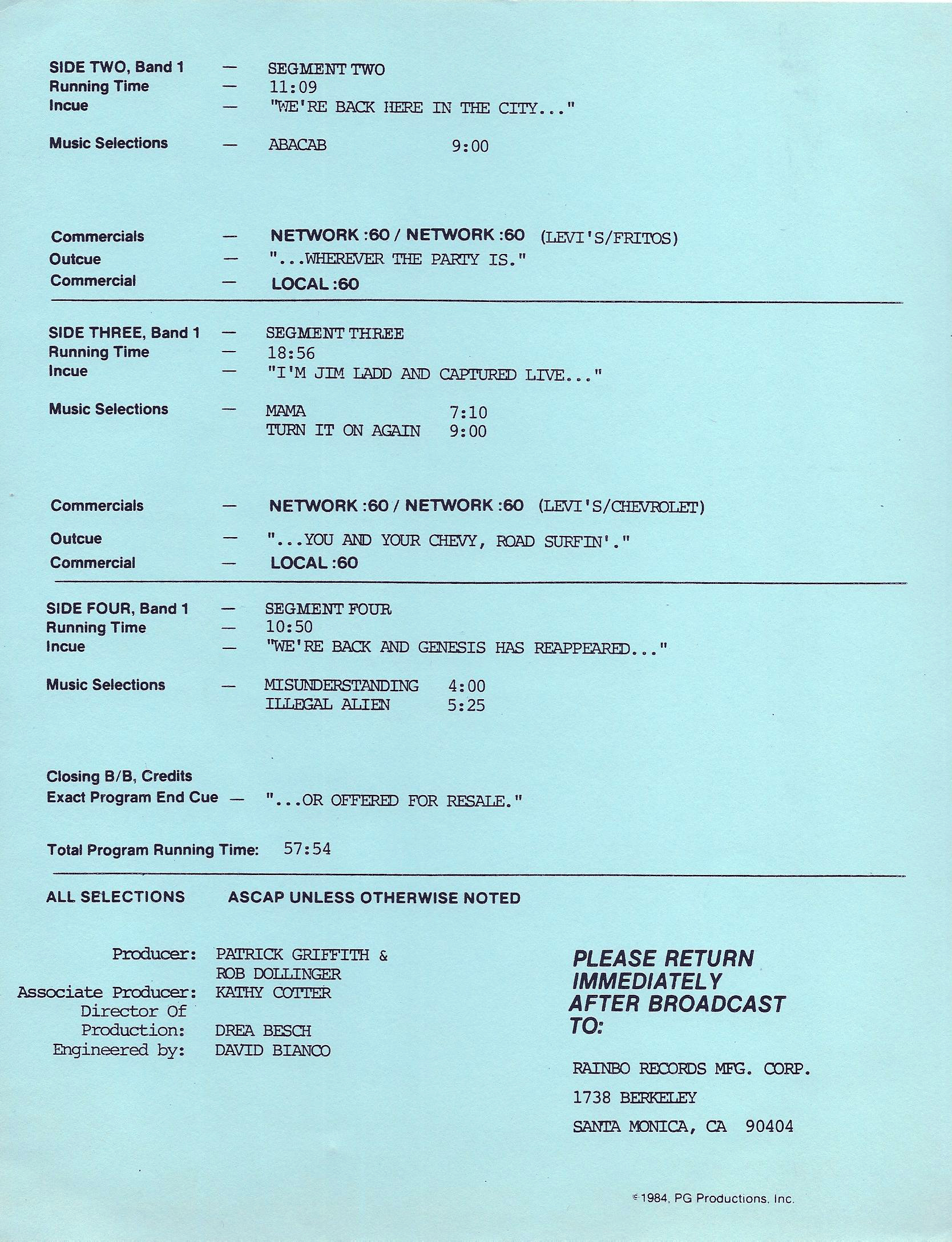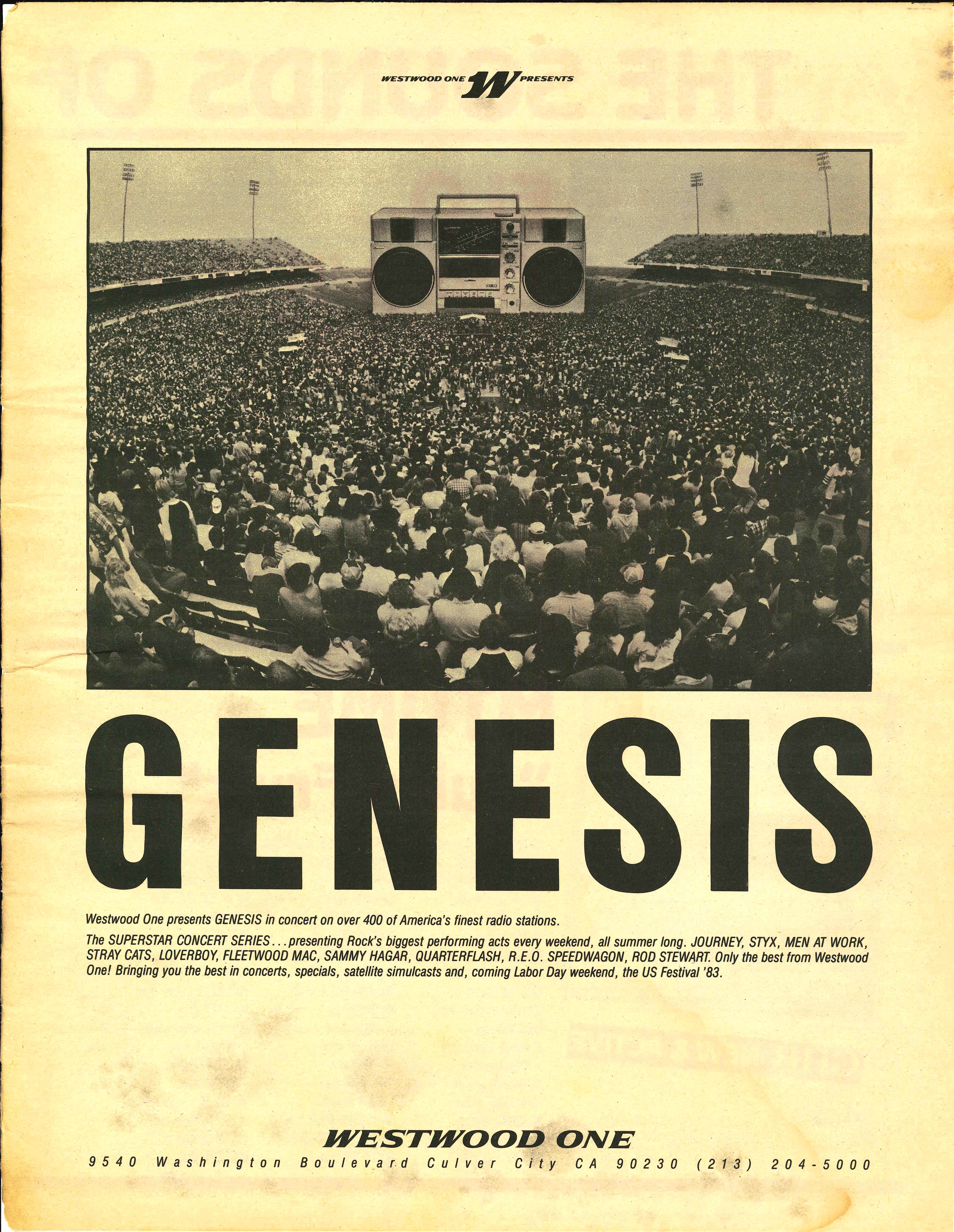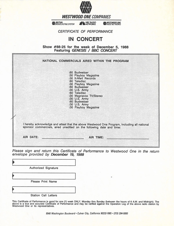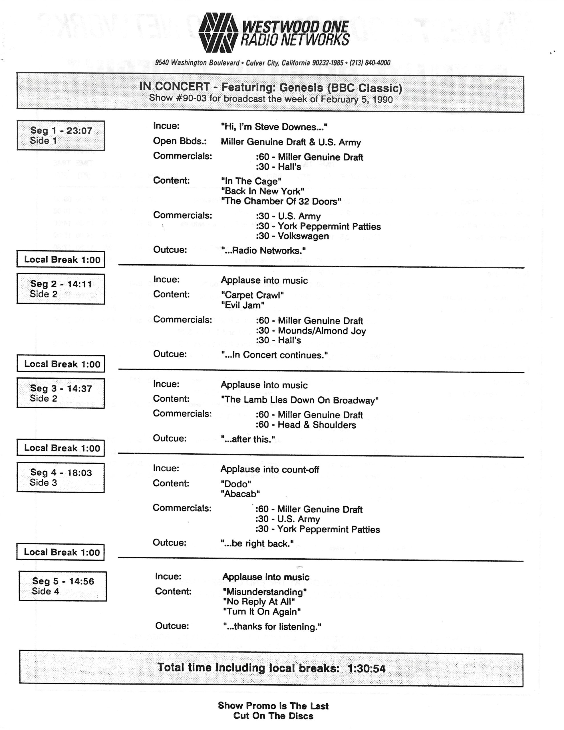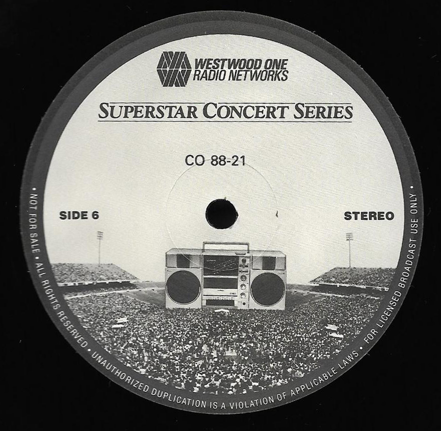 Here is another in the Superstar Concert Series of shows, this time featuring a “greatest hits” style show with Genesis. Although this is a two-disc show, it was not designed to be aired on consecutive nights or weekends. This show was broadcast in one 90 minute window in August 1999. Featuring performances from 1981 and 1984, all tracks presented are previously available on other Westwood One shows listed above. Host J.J. Jackson handles the segments breaks, with original commercial blocks included. This exact show was repackaged for broadcast in August 2000 under show #00-35, but I’ve only ever been able to find Part I for sale online.