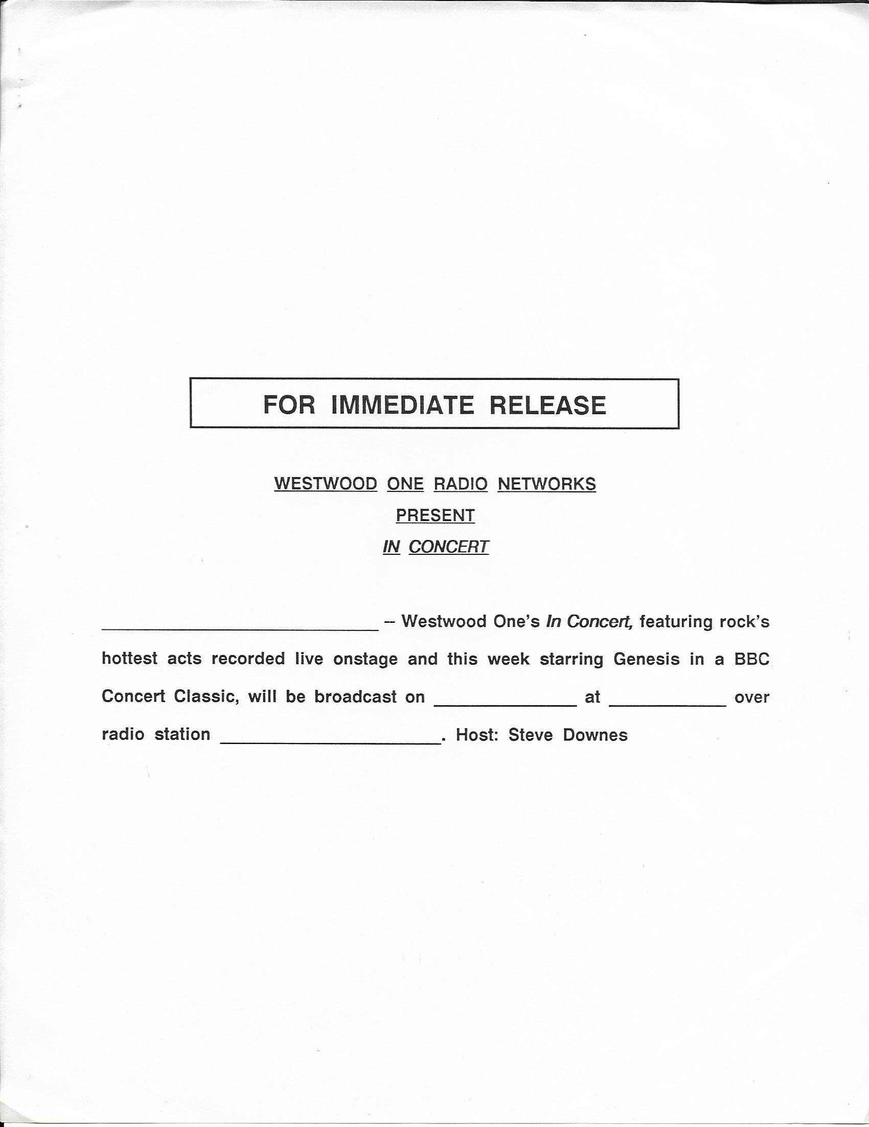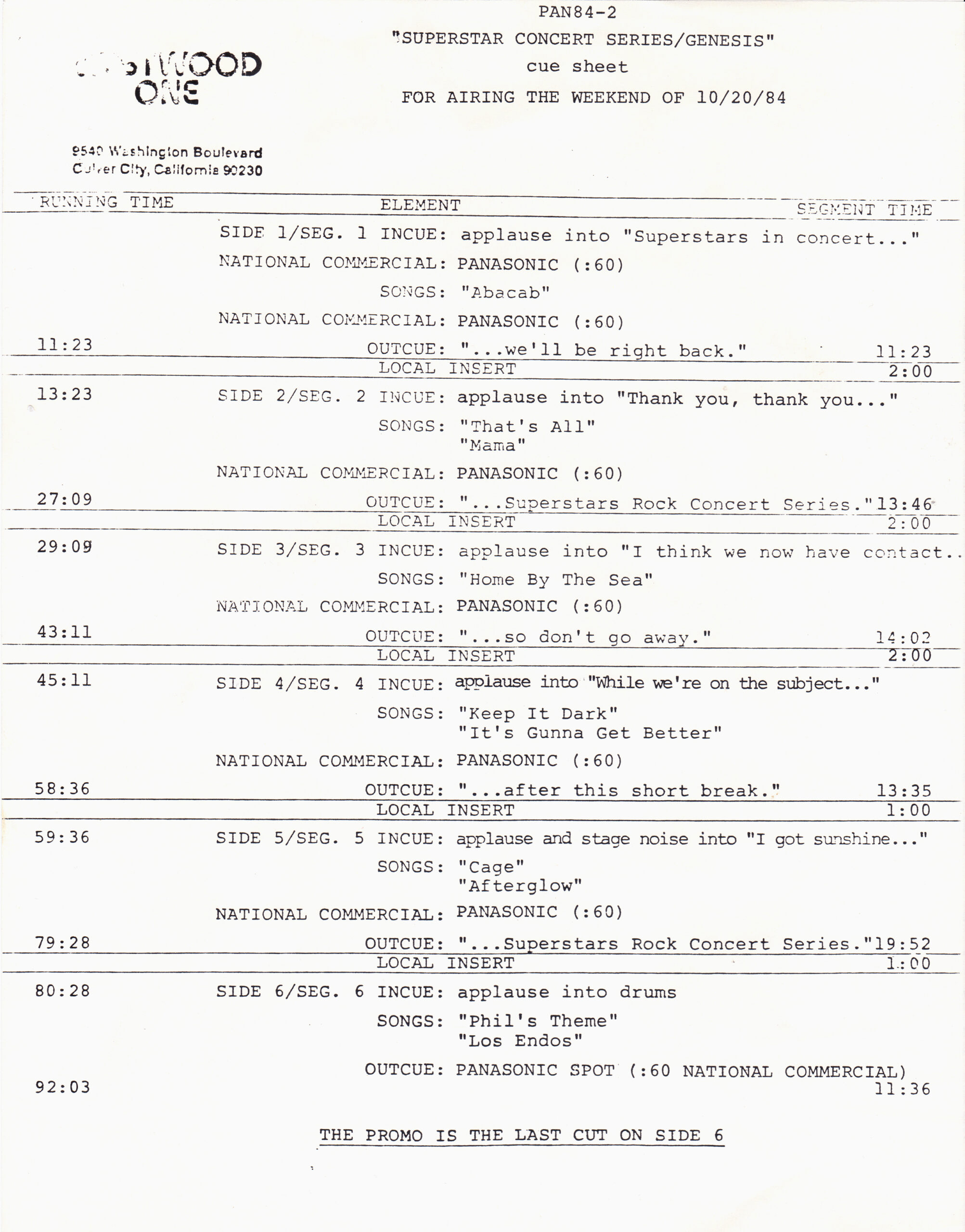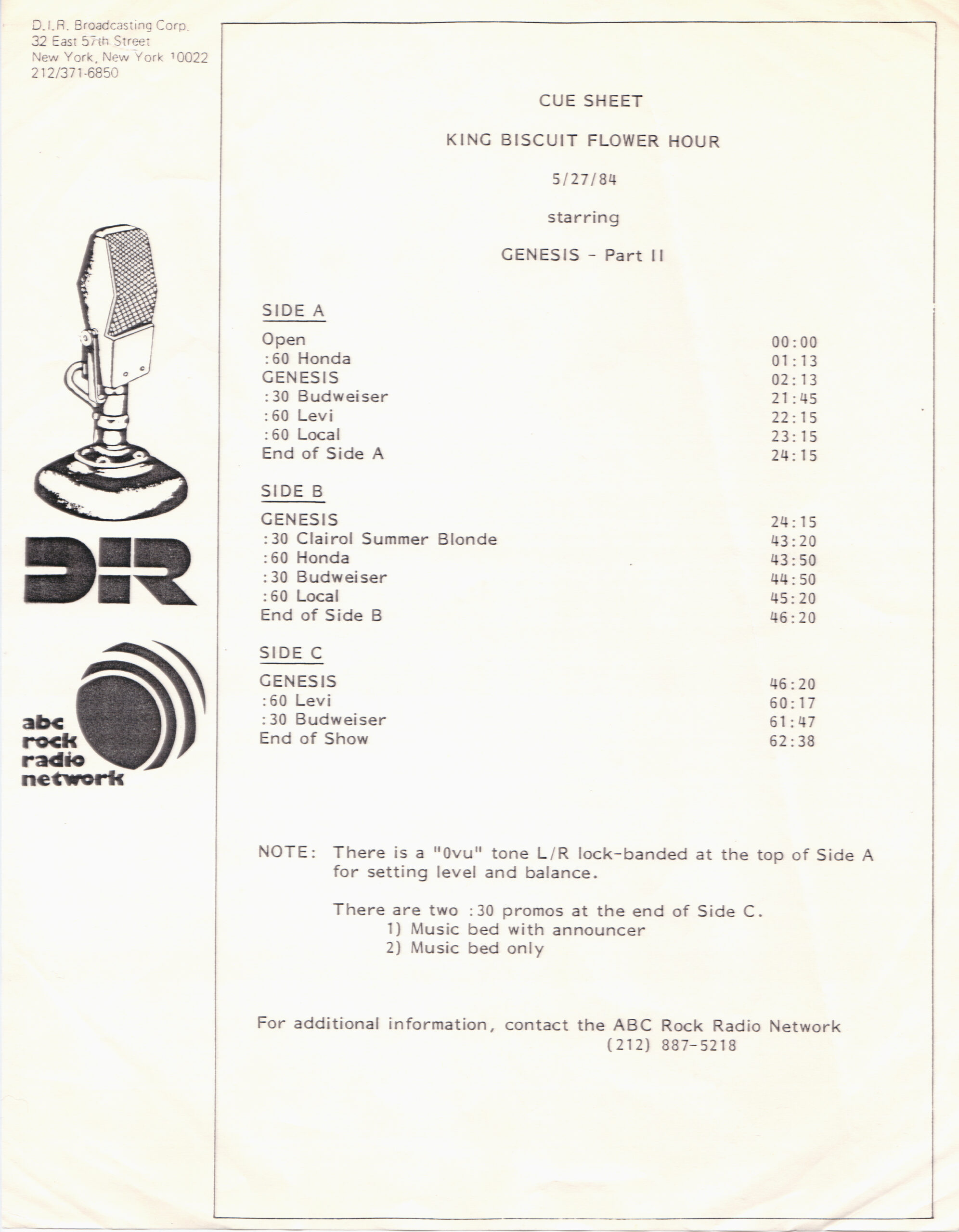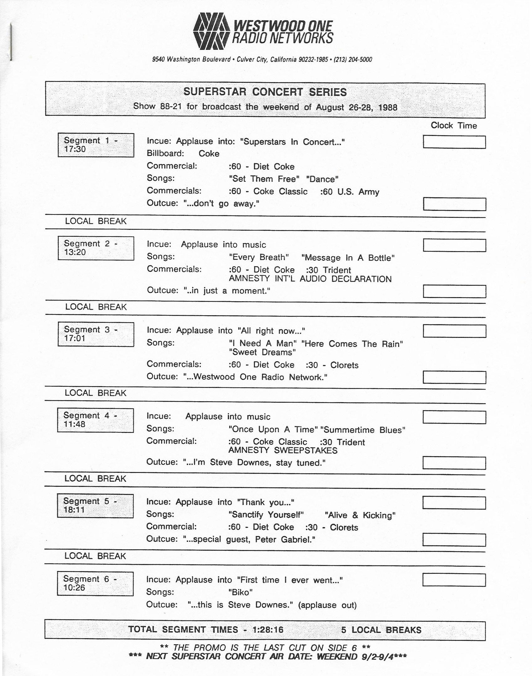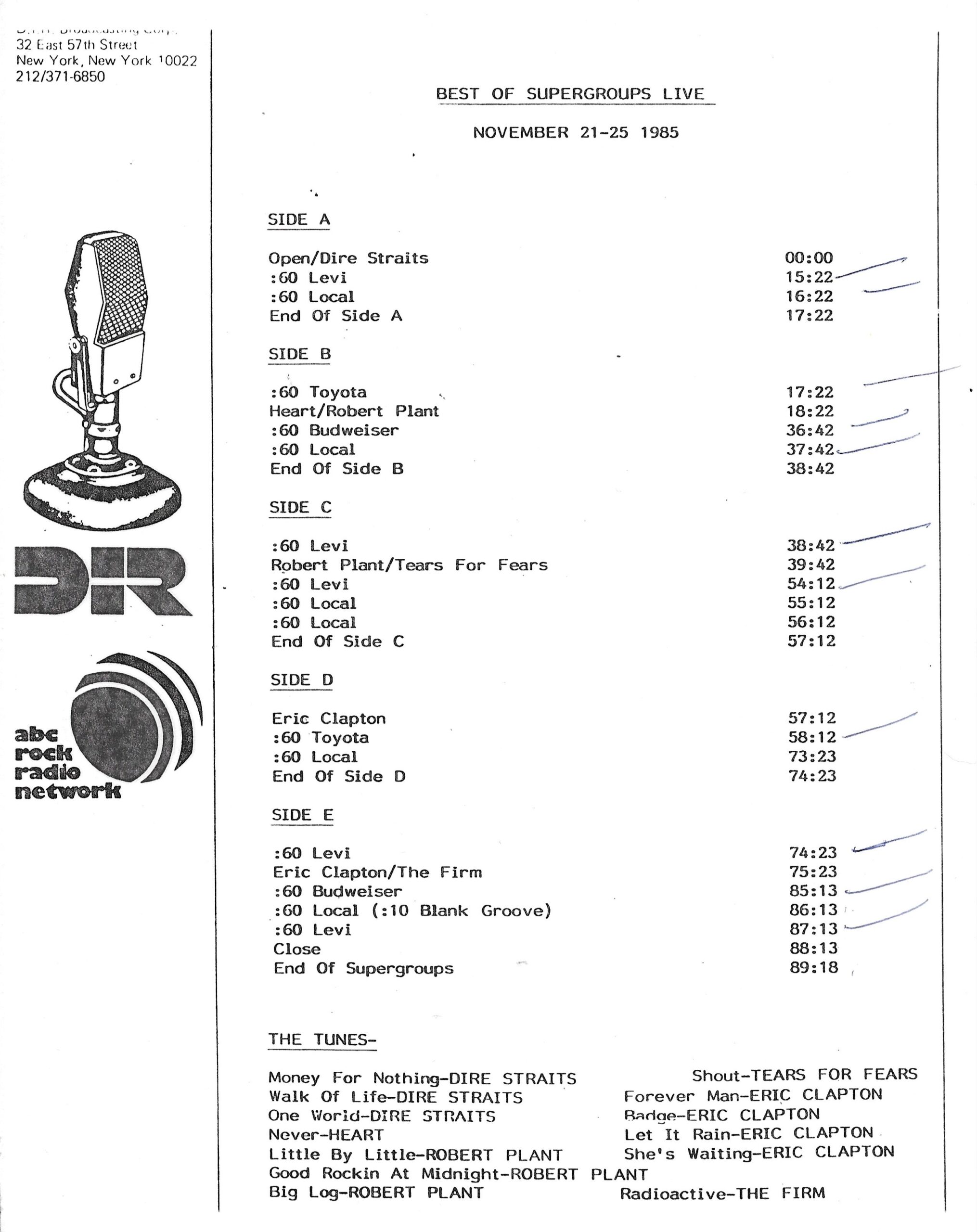 Here is another in the Superstar Concert Series of shows, this time featuring a “greatest hits” style show with Genesis. Although this is a two-disc show, it was not designed to be aired on consecutive nights or weekends. This show was broadcast in one 90 minute window in August 1999. Featuring performances from 1981 and 1984, all tracks presented are previously available on other Westwood One shows listed above. Host J.J. Jackson handles the segments breaks, with original commercial blocks included. This exact show was repackaged for broadcast in August 2000 under show #00-35, but I’ve only ever been able to find Part I for sale online.