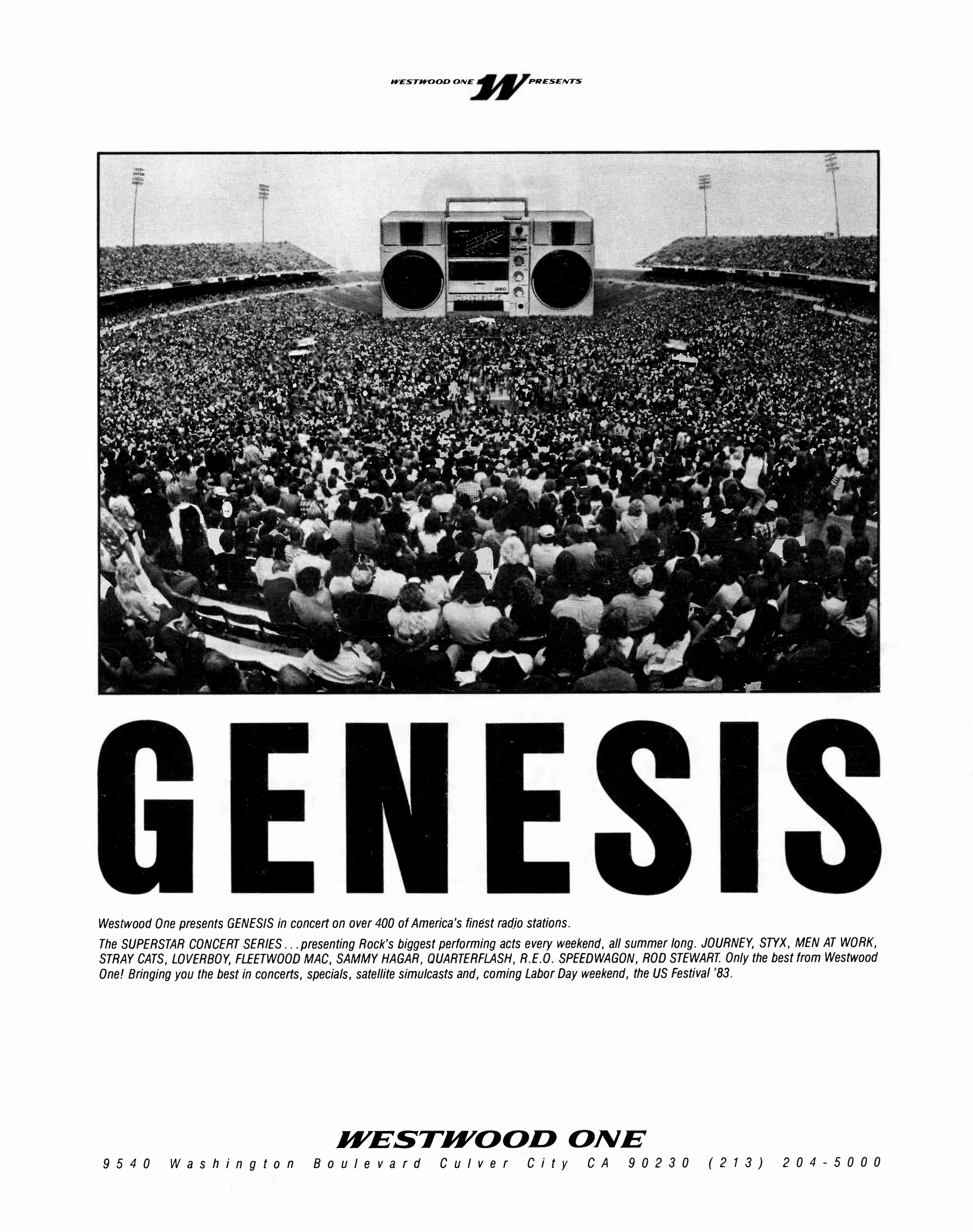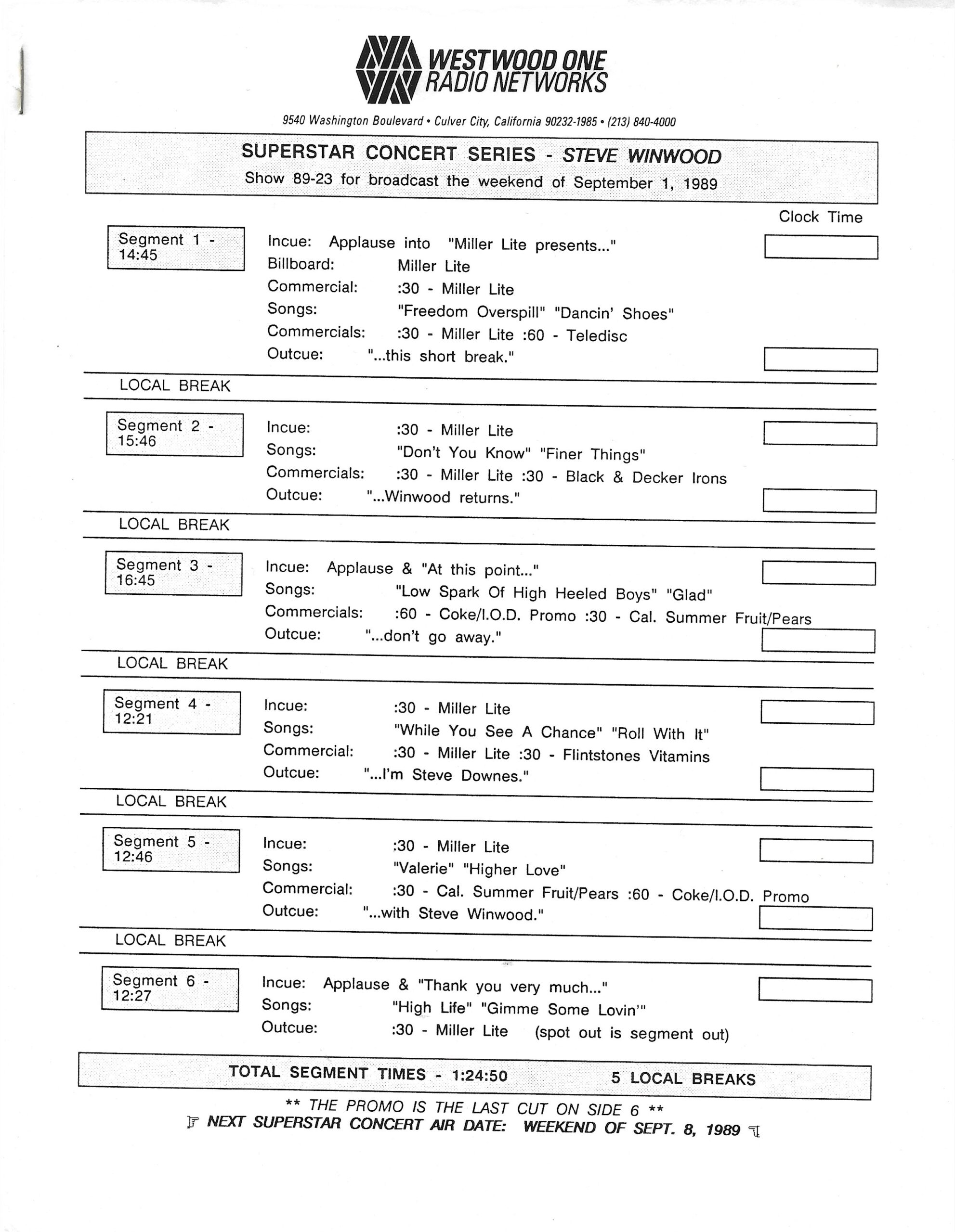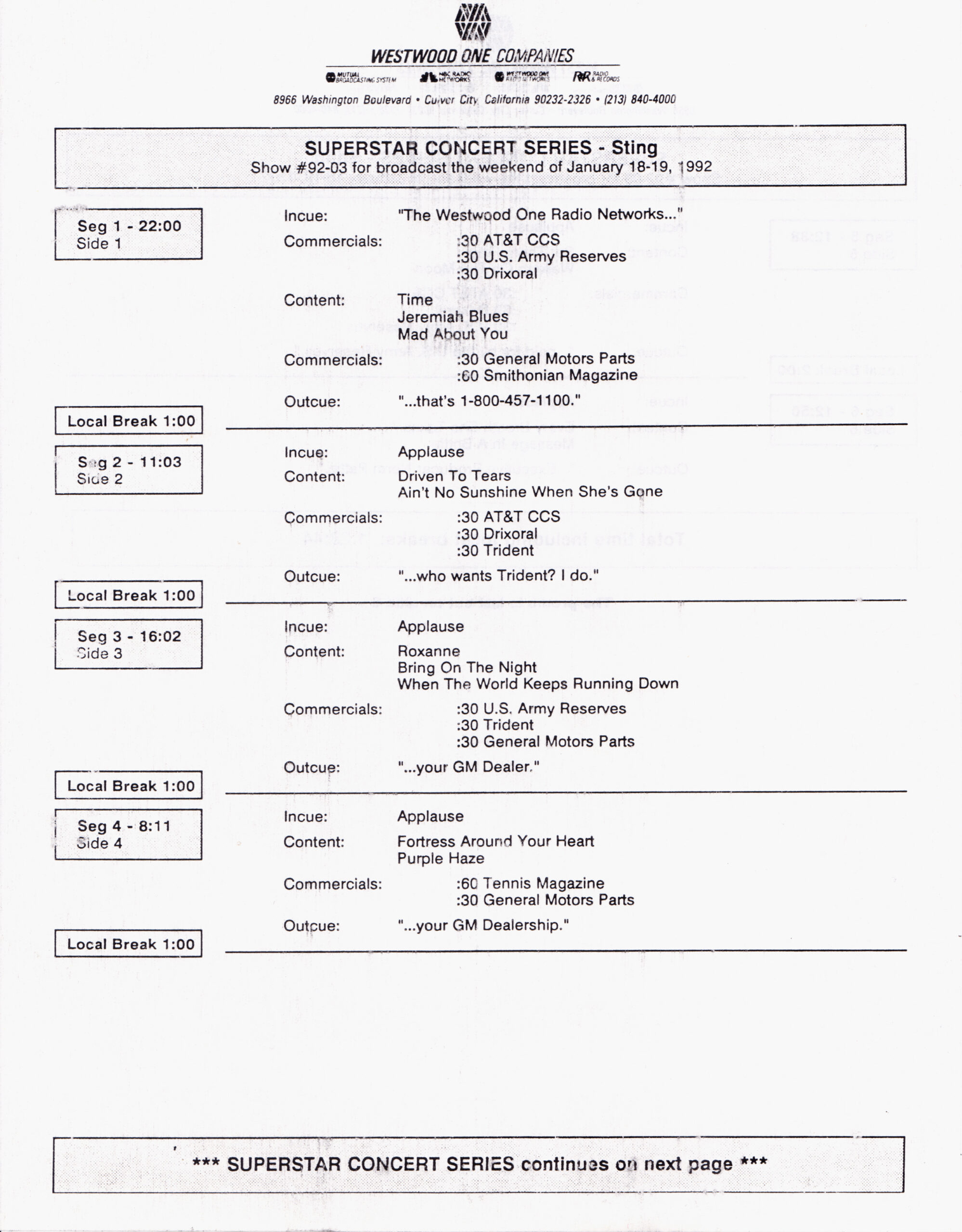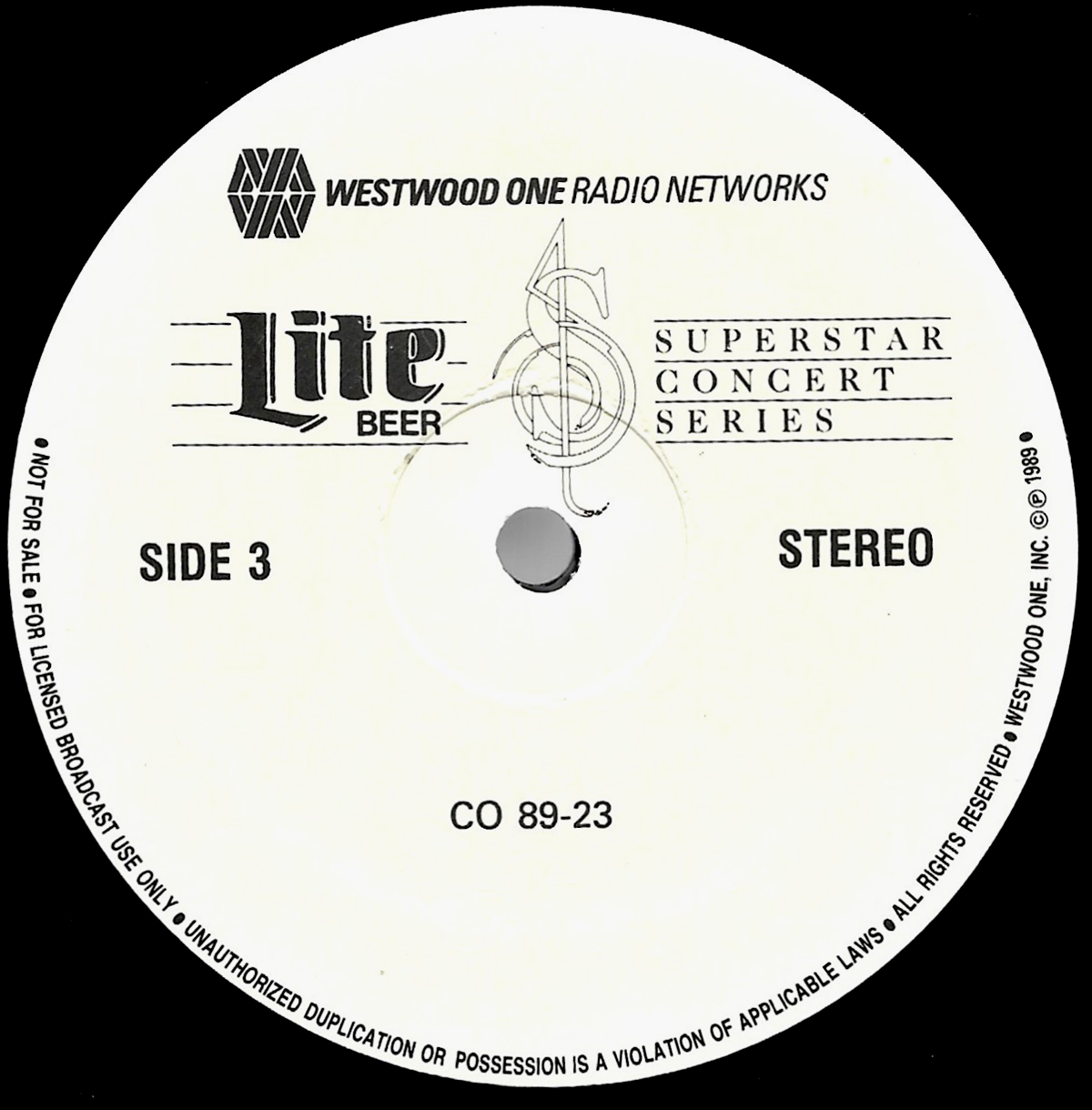 Here is another in the Superstar Concert Series of shows, this time featuring a “greatest hits” style show with Genesis. Although this is a two-disc show, it was not designed to be aired on consecutive nights or weekends. This show was broadcast in one 90 minute window in August 1999. Featuring performances from 1981 and 1984, all tracks presented are previously available on other Westwood One shows listed above. Host J.J. Jackson handles the segments breaks, with original commercial blocks included. This exact show was repackaged for broadcast in August 2000 under show #00-35, but I’ve only ever been able to find Part I for sale online.