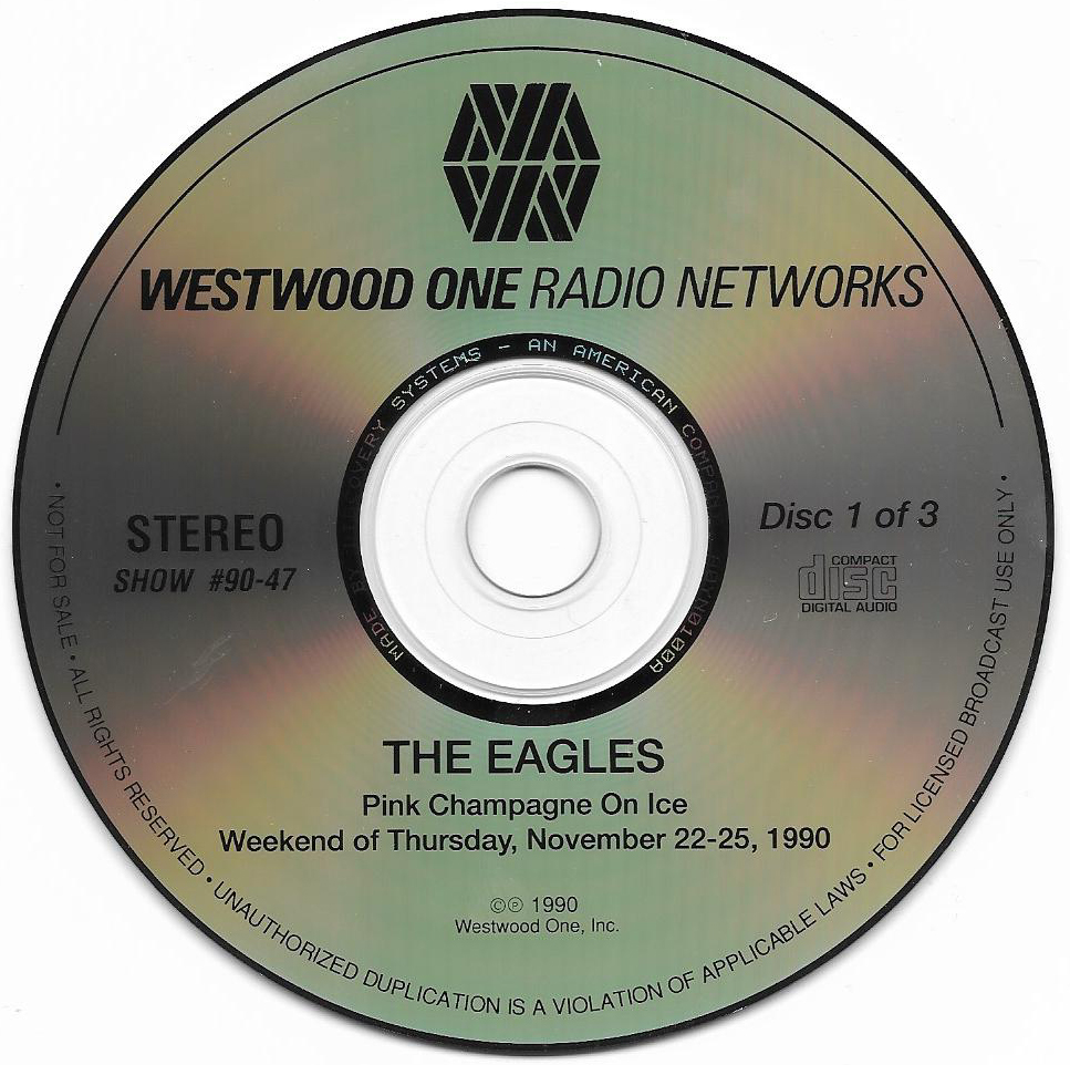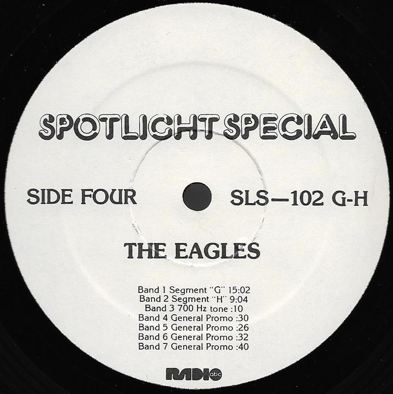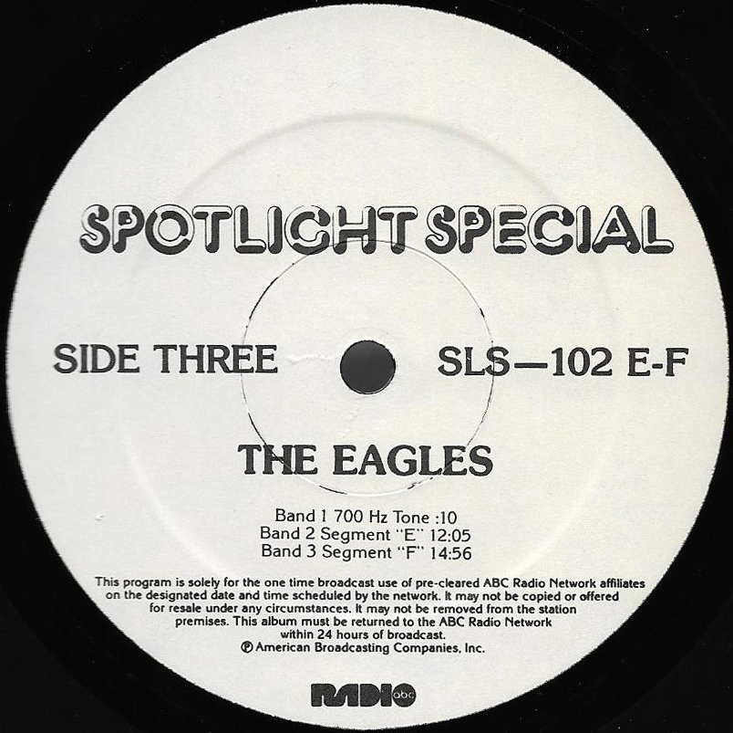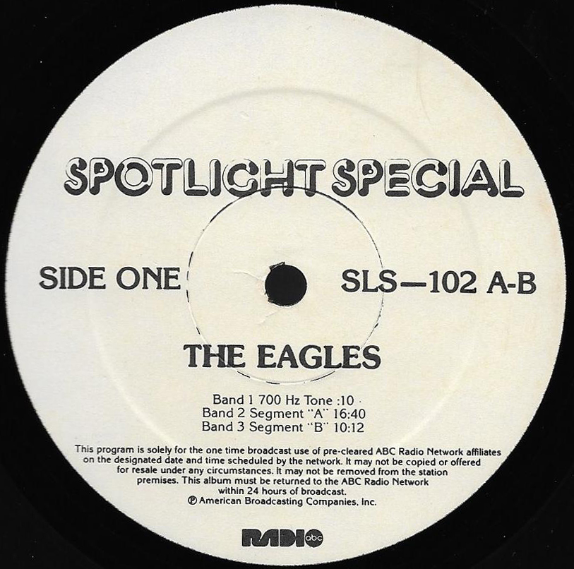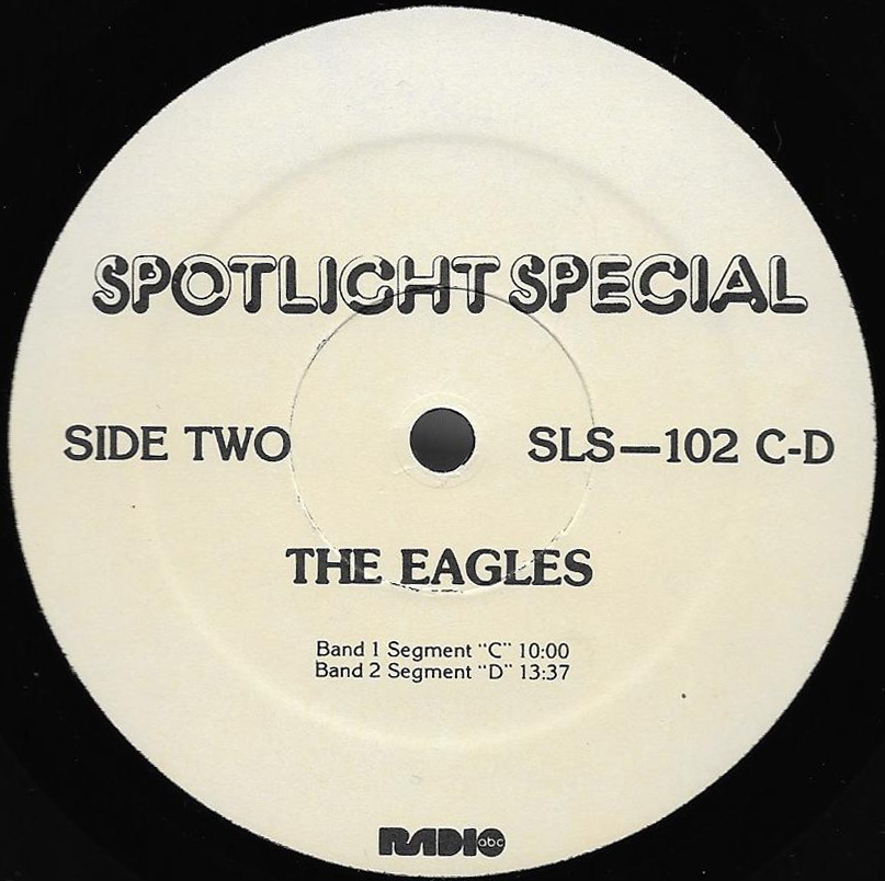 A two-hour radio show featuring interviews, songs and historical notes about the band. Host Kris Erik Stevens, an ABC Radio Networks DJ for many years, provides historical notes between the interview segments and songs. Includes interviews with Don Henley, Glenn Frey, Don Felder, Joe Walsh, Jackson Browne, Bob Seger and Elektra / Asylum Records Chairman of the Board Joe Smith. No commercials are included on this set, and unlike most radio shows on vinyl, this set has Sides A and B on one LP, along with Sides C and D on the second LP. (Usually double LP radio shows were set up as Sides A and C on one LP, and Sides B and D on the second LP to allow DJs to play the sides continuously.) Note that Side B does not contain the 700 Hz Tone Locked Groove used for balancing the audio levels prior to broadcast, but Sides A, C and D do. (Side D actually has two such “tones”, one at the beginning of the side and one prior to the Promo spots.)