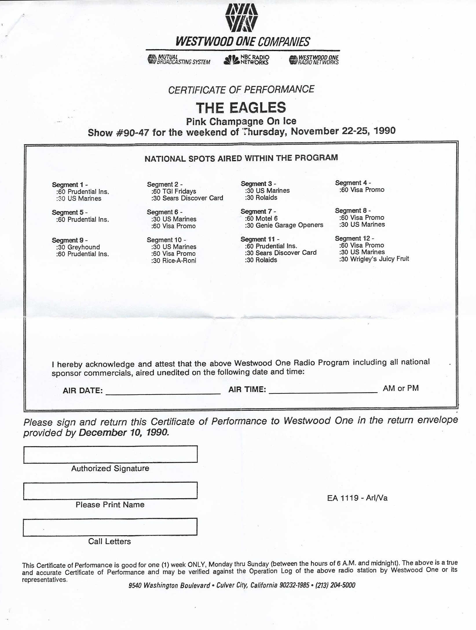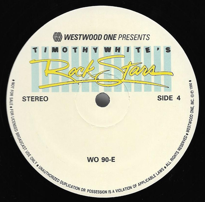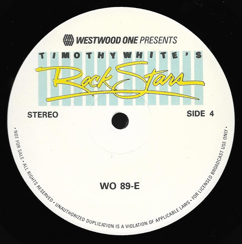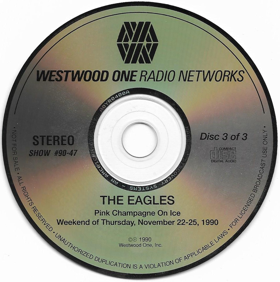A two-hour radio show featuring interviews, songs and historical notes about the band. Host Kris Erik Stevens, an ABC Radio Networks DJ for many years, provides historical notes between the interview segments and songs. Includes interviews with Don Henley, Glenn Frey, Don Felder, Joe Walsh, Jackson Browne, Bob Seger and Elektra / Asylum Records Chairman of the Board Joe Smith. No commercials are included on this set, and unlike most radio shows on vinyl, this set has Sides A and B on one LP, along with Sides C and D on the second LP. (Usually double LP radio shows were set up as Sides A and C on one LP, and Sides B and D on the second LP to allow DJs to play the sides continuously.) Note that Side B does not contain the 700 Hz Tone Locked Groove used for balancing the audio levels prior to broadcast, but Sides A, C and D do. (Side D actually has two such “tones”, one at the beginning of the side and one prior to the Promo spots.)