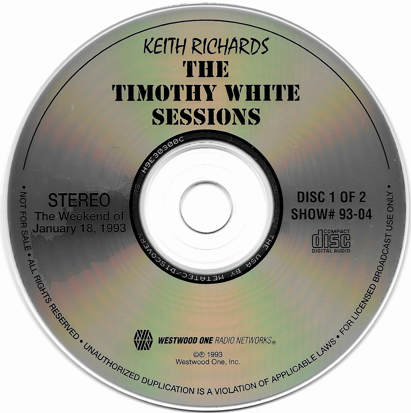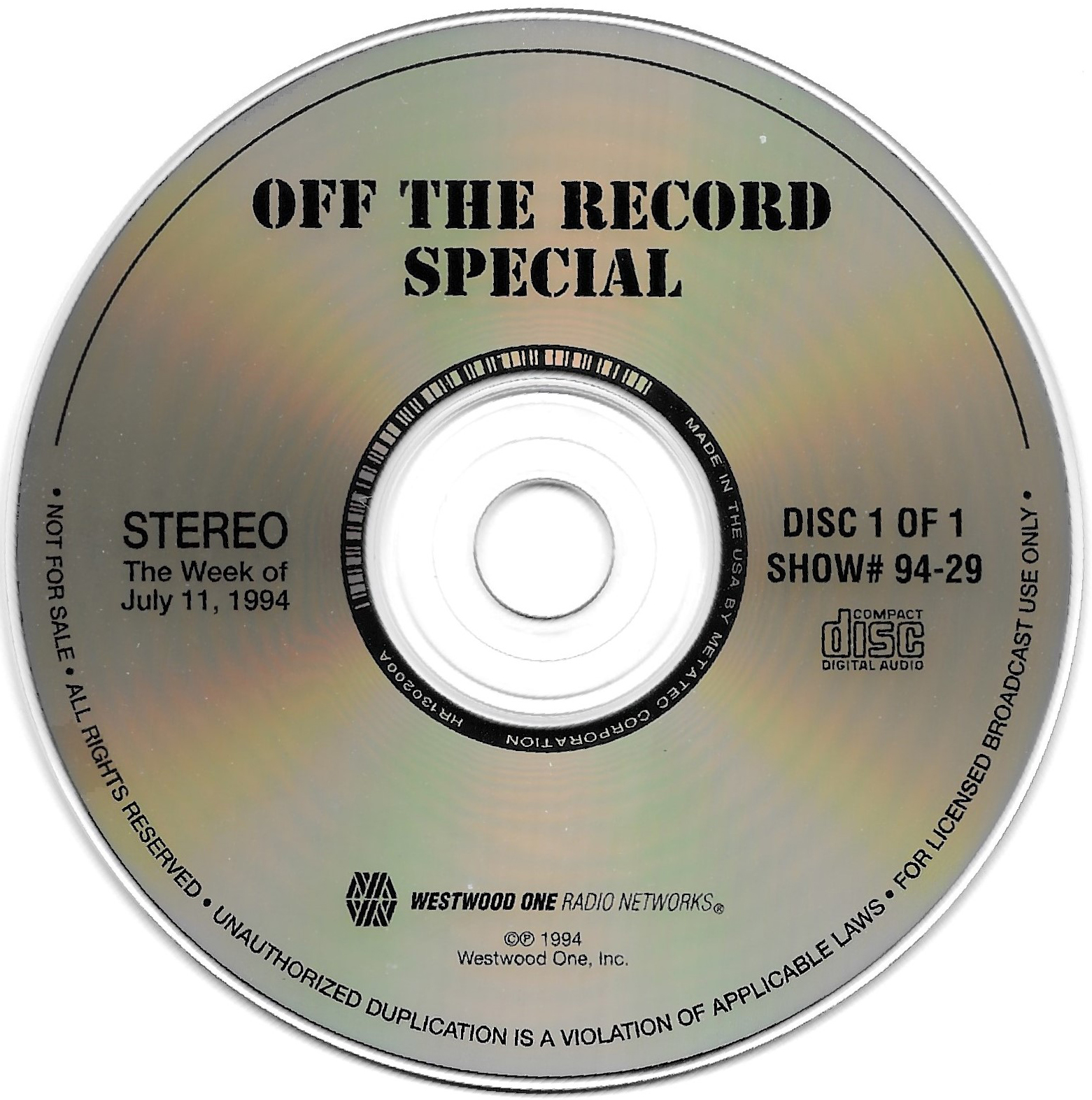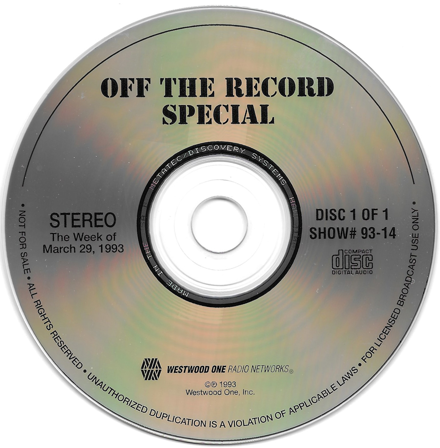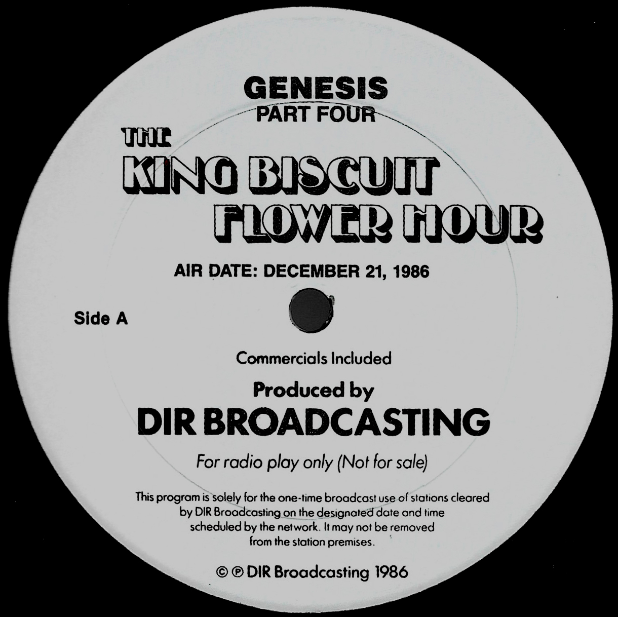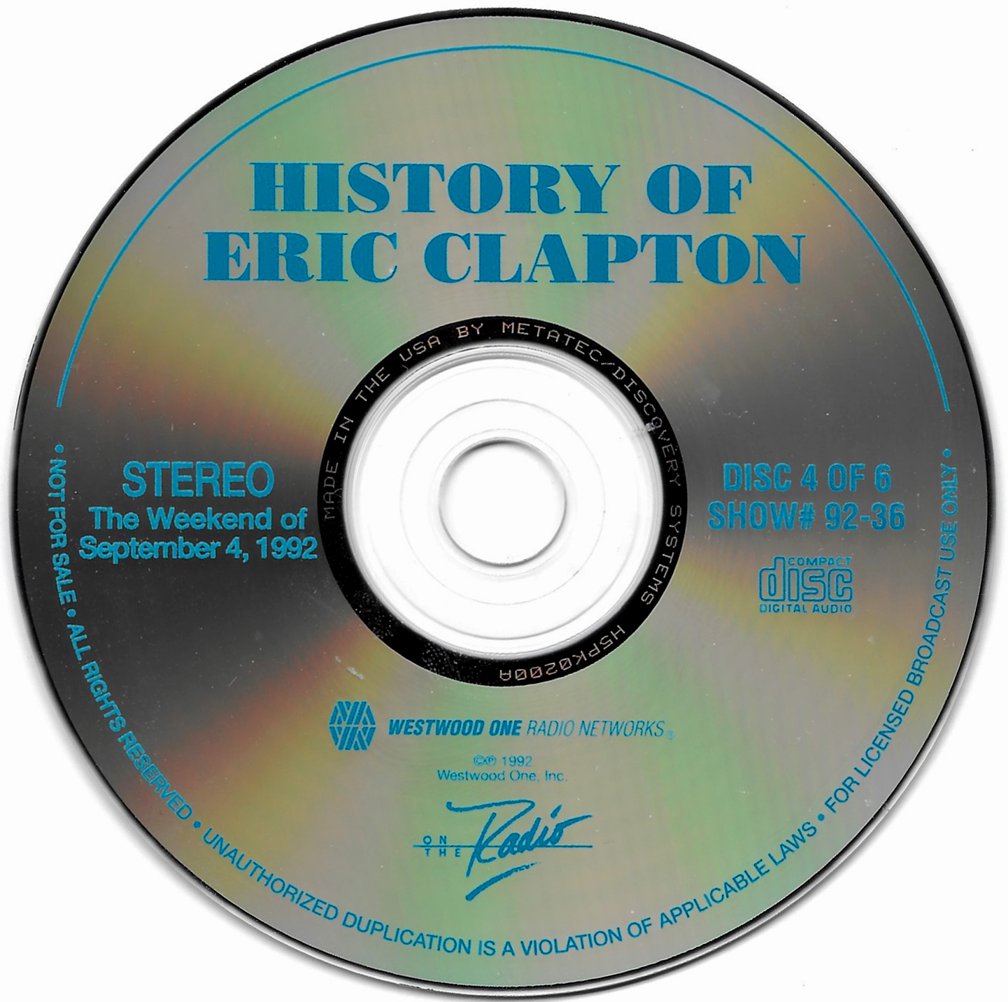 Tracks from the album are played, and there are commercial blocks as well. There are four tracks on the CD. From my personal collection.