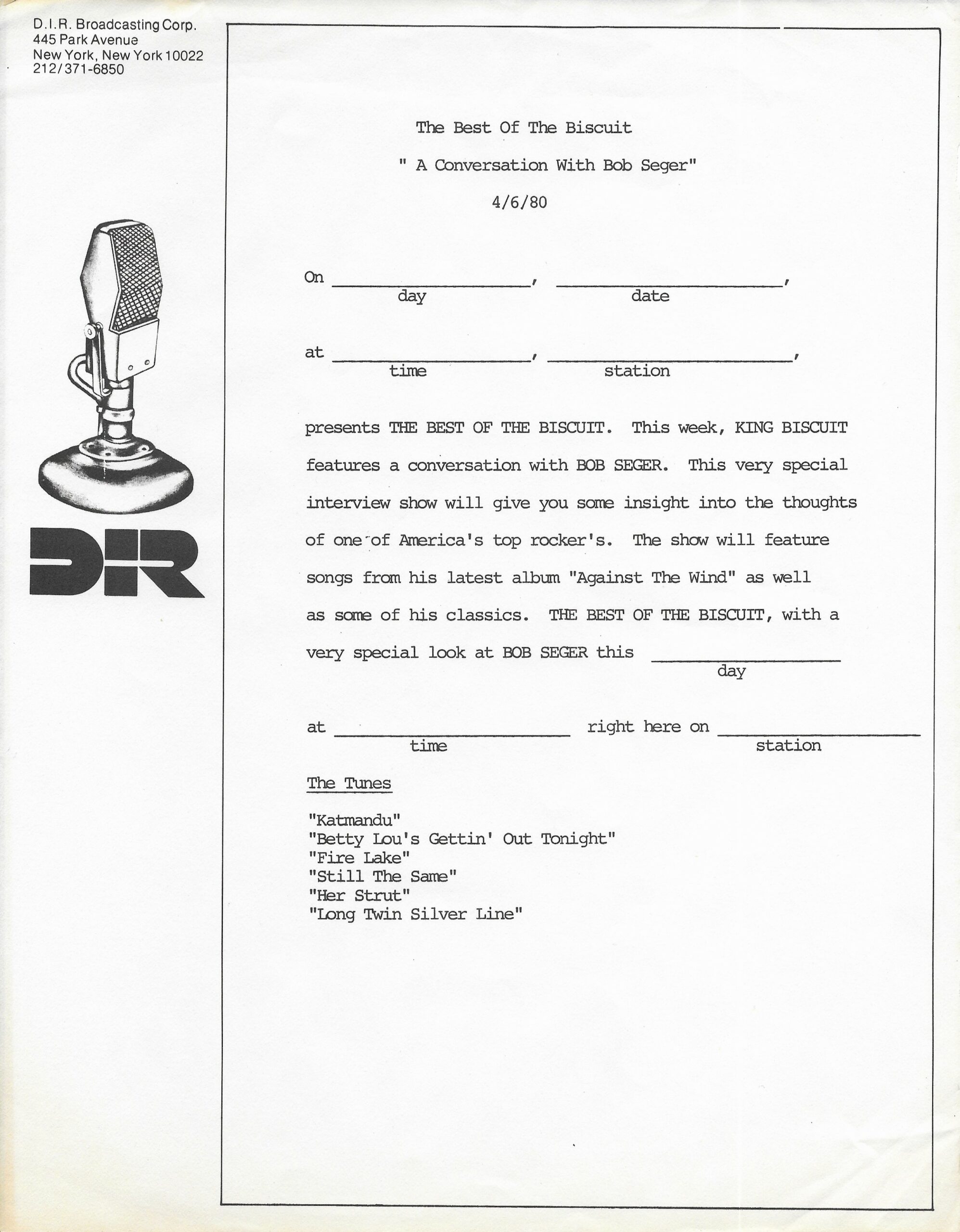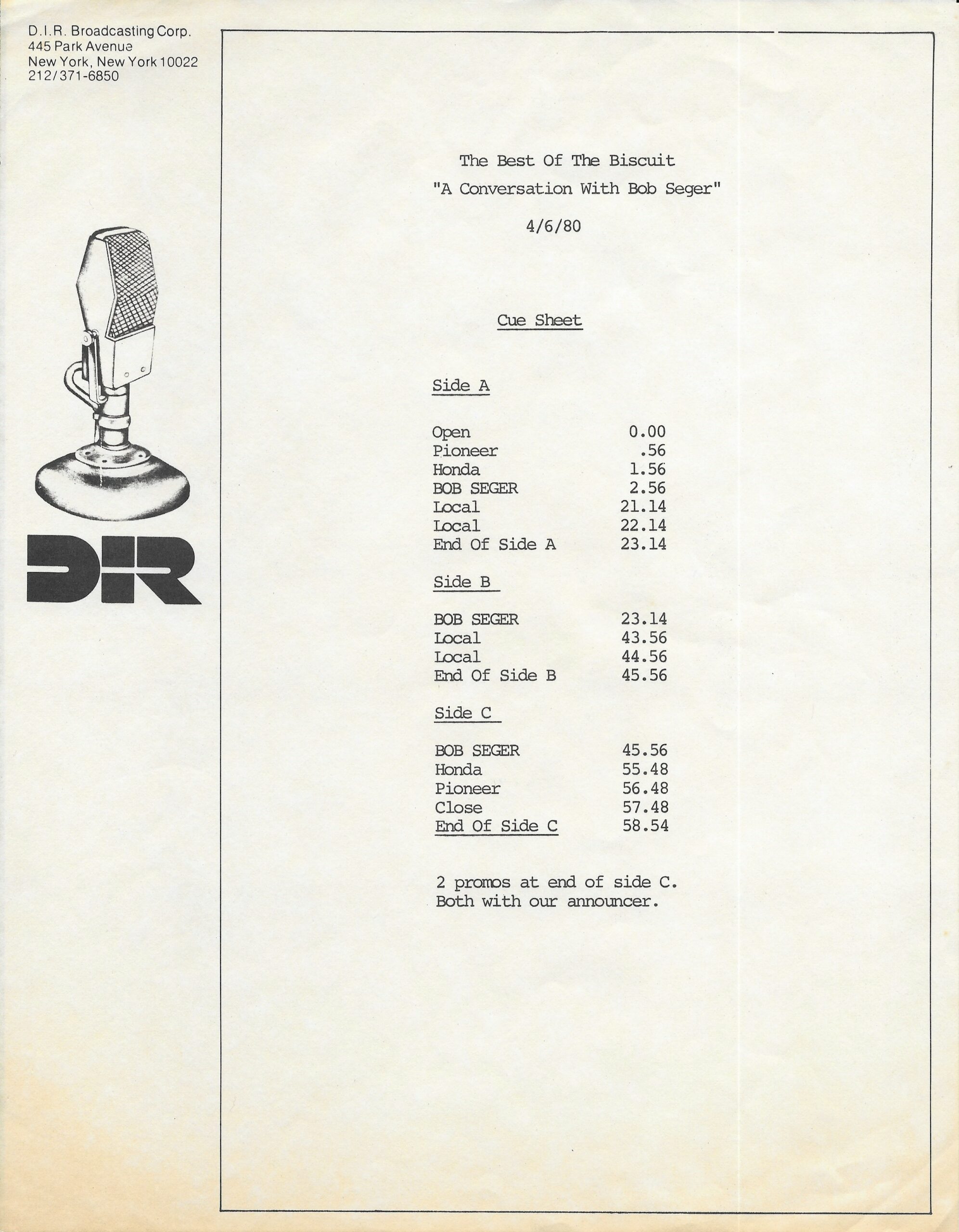 Another Biscuit “conversation” release with Host Dave Herman. Here, Herman presents an interview with Bob Seger regarding his career and his latest release (at that time) AGAINST THE WIND. Unlike most Biscuit shows, this is not a live concert recording. As noted during the broadcast, the interview segments were originally recorded in July of 1979. Contains original commercial blocks and DJ introductions by Herman. Side D is blank.