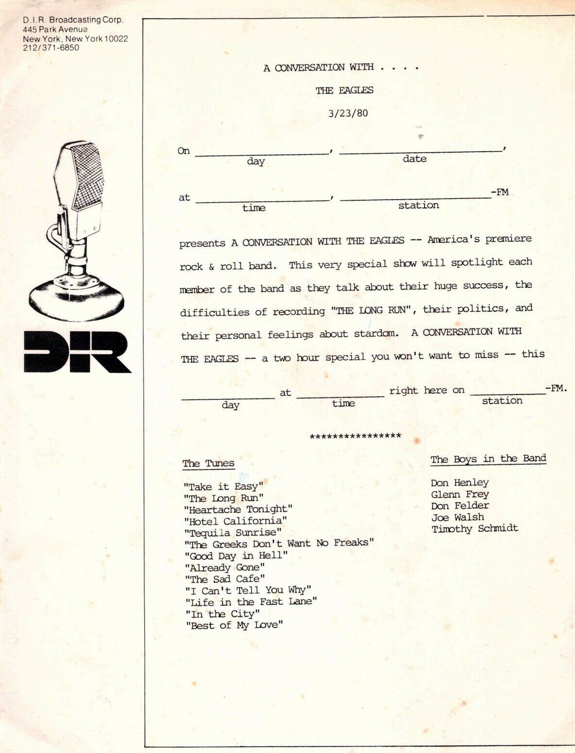 The folks at King Biscuit and nationally syndicated DJ Dave Herman present an interview with The Eagles regarding their career and their latest release (at that time) EAGLES LIVE. Unlike most Biscuit shows, this is not a live concert recording, rather, it’s an “intimate” discussion featuring Don Felder, Don Henley, Glenn Frey, Joe Walsh and Timothy B. Schmit. All five members of the band are interviewed by Herman. Contains original commercial blocks and DJ introductions by Herman.