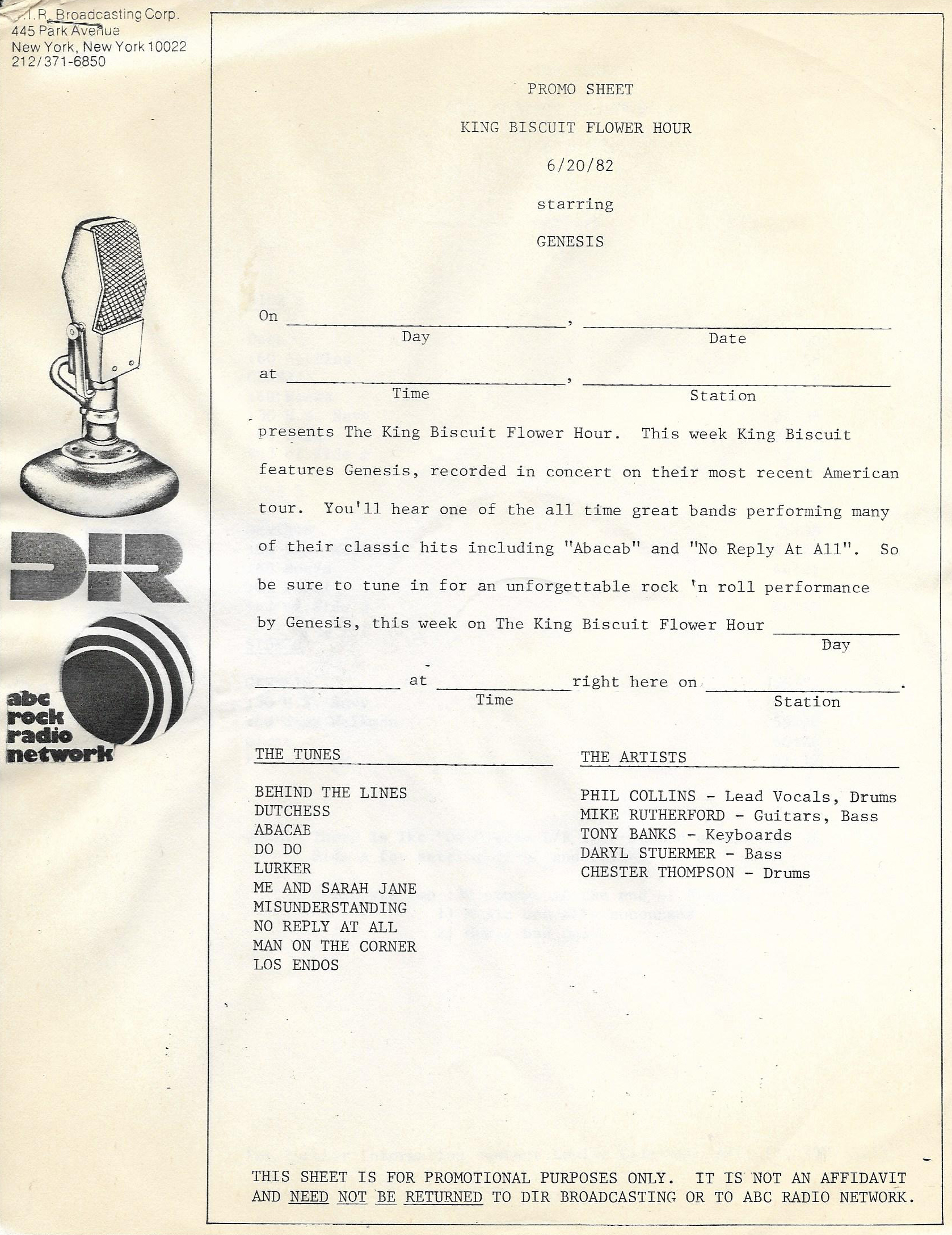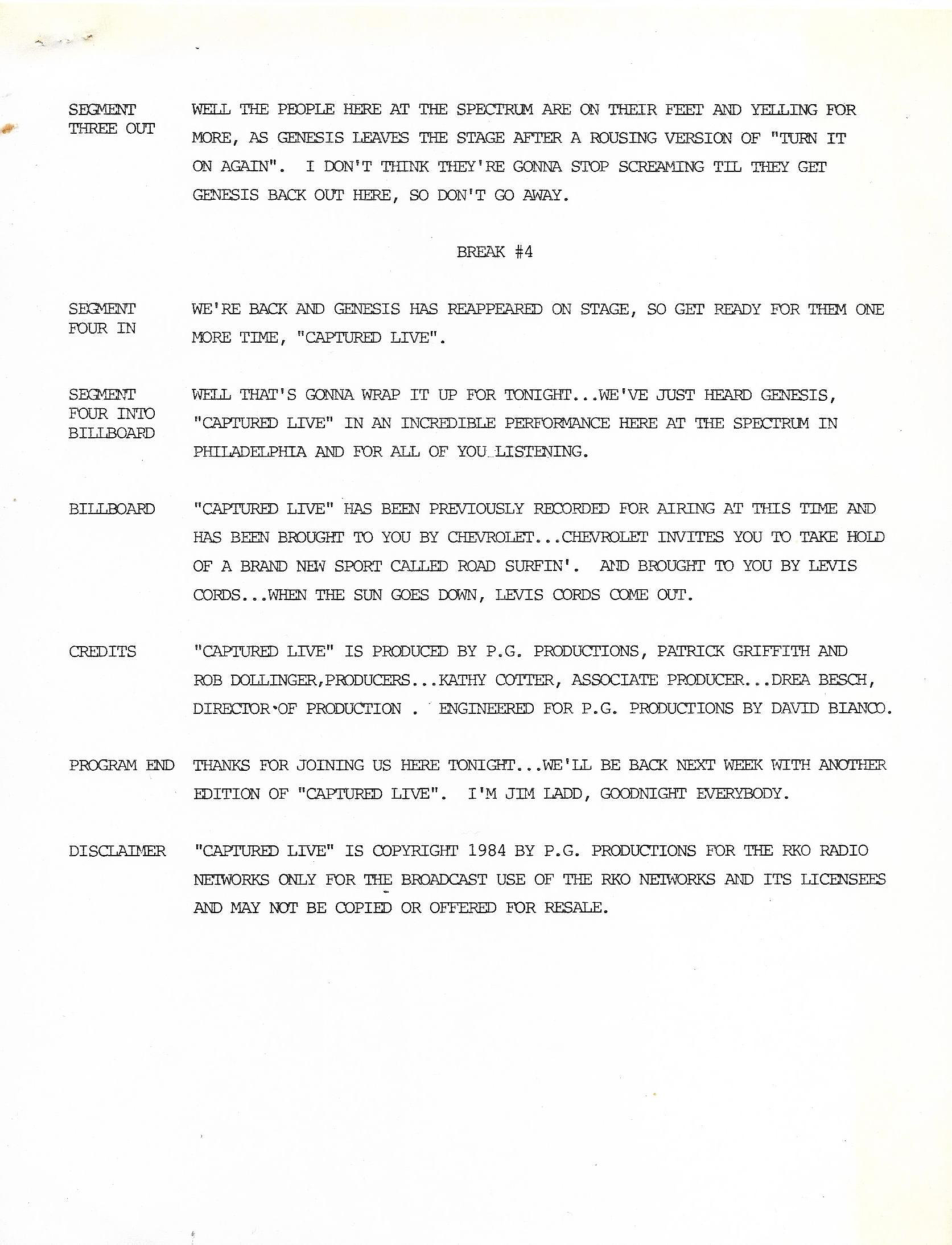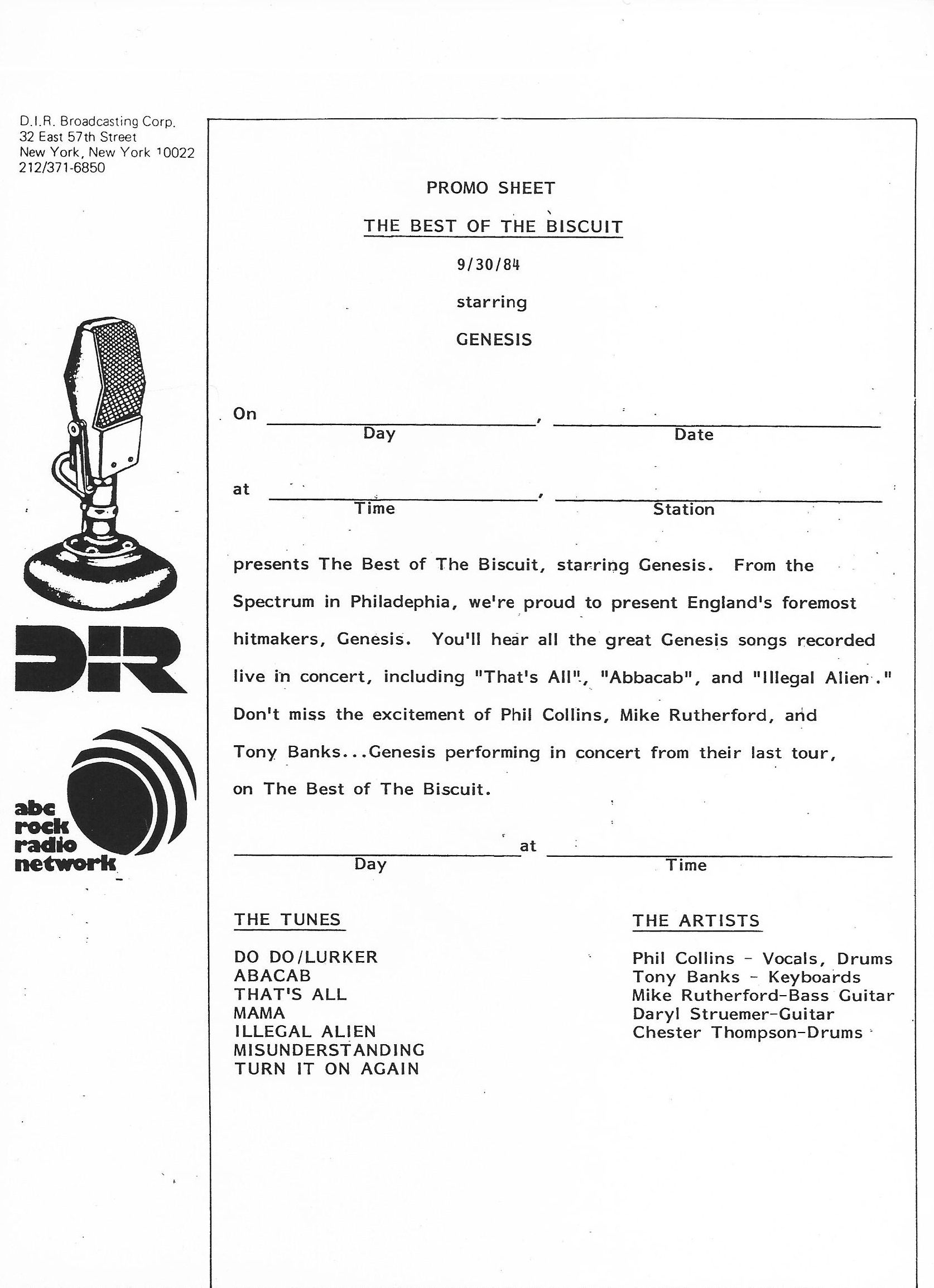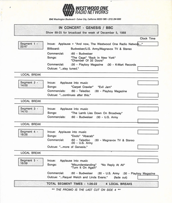And as an aside, you may have noticed on the previous pages (and on this page as well) that I sometimes use the narrative descriptions from Discogs in my descriptions here. That is because in almost every case, I was the original submitter of the items on Discogs. Especially the Genesis and Phil Collins material. When I joined Discogs, most of these radio transcription shows did not exist on the site. Thus, it fell to me to add them. So I am not plagiarizing when I utilize those notes, I am simply copying what I originally provided to that site. If you have any questions about the shows listed here, please reach out to me via the Contact Me page.