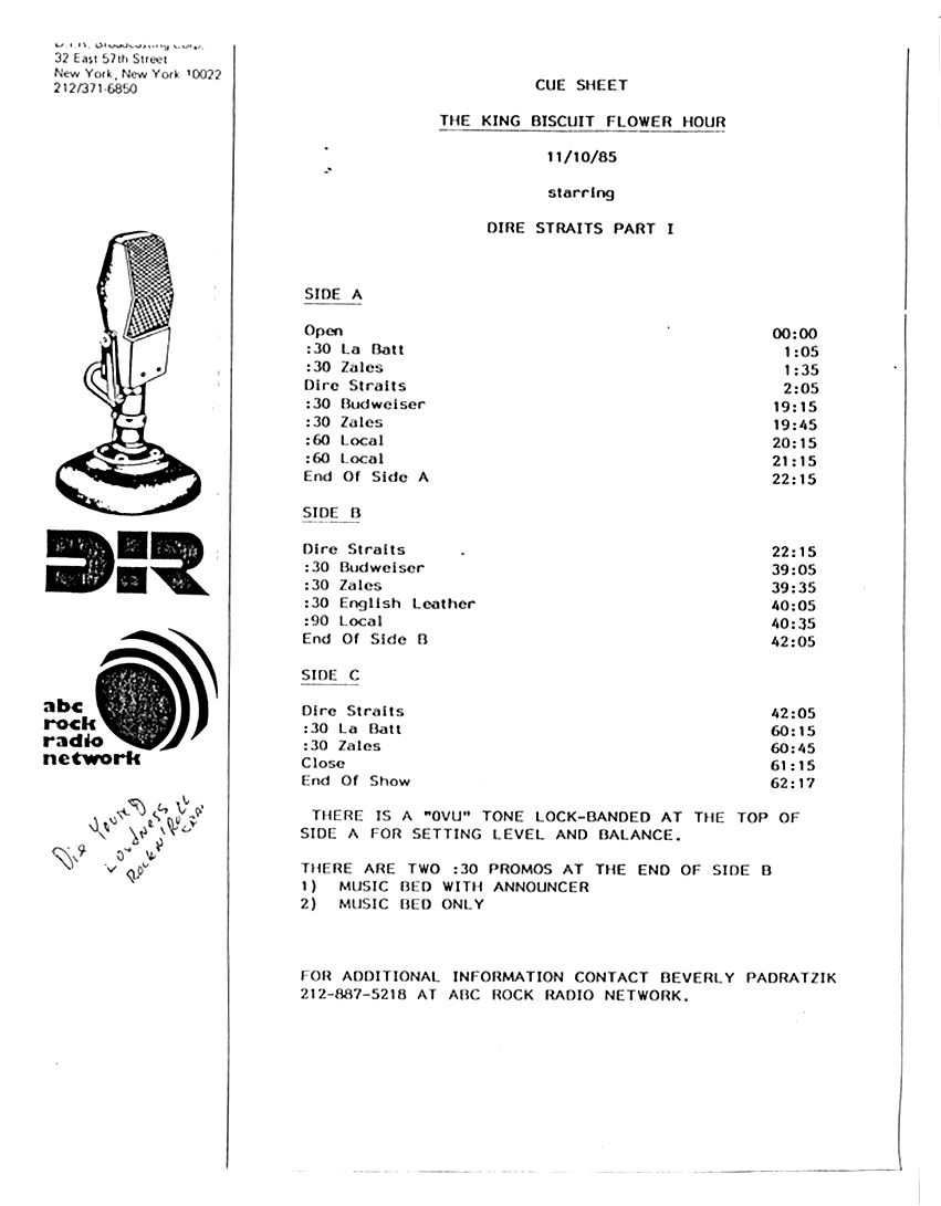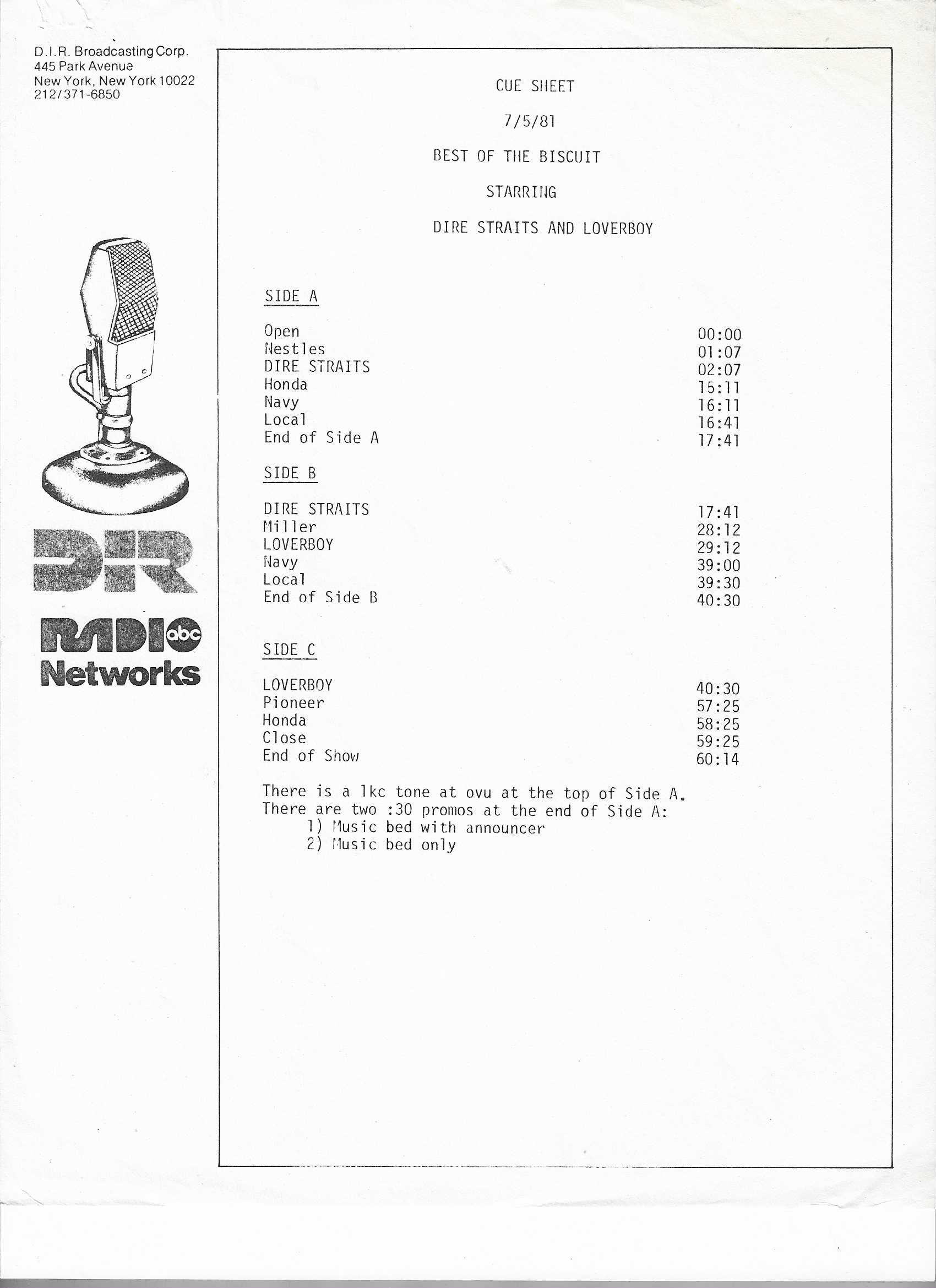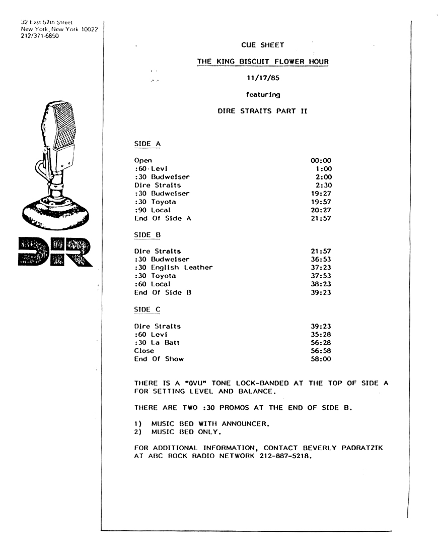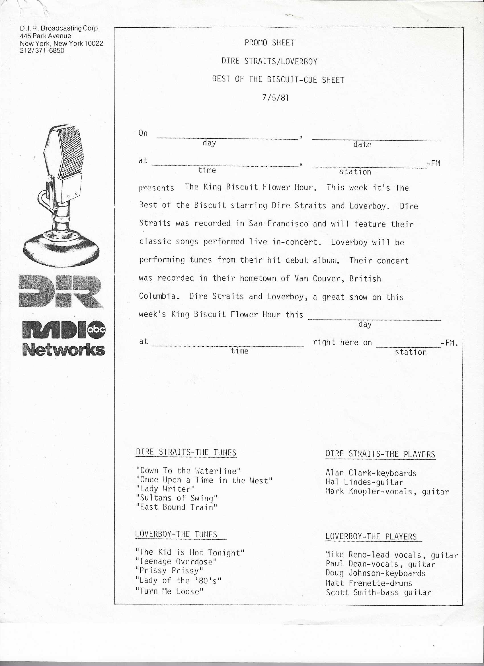 A double-bill King Biscuit show with segments previously aired on radio stations across the U.S. The venues for each performance are not specifically mentioned by regular contributor and host Bill Minkin. He does, however, mention the cities for each show. A little investigating reveals that the Dire Straits portion was recorded at The Old Waldorf during their first tour of the States. The Loverboy segment was most likely recorded at the Vancouver Coliseum (later renamed the Pacific Coliseum) on 3 August 1980. Contains original commercial blocks and two sections of extended silence for local station announcements.