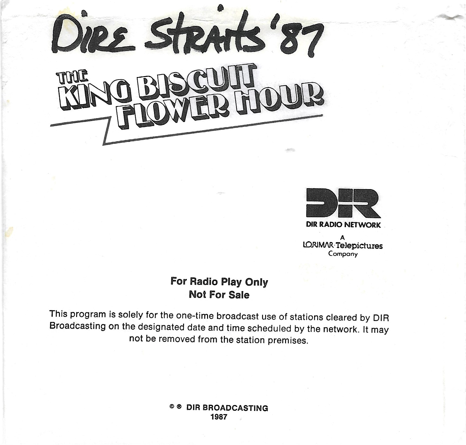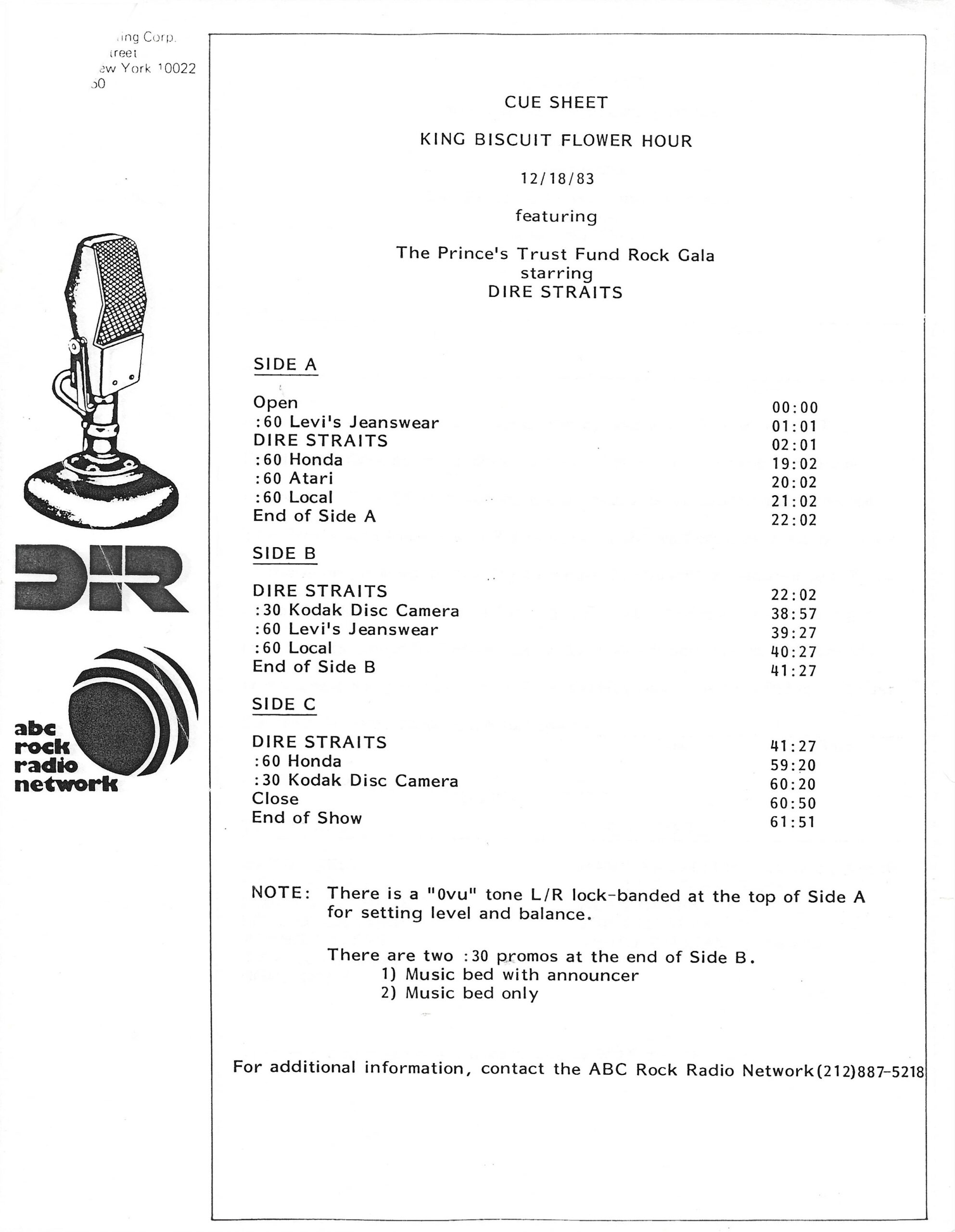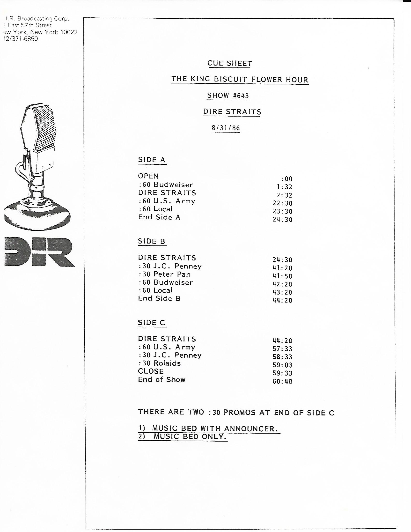 A double-bill King Biscuit show with segments previously aired on radio stations across the U.S. The venues for each performance are not specifically mentioned by regular contributor and host Bill Minkin. He does, however, mention the cities for each show. A little investigating reveals that the Dire Straits portion was recorded at The Old Waldorf during their first tour of the States. The Loverboy segment was most likely recorded at the Vancouver Coliseum (later renamed the Pacific Coliseum) on 3 August 1980. Contains original commercial blocks and two sections of extended silence for local station announcements.