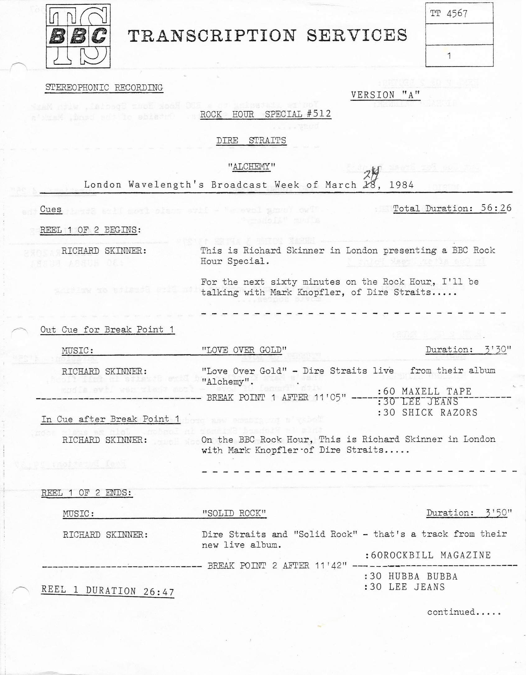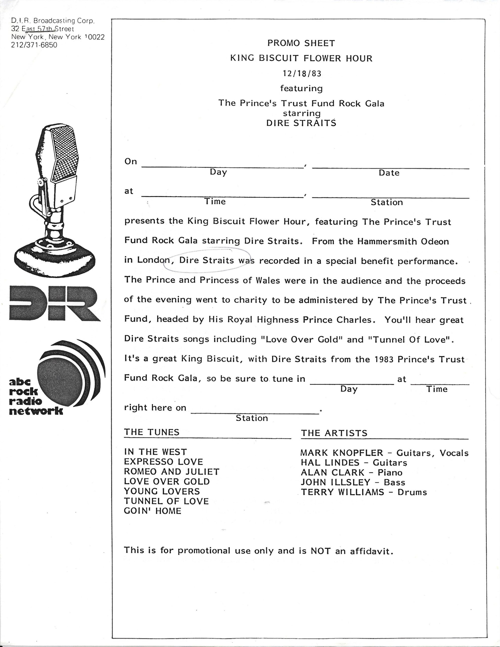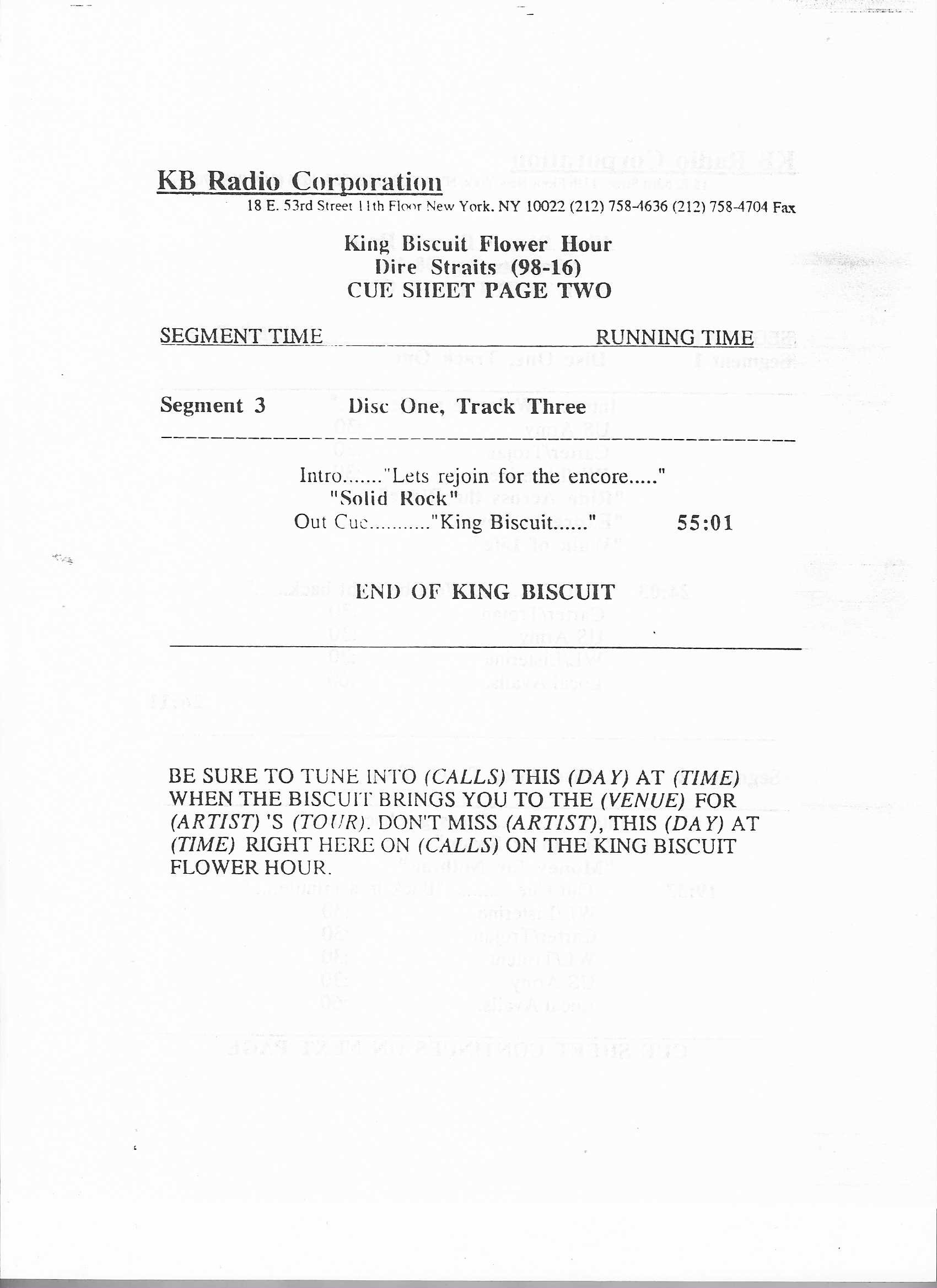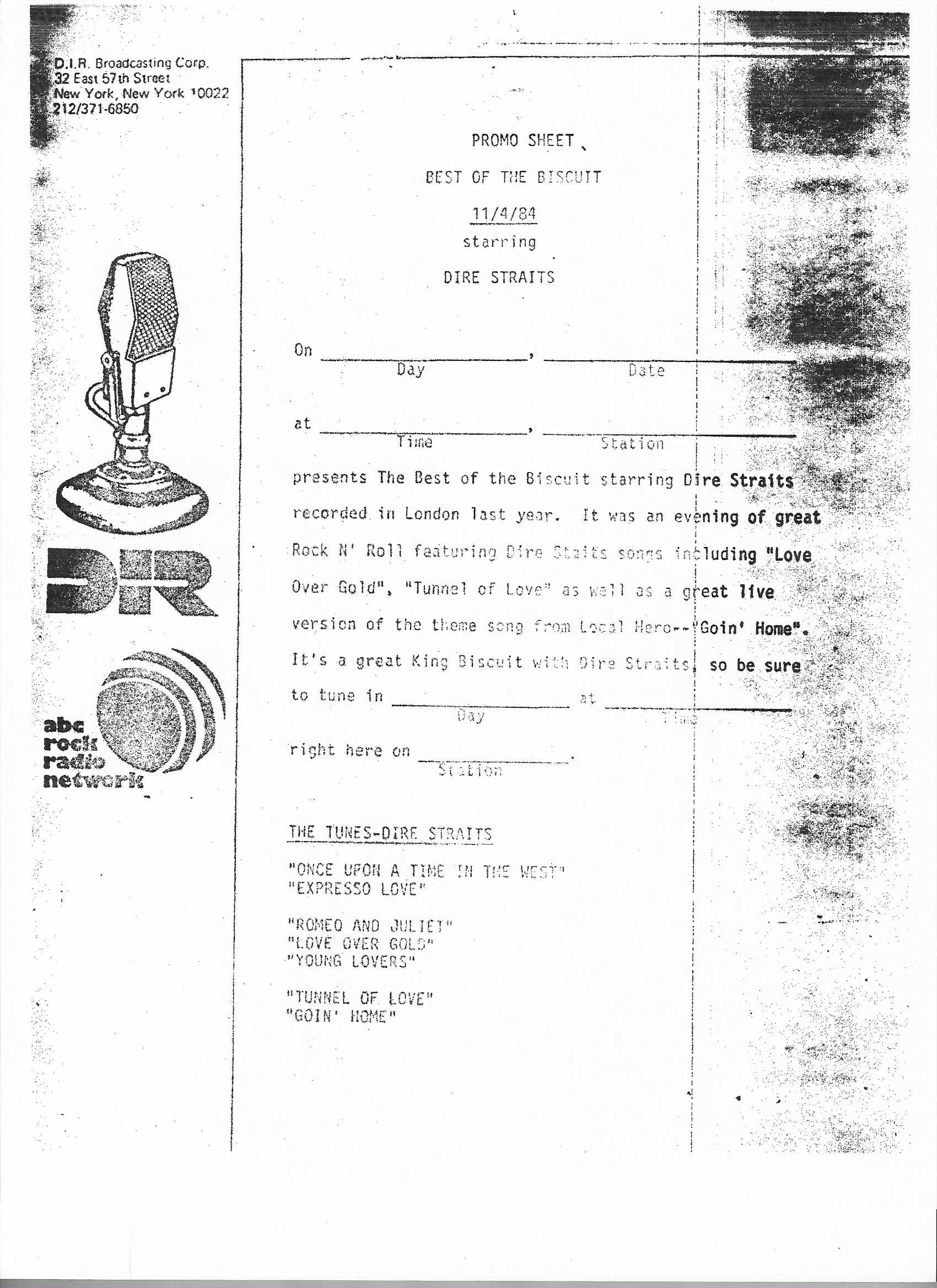A double-bill King Biscuit show with segments previously aired on radio stations across the U.S. The venues for each performance are not specifically mentioned by regular contributor and host Bill Minkin. He does, however, mention the cities for each show. A little investigating reveals that the Dire Straits portion was recorded at The Old Waldorf during their first tour of the States. The Loverboy segment was most likely recorded at the Vancouver Coliseum (later renamed the Pacific Coliseum) on 3 August 1980. Contains original commercial blocks and two sections of extended silence for local station announcements.