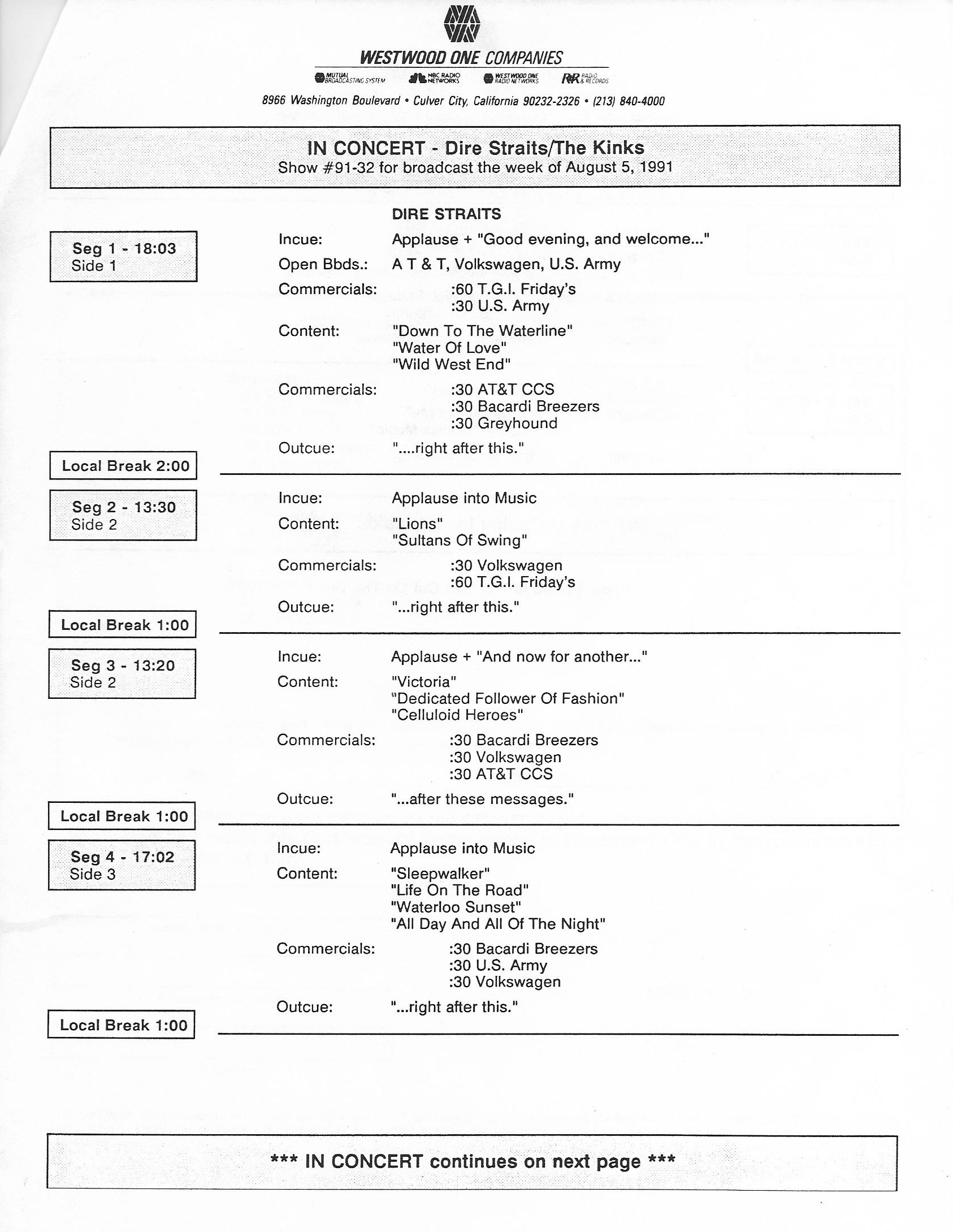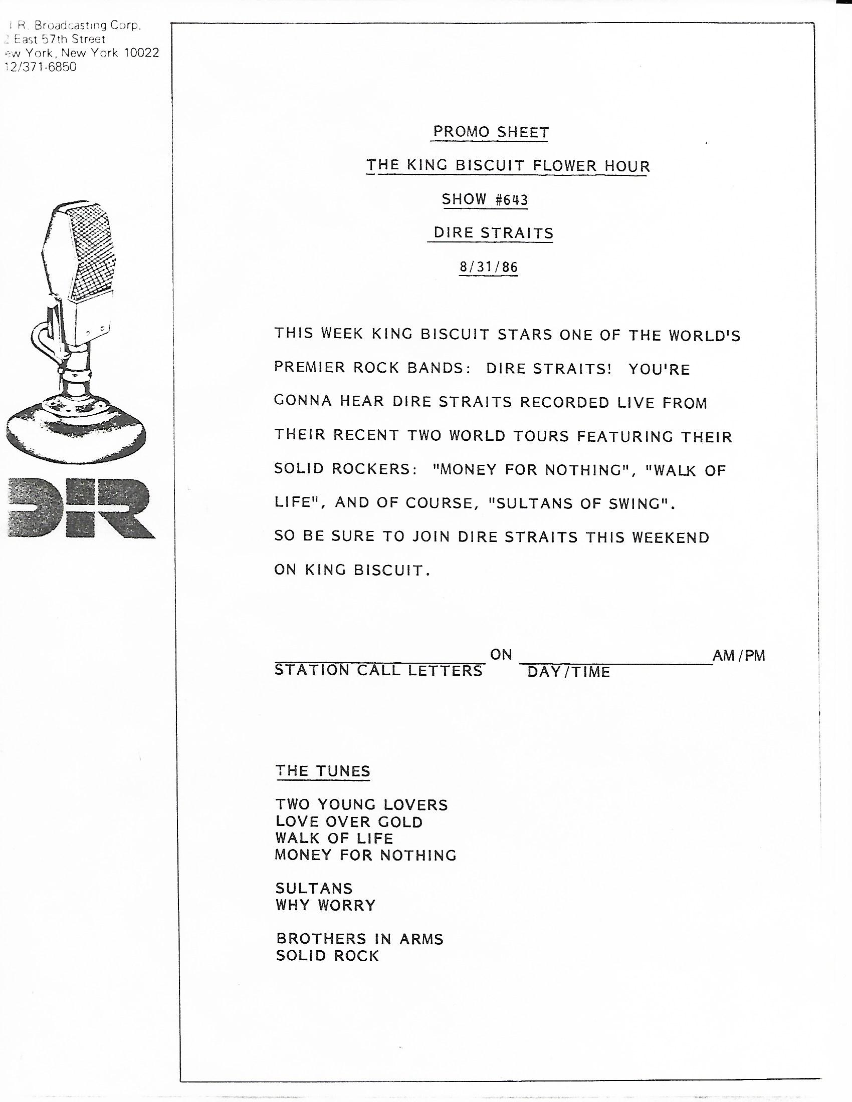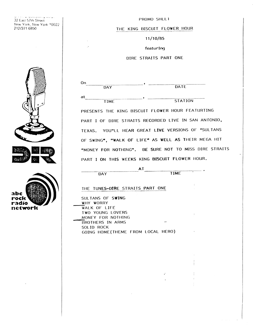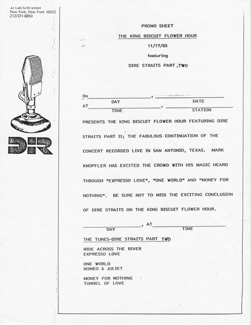 Repackaging of a concert from the Brothers In Arms tour. Contains original commercial blocks and DJ intros by Ed Sciaky (pronounced Shockey).