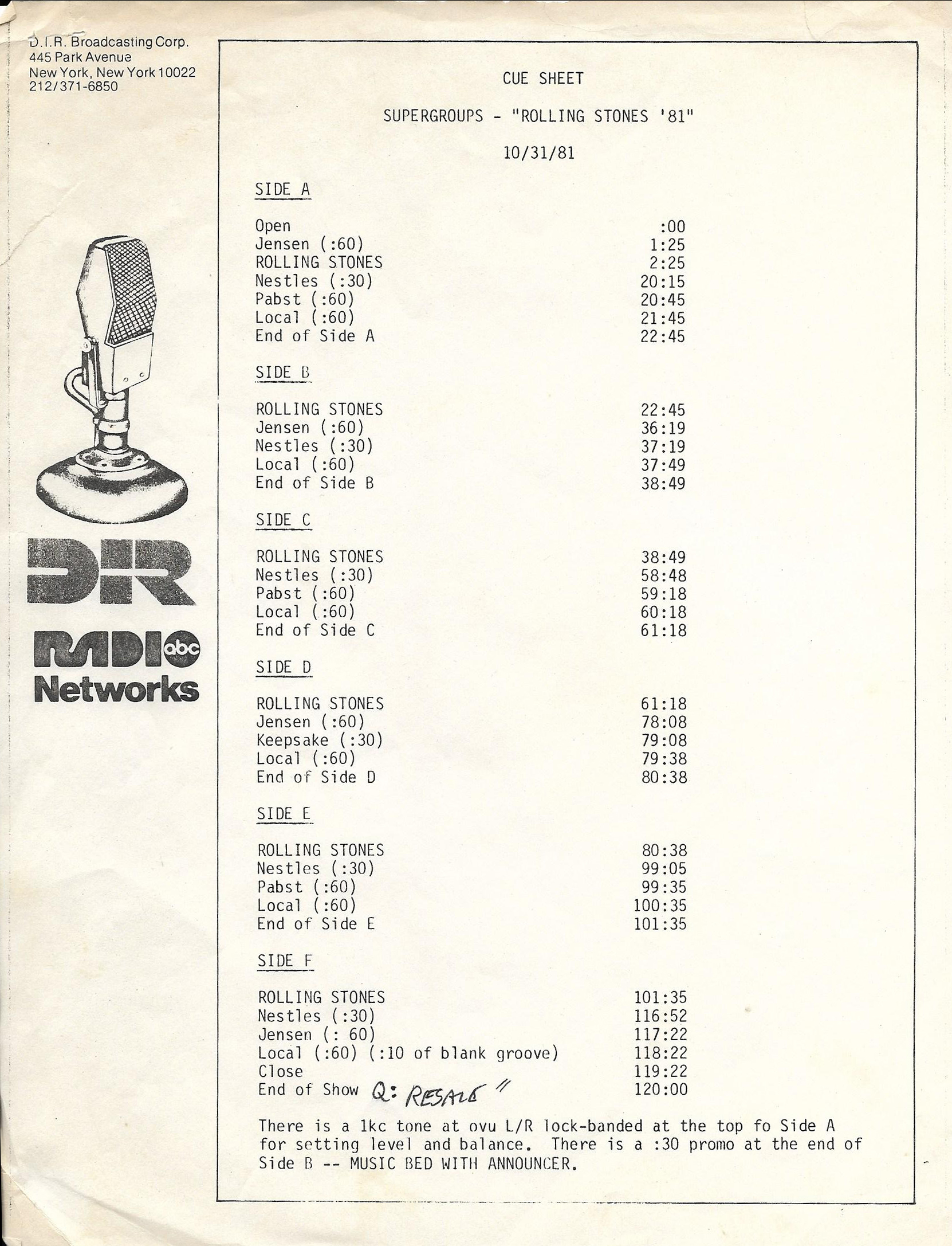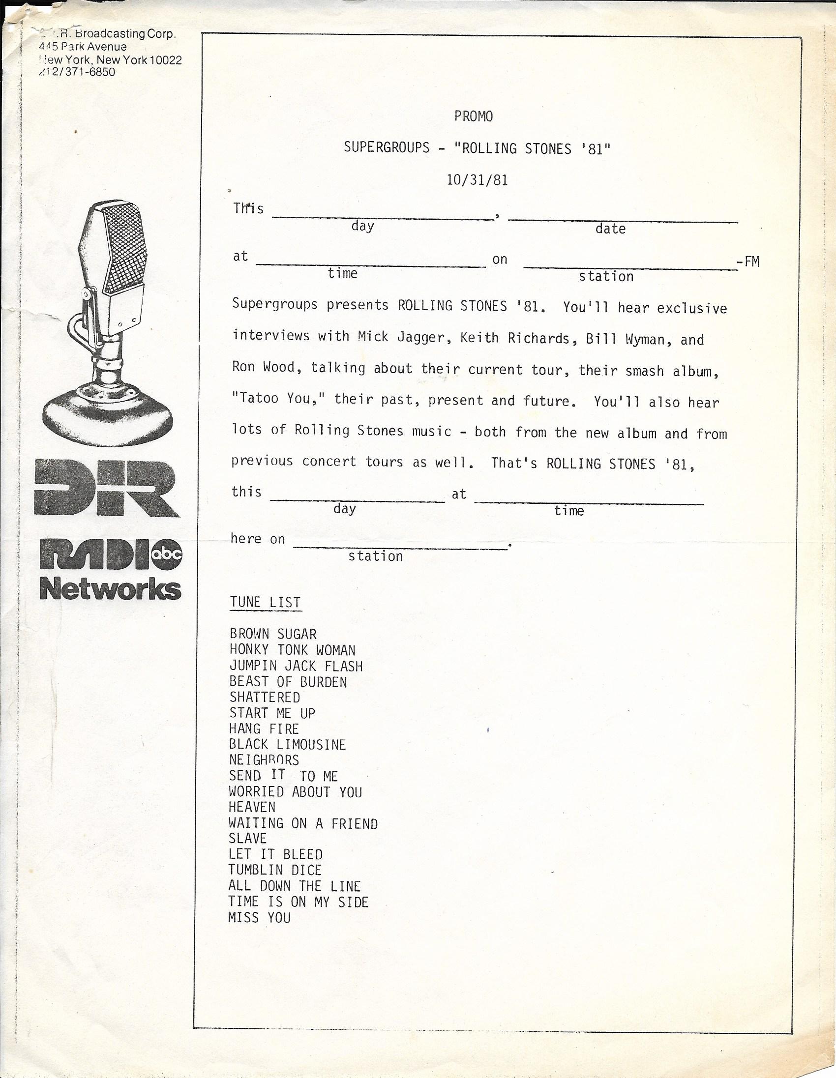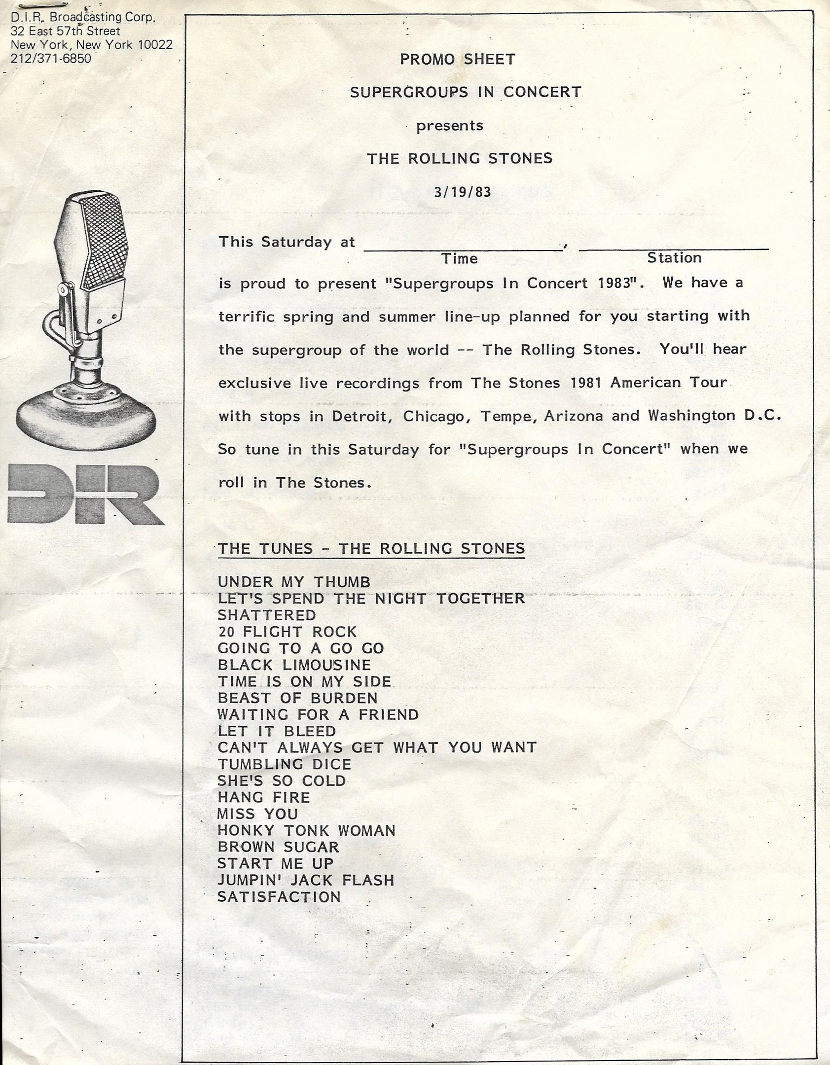 This radio show is a mix of live cuts, interview segments and studio tracks featuring The Rolling Stones, who went out on the road in September of 1981 in support of the album TATTOO YOU. (This was to be the last tour of the United States the Stones would do until 1989.) This set was therefore released to U.S. radio stations to promote the tour. D.I.R., who produced the show in association with ABC Radio Networks, are the people behind King Biscuit. Most of the live tracks on this set were not recorded during the 1981 tour, however, these tracks were culled from previous shows recorded by D.I.R. Several of the concerts throughout the tour were captured and selected songs were released on the 1982 live album STILL LIFE (AMERICAN CONCERT 1981).