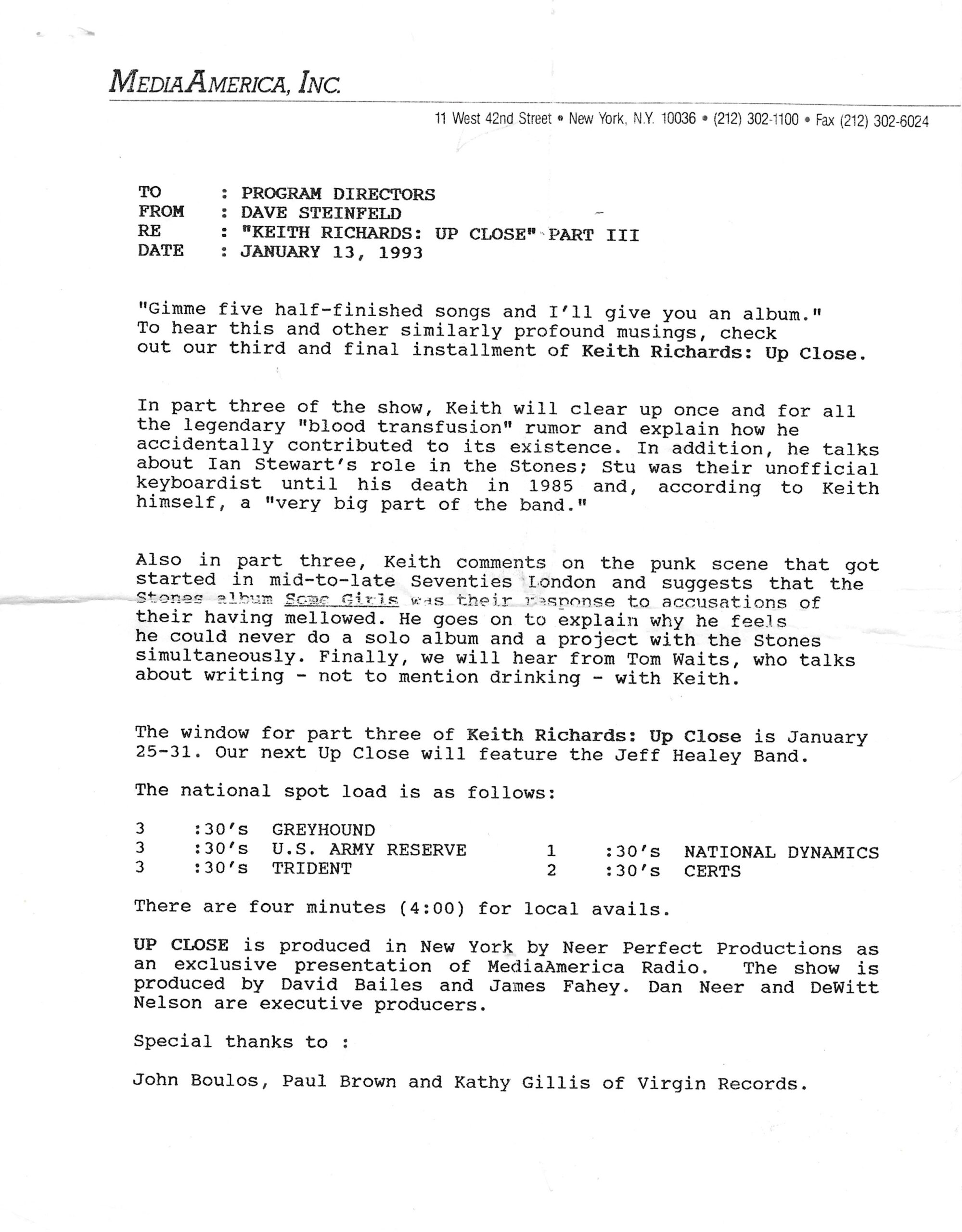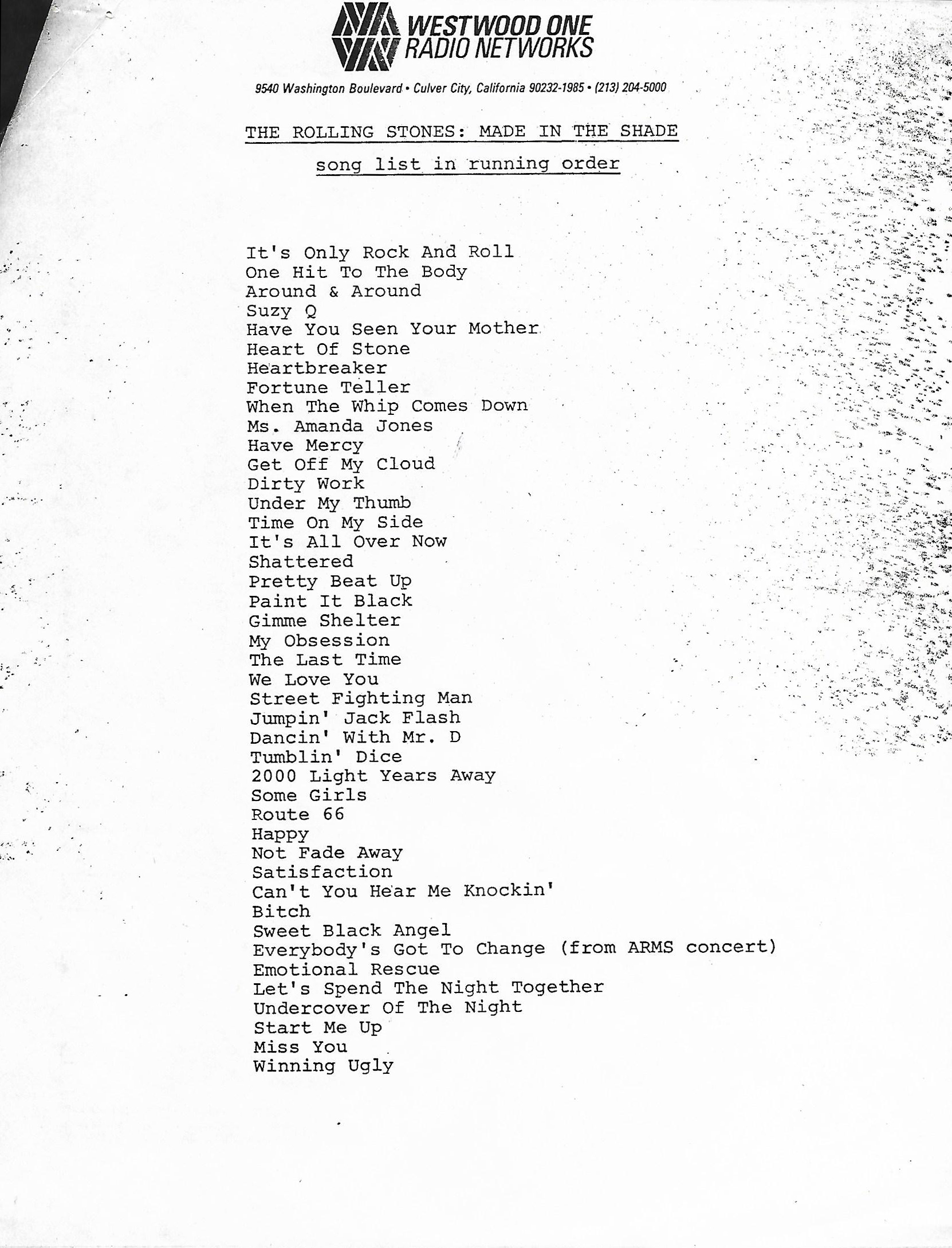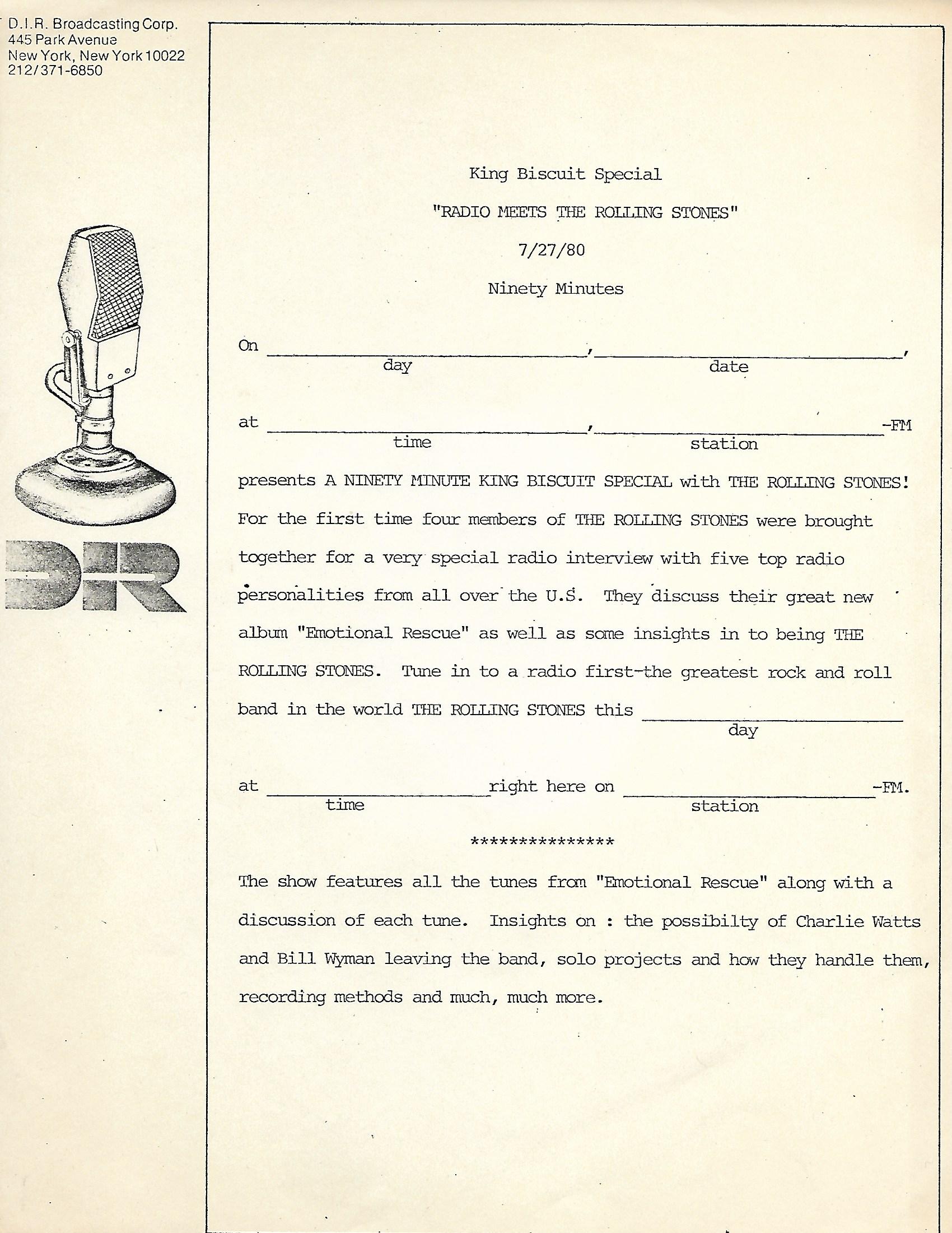 This radio show is a mix of live cuts, interview segments and studio tracks featuring The Rolling Stones, who went out on the road in September of 1981 in support of the album TATTOO YOU. (This was to be the last tour of the United States the Stones would do until 1989.) This set was therefore released to U.S. radio stations to promote the tour. D.I.R., who produced the show in association with ABC Radio Networks, are the people behind King Biscuit. Most of the live tracks on this set were not recorded during the 1981 tour, however, these tracks were culled from previous shows recorded by D.I.R. Several of the concerts throughout the tour were captured and selected songs were released on the 1982 live album STILL LIFE (AMERICAN CONCERT 1981).