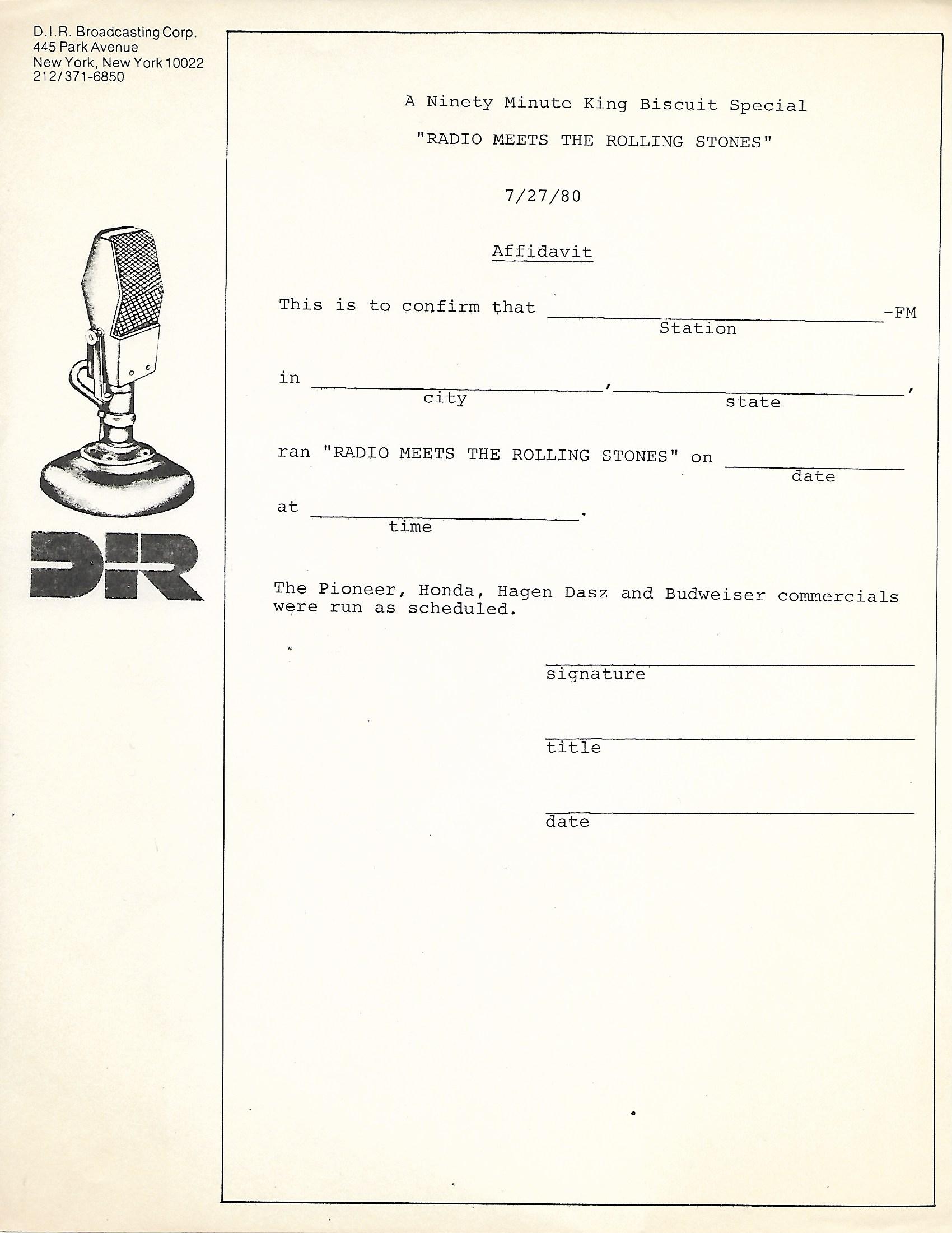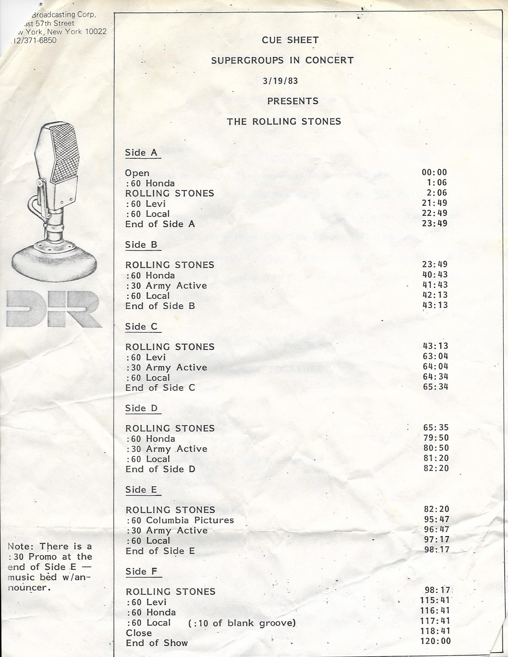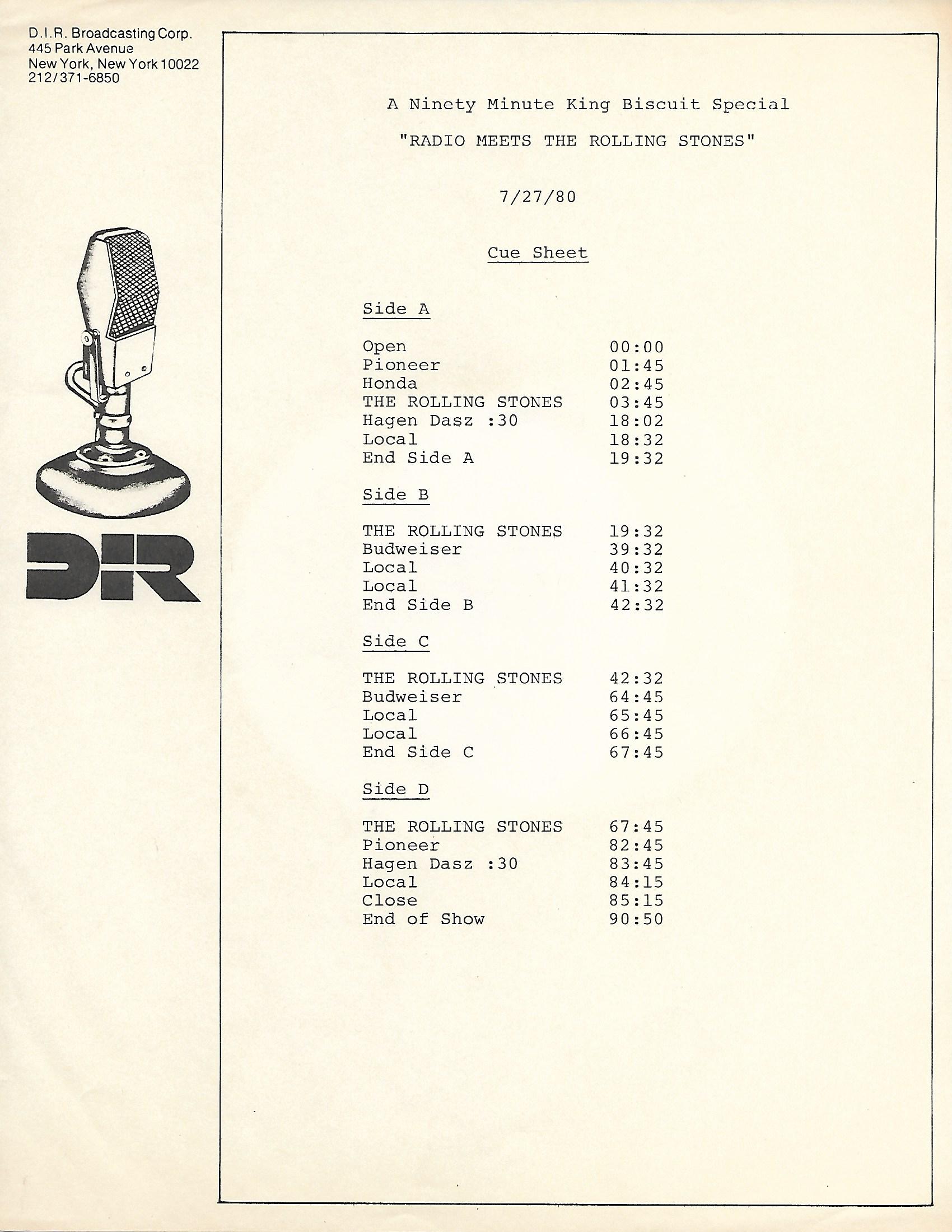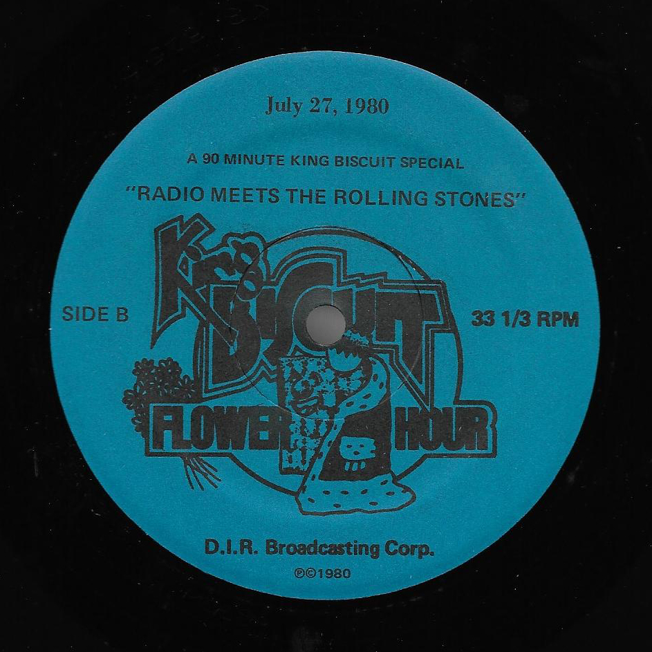 New York radio disc jockey Scott Muni leads a “round table” discussion with several well known disc jockeys from across the United States and the members of The Rolling Stones for a King Biscuit Flower Hour 90 minute radio special. As with the above listed A CONVERSATION WITH BOB SEGER show, this is also not a live concert recording. The disc jockeys present are Mark Parenteau from WBCN in Boston, (who was later sentenced to three years in federal prison for sexual child abuse, and who passed away in 2016), Norm Winer from WXRT in Chicago (who quit being a DJ in 2016 after 37 years at WXRT), Tempi Lindsey from KTXQ in Dallas, Jack Snyder from KMET in Los Angeles and Charlie Kendall from WMMR in Philadelphia (who later appeared as a regular host of Westwood One’s Superstar Concert Series). The entire group met at the WNEW studios in New York, where they all sat around a table drinking, smoking, telling stories and asking / answering questions from the various DJs. Some questions from “fans” are also presented, but no call-in audience members are present. One can actually hear cigarette lighters clicking, beer cans popping open and being poured, and glasses clinking throughout the show. Tracks from the most recent Stones album at the time, EMOTIONAL RESCUE, were also featured during the show. Original commercial blocks are also included.