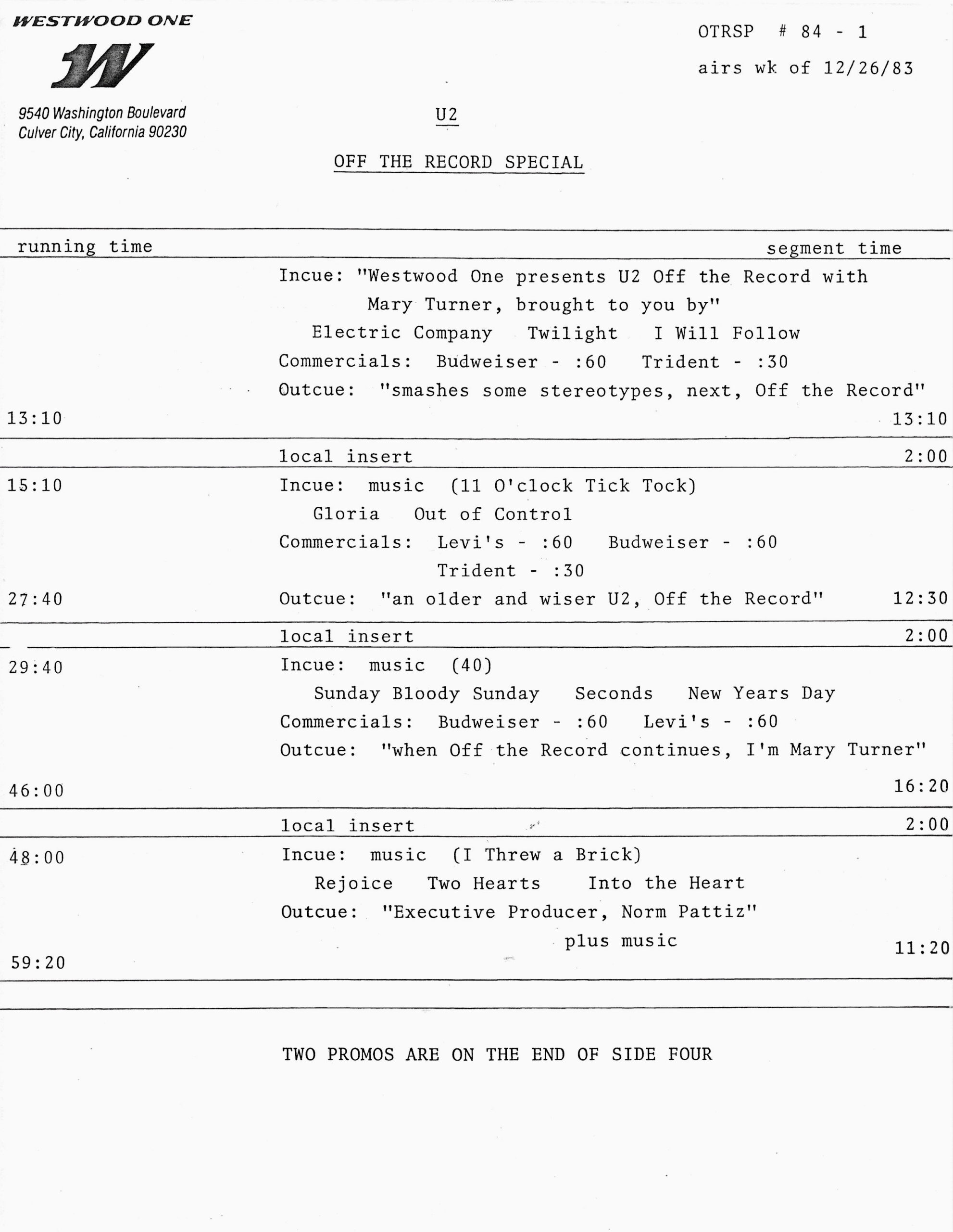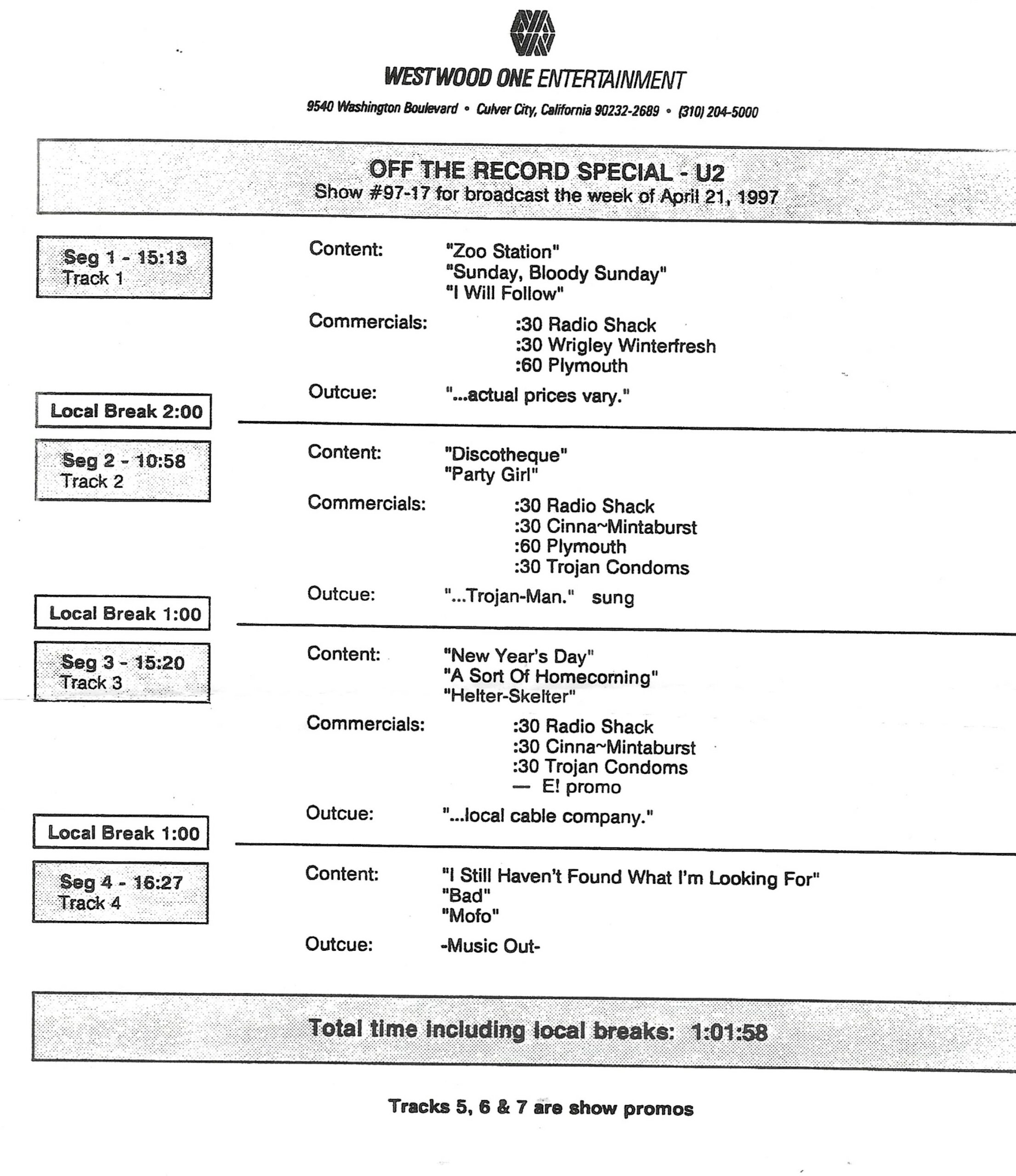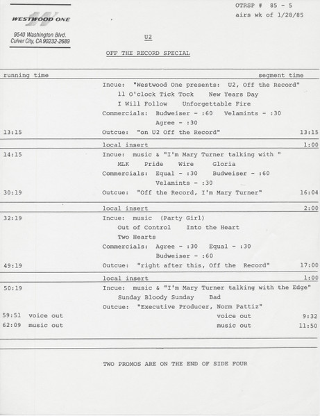 Another Westwood One Radio Networks Off The Record show featuring U2. This one is different from most in that the host is not Mary Turner. The host for this one only identifies herself as “Tawn.” For this outing, she plays interview clips from Bono, The Edge and Adam Clayton, along with studio and live tracks. The boys discuss a bit of their history, playing live, and their latest release (at that time) POP.