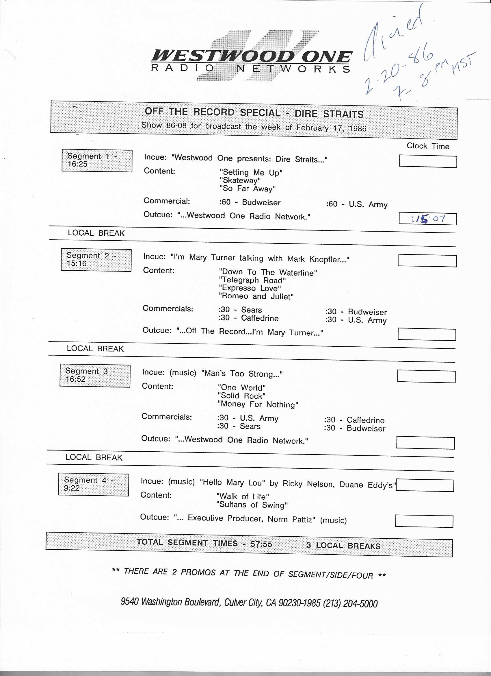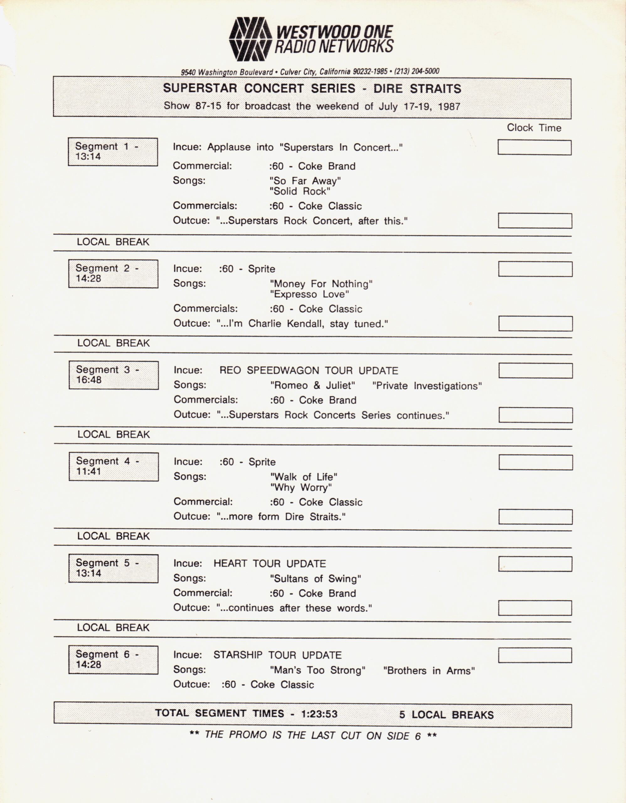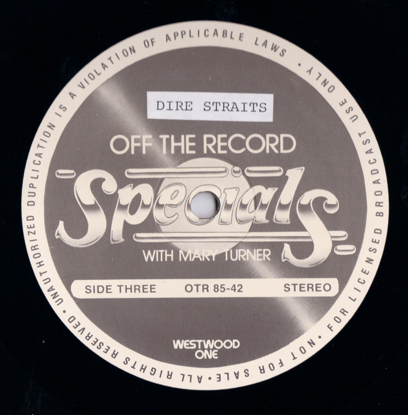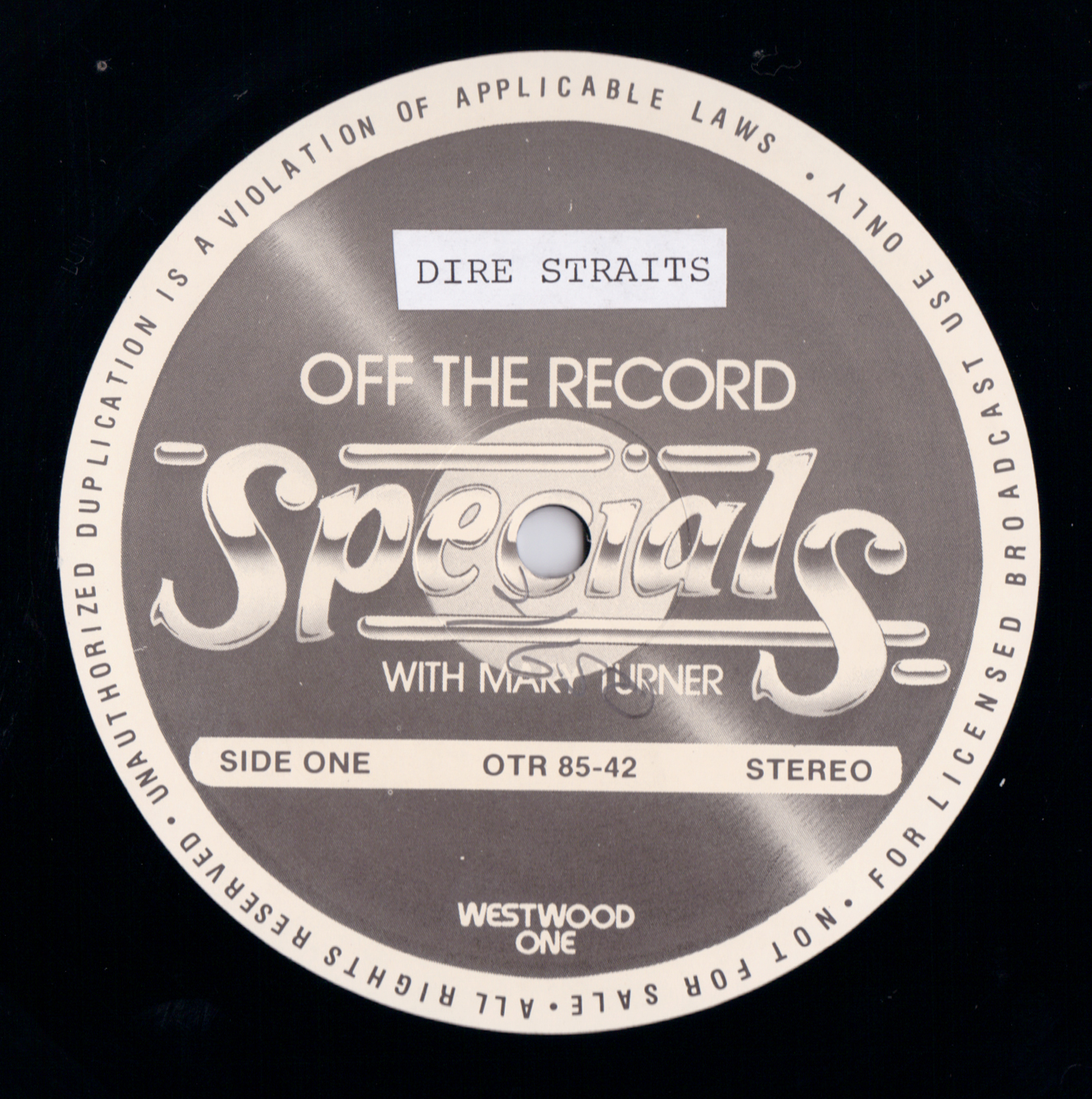 Westwood One two-disc (but not two-part) show featuring classic songs by Dire Straits and Mark Knopfler. The show features performances from two “first tours;” one from the Straits in 1978 and one from Knopfler in 1996. Sandwiched in between is a performance from 1985’s Brothers In Arms tour. Contains commercial blocks and DJ introductions by J.J. Jackson.