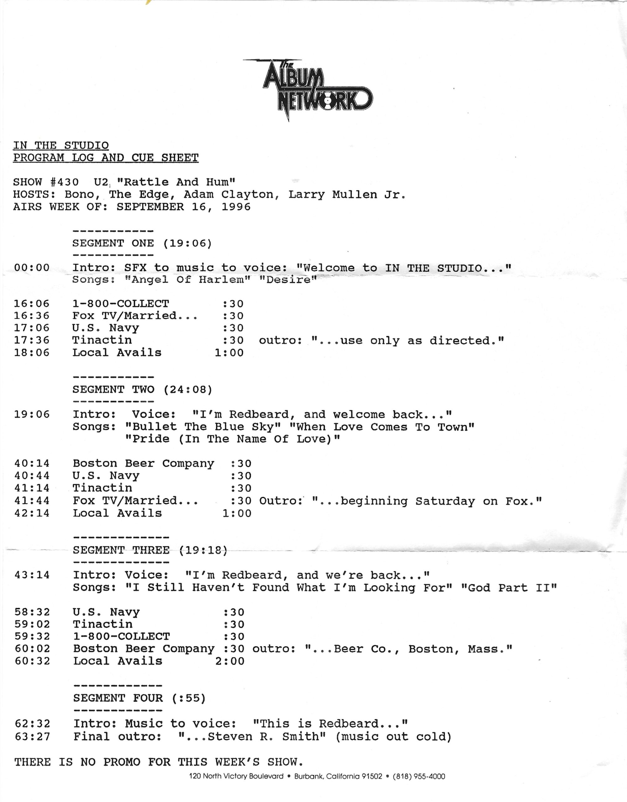 Another In The Studio episode featuring an interview with Bono, The Edge, Adam Clayton and Larry Mullen Jr. and nationally syndicated DJ / host Redbeard. For this outing, the boys discuss the making of the album RATTLE AND HUM.