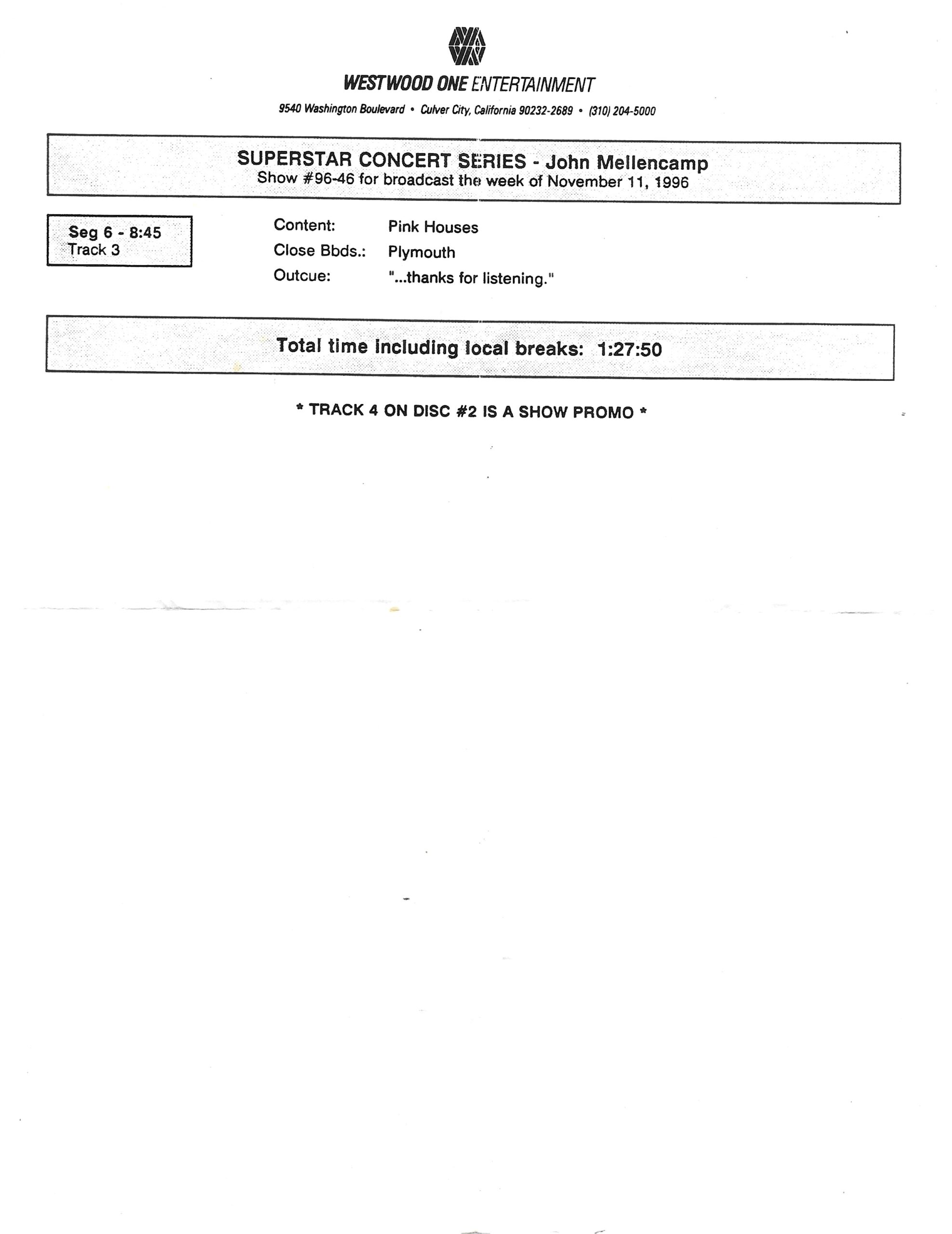 Another Westwood One two-disc (but not two-part) show featuring classic songs by John Mellencamp. Broadcast to coincide with his latest release (at that time) MR. HAPPY GO LUCKY, this is a re-broadcast of a concert previously recorded in 1994, and is hosted by J.J. Jackson. The set includes multiple classic Mellencamp tracks.