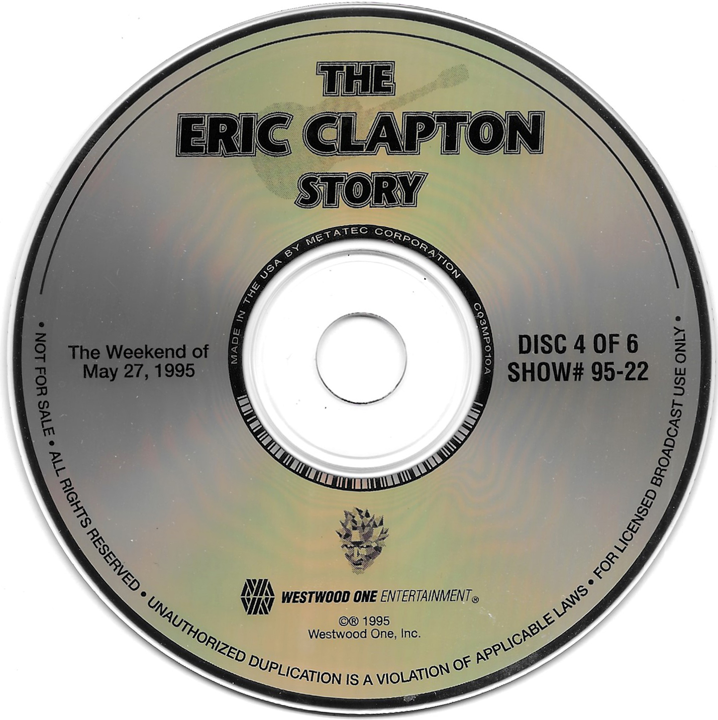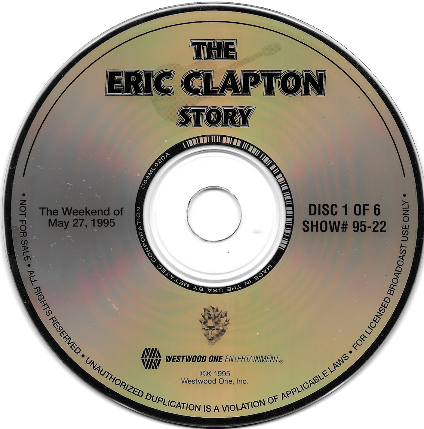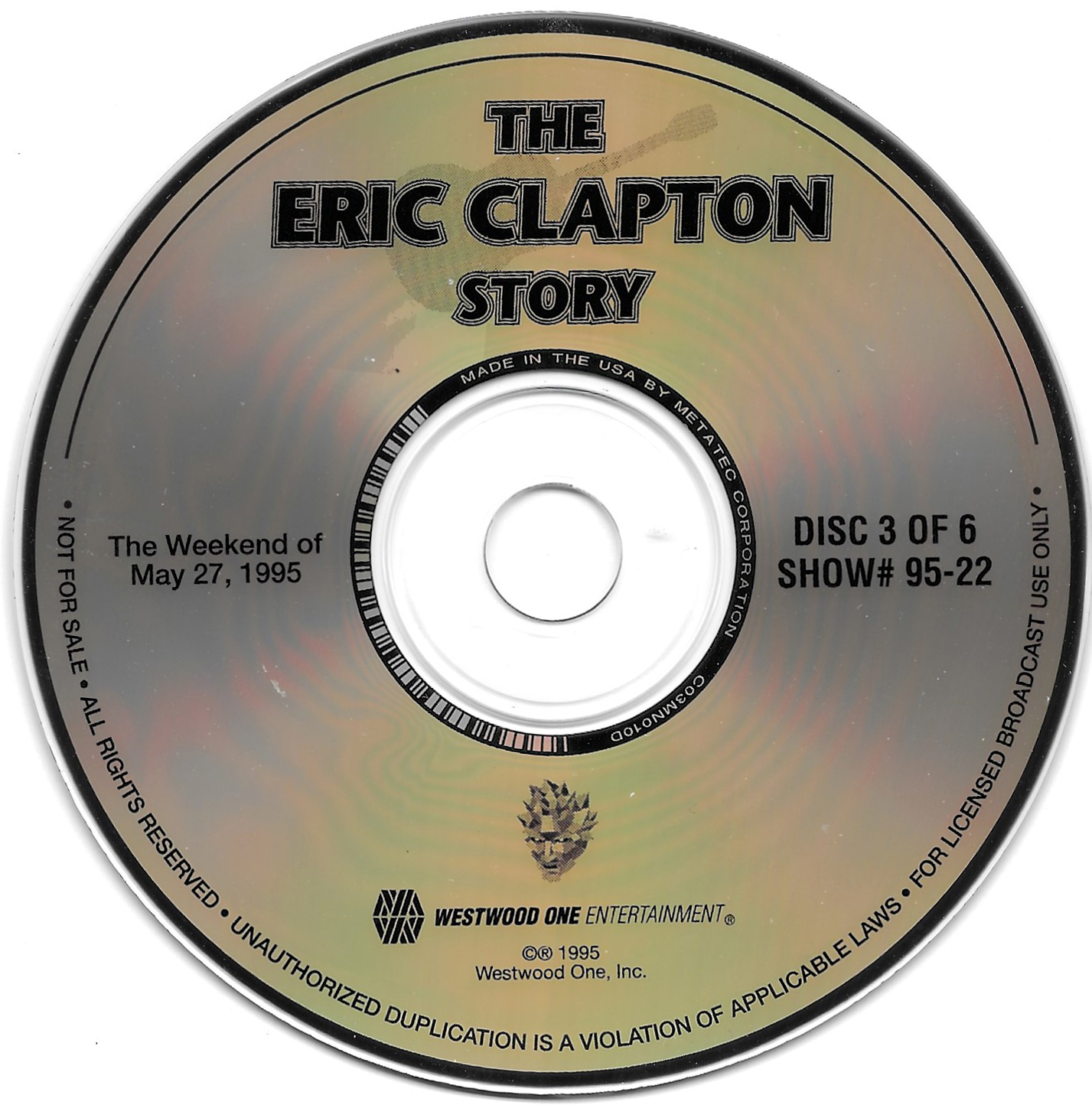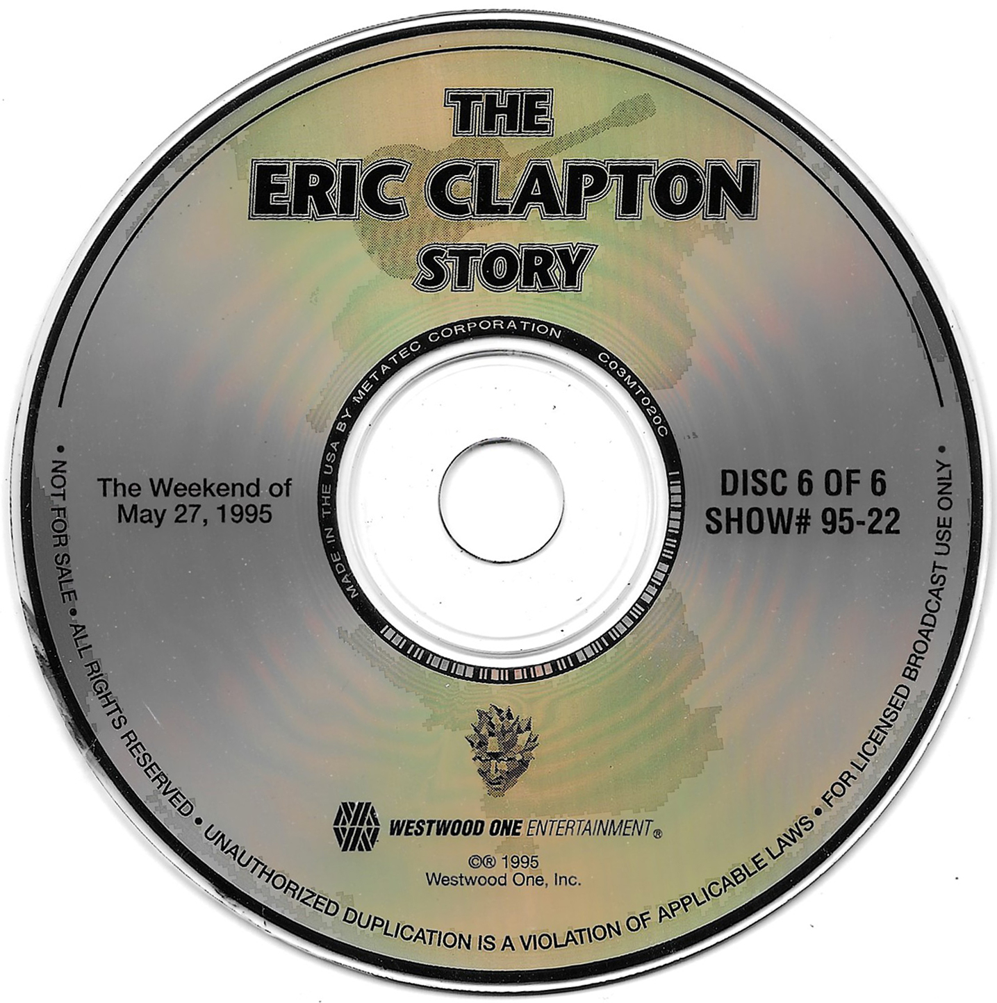 Here is another six-disc, six-hour Eric Clapton retrospective radio special. This time, Westwood One Host Richard Skinner details Clapton’s entire musical career through dozens of interviews, studio tracks and live cuts. Interview segments from Clapton, John Mayall, Jeff Beck, Pete Townshend, George Harrison, Jack Bruce, Ginger Baker, Ronnie Lane, Glyn Johns, Tom Dowd, Phil Collins, Tina Turner, and Elton John are all featured. Contains original commercial blocks and segment intros by Skinner. The title is derived from Skinner’s introduction on each disc, although only The Eric Clapton Story appears on the discs themselves. Each disc came housed in a separate, identical paper sleeve.
