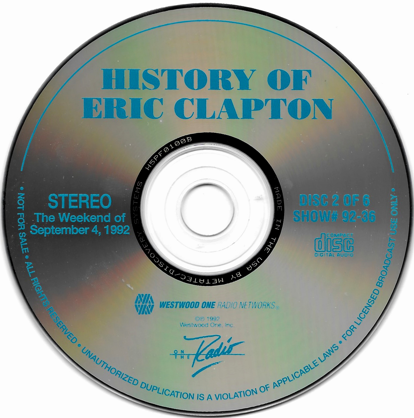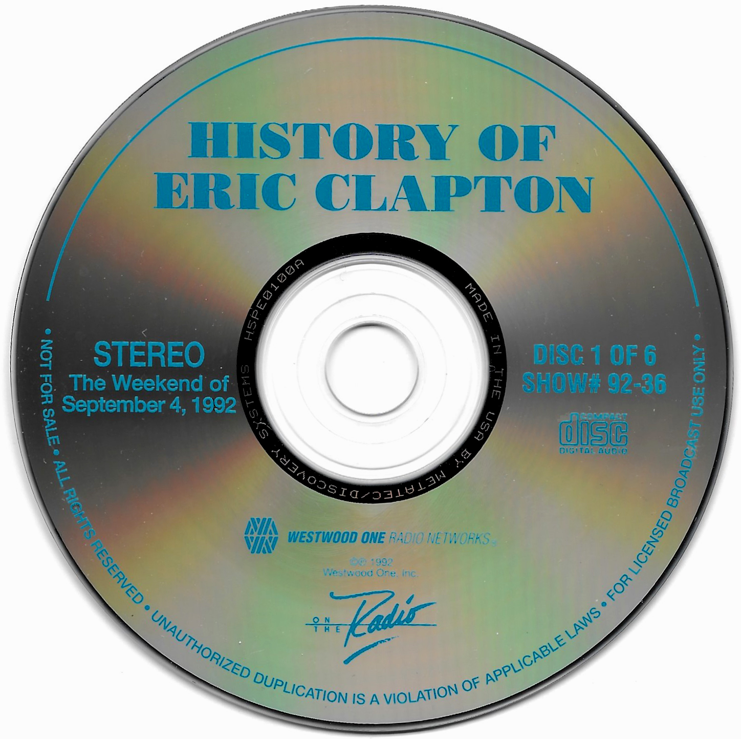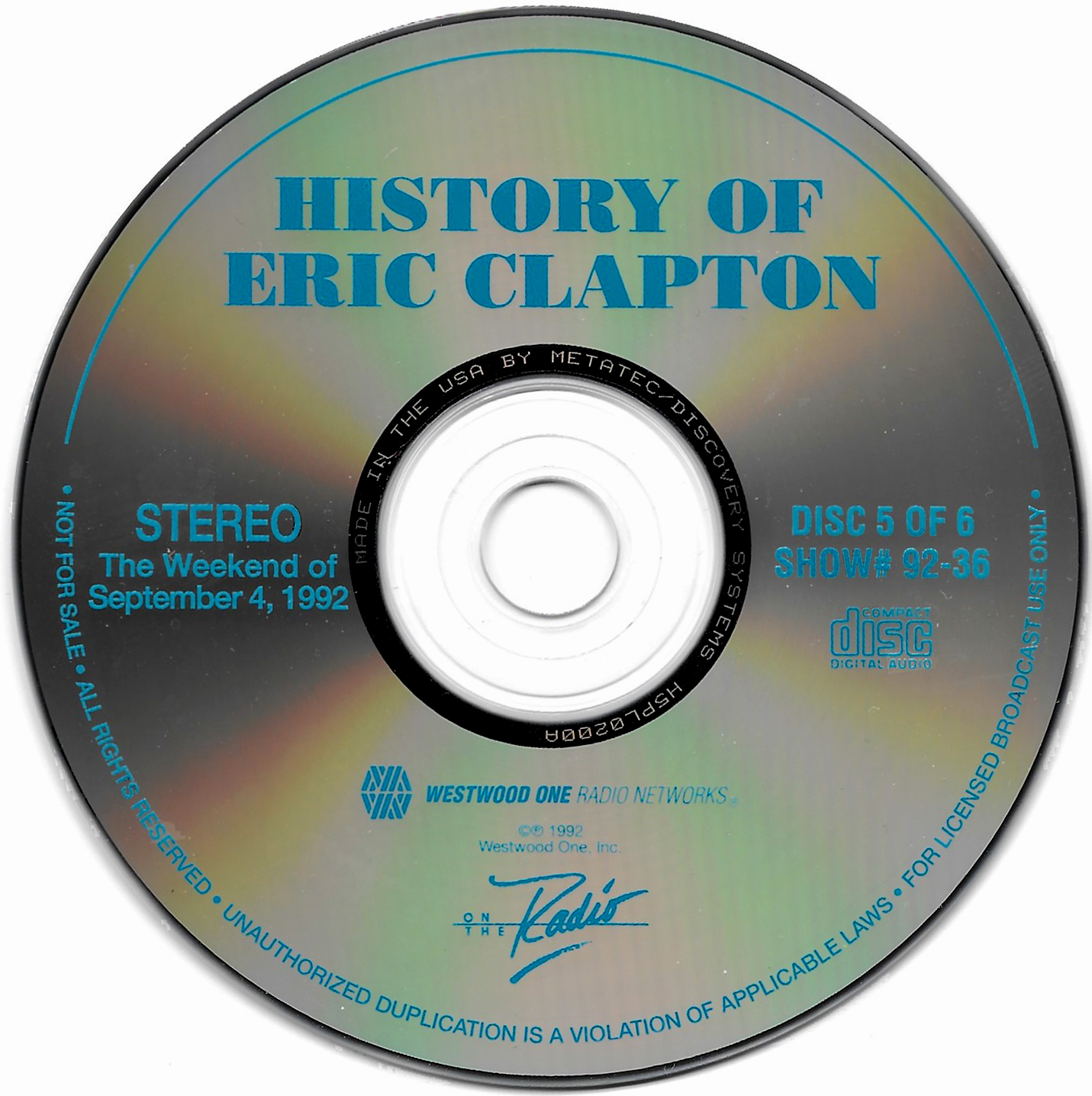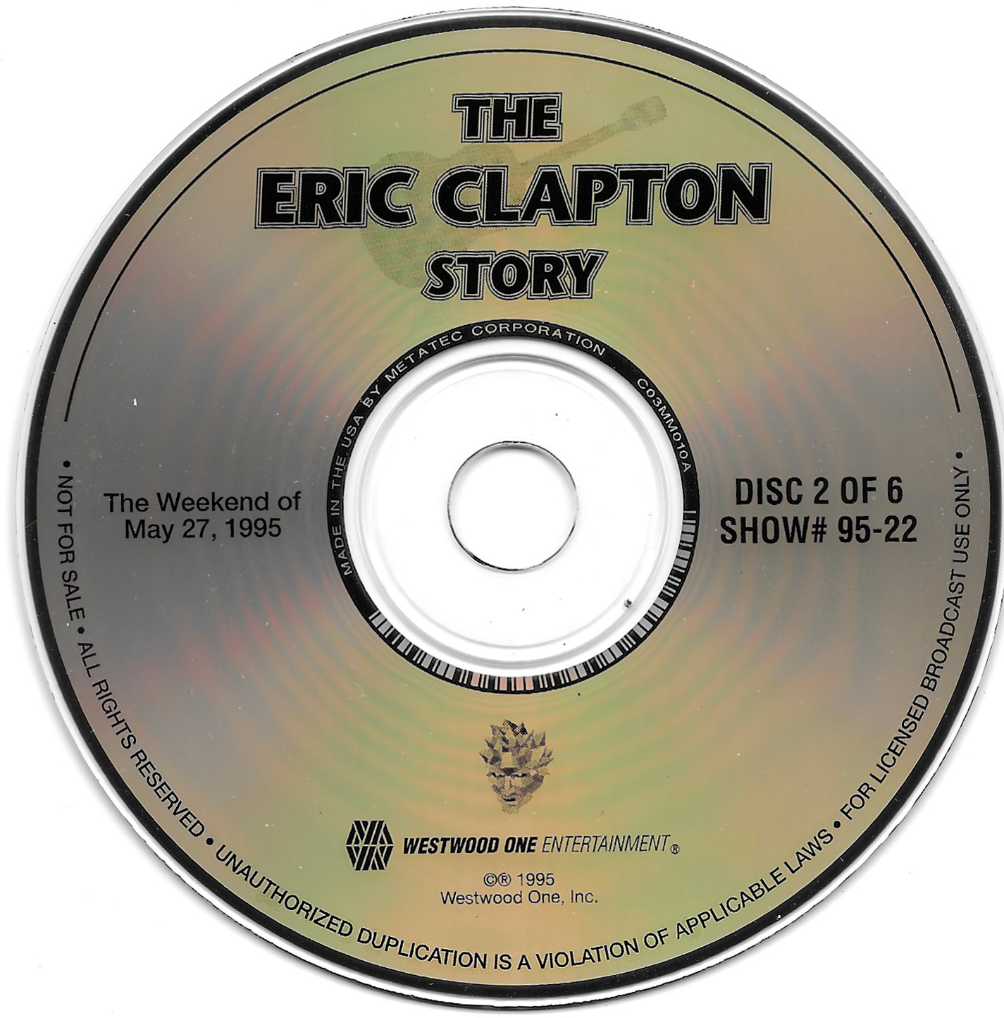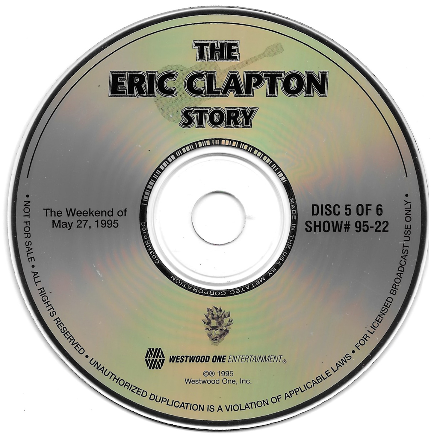 Here is another six-disc, six-hour Eric Clapton retrospective radio special. This time, Westwood One Host Richard Skinner details Clapton’s entire musical career through dozens of interviews, studio tracks and live cuts. Interview segments from Clapton, John Mayall, Jeff Beck, Pete Townshend, George Harrison, Jack Bruce, Ginger Baker, Ronnie Lane, Glyn Johns, Tom Dowd, Phil Collins, Tina Turner, and Elton John are all featured. Contains original commercial blocks and segment intros by Skinner. The title is derived from Skinner’s introduction on each disc, although only The Eric Clapton Story appears on the discs themselves. Each disc came housed in a separate, identical paper sleeve.
