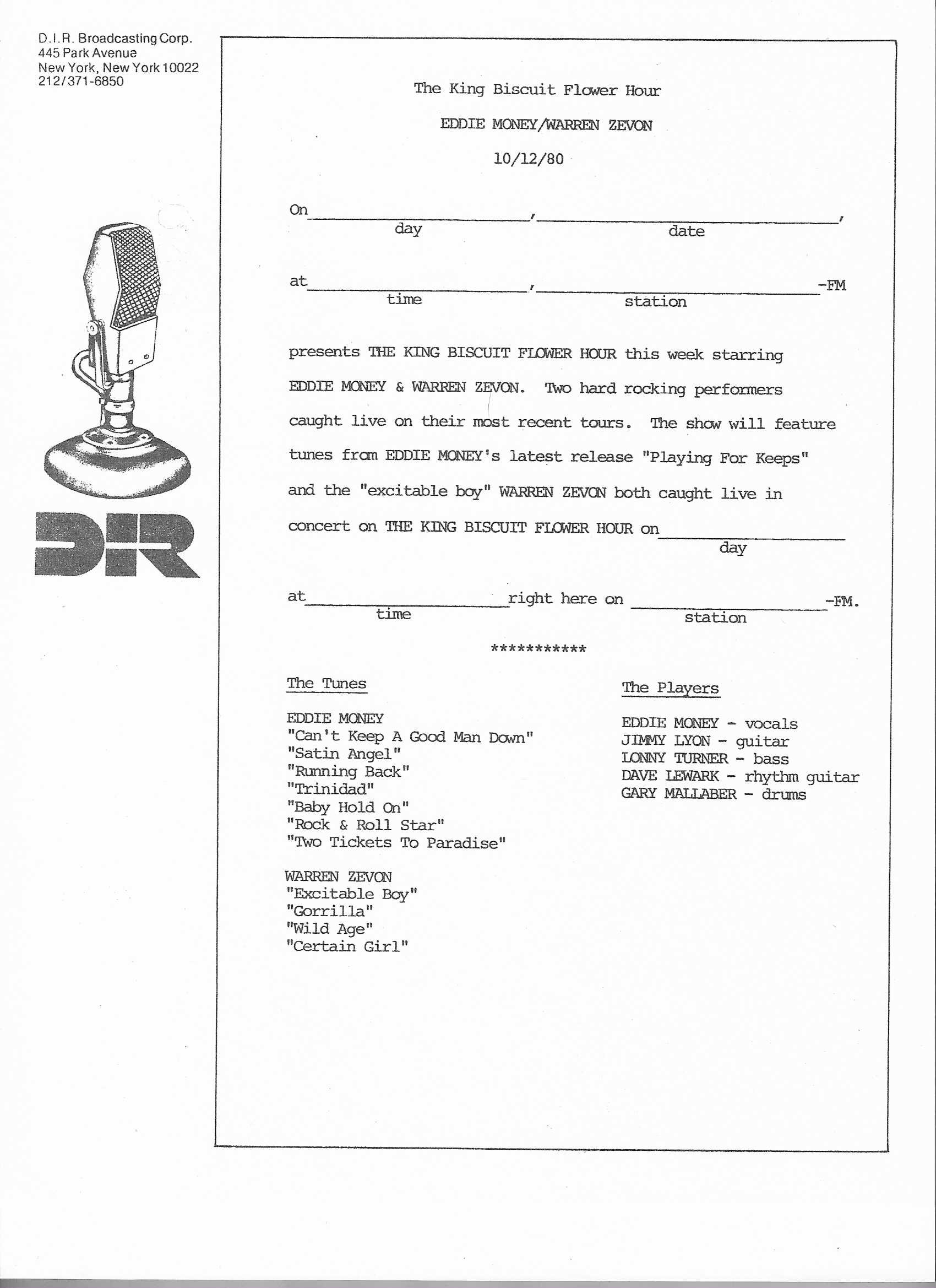 A double bill King Biscuit show from 1980, this show combines performances from Eddie Money and Warren Zevon. The date of the Money show is unknown (Wolfgang’s Vault lists it as 12 October 1980, however, this is actually the original broadcast date of the double LP show), while Zevon’s performance is from April of that year. Contains original commercial blocks and intros by King Biscuit regular contributor Bill Minkin. From my personal collection.
